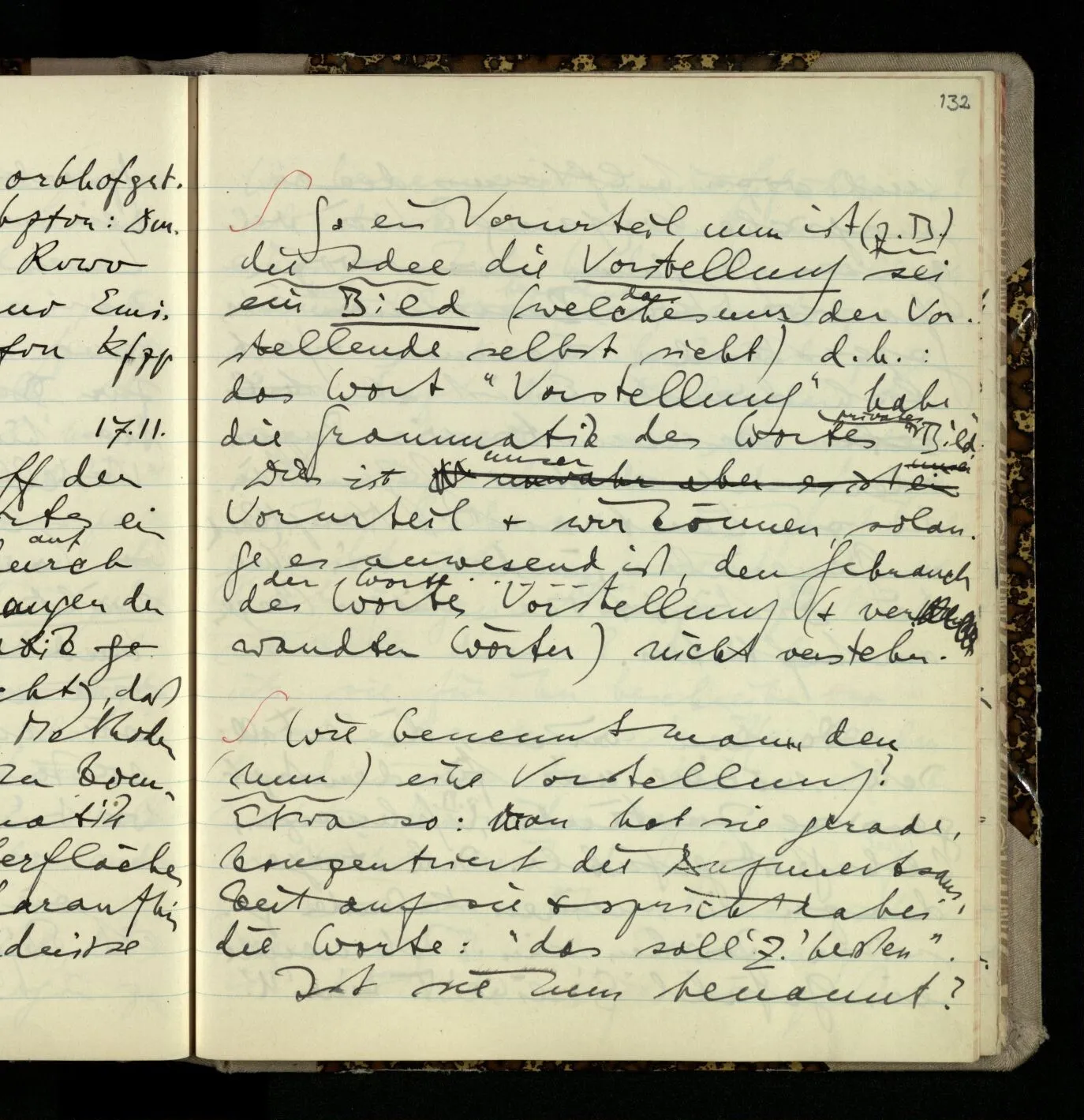 So ein Vorurteil nun ist (z.B.) die Idee die Vorstellung sei ein Bild (welches nur der Vorstellende selbst sieht) d.h.: das Wort “Vorstellung” habe die Grammatik des Wortes “privates Bild”. Dies ist unser Vorurteil & wir können, solange es anwesend ist, den Gebrauch des Wortes “Vorstellung“ (& verwandter Wörter) nicht verstehen.