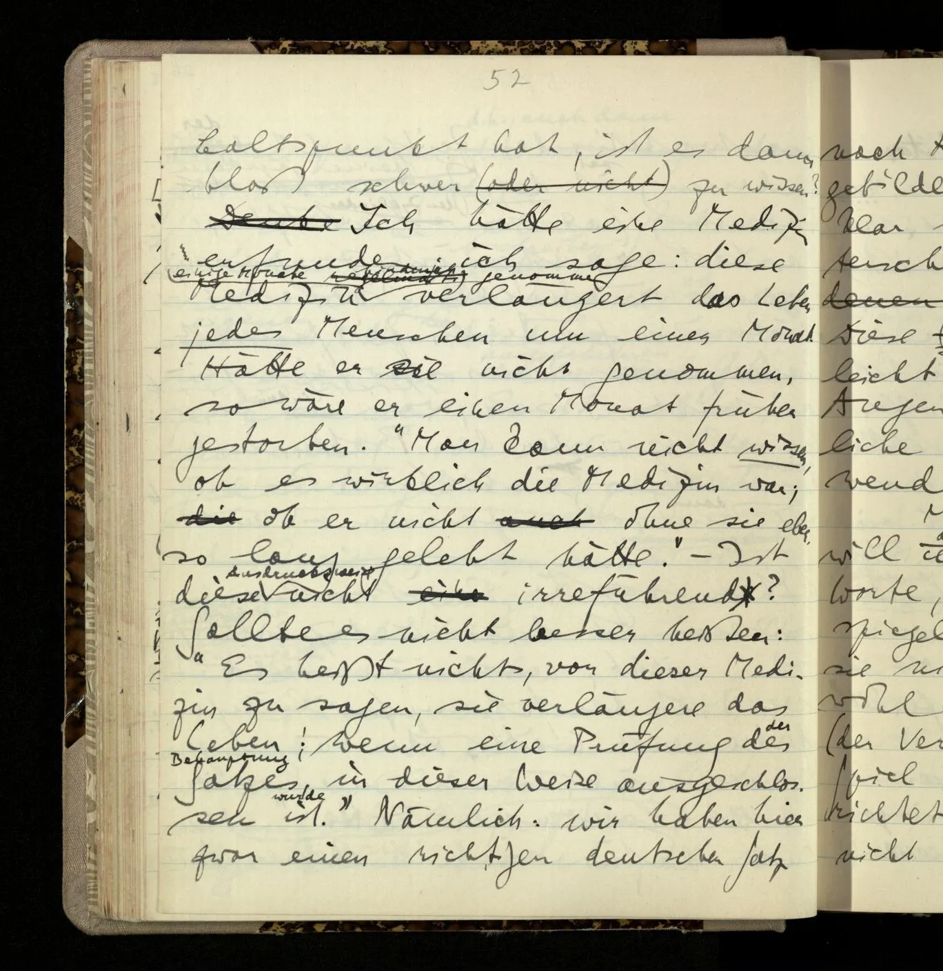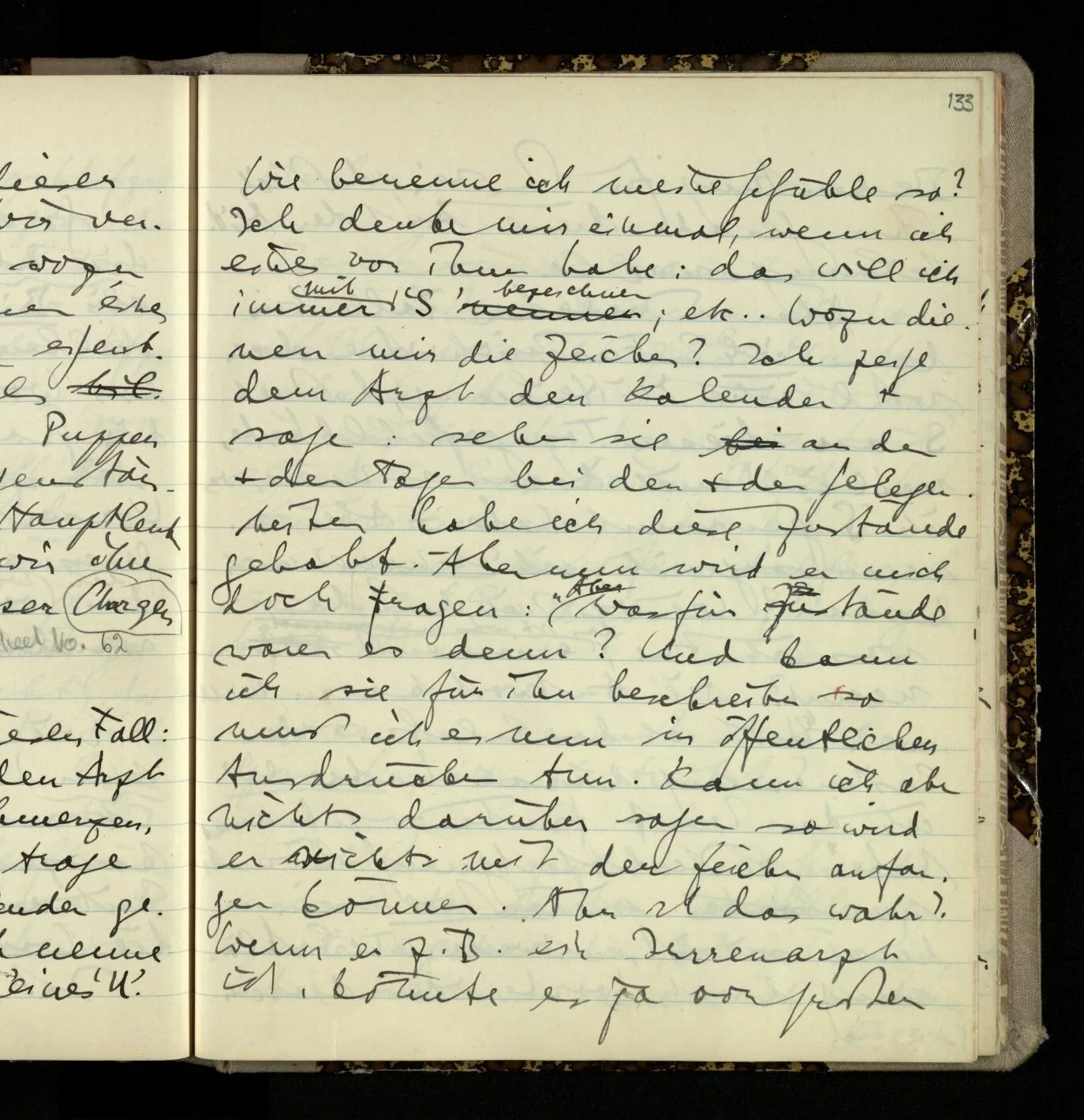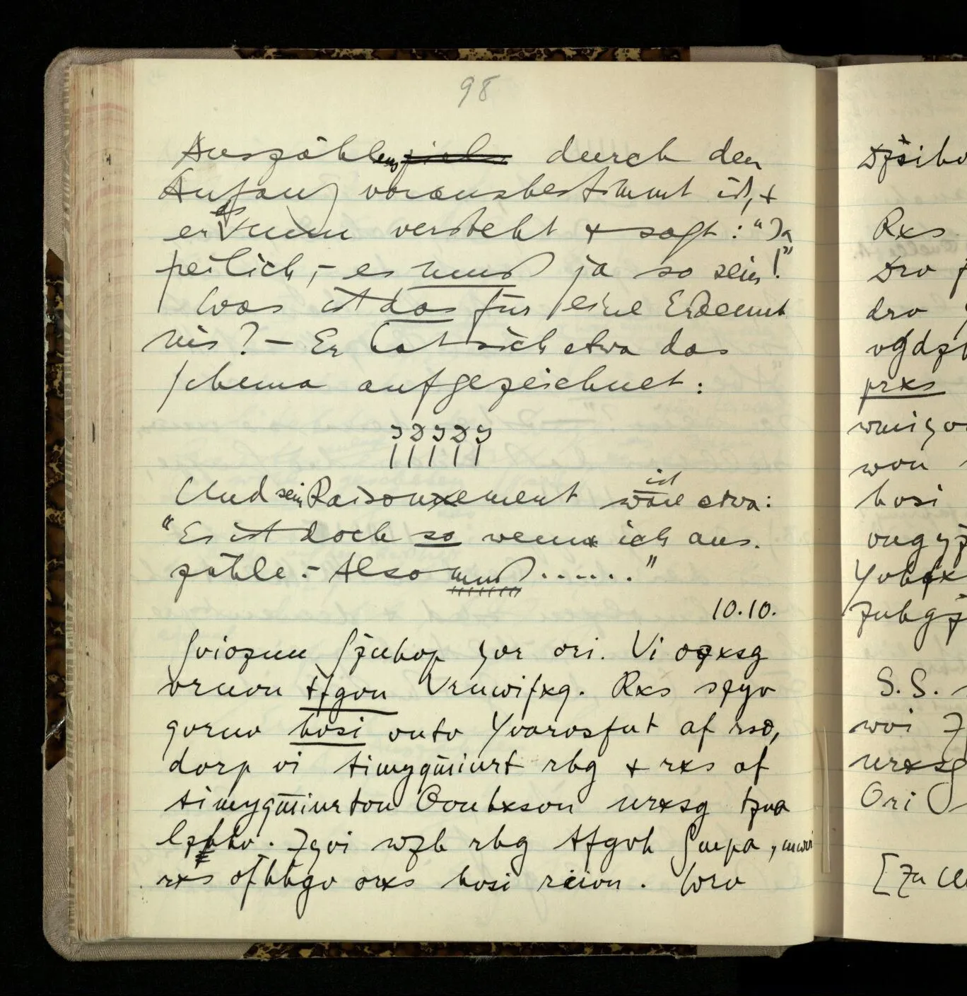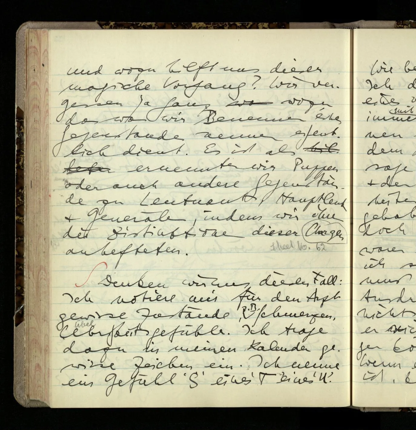 Denken wir uns diesen Fall: Ich notiere mir für den Arzt gewisse Zustände, z.B. Schmerzen, Übligkeitsgefühle. Ich trage dazu in meinen Kalender gewisse Zeichen ein. Ich nenne ein Gefühl ‘S’ eines ‘T’ eines ‘U’. Wie benenne ich meine Gefühle so? Ich denke mir einmal, wenn ich eines von ihnen habe: das will ich immer mit ‘S’ bezeichnen; etc.. Wozu dienen mir die Zeichen? Ich zeige dem Arzt den Kalender & sage: sehen sie an den & den Tagen bei den & den Gelegenheiten habe ich diese Zustände gehabt. – Aber nun wird er mich doch fragen: “Aber was für Zustände waren es denn? Und kann ich sie für ihn beschreiben so muß ich es nun in öffentlichen Ausdrücken tun. Kann ich aber nichts darüber sagen so wird er nichts mit den Zeichen anfangen können. Aber ist das wahr? Wenn er z.B. ein Irrenarzt ist, könnte es ja von großer Bedeutung für ihn sein, daß ich ihm gerade diese Art der Mitteilung mache. Aber in welchem Falle bin denn ich? Für mich ist es doch wohl eine Mitteilung, daß ich S an diesem Tag gefühlt habe, weil ich mich daran erinnere, was ich “S” genannt habe. – Aber warum sage ich, ich ‘erinnere’ mich daran? Wie weiß ich, daß das was ich tue, das ist was man ‘erinnern’ nennt? Die Antwort kann nicht sein: “Weil ich das Erlebnis der Erinnerung daran habe daß ich das Wort früher so gebraucht habe.” Die Rechtfertigung könnte nur eine äußere sein, denn sie ist entweder eine Erklärung durch Worte oder durch Muster.
