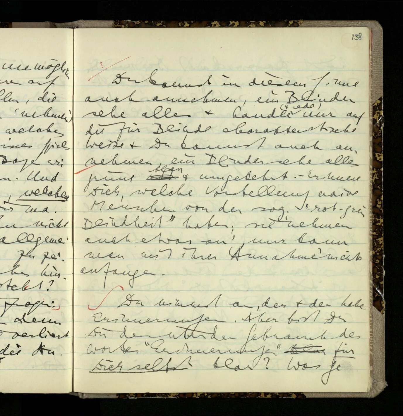 Du kannst in diesem Sinne auch annehmen, ein Blinder sehe alles & handle (& rede) nur auf die für Blinde charakteristische Weise & Du kannst auch annehmen, ein Blinder sehe alles grüne blau & umgekehrt. – Erinnere Dich, welche Vorstellung naive Menschen von der sog. “Rot-GrünBlindheit” haben; sie ‘nehmen auch etwas an’, nur kann man mit ihrer ‘Annahme’ nichts anfangen.