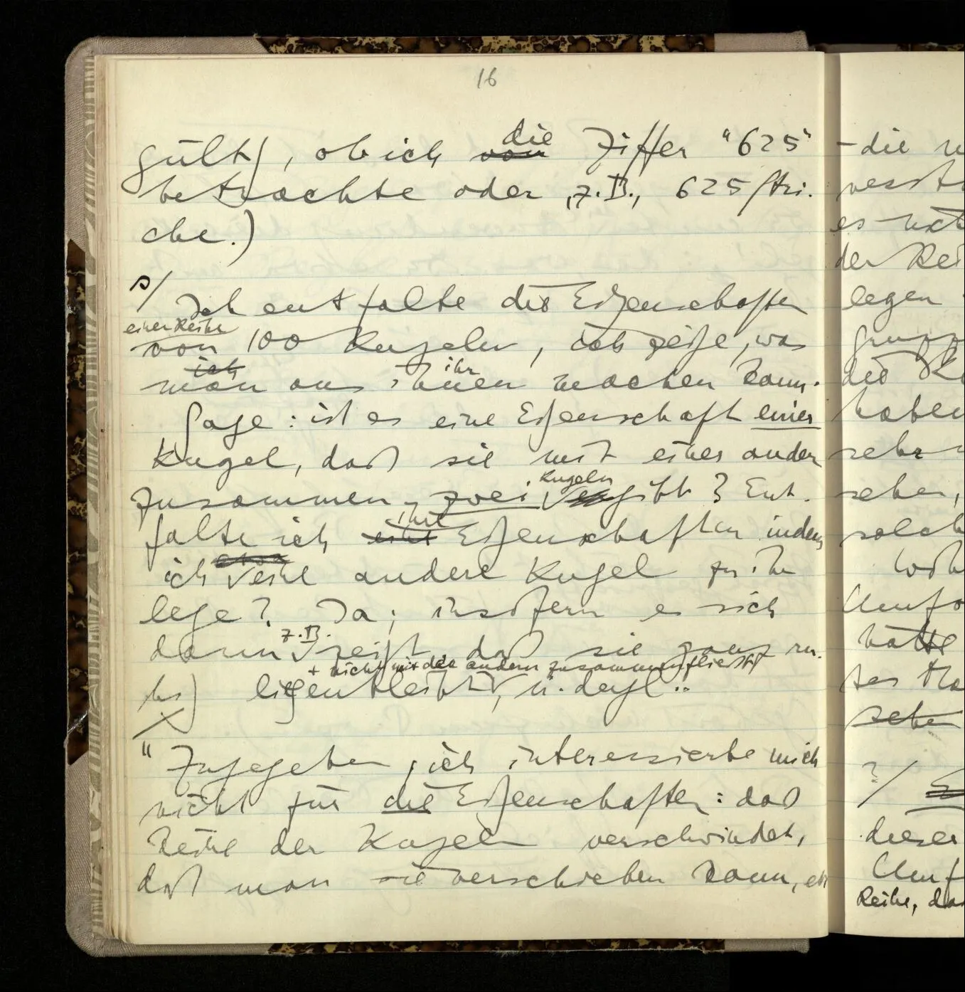Ich entfalte die Eigenschaften von 100 Kugeln, ich zeige, was man aus ihnen machen kann. Sage: ist es eine Eigenschaft einer Kugel, daß sie mit einer andern zusammen zwei Kugeln gibt? Entfalte ich ihre Eigenschaften indem ich eine andere Kugel zu ihr lege? Ja; insofern es sich dann z.B. zeigt, daß sie ganz ruhig liegen bleibt & nicht mit der andern zusammenfließt, u. dergl..