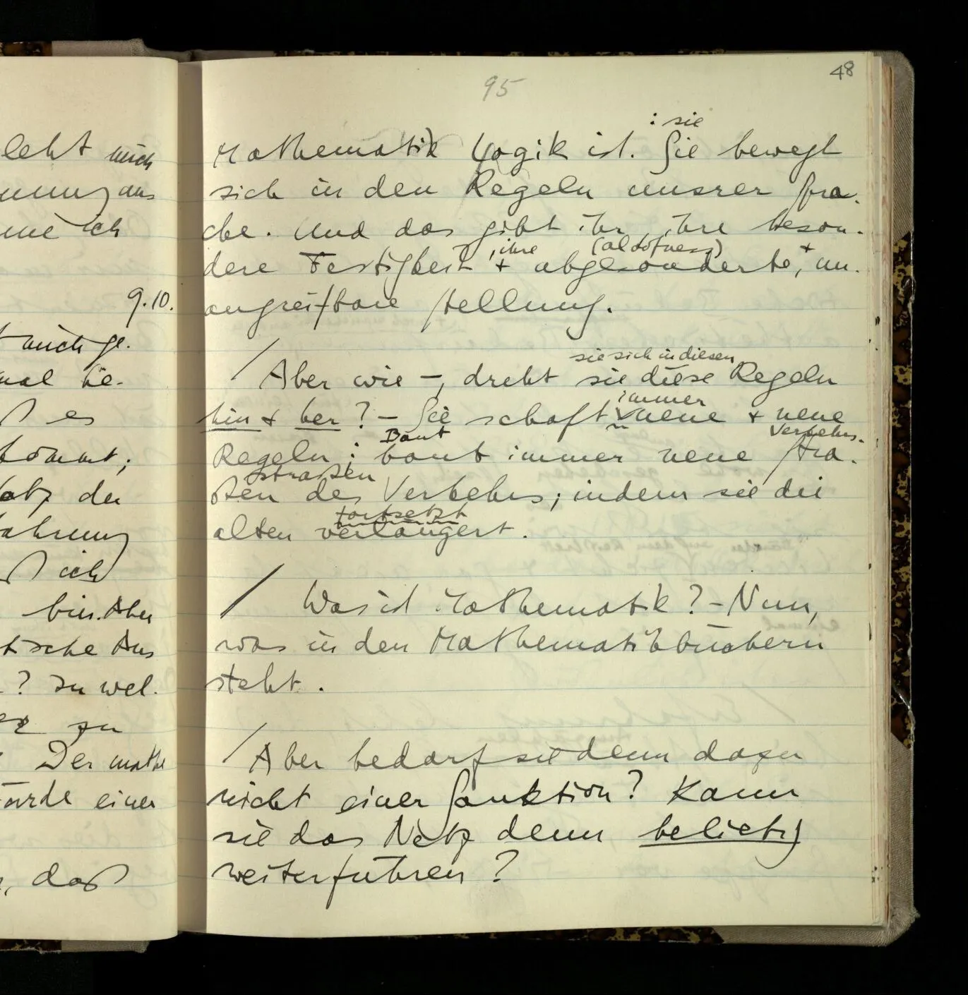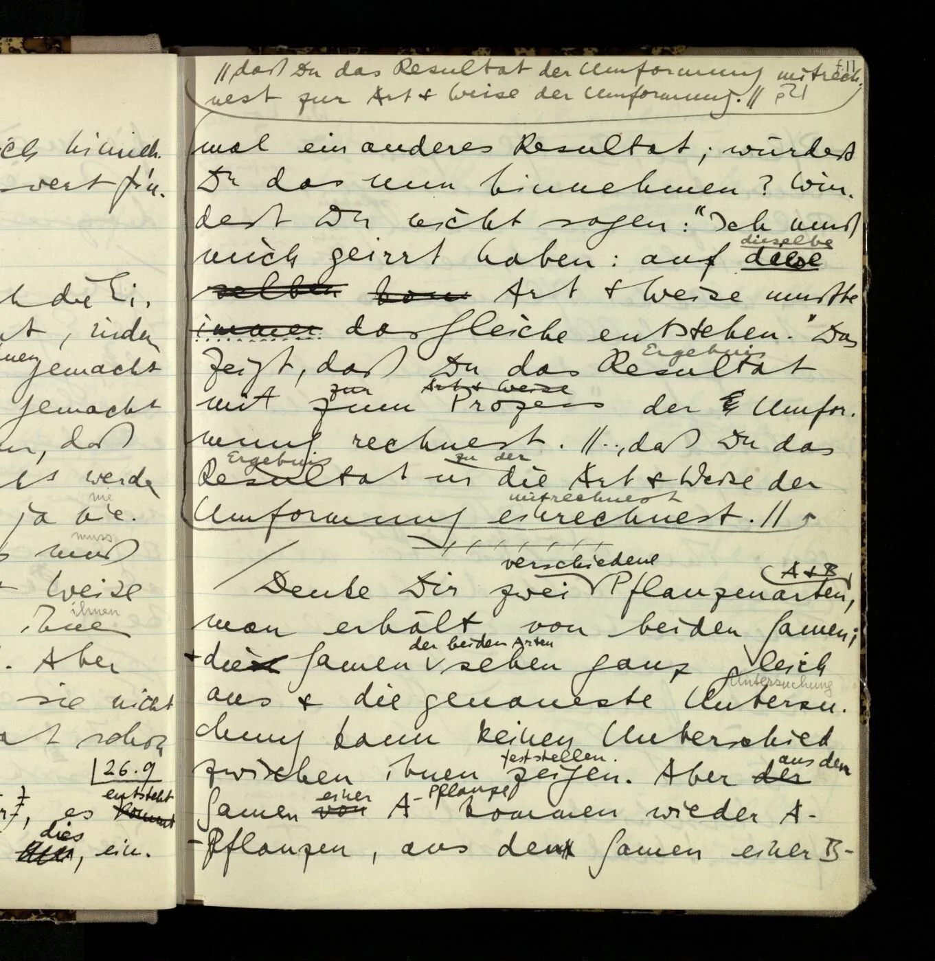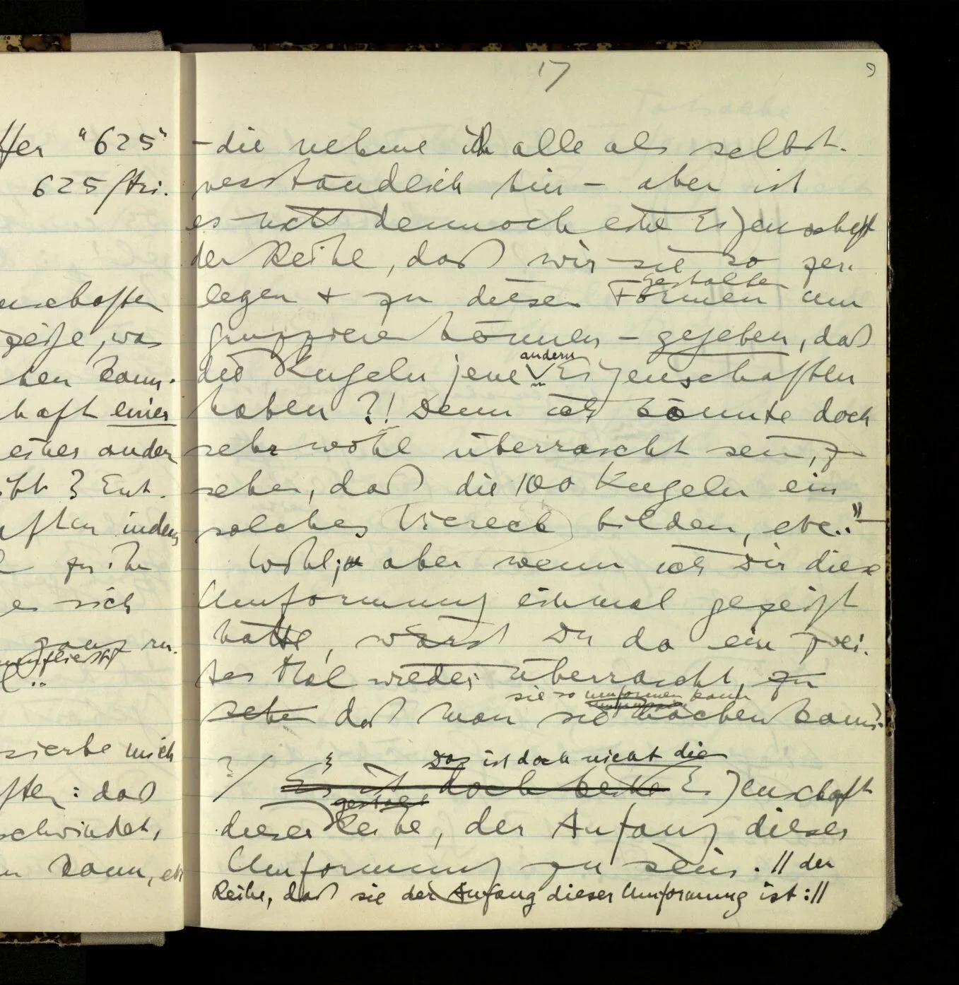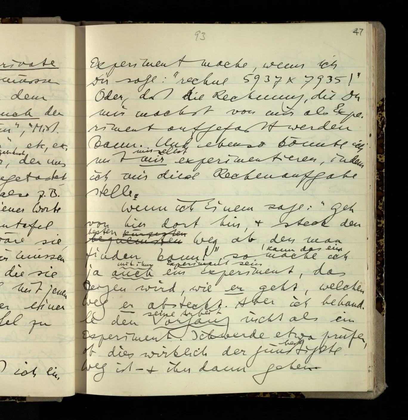 “Du entfaltest doch die Eigenschaften der hundert, indem Du zeigst, was aus ihnen gemacht werden kann.” – Wie gemacht werden kann? Denn, daß das aus ihnen gemacht werden kann, daran hat ja niemand gezweifelt, es muß also an der Art und Weise liegen, wie dies aus ihnen hervorgebracht wird. Aber sieh diese an! ob sie nicht etwa das Resultat schon voraussetzt? 26.09.1937 Denn denke Dir, es entsteht auf diese Weise einmal dies, einmal ein anderes Resultat; würdest Du das nun hinnehmen? Würdest Du nicht sagen: “Ich muß mich geirrt haben: auf diese Art & Weise mußte immer das Gleiche entstehen.” Das zeigt, daß Du das Resultat mit zum Prozeß der Umformung rechnest.