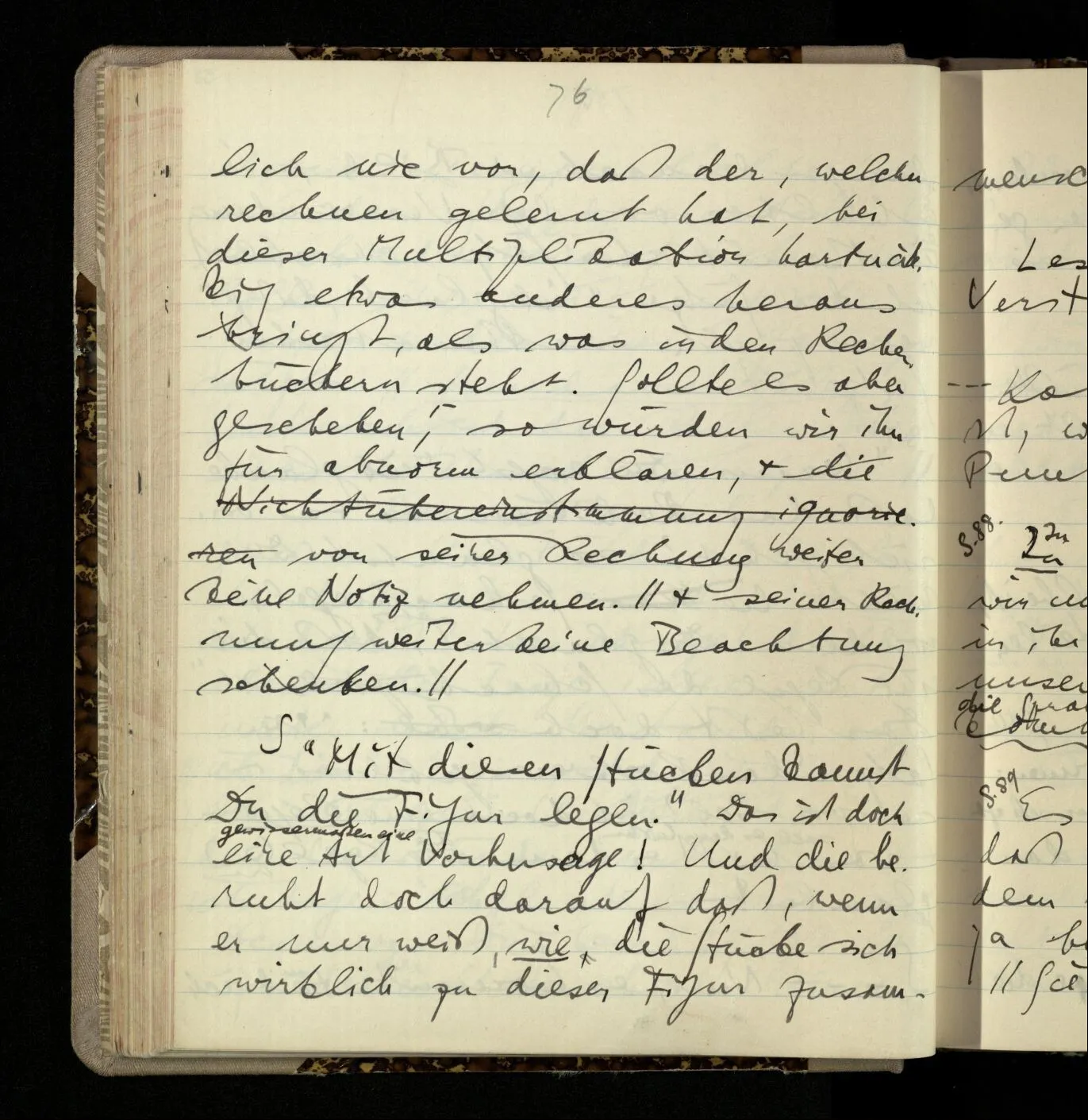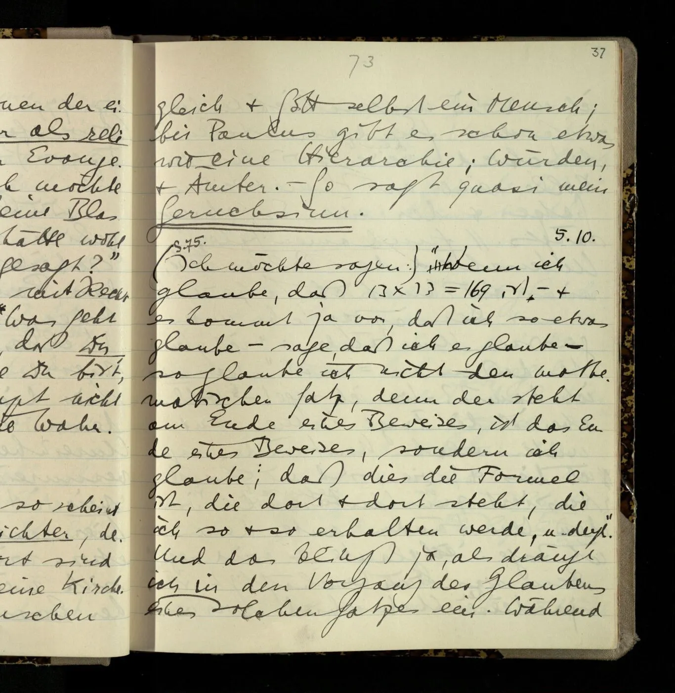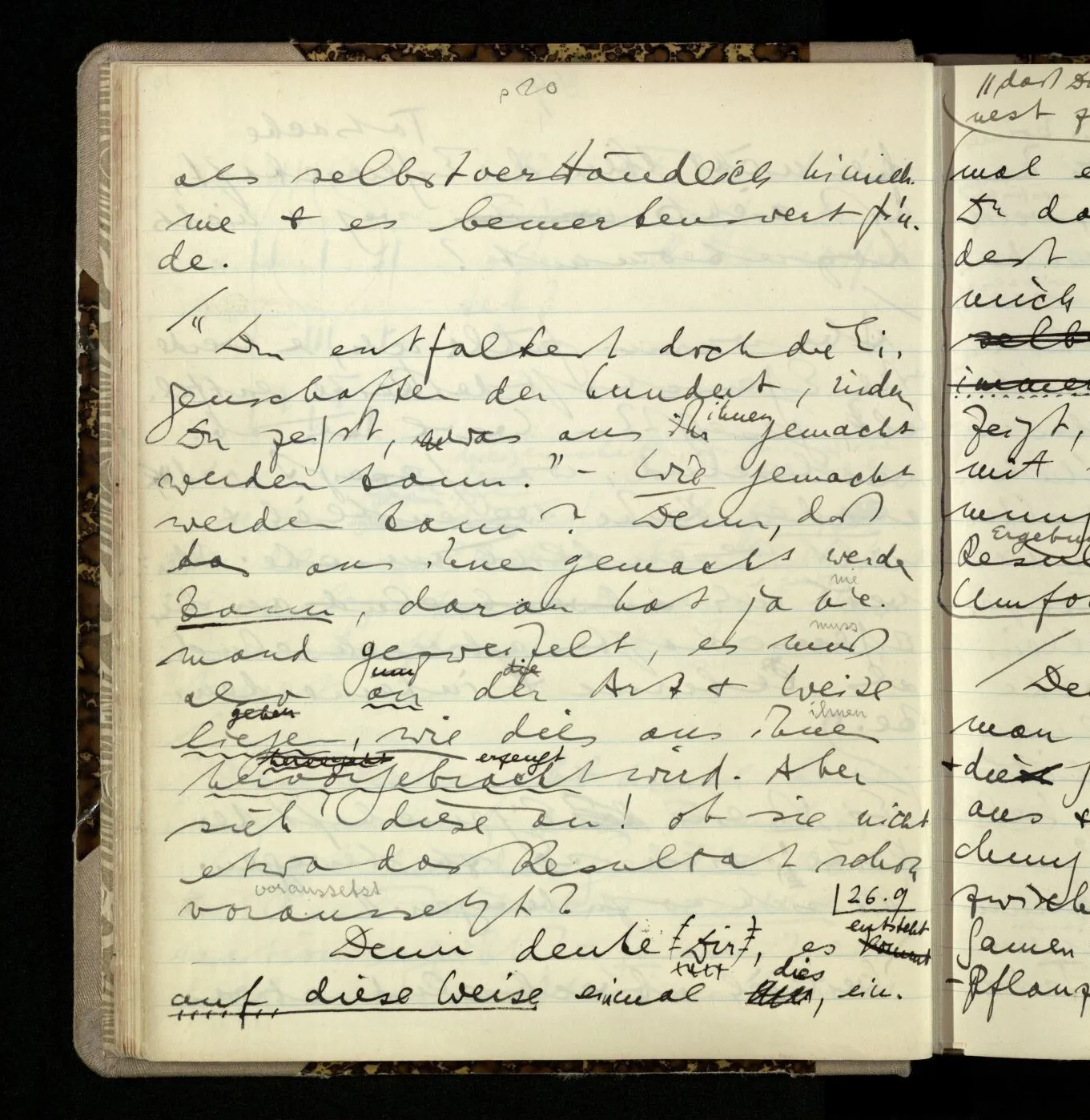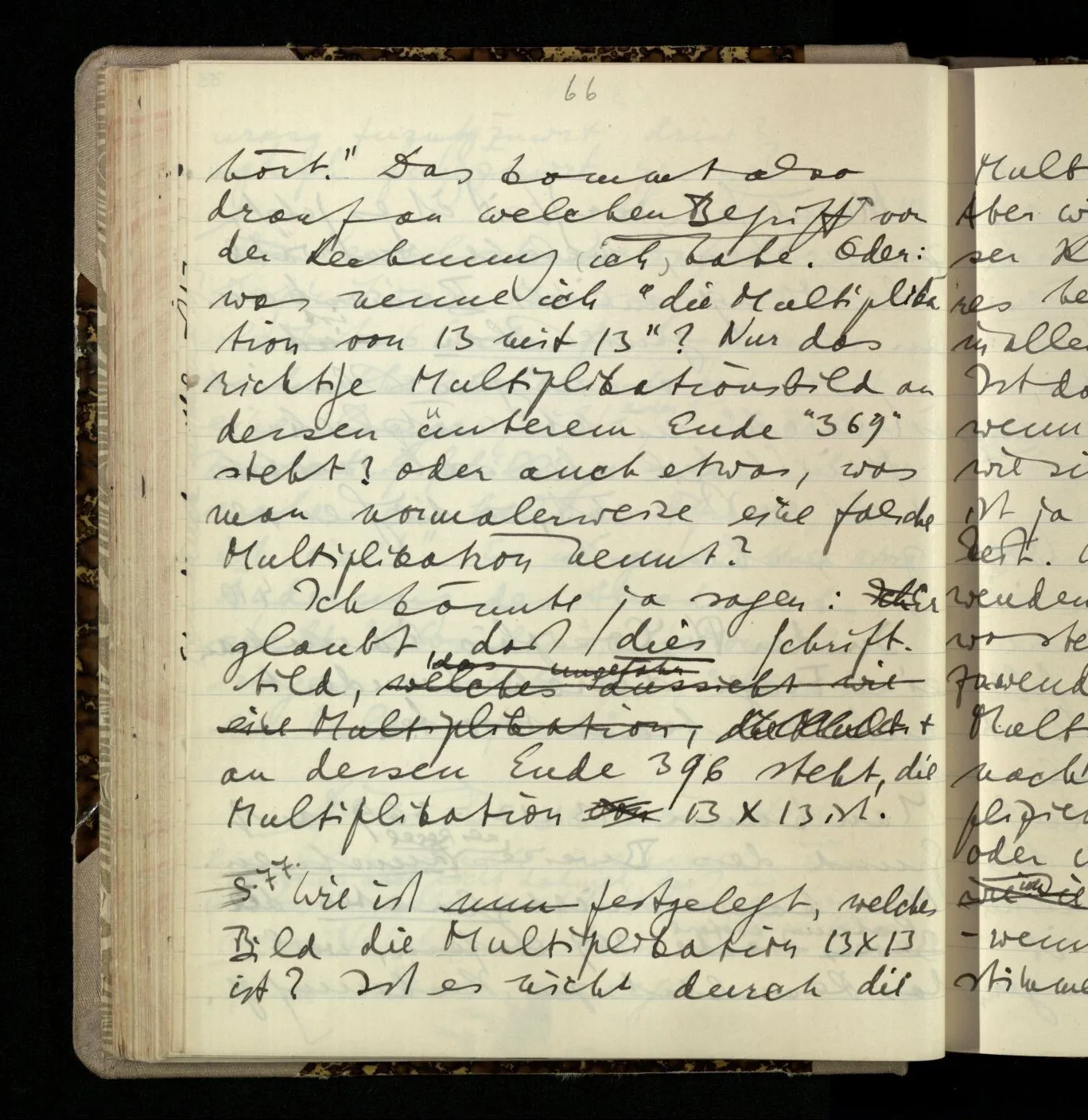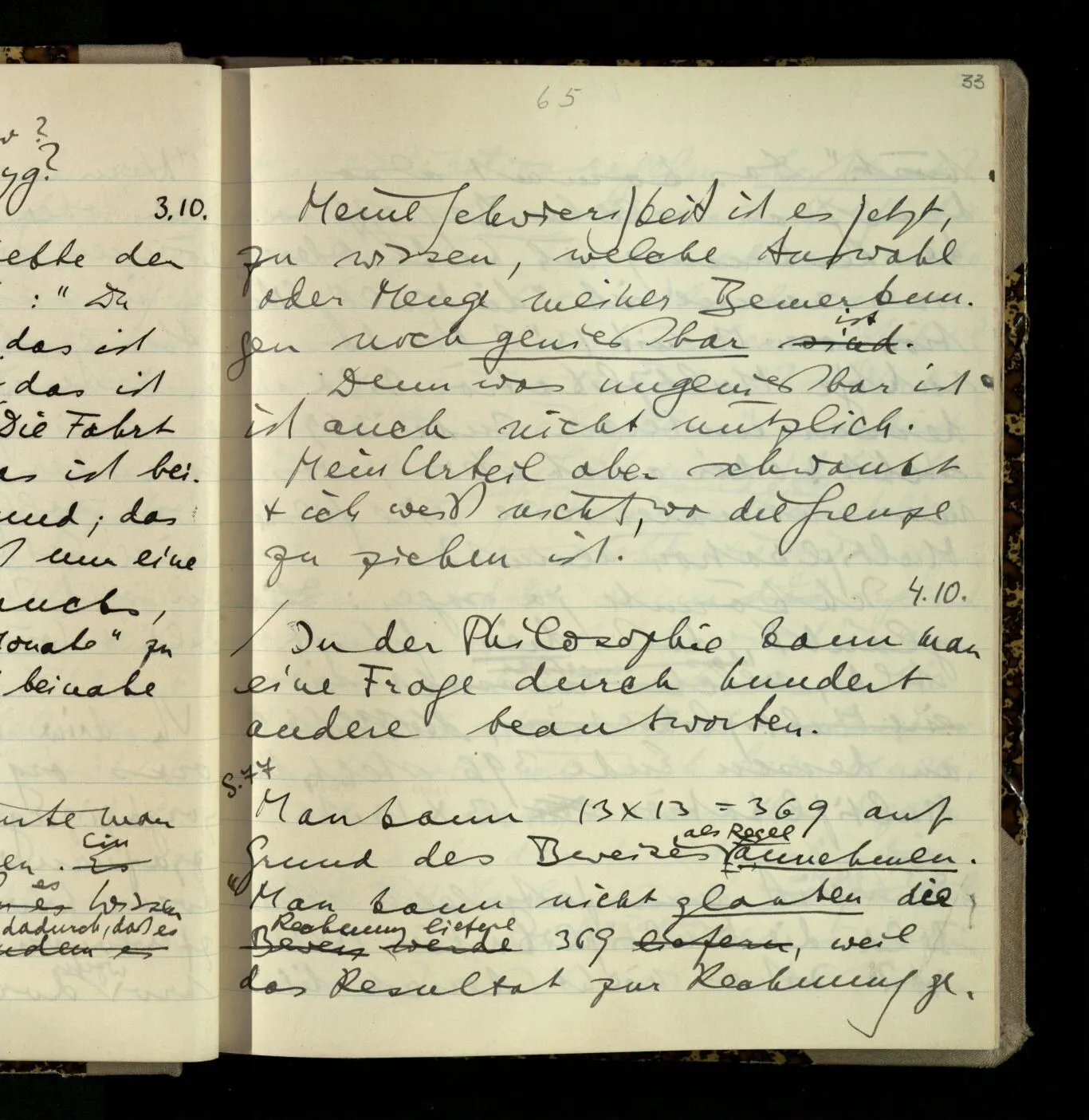 “Du entfaltest doch die Eigenschaften der hundert, indem Du zeigst, was aus ihnen gemacht werden kann.” – Wie gemacht werden kann? Denn, daß das aus ihnen gemacht werden kann, daran hat ja niemand gezweifelt, es muß also an der Art und Weise liegen, wie dies aus ihnen hervorgebracht wird. Aber sieh diese an! ob sie nicht etwa das Resultat schon voraussetzt? 26.09.1937 Denn denke Dir, es entsteht auf diese Weise einmal dies, einmal ein anderes Resultat; würdest Du das nun hinnehmen? Würdest Du nicht sagen: “Ich muß mich geirrt haben: auf diese Art & Weise mußte immer das Gleiche entstehen.” Das zeigt, daß Du das Resultat mit zum Prozeß der Umformung rechnest.