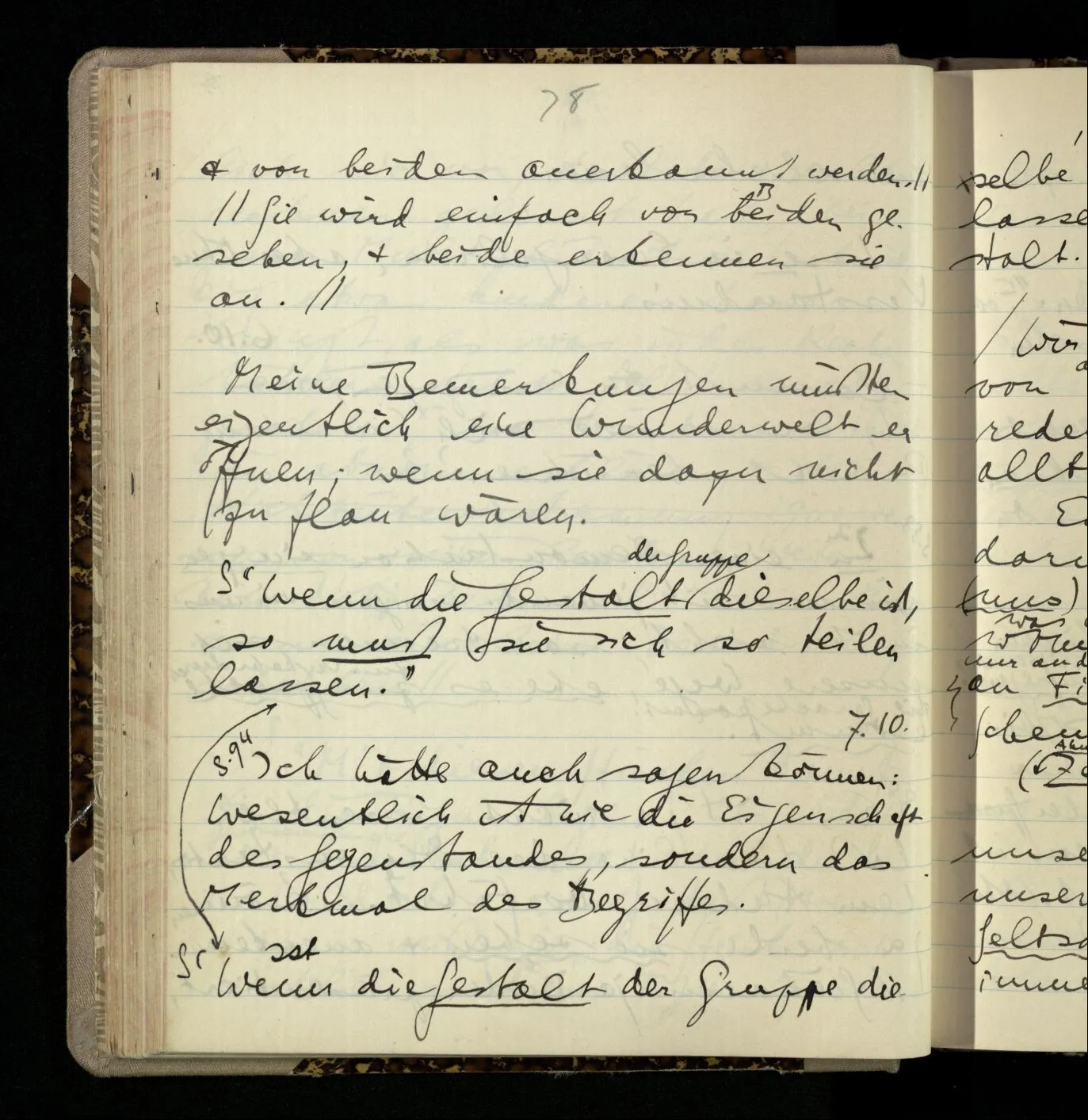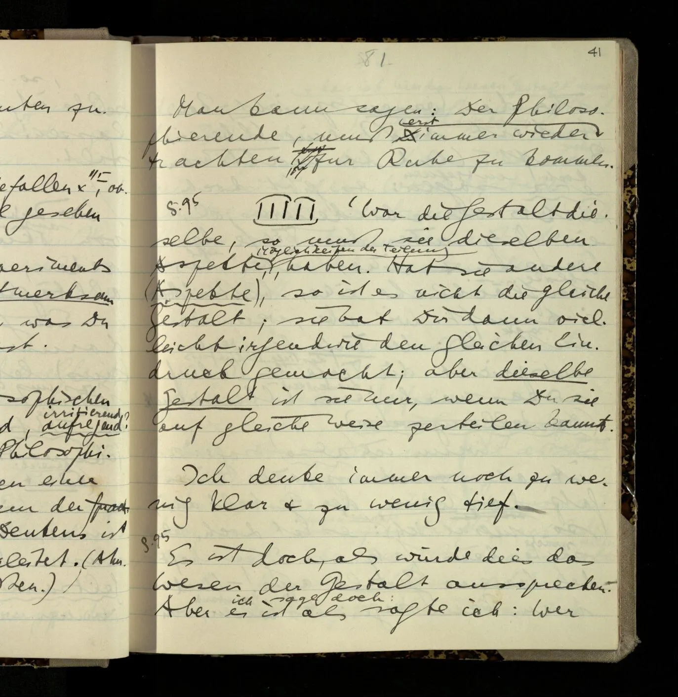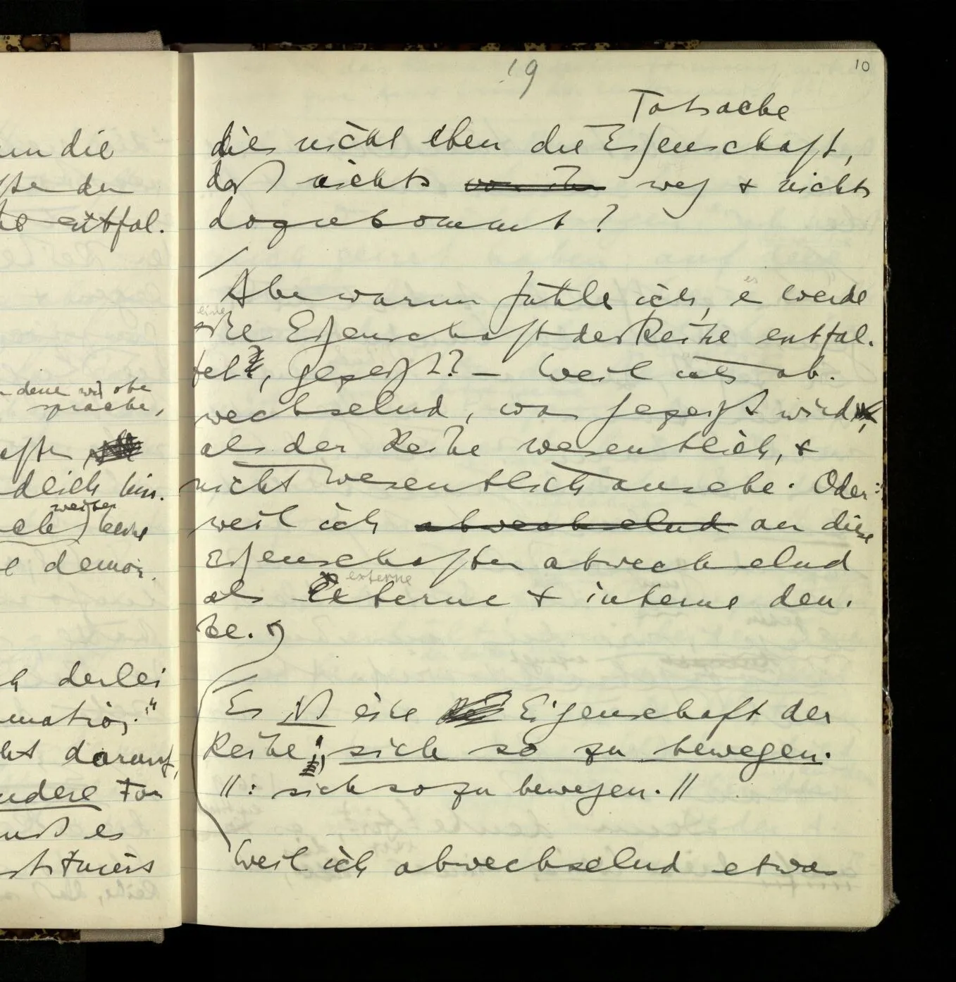 Aber warum fühle ich, es werde eine Eigenschaft der Reihe entfaltet, gezeigt? – Weil ich abwechselnd, was gezeigt wird, als der Reihe wesentlich, & nicht wesentlich ansehe. Oder: weil ich an diese Eigenschaften abwechselnd als externe & interne denke.