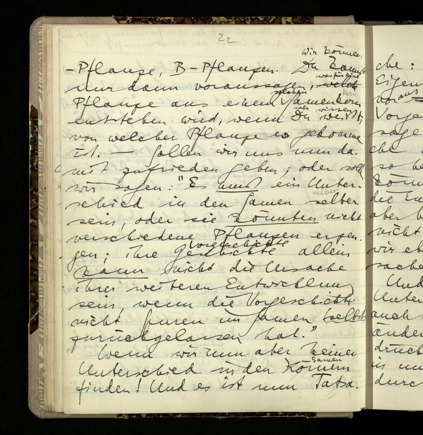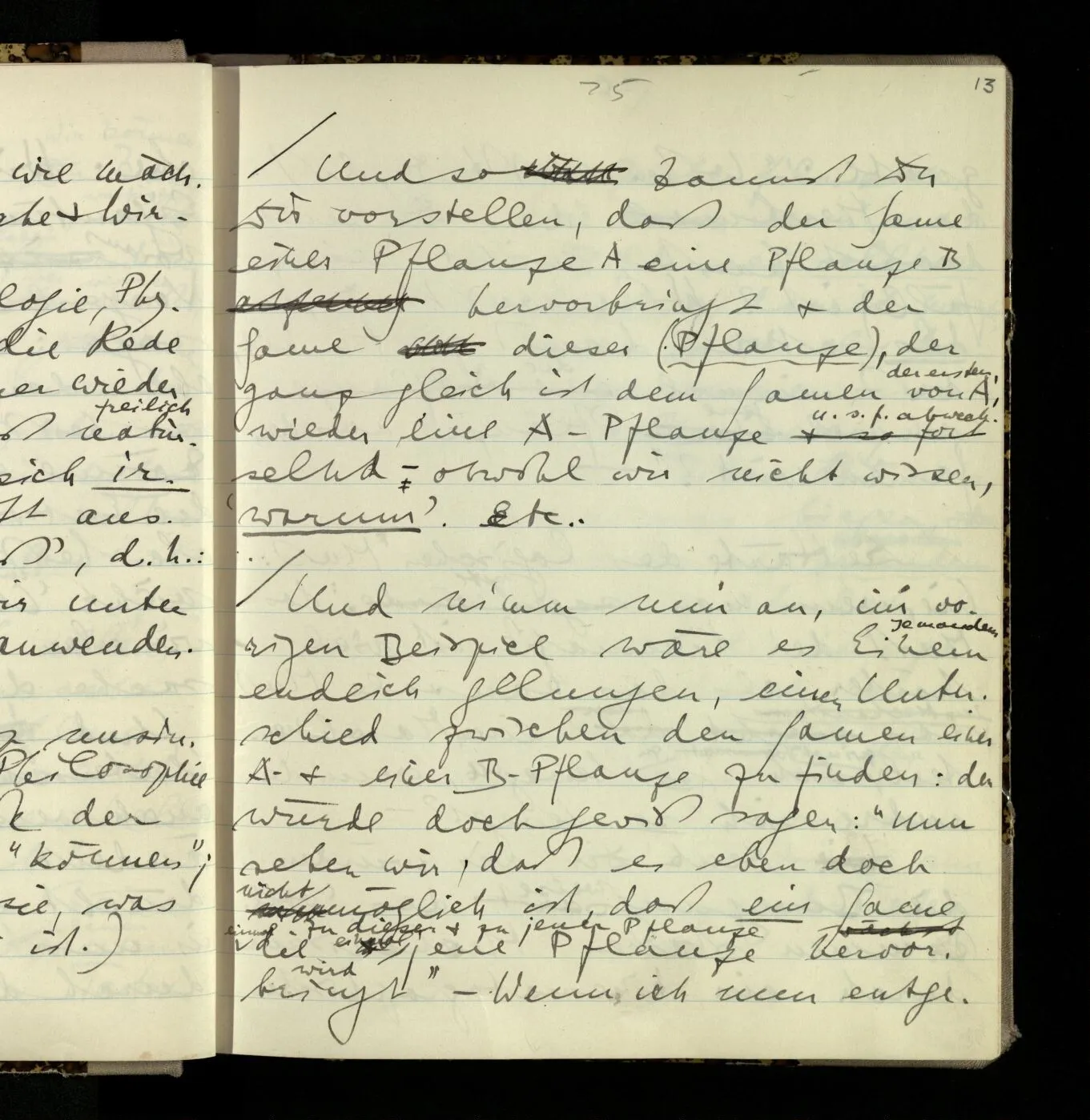 Und nimm nun an, im vorigen Beispiel wäre es Einem endlich gelungen, einen Unterschied zwischen den Samen einer A- & einer B-Pflanze zu finden: der würde doch gewiß sagen: “Nun sehen wir, daß es eben doch nicht möglich ist, daß ein Same die & jene Pflanze hervorbringt” – Wenn ich nun entgegnete: “Woher weißt Du, daß das Merkmal, das Du entdeckt hast, nicht rein zufällig ist? Woher weißt Du, daß das etwas damit zu tun hat, daß einmal die einmal jene Pflanze aus dem Samen wird?” –