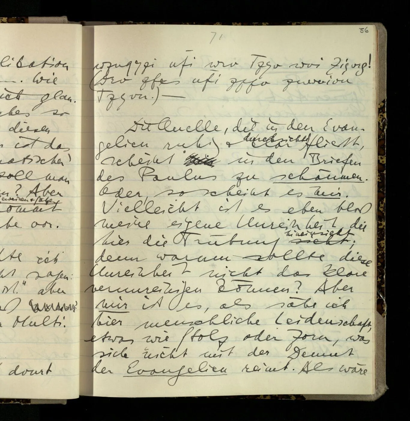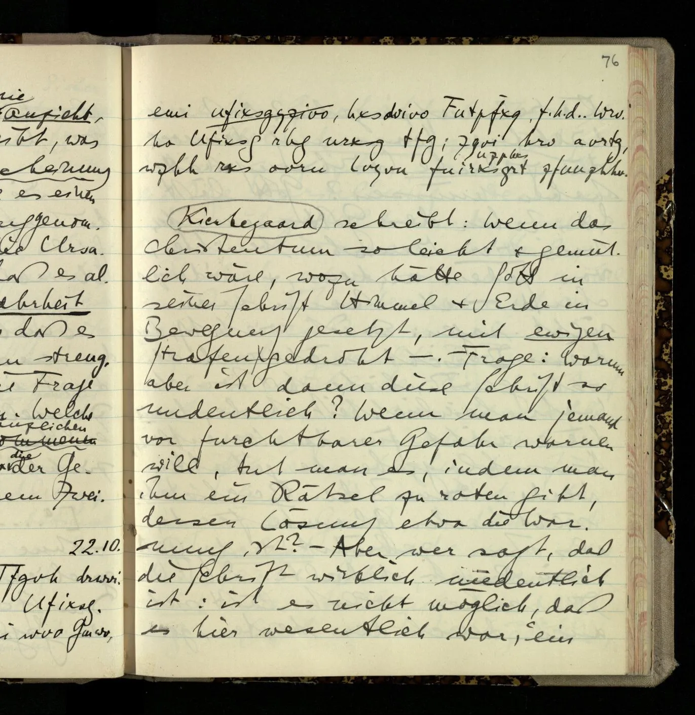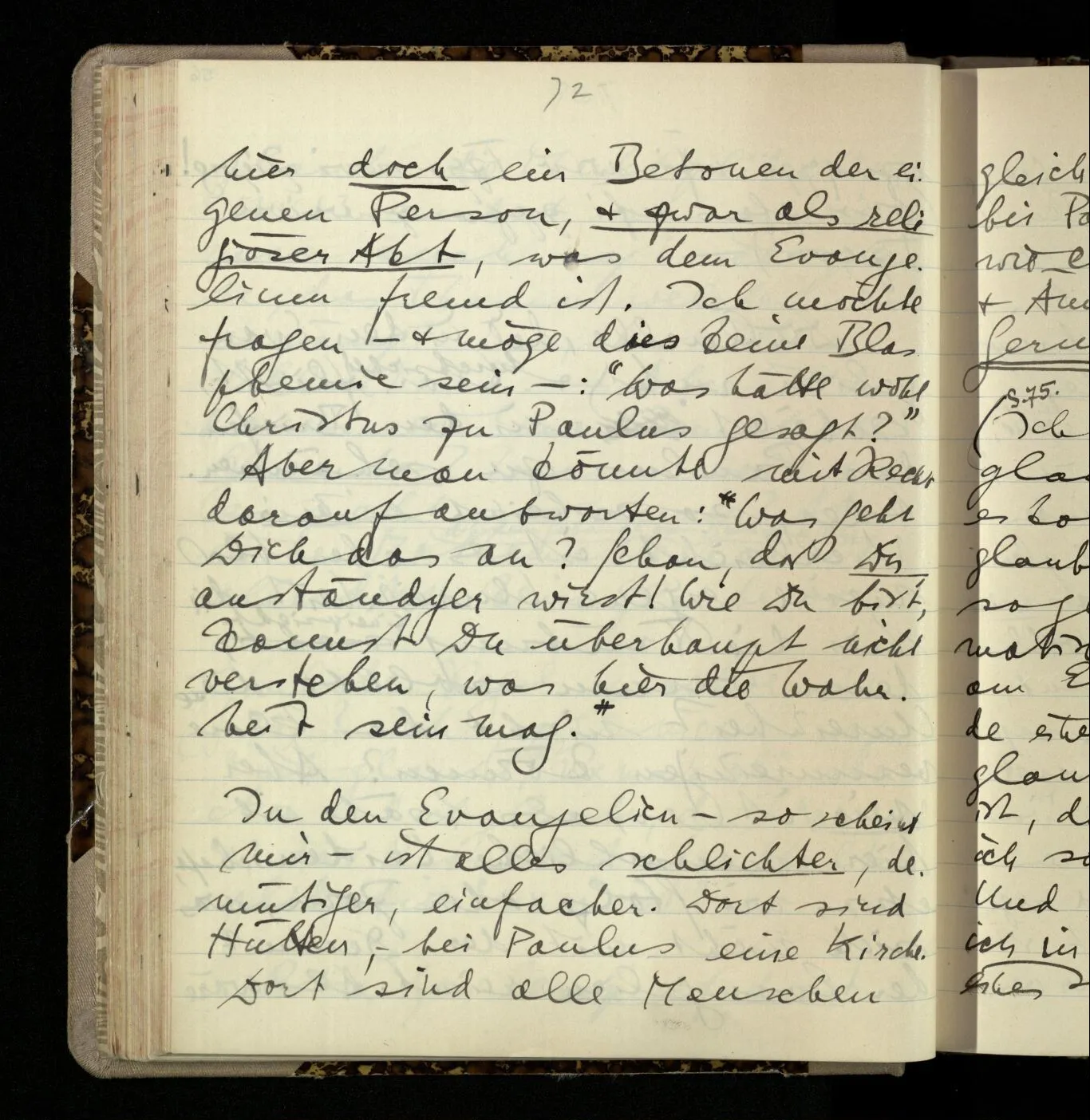 Im vorigen Jahr habe ich mich, mit Gottes Hilfe aufgerafft & ein Geständnis abgelegt. Das brachte mich in ein reineres Fahrwasser in ein besseres Verhältnis zu den Menschen & zu größerem Ernst. Nun aber ist alles das gleichsam aufgezehrt & ich nicht weit von dort, wo ich war. Vor allem bin ich unendlich feig. Wenn ich nichts Rechtes tue, so werde ich wieder ganz in das alte Fahrwasser hineintreiben. Ich fürchte mich vor jeder Gefahr. Mein Leben hassen für Gott davon bin ich so weit wie möglich. Ich könnte nicht einmal meinen Freund für Ihn lassen. Möge Gott mir helfen.