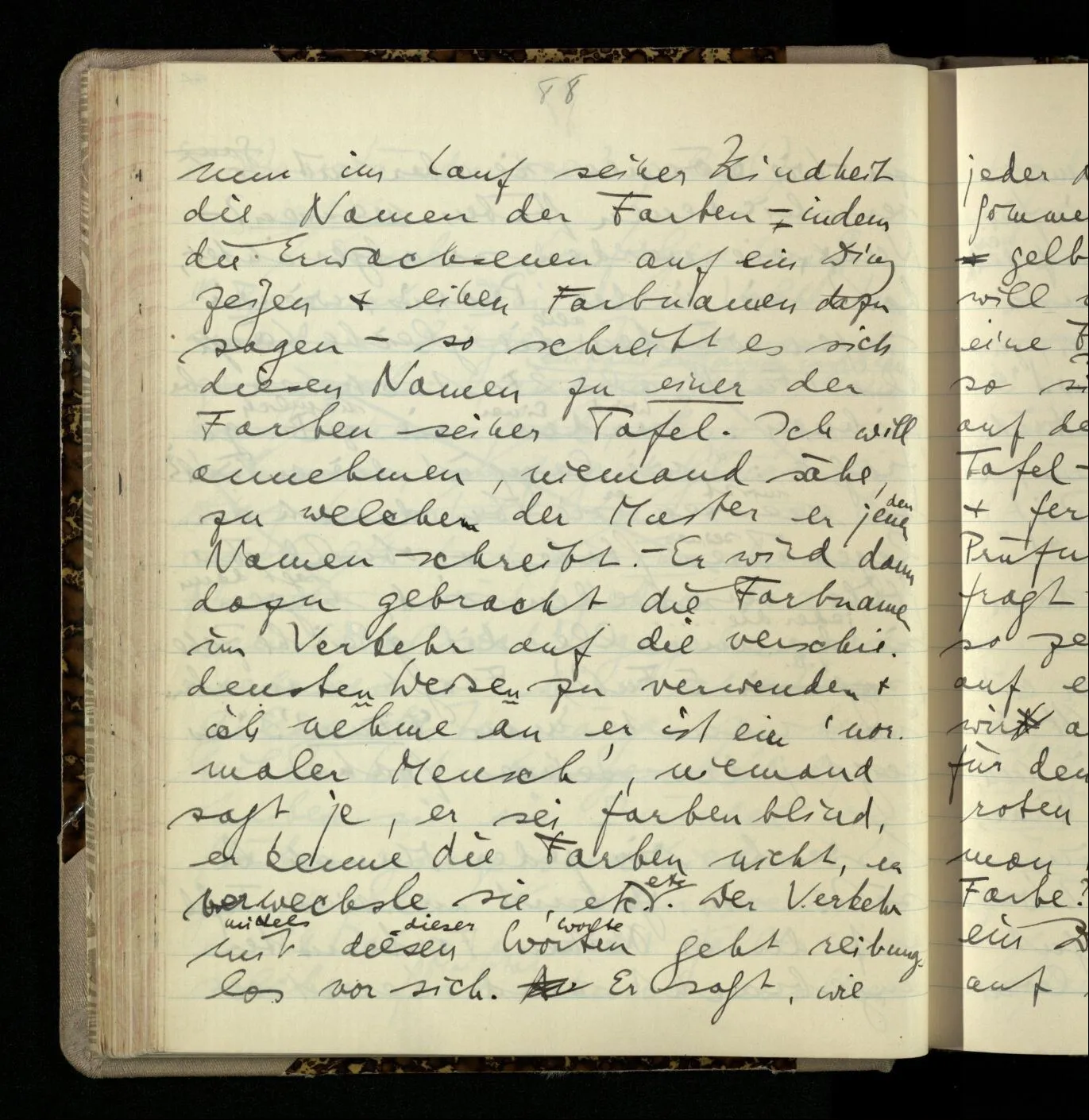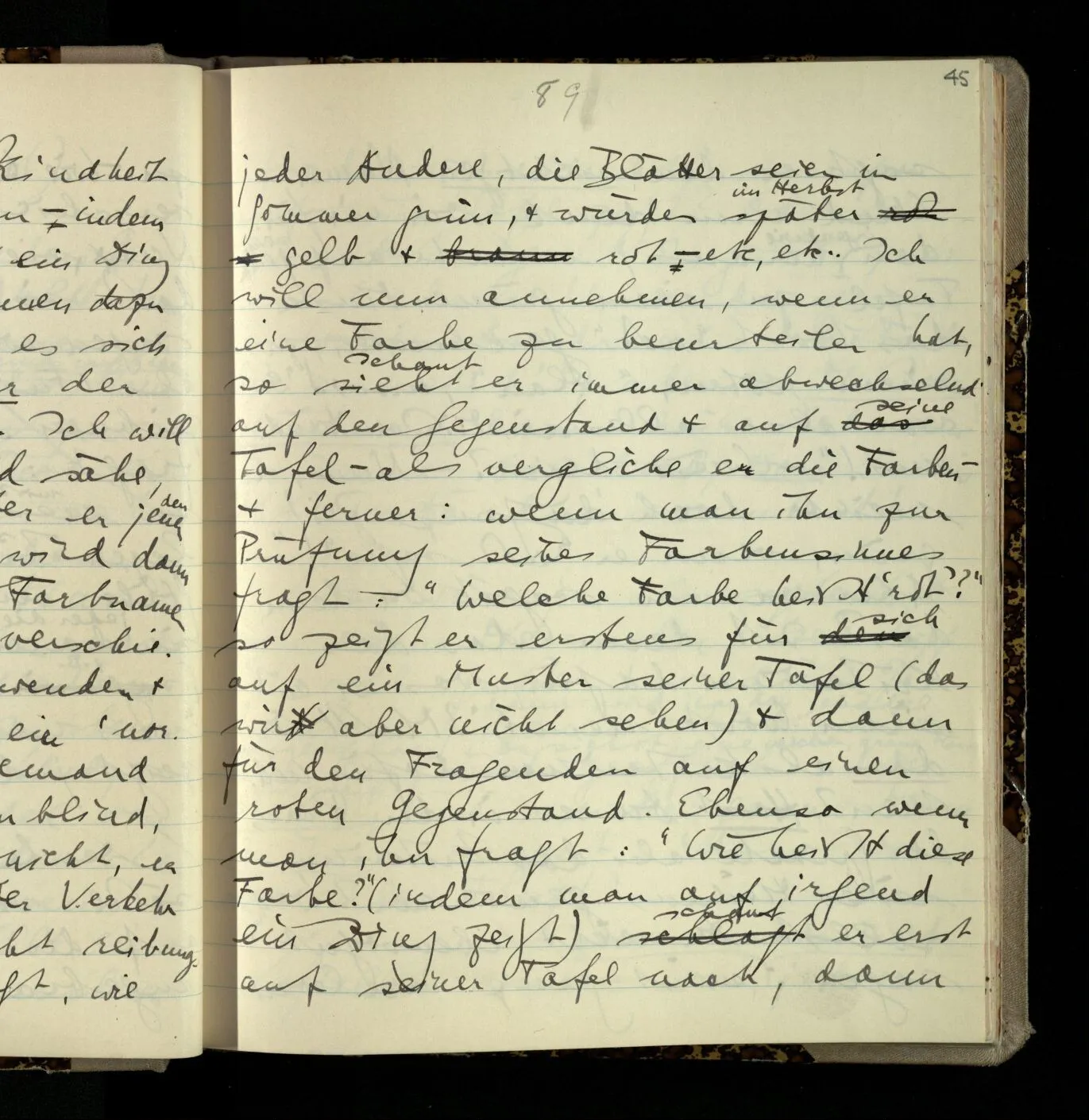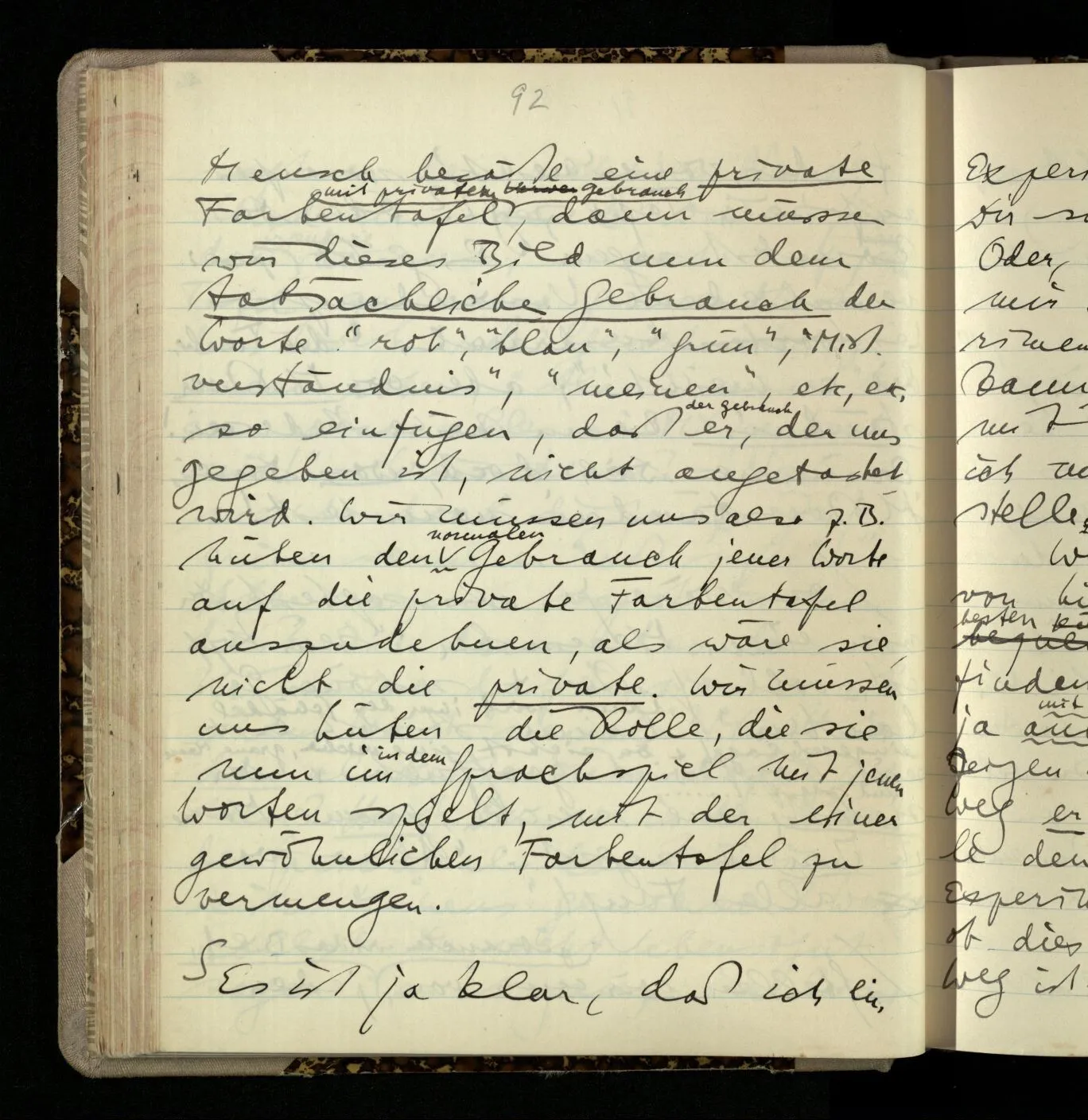 Von der privaten Vorstellung der Farbe Blau könnte ich ebensogut annehmen sie bleibe gleich wie sie ändere sich von einem Augenblick zum andern & nur für mein Gedächtnis des Farbeneindrucks seien dies immer die gleichen Eindrücke. Es erinnere sich sozusagen immer falsch & was verschieden war kommt ihm gleich vor.