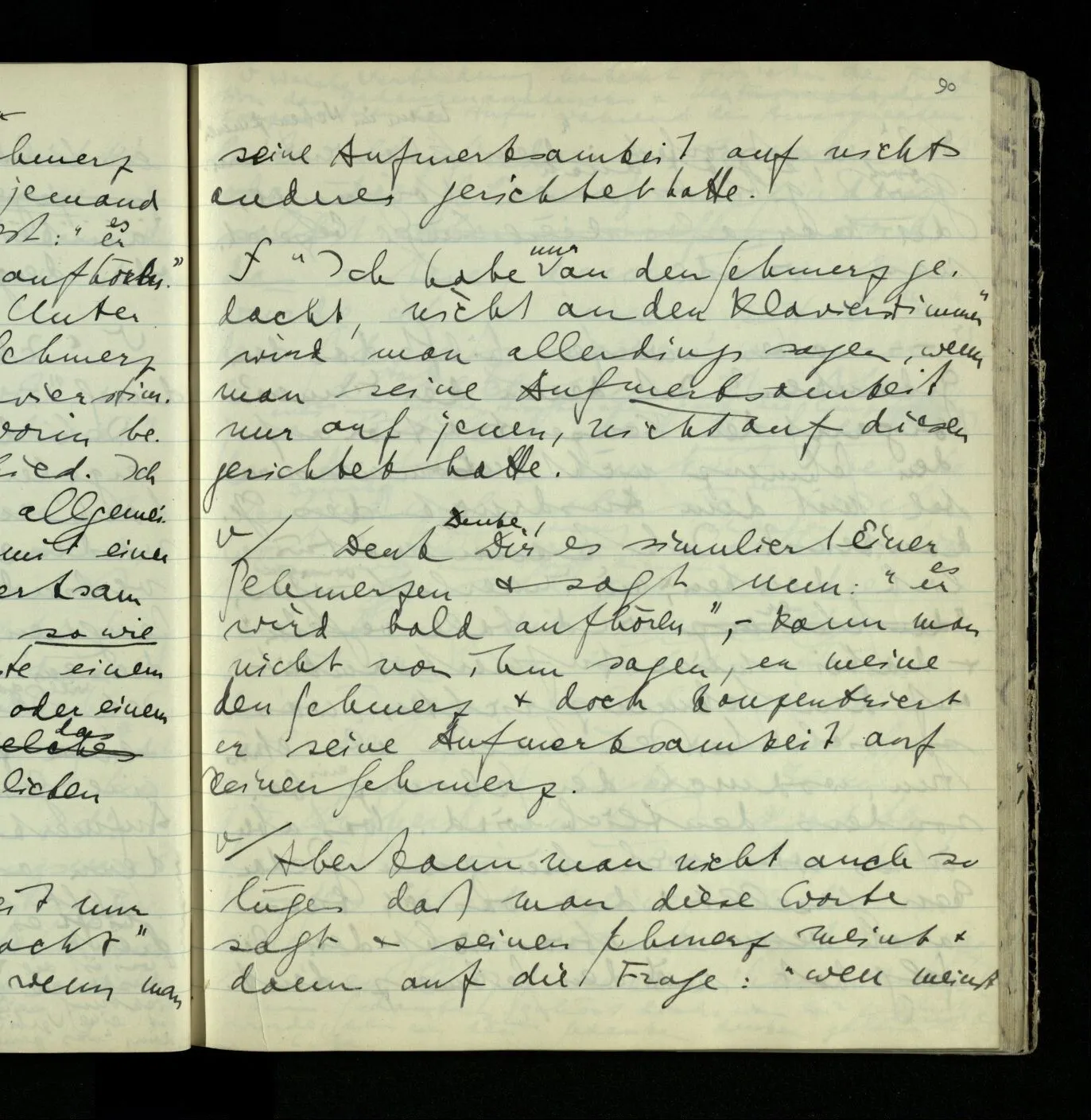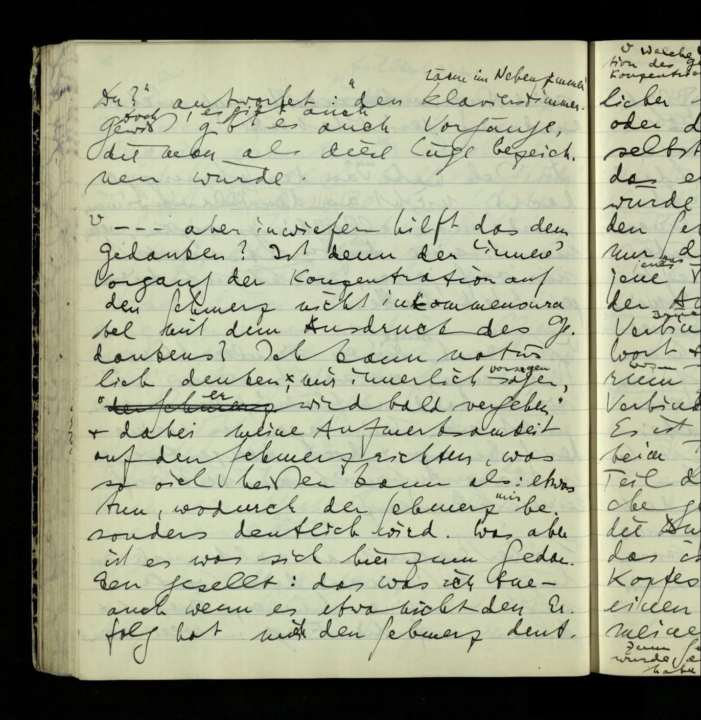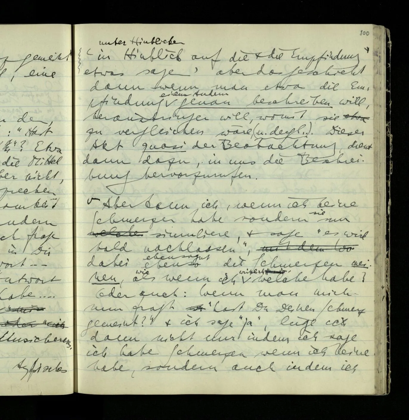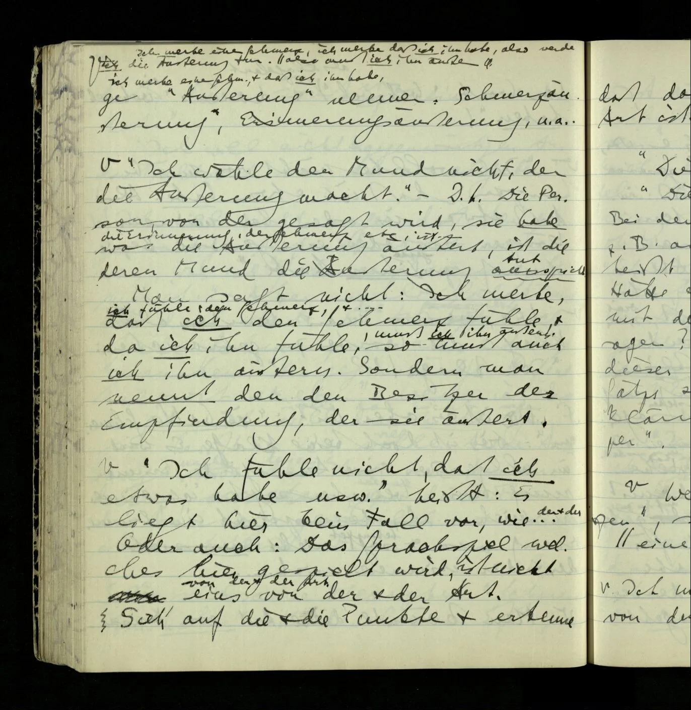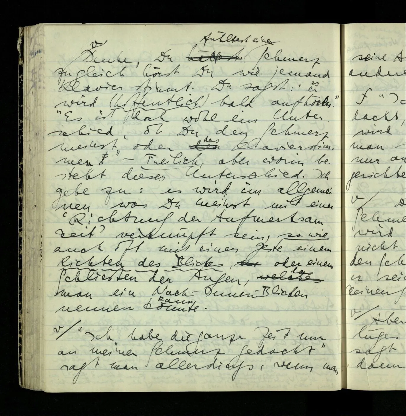 Der Vorgang des Horchens mag auf das zeigen, was man hört; aber das innere Erlebnis des Horchens zeigt doch nicht auf das innere Erlebnis des Hörens. So zeigt die Aufmerksamkeit auf den Schmerz gleichsam auf den Ort des Schmerzes, aber nicht gleichsam auf die Empfindung, die kommt & geht wie sie will & auf die zu zeigen, nicht in meiner Macht steht.
