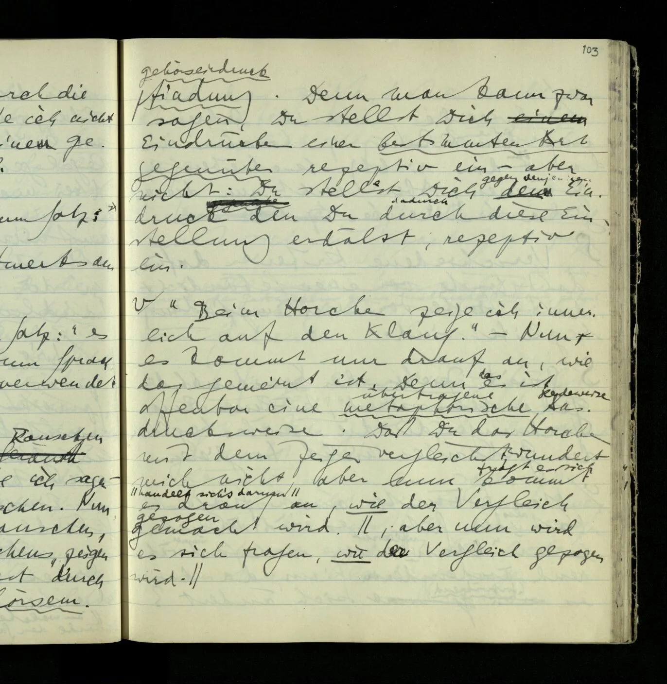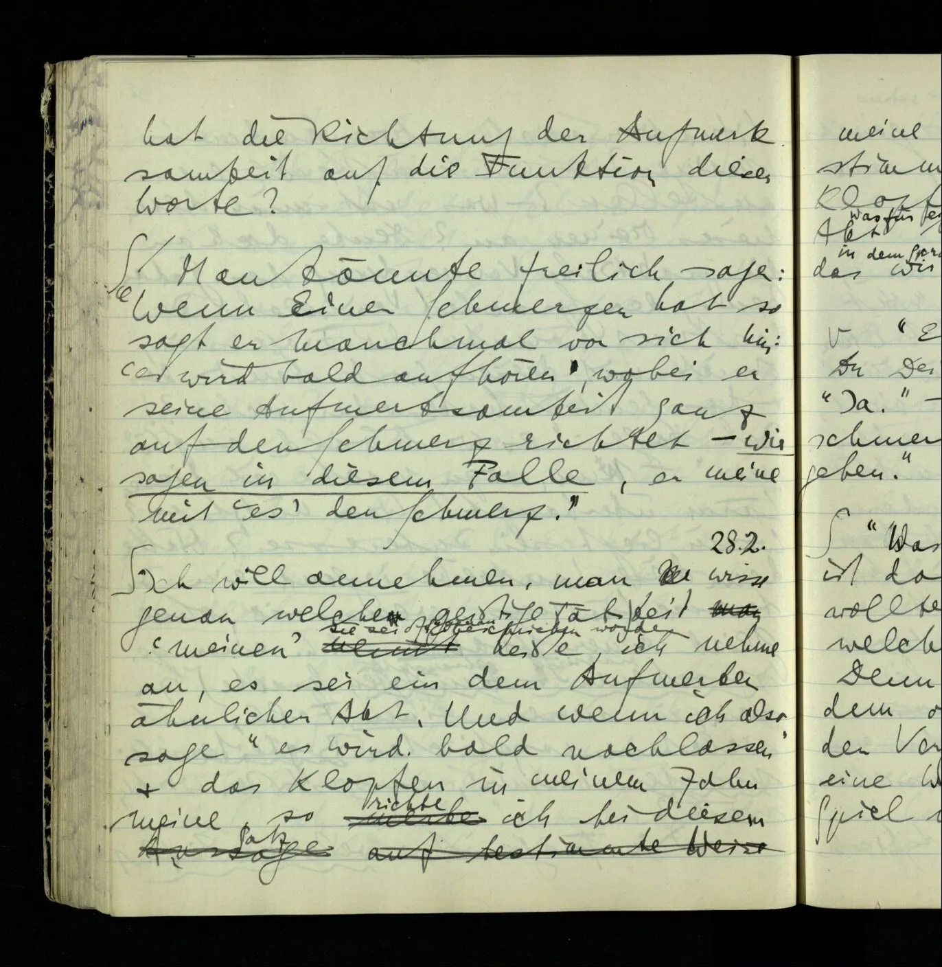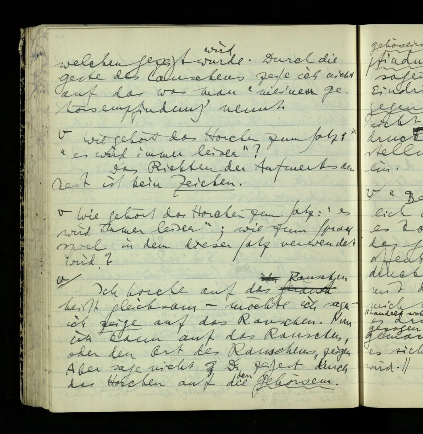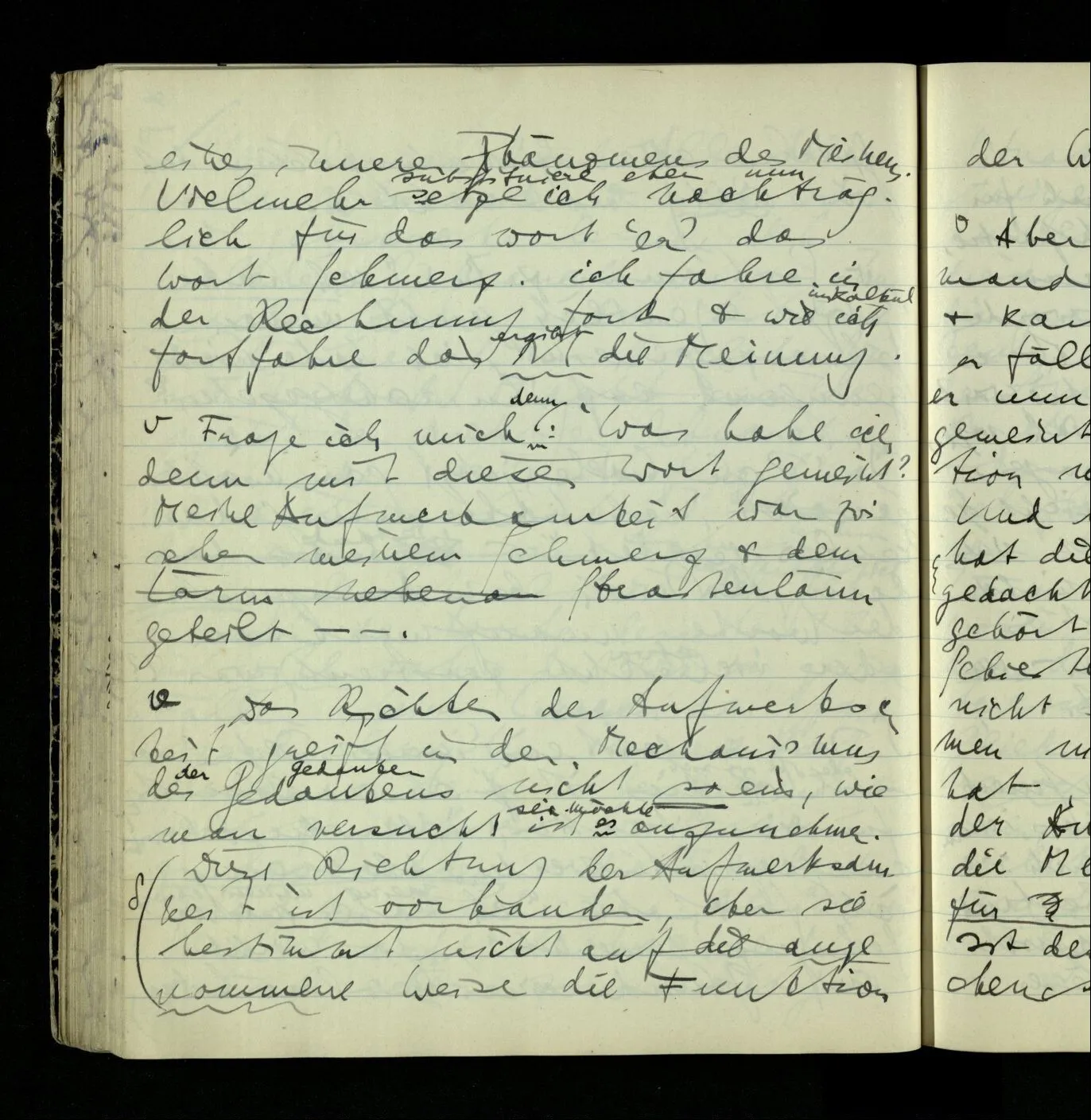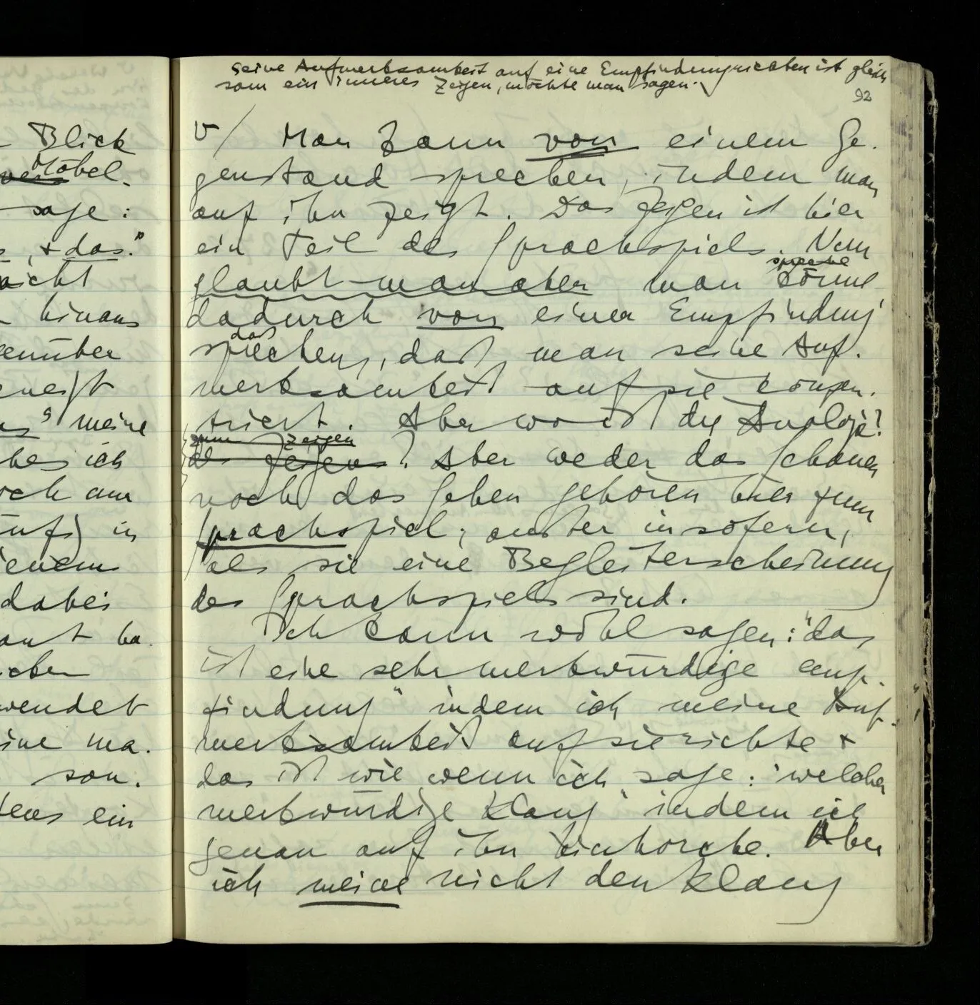 Der Vorgang des Horchens mag auf das zeigen, was man hört; aber das innere Erlebnis des Horchens zeigt doch nicht auf das innere Erlebnis des Hörens. So zeigt die Aufmerksamkeit auf den Schmerz gleichsam auf den Ort des Schmerzes, aber nicht gleichsam auf die Empfindung, die kommt & geht wie sie will & auf die zu zeigen, nicht in meiner Macht steht.