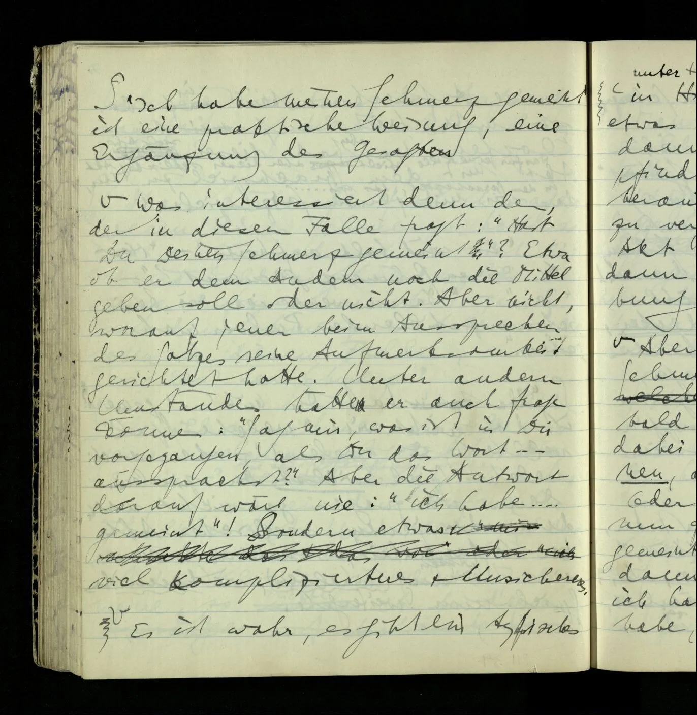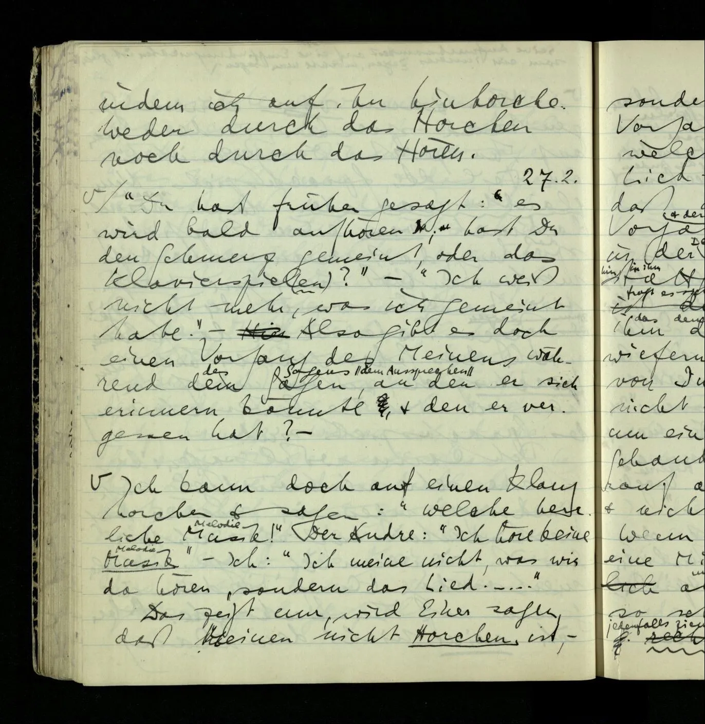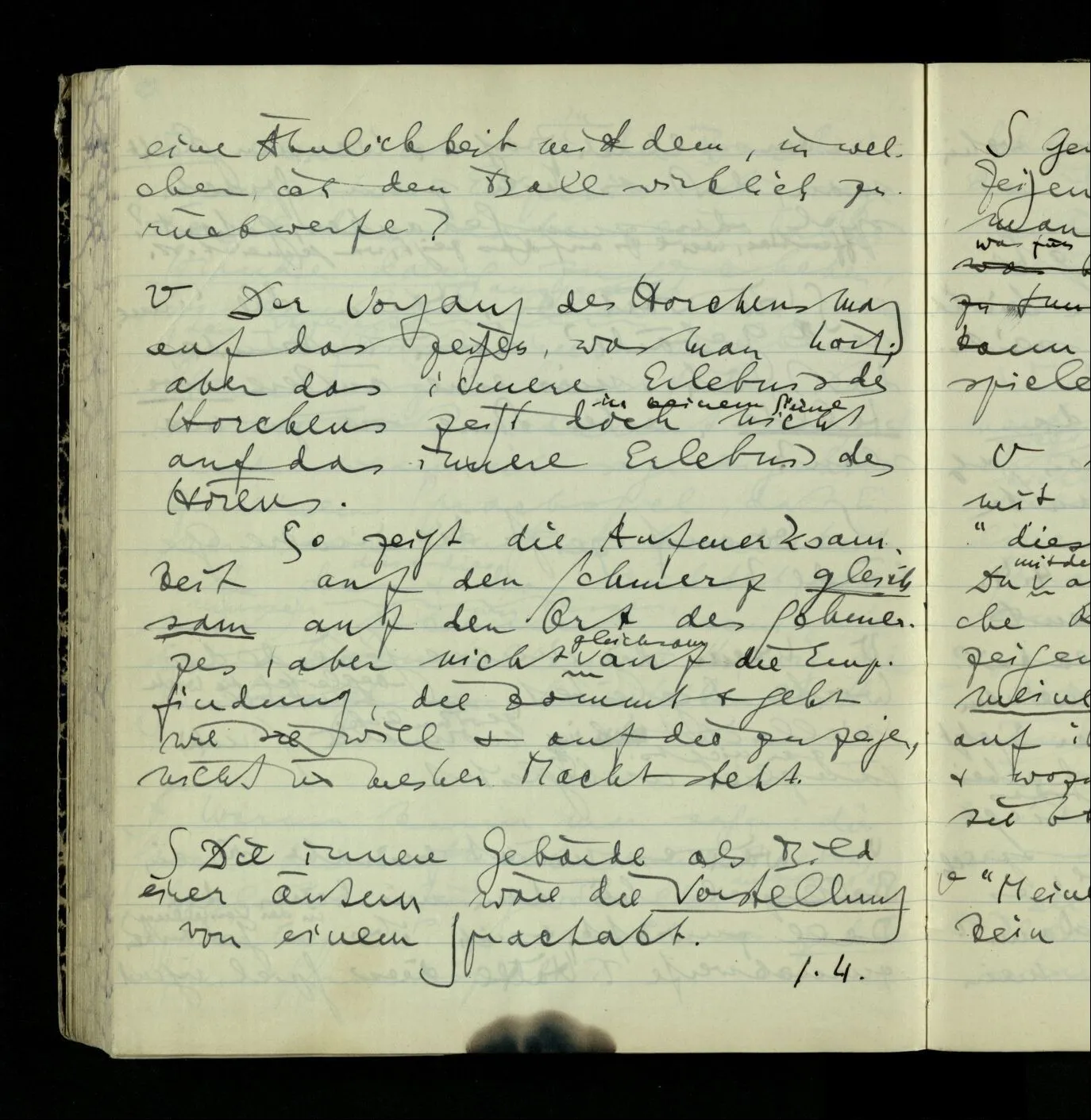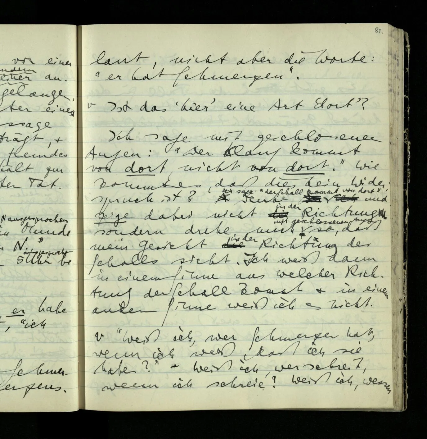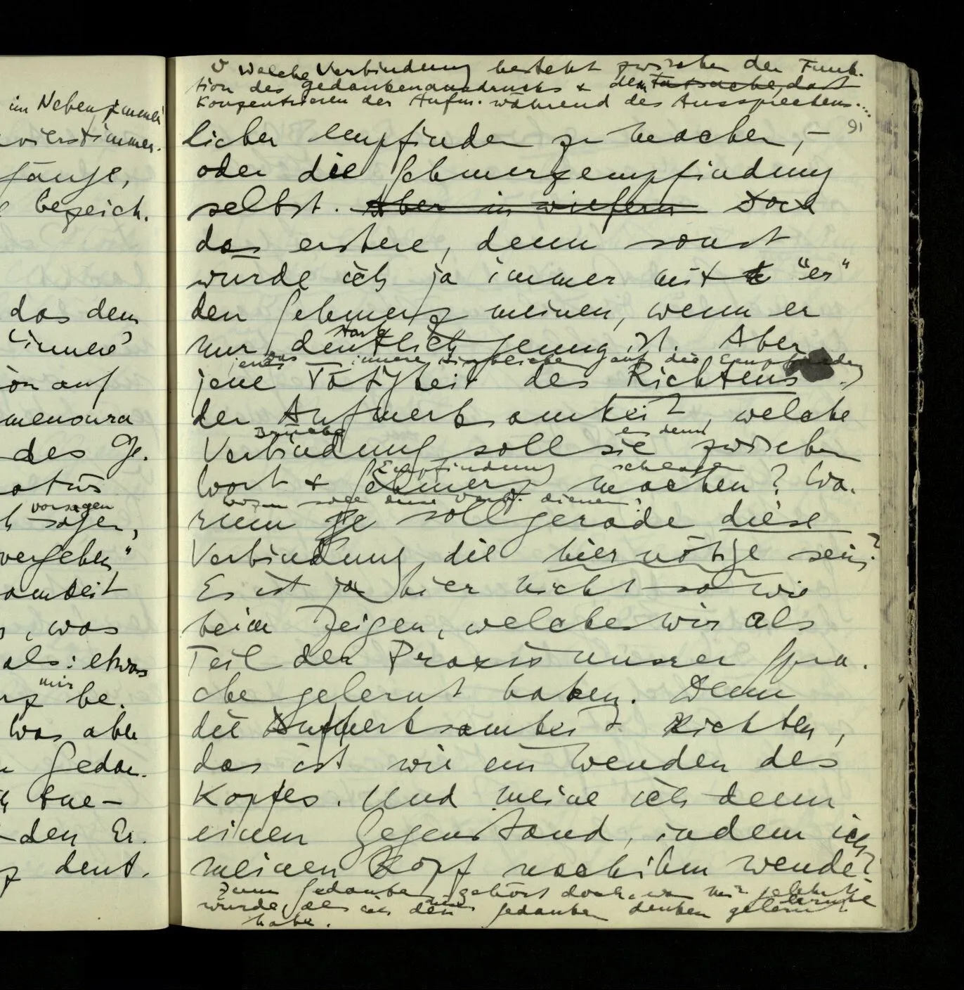Der Vorgang des Horchens mag auf das zeigen, was man hört; aber das innere Erlebnis des Horchens zeigt doch nicht auf das innere Erlebnis des Hörens. So zeigt die Aufmerksamkeit auf den Schmerz gleichsam auf den Ort des Schmerzes, aber nicht gleichsam auf die Empfindung, die kommt & geht wie sie will & auf die zu zeigen, nicht in meiner Macht steht.