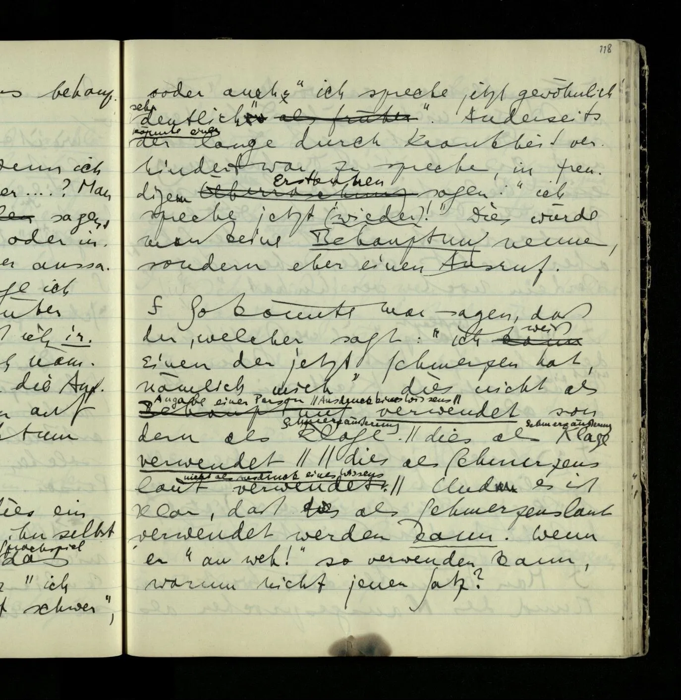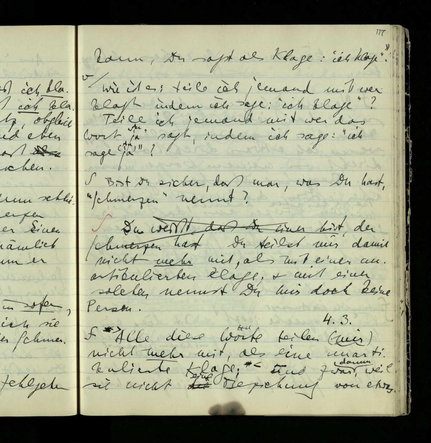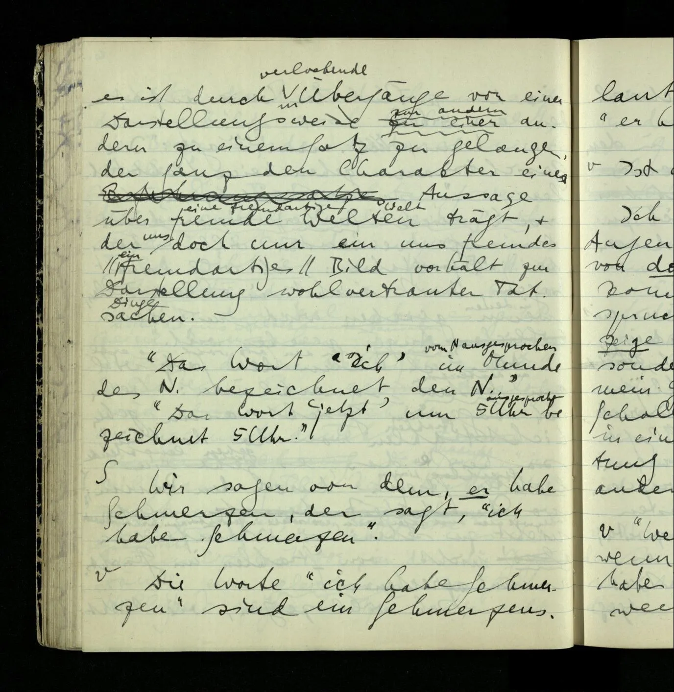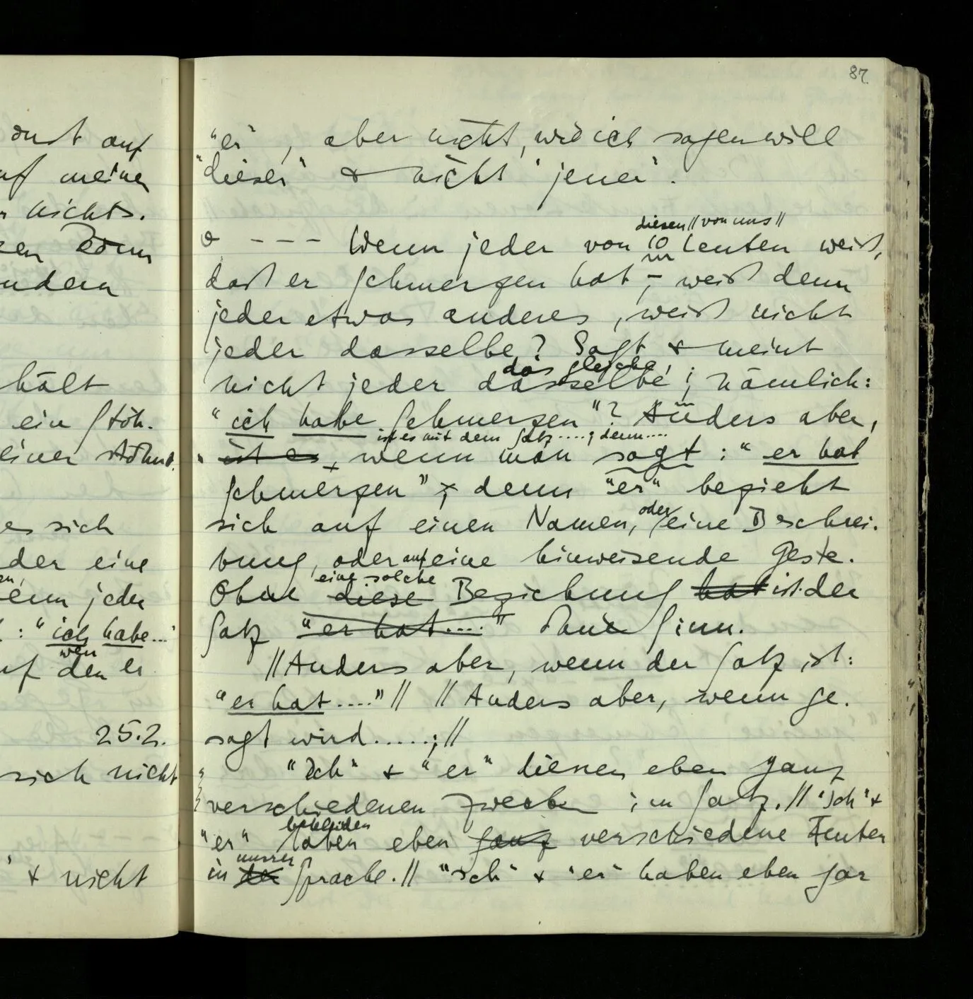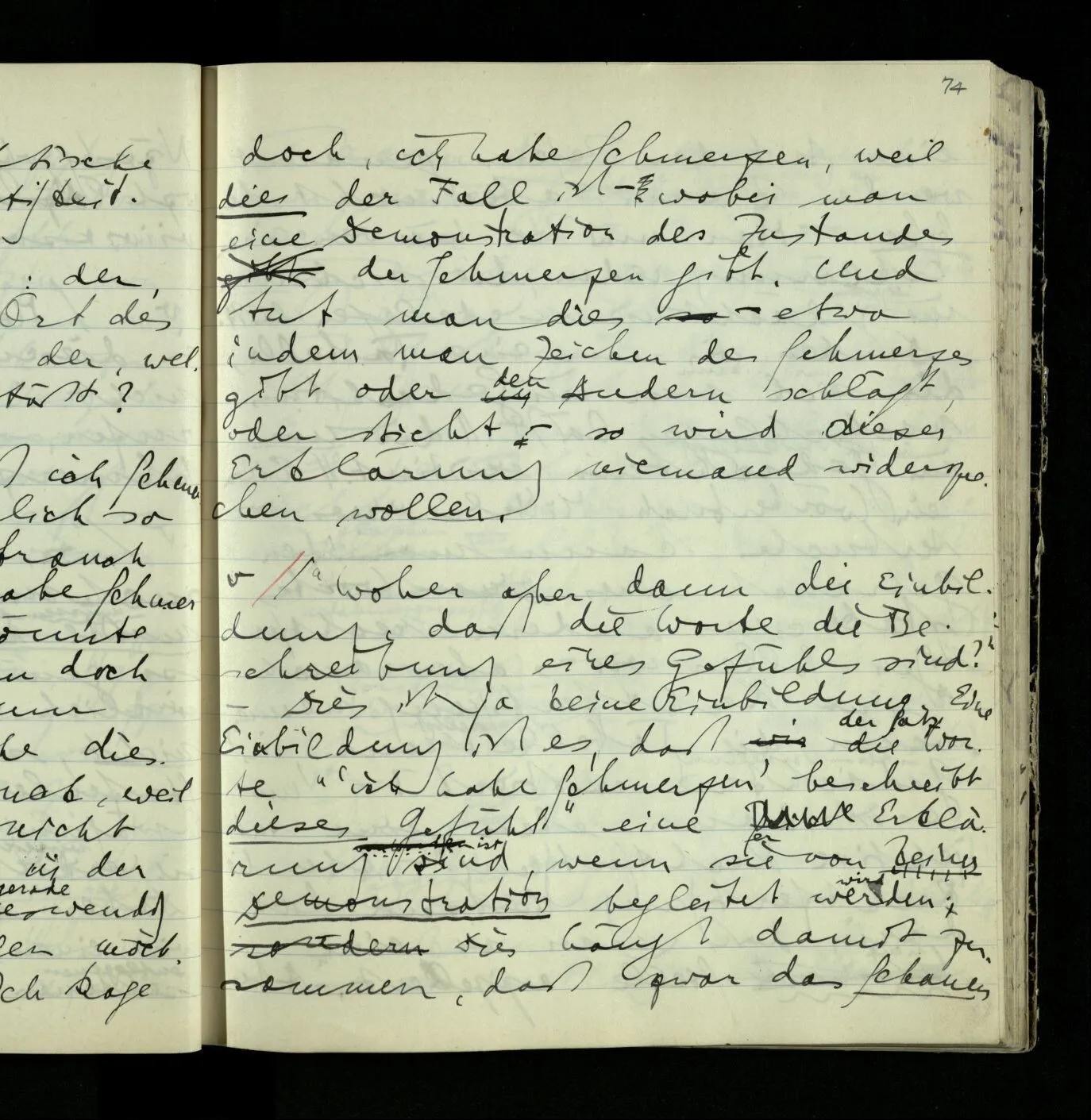 “Wenn ich Schmerzen haben kann, kann sie der Andre auch haben. Sowie ich sie haben kann, kann sie der Andre haben.” – Aber ich kenne gar nicht das Etwas, was vor mir auf ihn übergehen kann. Jener Satz heißt doch eigentlich: Du mußt doch verstehen, was es heißt, der Andre habe Schmerzen, wenn Du weißt wie es ist, wenn Du sie hast! Wie: “Du mußt doch verstehen, was es heißt, in jener Lampe ist ein Docht, wenn ich Dir zeige, daß in dieser einer ist. Aber wie wenn ich den Übergang nicht machen kann? Oder vielmehr: was heißt es denn ihn machen? Wenn es ein ‘augenblickliches’ Verstehen ist, ist es auf der gleichen Stufe wie ein Gestikulieren, woher ich, etwa, das Gesicht schmerzlich verziehe & dabei eindringlich auf den Andern deute. (Denk daran wie man einem kleinen Kind sagt seine Puppe habe ‘weh weh’). Aber ich könnte verschiedene Übergänge machen, & das zeigt daß man nicht sagen kann: das & das bezeichnet man mit “Schmerz” & Du weißt was “ich habe”, “Du hast” etc. bedeutet, so weißt Du, was es heißt: “er hat Schmerzen”.