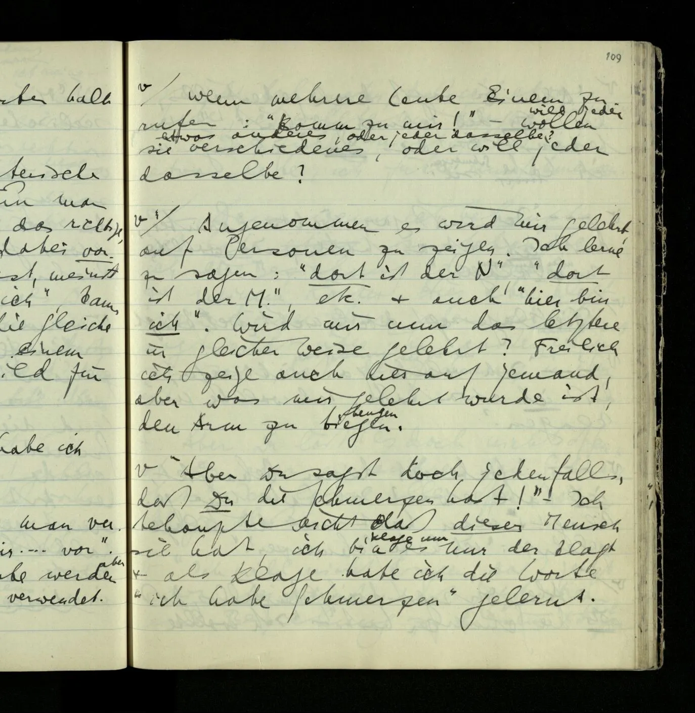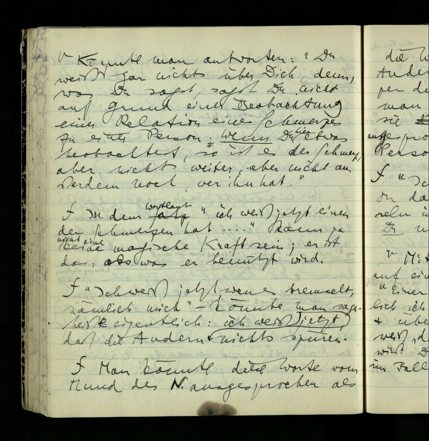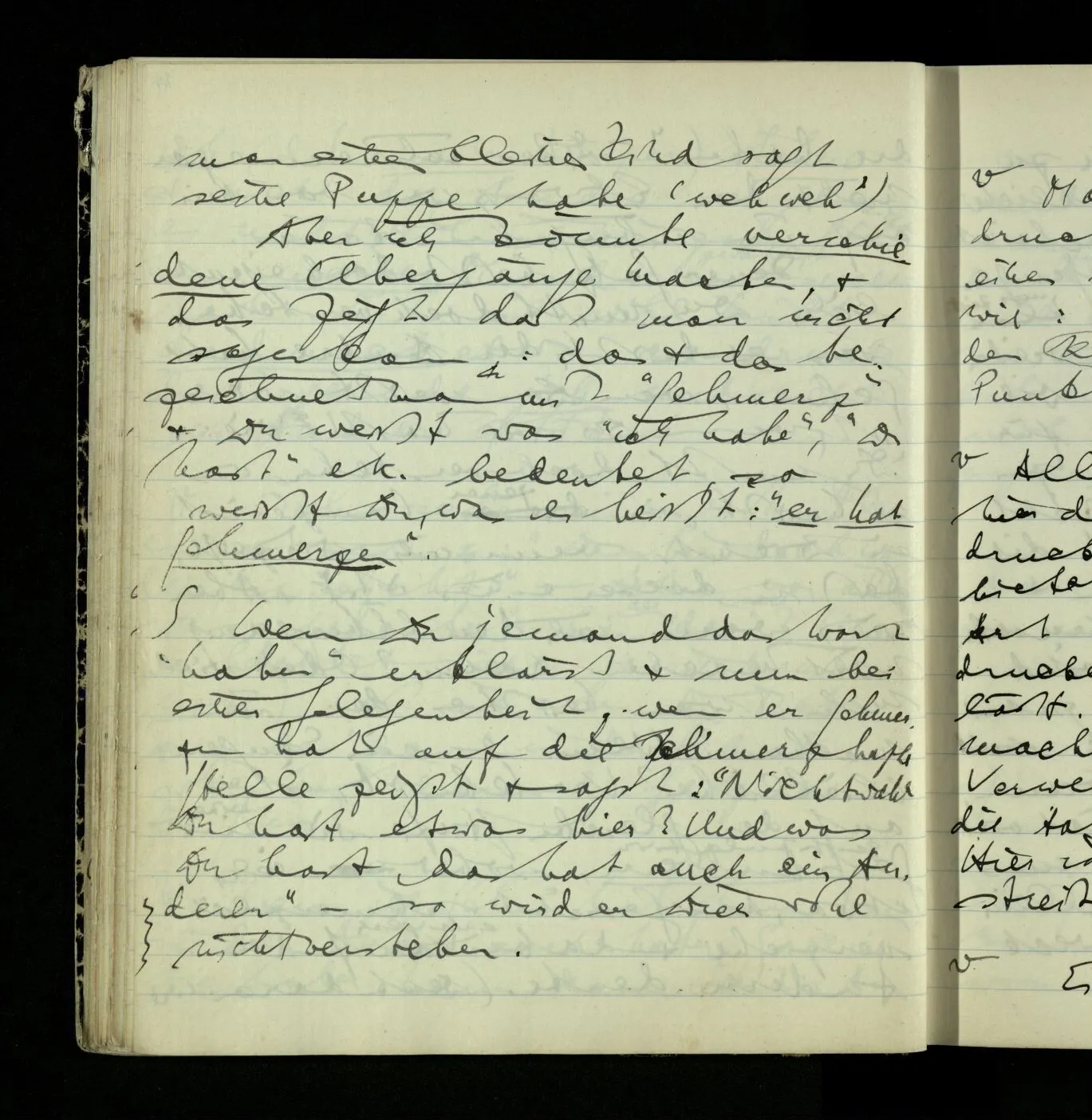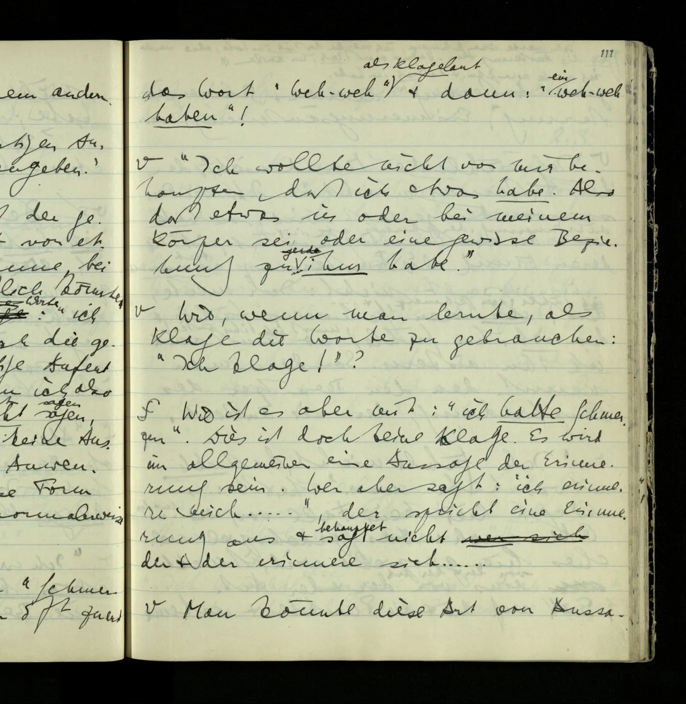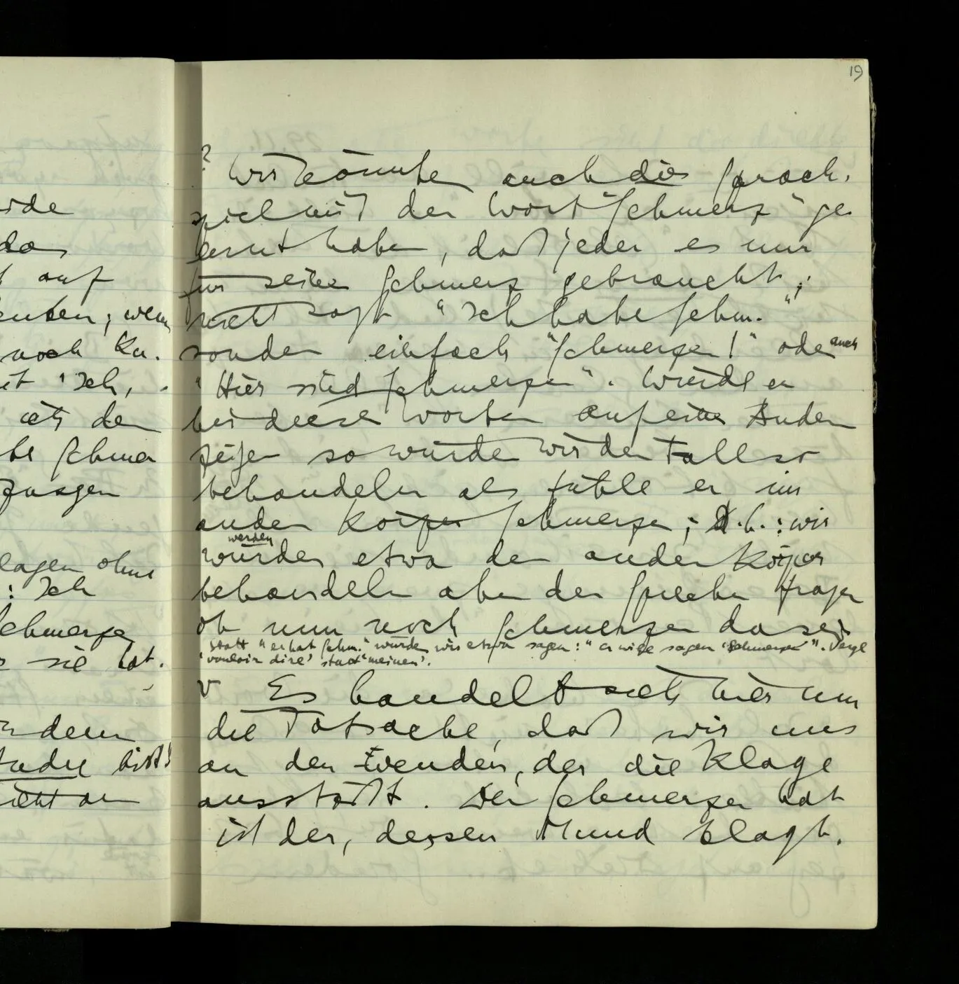 “Wenn ich Schmerzen haben kann, kann sie der Andre auch haben. Sowie ich sie haben kann, kann sie der Andre haben.” – Aber ich kenne gar nicht das Etwas, was vor mir auf ihn übergehen kann. Jener Satz heißt doch eigentlich: Du mußt doch verstehen, was es heißt, der Andre habe Schmerzen, wenn Du weißt wie es ist, wenn Du sie hast! Wie: “Du mußt doch verstehen, was es heißt, in jener Lampe ist ein Docht, wenn ich Dir zeige, daß in dieser einer ist. Aber wie wenn ich den Übergang nicht machen kann? Oder vielmehr: was heißt es denn ihn machen? Wenn es ein ‘augenblickliches’ Verstehen ist, ist es auf der gleichen Stufe wie ein Gestikulieren, woher ich, etwa, das Gesicht schmerzlich verziehe & dabei eindringlich auf den Andern deute. (Denk daran wie man einem kleinen Kind sagt seine Puppe habe ‘weh weh’). Aber ich könnte verschiedene Übergänge machen, & das zeigt daß man nicht sagen kann: das & das bezeichnet man mit “Schmerz” & Du weißt was “ich habe”, “Du hast” etc. bedeutet, so weißt Du, was es heißt: “er hat Schmerzen”.