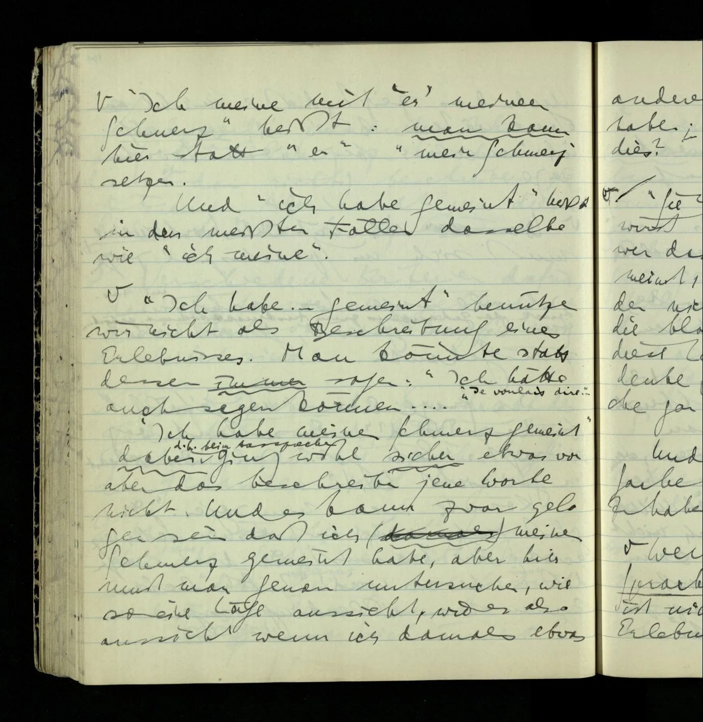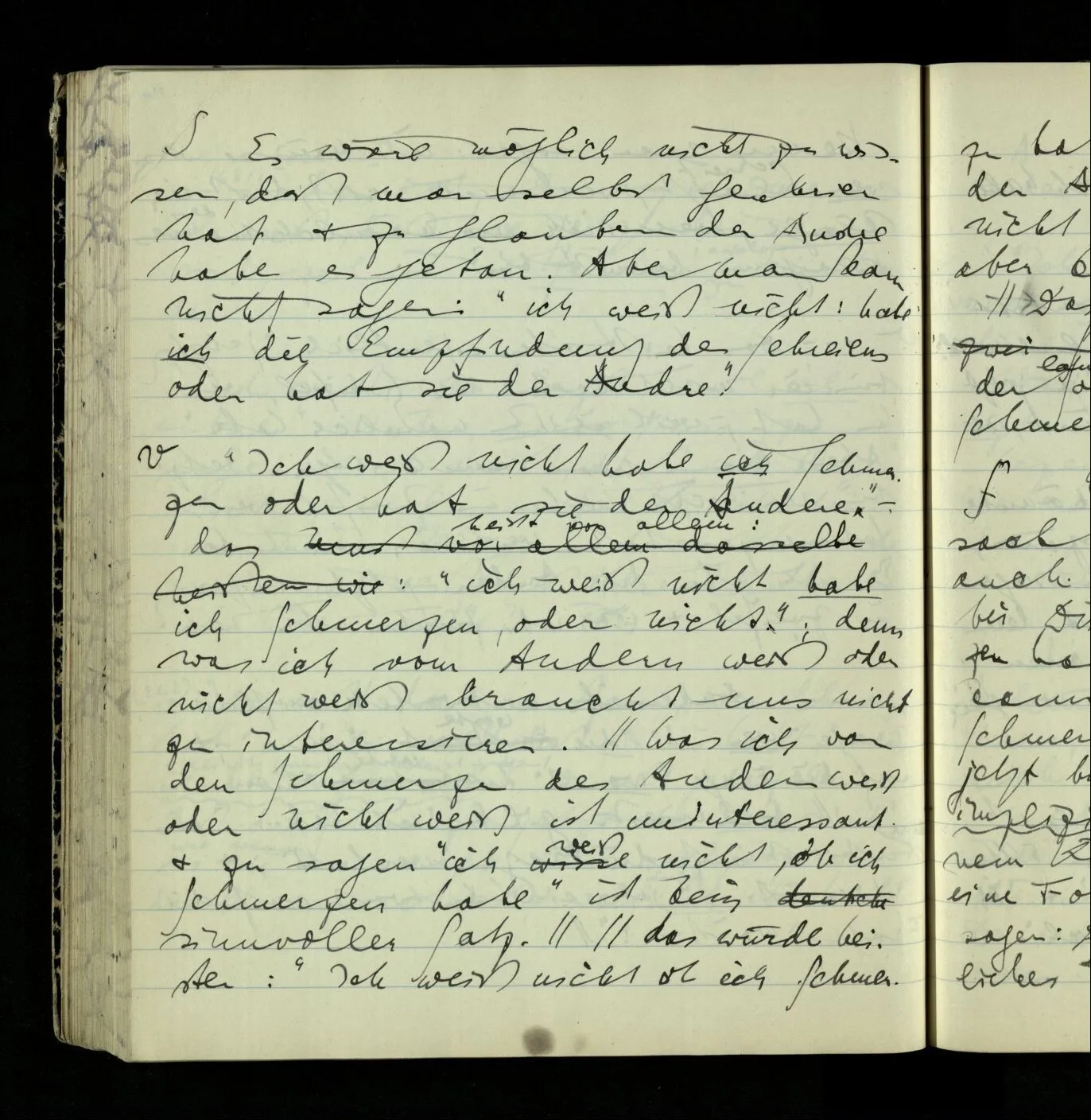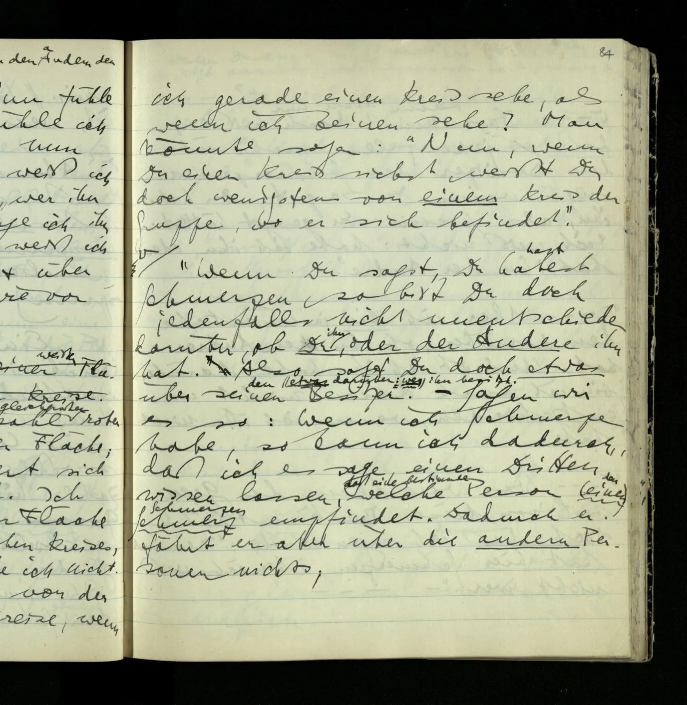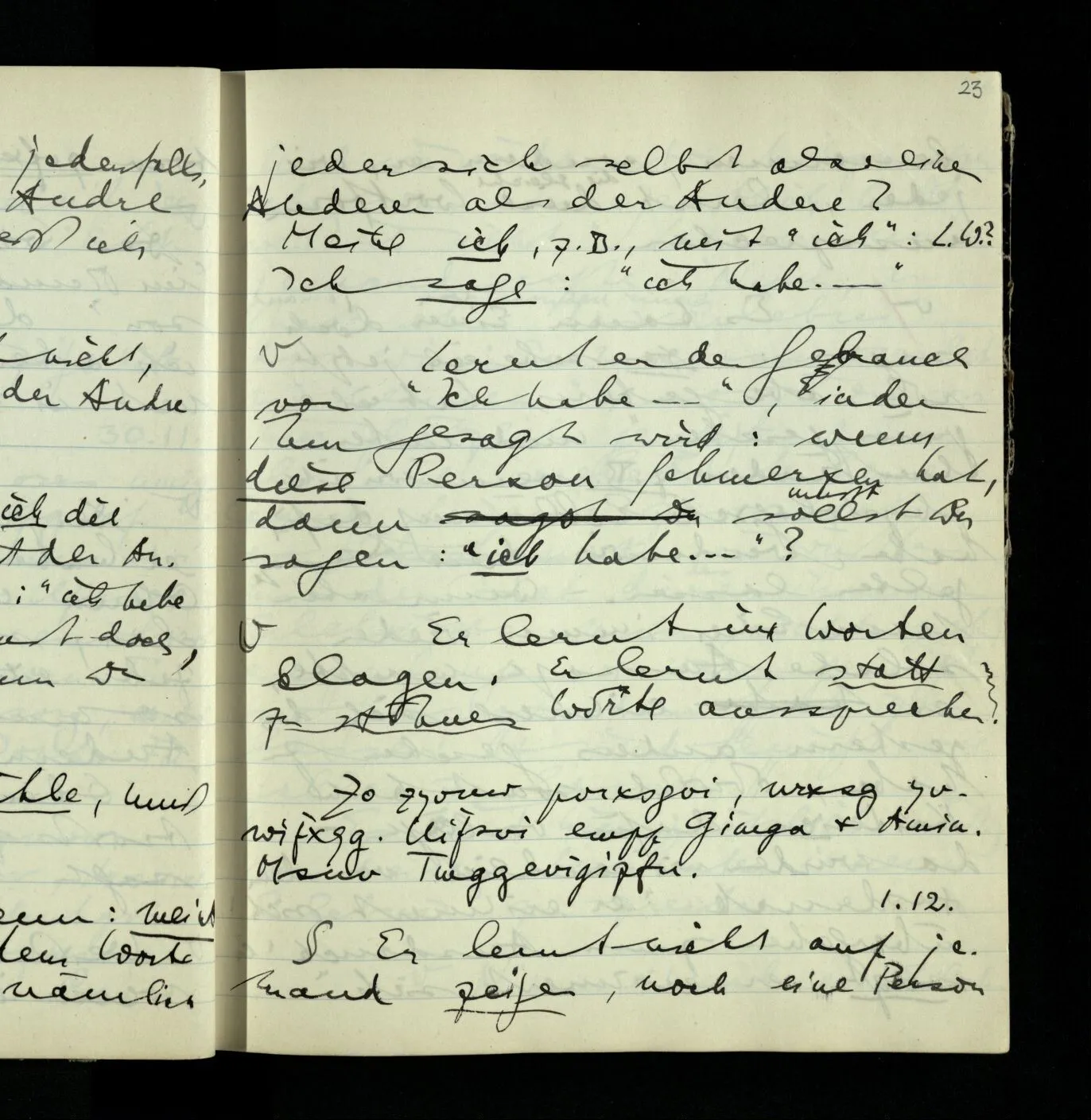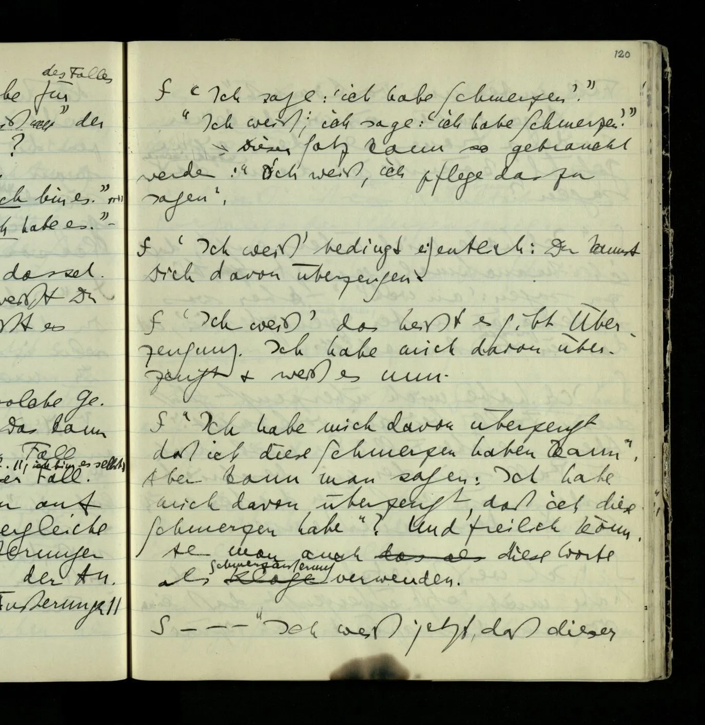 “Wenn ich Schmerzen haben kann, kann sie der Andre auch haben. Sowie ich sie haben kann, kann sie der Andre haben.” – Aber ich kenne gar nicht das Etwas, was vor mir auf ihn übergehen kann. Jener Satz heißt doch eigentlich: Du mußt doch verstehen, was es heißt, der Andre habe Schmerzen, wenn Du weißt wie es ist, wenn Du sie hast! Wie: “Du mußt doch verstehen, was es heißt, in jener Lampe ist ein Docht, wenn ich Dir zeige, daß in dieser einer ist. Aber wie wenn ich den Übergang nicht machen kann? Oder vielmehr: was heißt es denn ihn machen? Wenn es ein ‘augenblickliches’ Verstehen ist, ist es auf der gleichen Stufe wie ein Gestikulieren, woher ich, etwa, das Gesicht schmerzlich verziehe & dabei eindringlich auf den Andern deute. (Denk daran wie man einem kleinen Kind sagt seine Puppe habe ‘weh weh’). Aber ich könnte verschiedene Übergänge machen, & das zeigt daß man nicht sagen kann: das & das bezeichnet man mit “Schmerz” & Du weißt was “ich habe”, “Du hast” etc. bedeutet, so weißt Du, was es heißt: “er hat Schmerzen”.