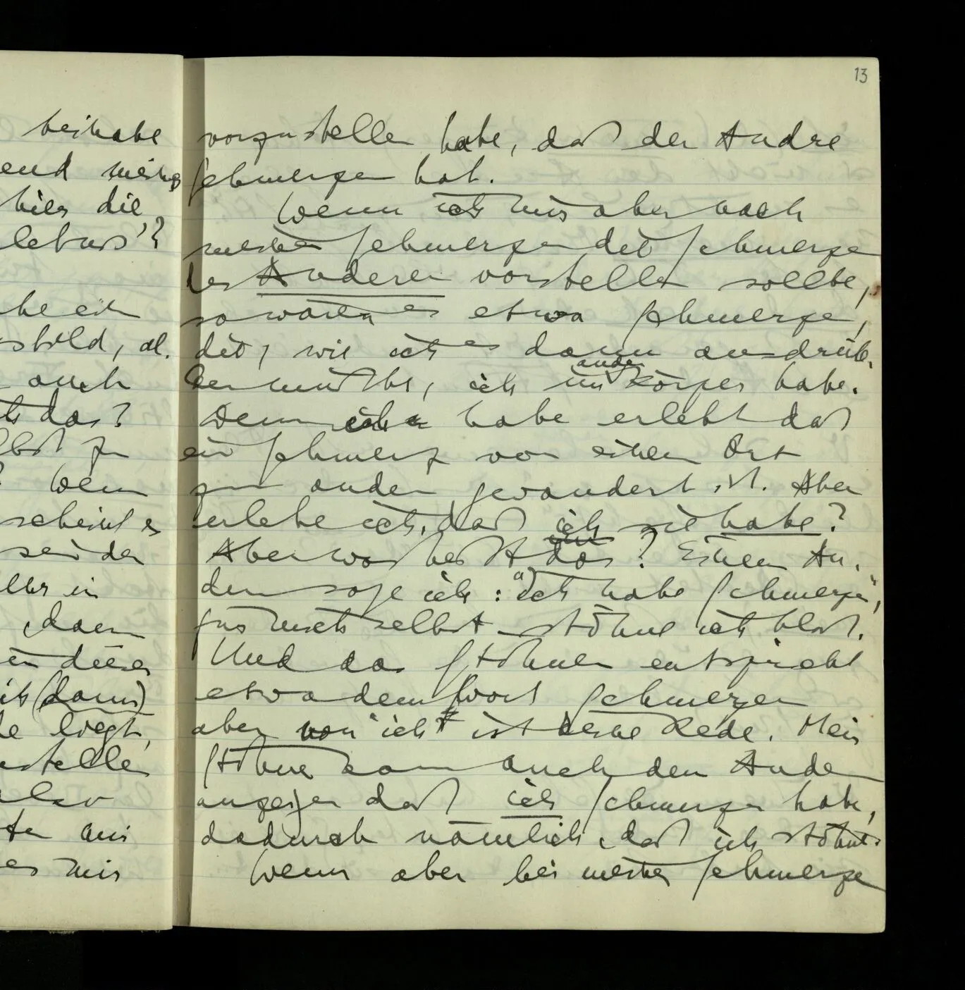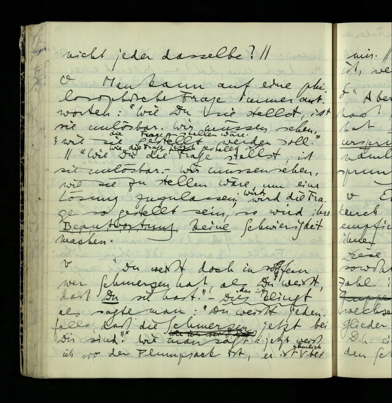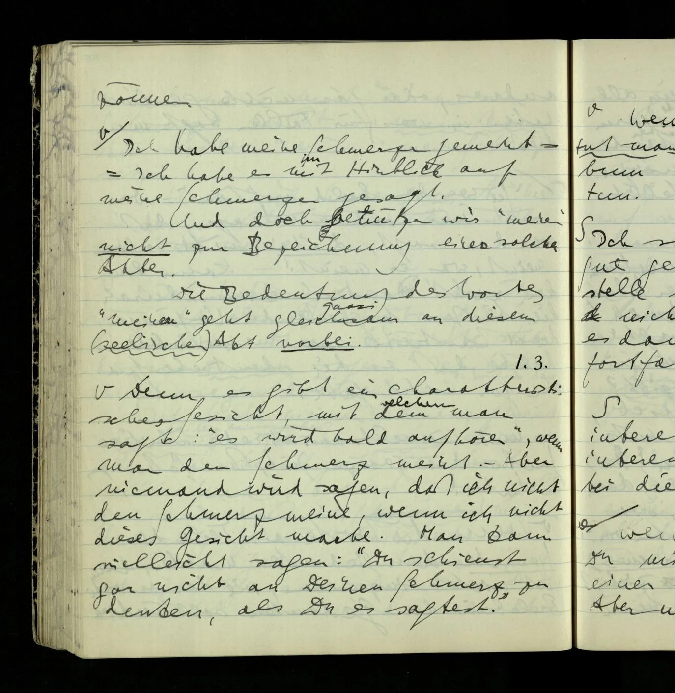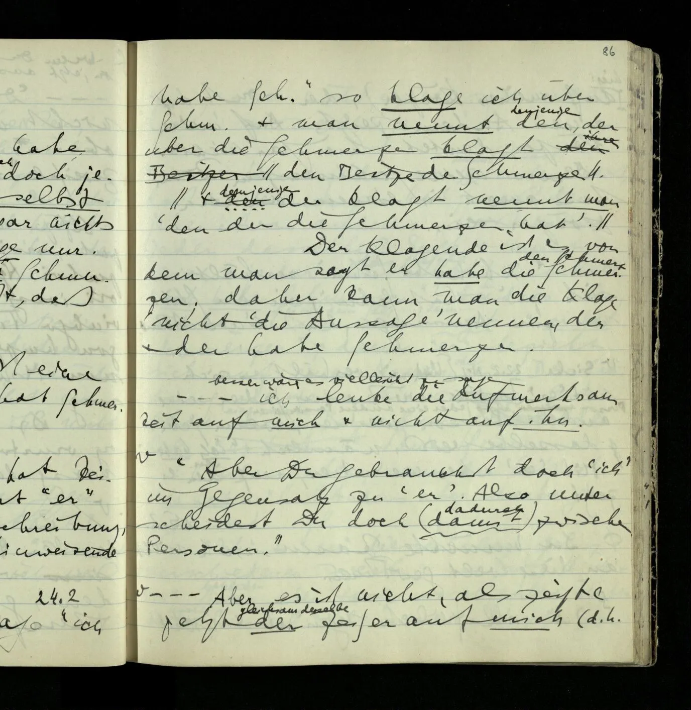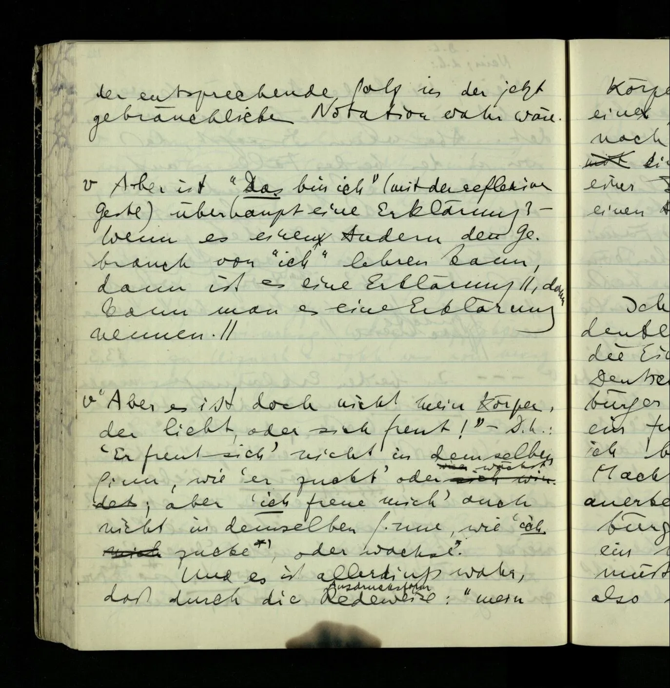 “Wenn ich Schmerzen haben kann, kann sie der Andre auch haben. Sowie ich sie haben kann, kann sie der Andre haben.” – Aber ich kenne gar nicht das Etwas, was vor mir auf ihn übergehen kann. Jener Satz heißt doch eigentlich: Du mußt doch verstehen, was es heißt, der Andre habe Schmerzen, wenn Du weißt wie es ist, wenn Du sie hast! Wie: “Du mußt doch verstehen, was es heißt, in jener Lampe ist ein Docht, wenn ich Dir zeige, daß in dieser einer ist. Aber wie wenn ich den Übergang nicht machen kann? Oder vielmehr: was heißt es denn ihn machen? Wenn es ein ‘augenblickliches’ Verstehen ist, ist es auf der gleichen Stufe wie ein Gestikulieren, woher ich, etwa, das Gesicht schmerzlich verziehe & dabei eindringlich auf den Andern deute. (Denk daran wie man einem kleinen Kind sagt seine Puppe habe ‘weh weh’). Aber ich könnte verschiedene Übergänge machen, & das zeigt daß man nicht sagen kann: das & das bezeichnet man mit “Schmerz” & Du weißt was “ich habe”, “Du hast” etc. bedeutet, so weißt Du, was es heißt: “er hat Schmerzen”.
