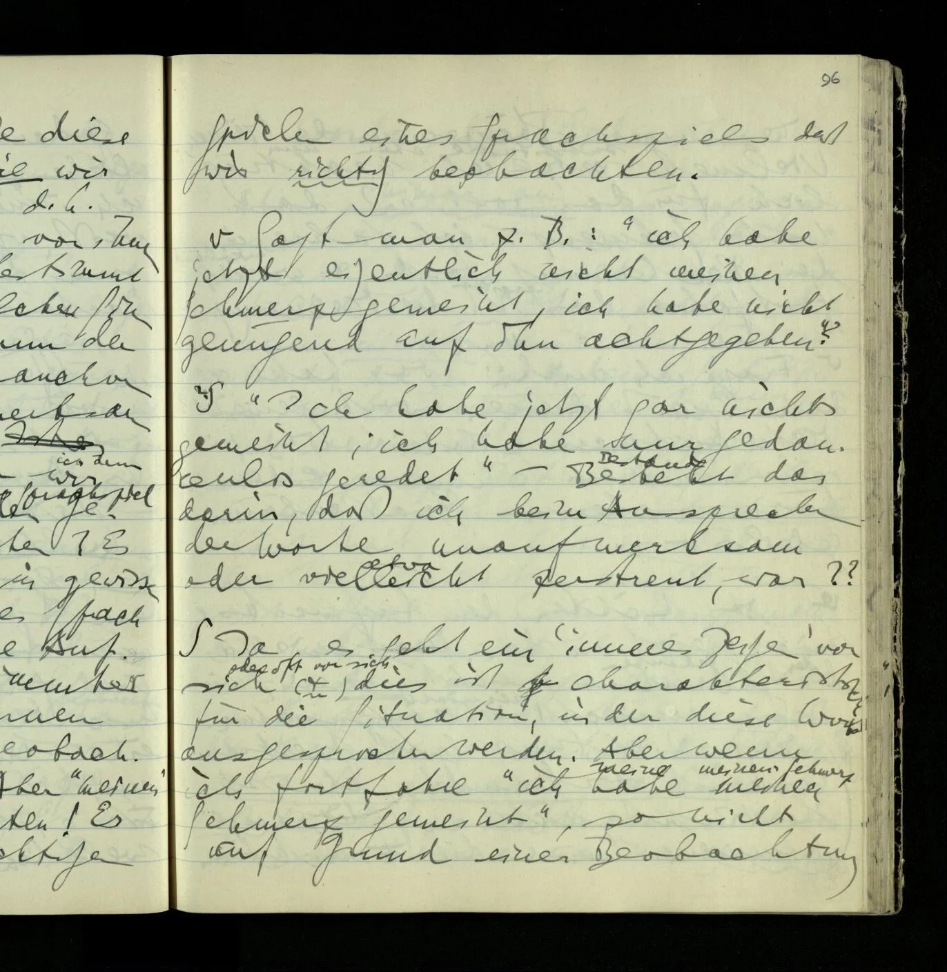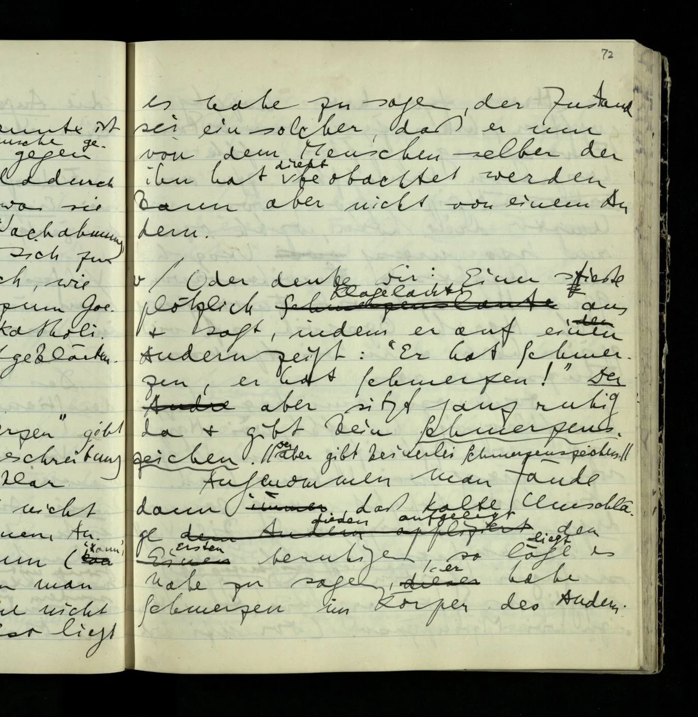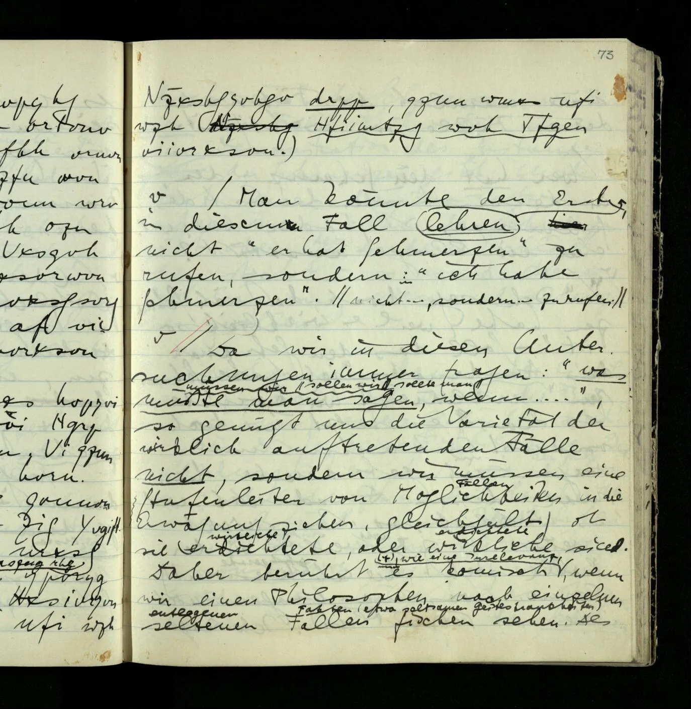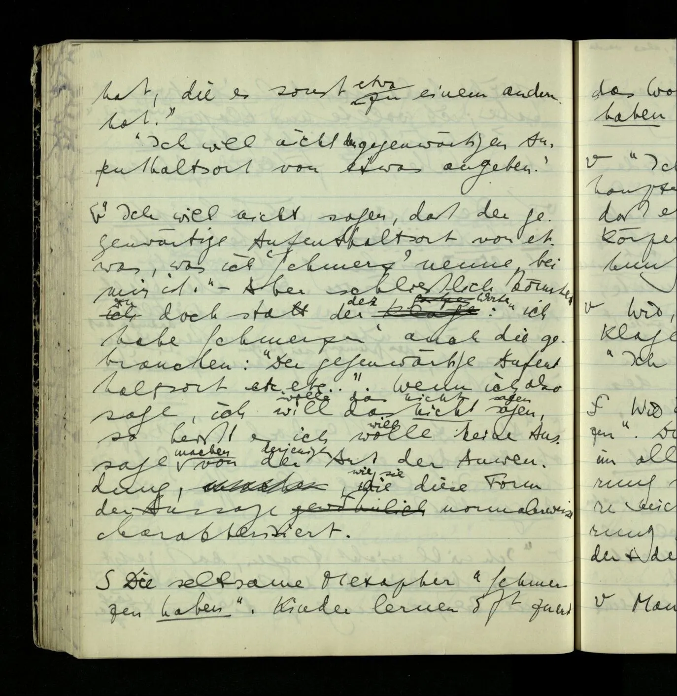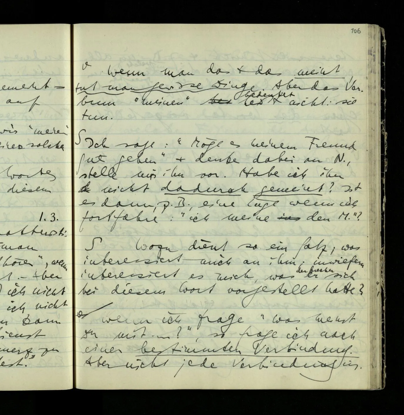 “Wenn ich Schmerzen haben kann, kann sie der Andre auch haben. Sowie ich sie haben kann, kann sie der Andre haben.” – Aber ich kenne gar nicht das Etwas, was vor mir auf ihn übergehen kann. Jener Satz heißt doch eigentlich: Du mußt doch verstehen, was es heißt, der Andre habe Schmerzen, wenn Du weißt wie es ist, wenn Du sie hast! Wie: “Du mußt doch verstehen, was es heißt, in jener Lampe ist ein Docht, wenn ich Dir zeige, daß in dieser einer ist. Aber wie wenn ich den Übergang nicht machen kann? Oder vielmehr: was heißt es denn ihn machen? Wenn es ein ‘augenblickliches’ Verstehen ist, ist es auf der gleichen Stufe wie ein Gestikulieren, woher ich, etwa, das Gesicht schmerzlich verziehe & dabei eindringlich auf den Andern deute. (Denk daran wie man einem kleinen Kind sagt seine Puppe habe ‘weh weh’). Aber ich könnte verschiedene Übergänge machen, & das zeigt daß man nicht sagen kann: das & das bezeichnet man mit “Schmerz” & Du weißt was “ich habe”, “Du hast” etc. bedeutet, so weißt Du, was es heißt: “er hat Schmerzen”.