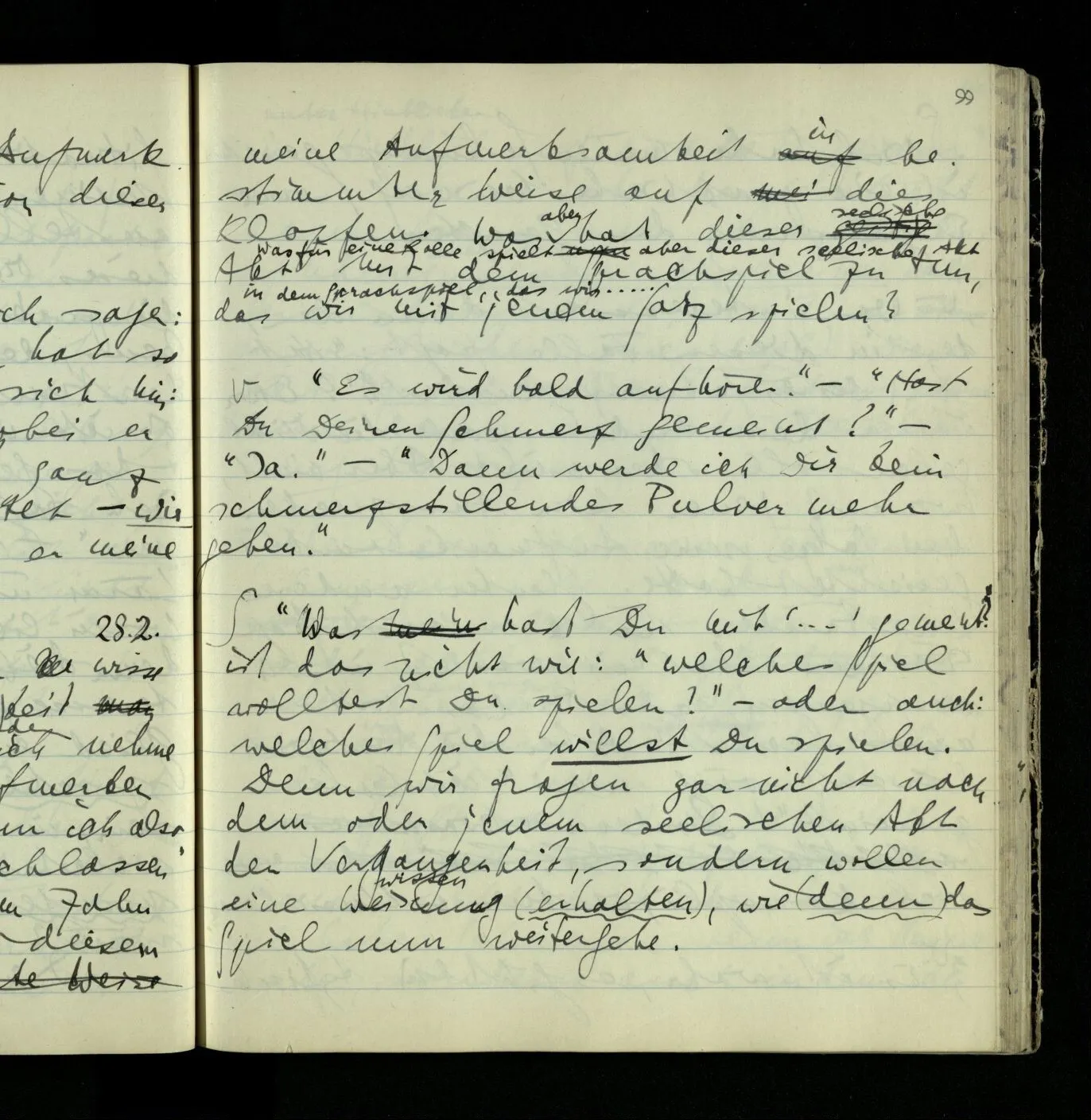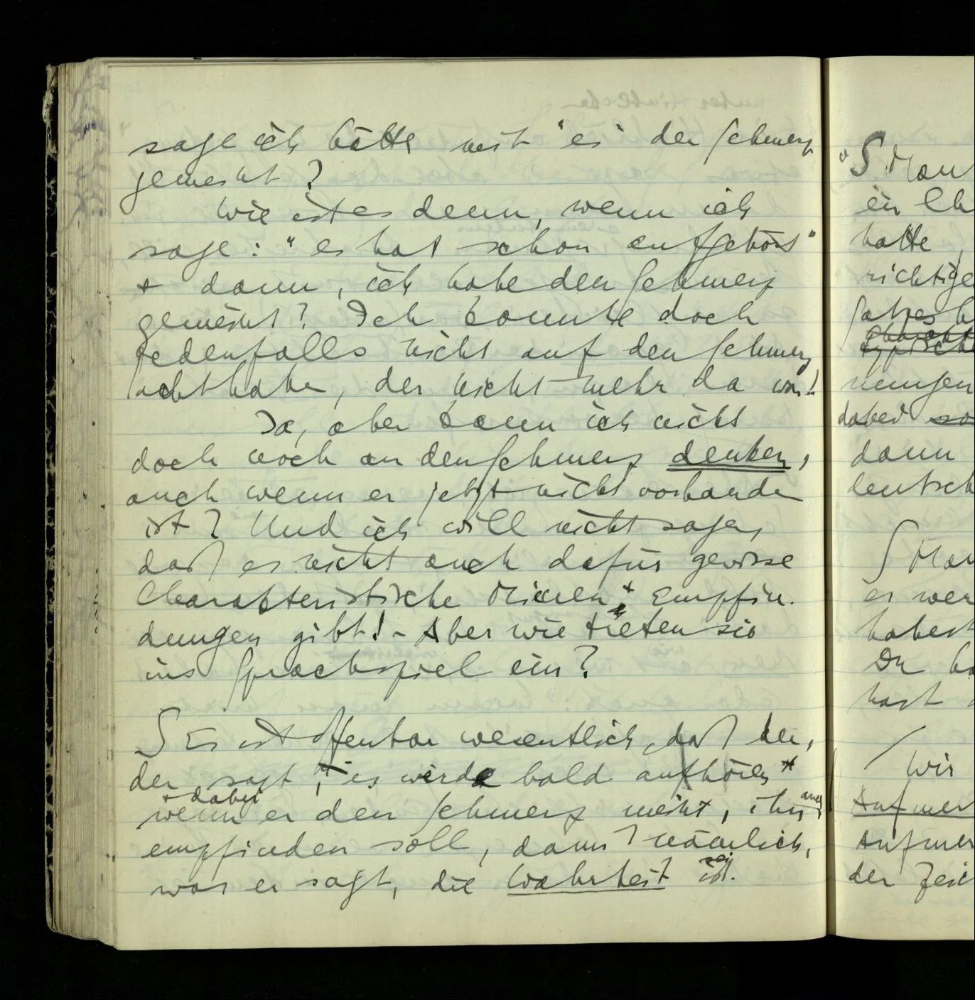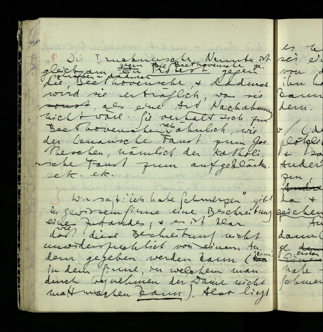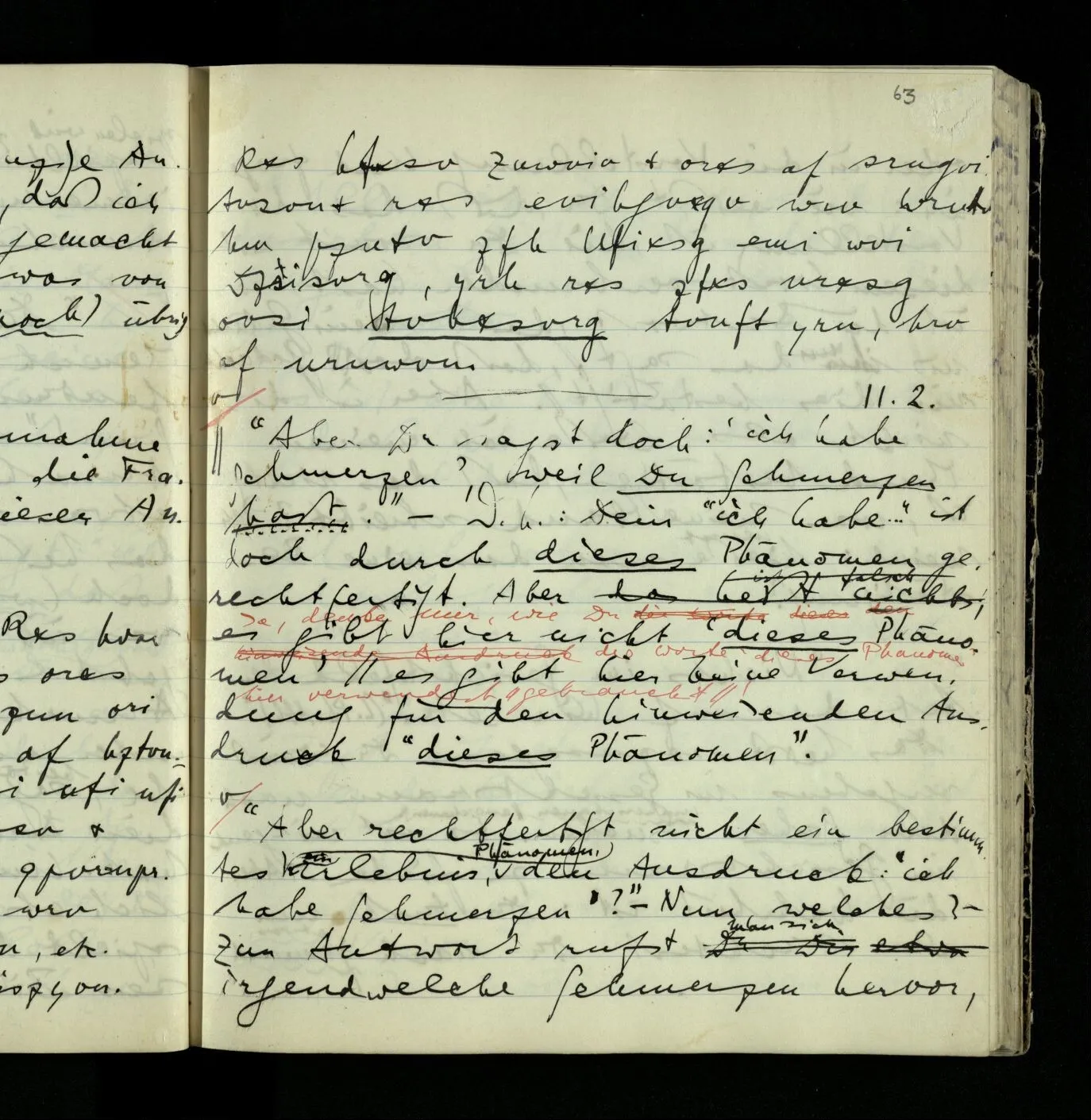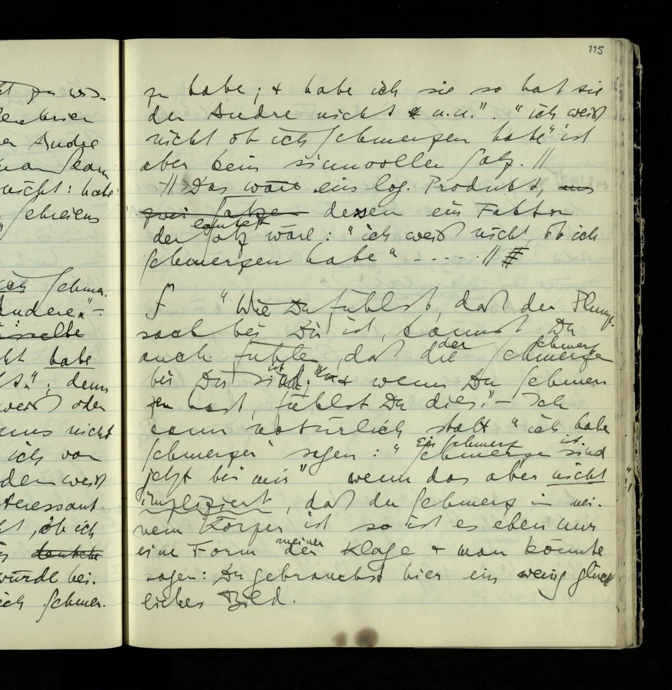 “Wenn ich Schmerzen haben kann, kann sie der Andre auch haben. Sowie ich sie haben kann, kann sie der Andre haben.” – Aber ich kenne gar nicht das Etwas, was vor mir auf ihn übergehen kann. Jener Satz heißt doch eigentlich: Du mußt doch verstehen, was es heißt, der Andre habe Schmerzen, wenn Du weißt wie es ist, wenn Du sie hast! Wie: “Du mußt doch verstehen, was es heißt, in jener Lampe ist ein Docht, wenn ich Dir zeige, daß in dieser einer ist. Aber wie wenn ich den Übergang nicht machen kann? Oder vielmehr: was heißt es denn ihn machen? Wenn es ein ‘augenblickliches’ Verstehen ist, ist es auf der gleichen Stufe wie ein Gestikulieren, woher ich, etwa, das Gesicht schmerzlich verziehe & dabei eindringlich auf den Andern deute. (Denk daran wie man einem kleinen Kind sagt seine Puppe habe ‘weh weh’). Aber ich könnte verschiedene Übergänge machen, & das zeigt daß man nicht sagen kann: das & das bezeichnet man mit “Schmerz” & Du weißt was “ich habe”, “Du hast” etc. bedeutet, so weißt Du, was es heißt: “er hat Schmerzen”.