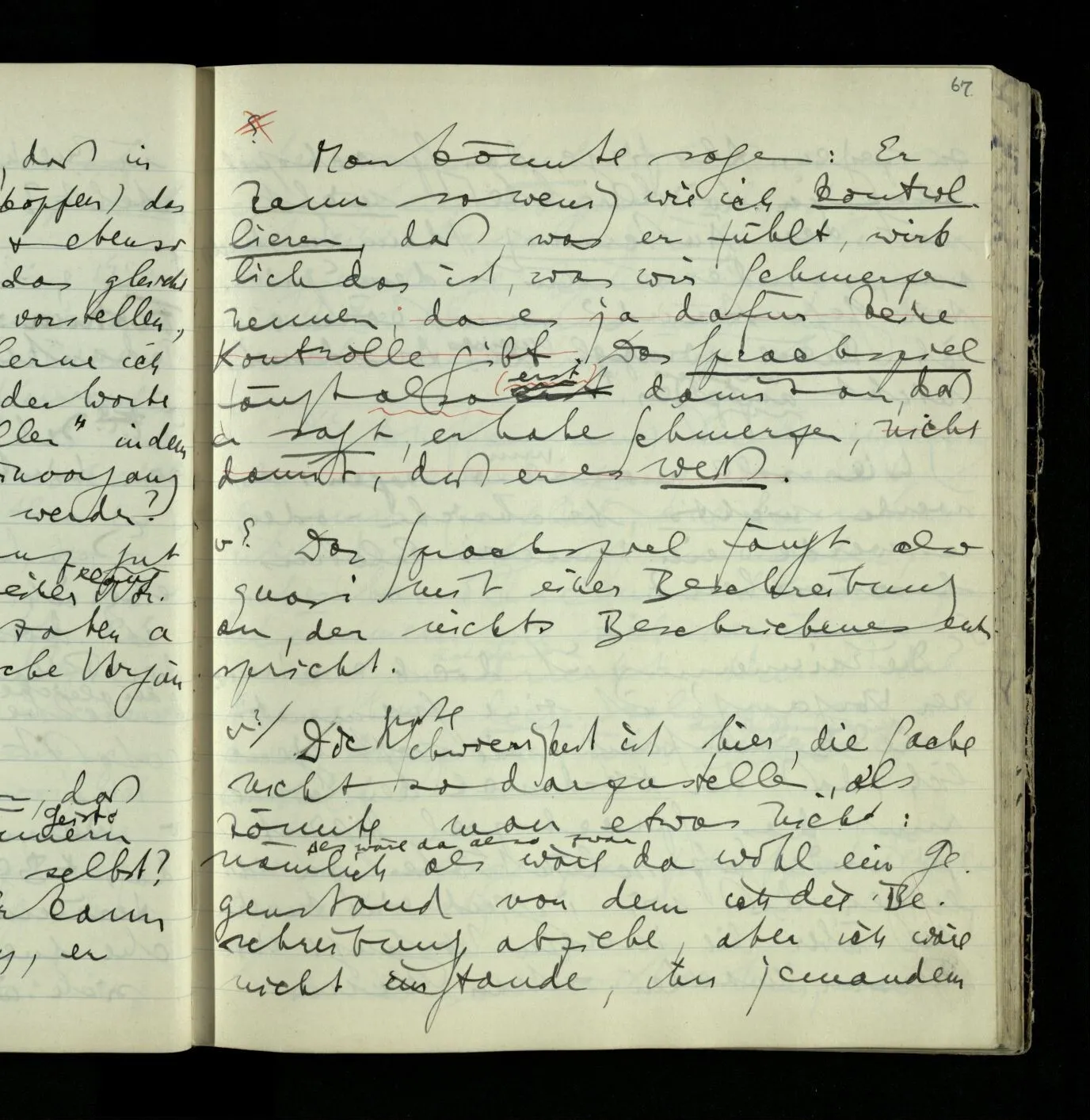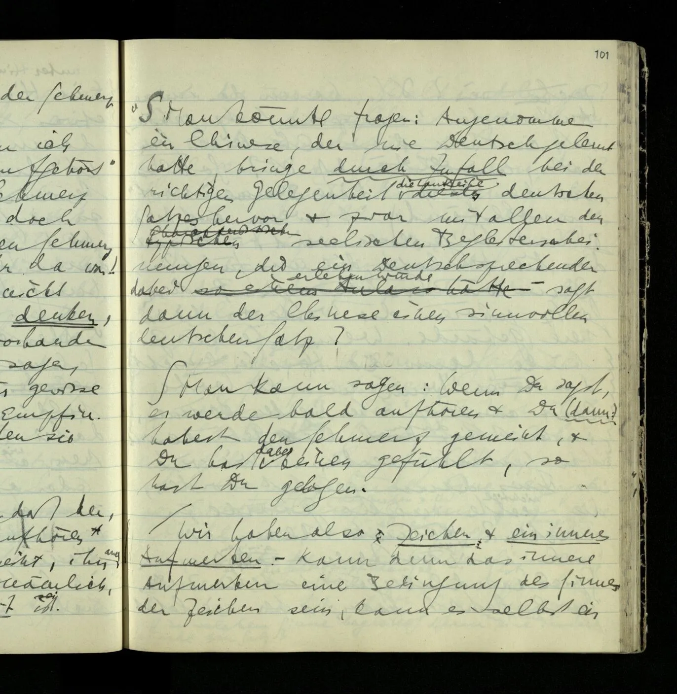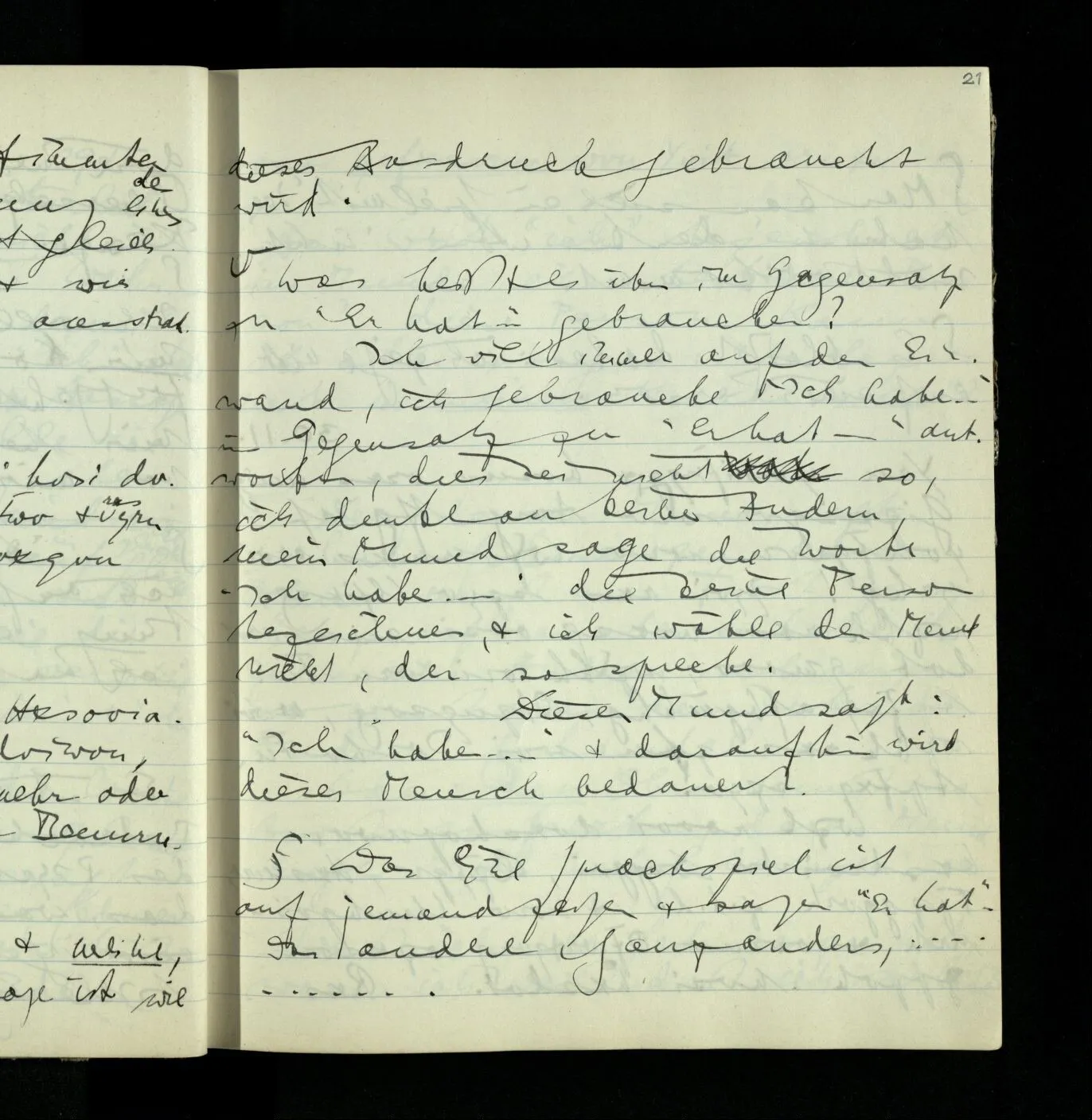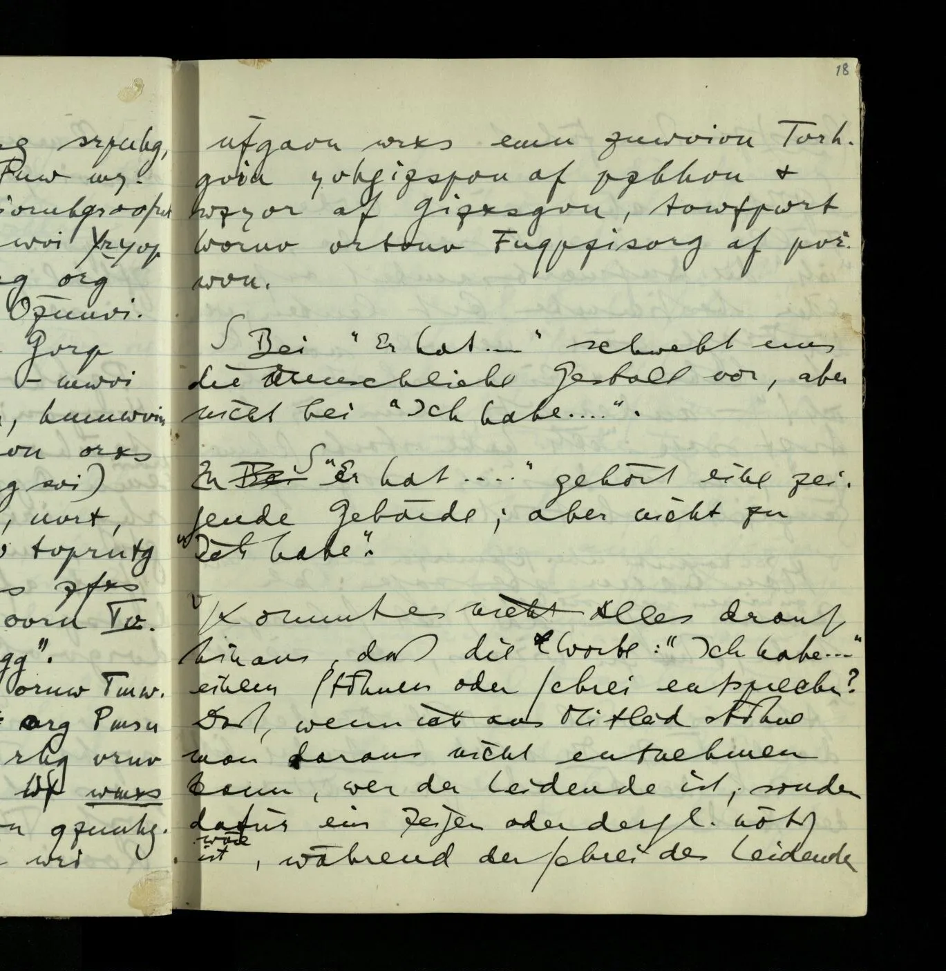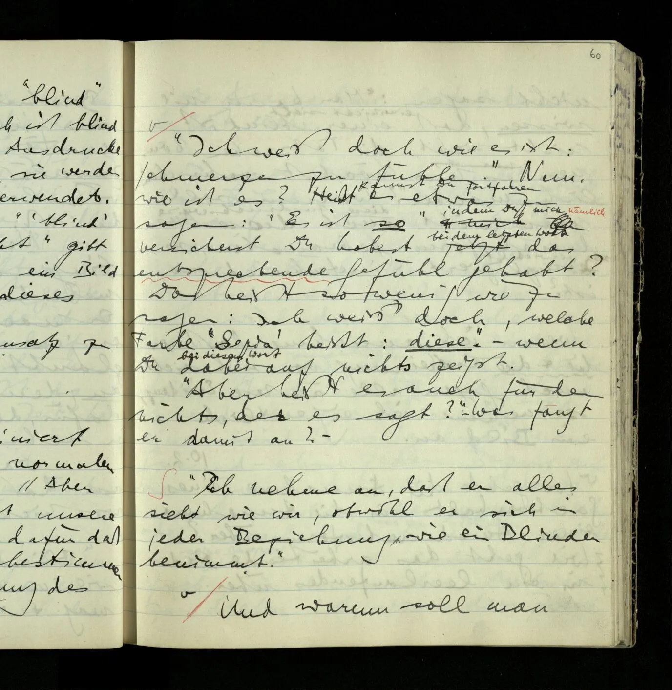 “Wenn ich Schmerzen haben kann, kann sie der Andre auch haben. Sowie ich sie haben kann, kann sie der Andre haben.” – Aber ich kenne gar nicht das Etwas, was vor mir auf ihn übergehen kann. Jener Satz heißt doch eigentlich: Du mußt doch verstehen, was es heißt, der Andre habe Schmerzen, wenn Du weißt wie es ist, wenn Du sie hast! Wie: “Du mußt doch verstehen, was es heißt, in jener Lampe ist ein Docht, wenn ich Dir zeige, daß in dieser einer ist. Aber wie wenn ich den Übergang nicht machen kann? Oder vielmehr: was heißt es denn ihn machen? Wenn es ein ‘augenblickliches’ Verstehen ist, ist es auf der gleichen Stufe wie ein Gestikulieren, woher ich, etwa, das Gesicht schmerzlich verziehe & dabei eindringlich auf den Andern deute. (Denk daran wie man einem kleinen Kind sagt seine Puppe habe ‘weh weh’). Aber ich könnte verschiedene Übergänge machen, & das zeigt daß man nicht sagen kann: das & das bezeichnet man mit “Schmerz” & Du weißt was “ich habe”, “Du hast” etc. bedeutet, so weißt Du, was es heißt: “er hat Schmerzen”.