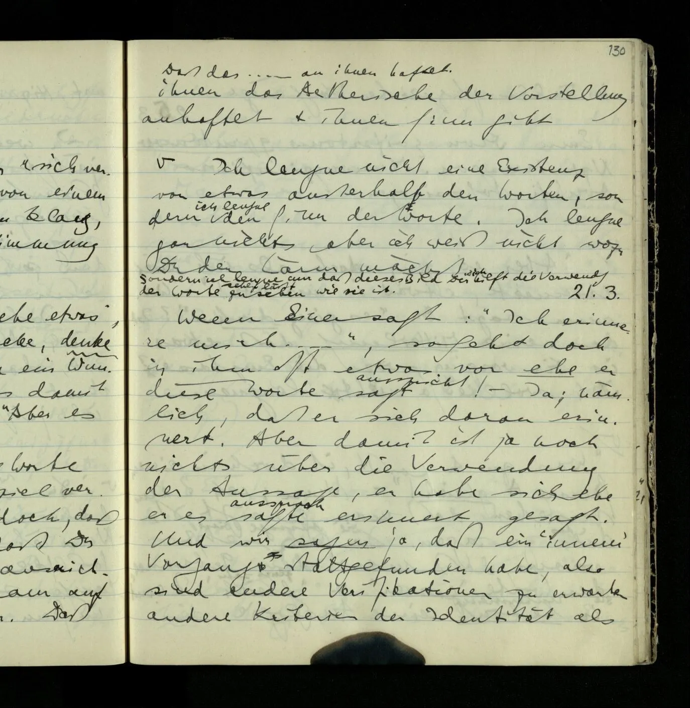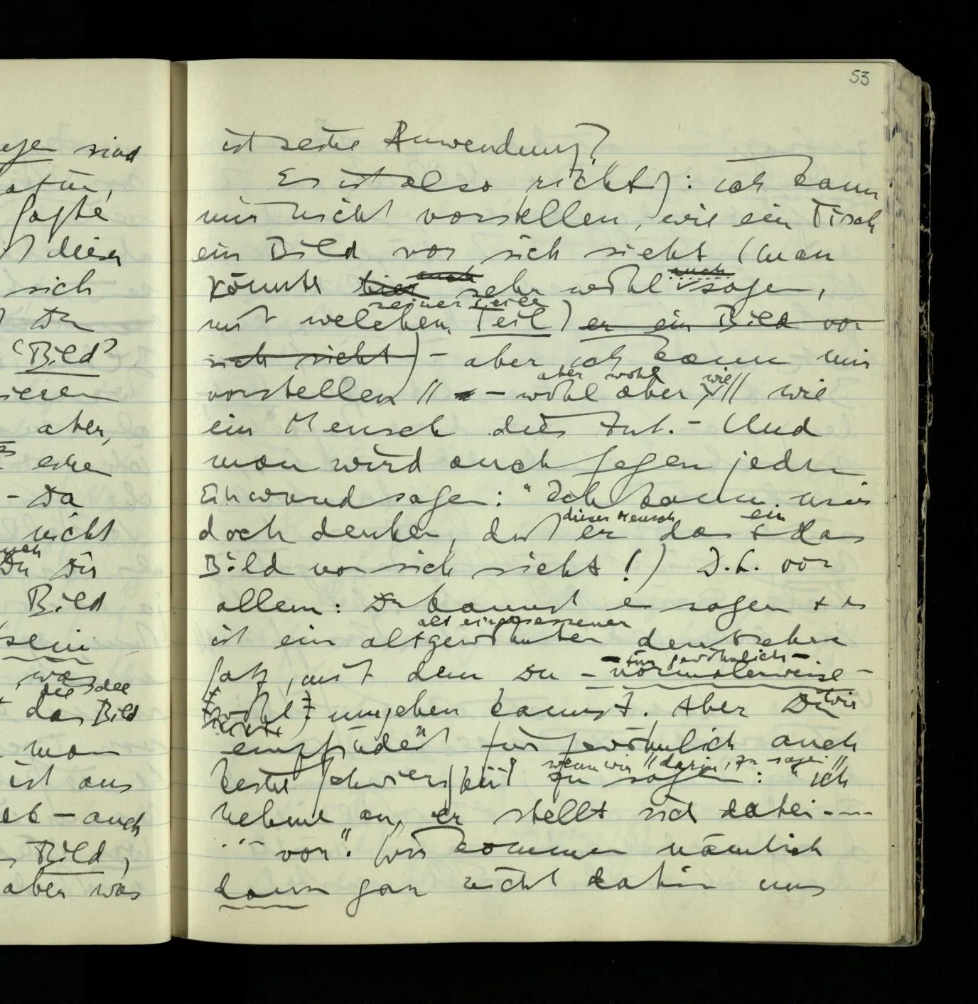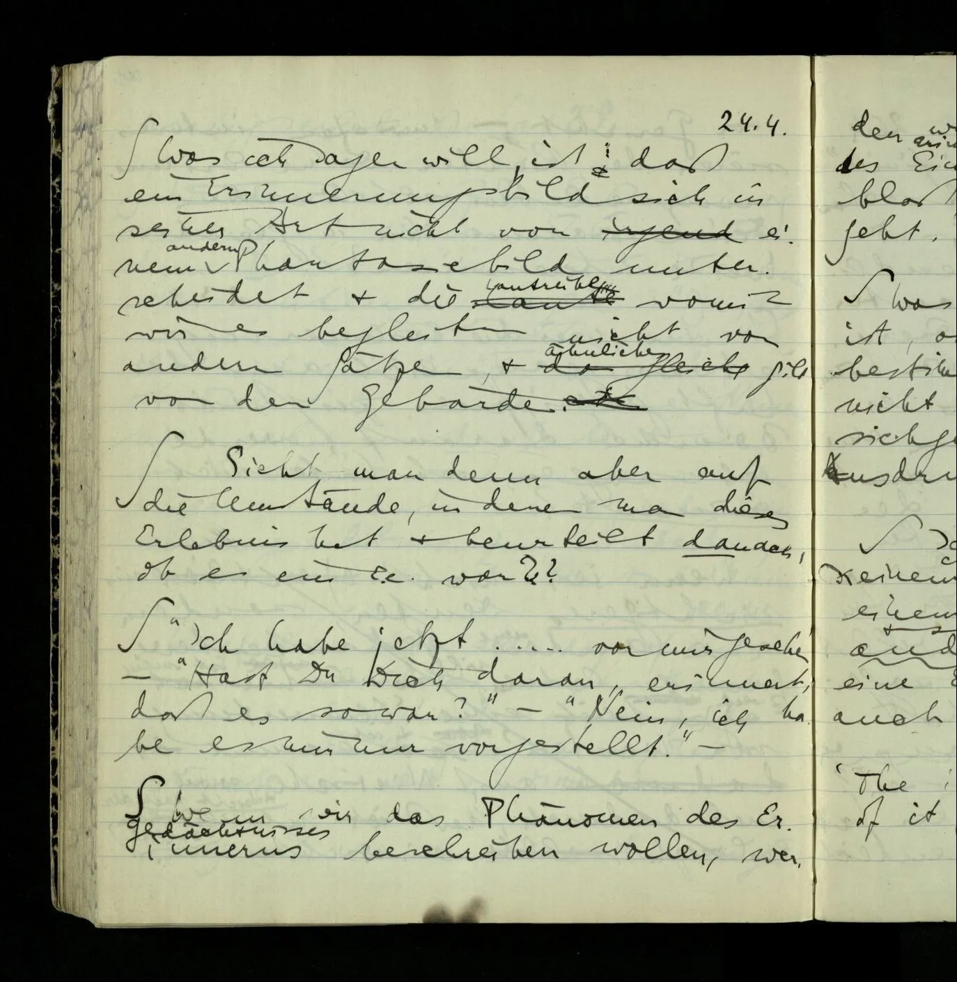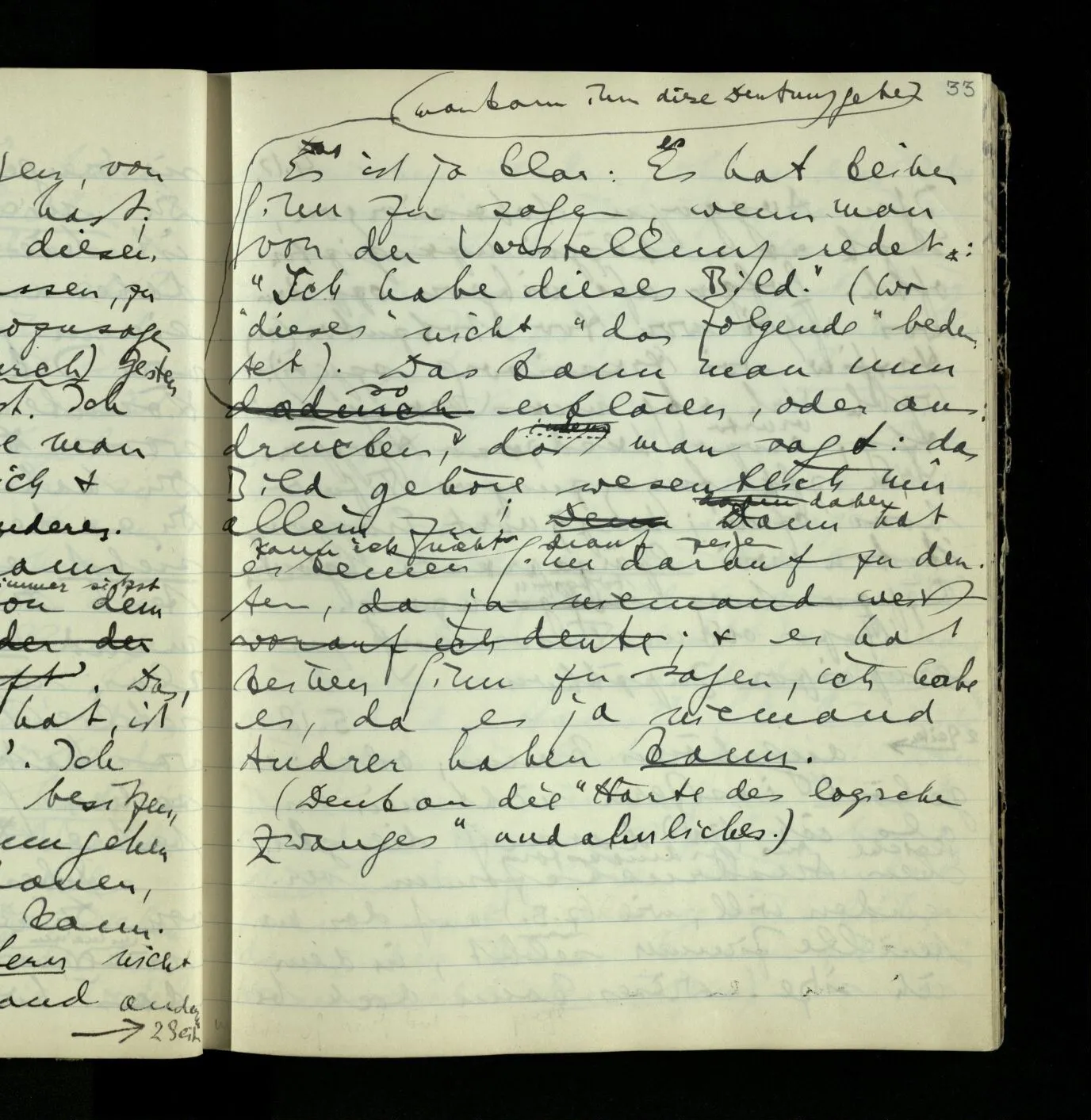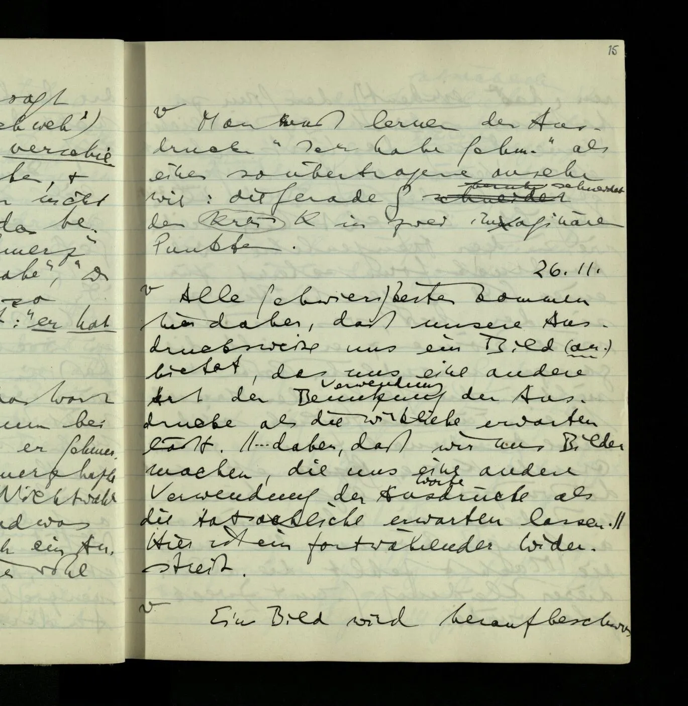 24.04.1938 Was ich sagen will ist: daß ein Erinnerungsbild sich in seiner Art nicht von einem andern Phantasiebild unterscheidet & die Lautreihe womit wir es begleiten nicht von andern Sätzen, & ähnliches gilt von den Gebärden.