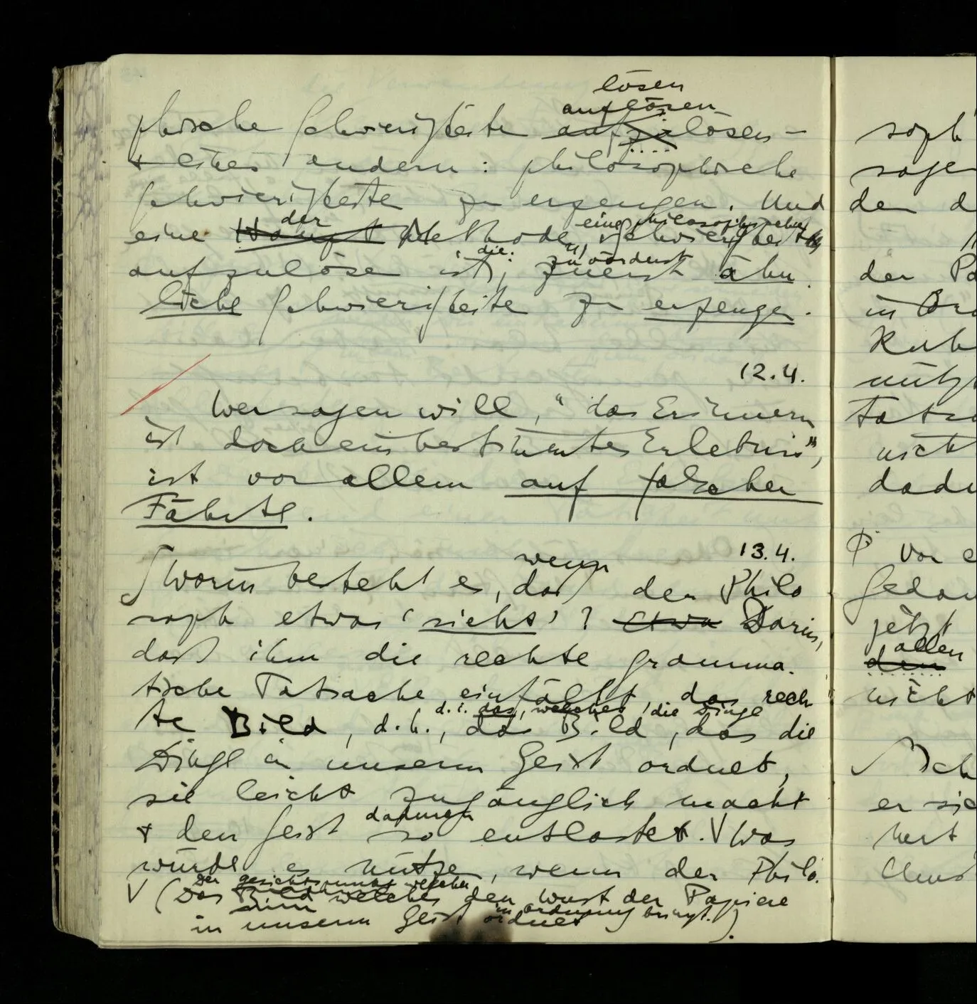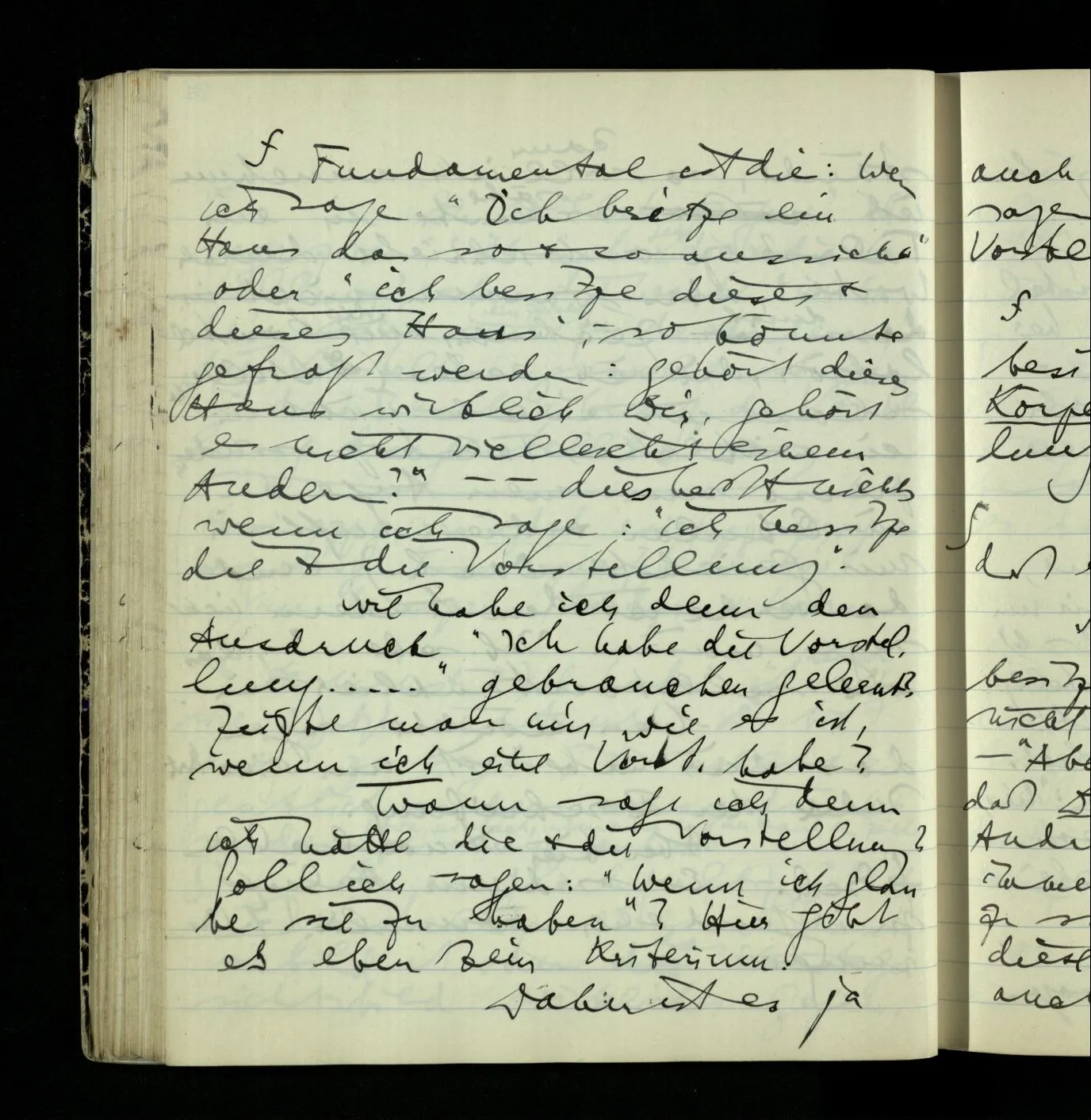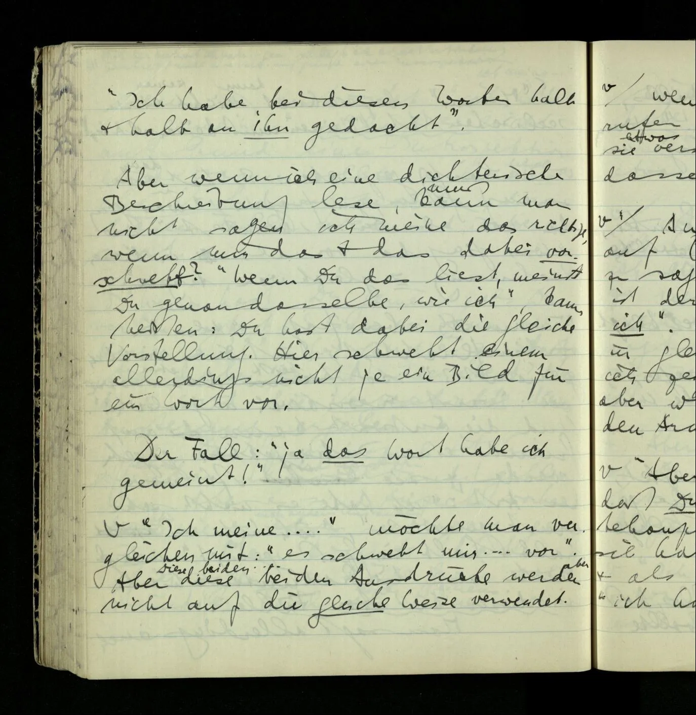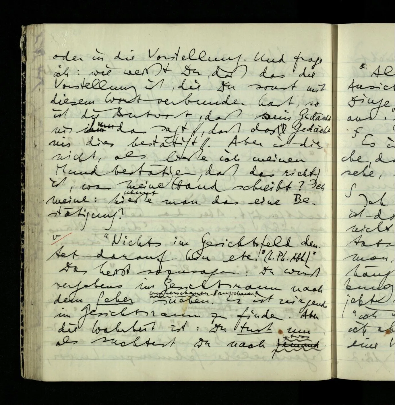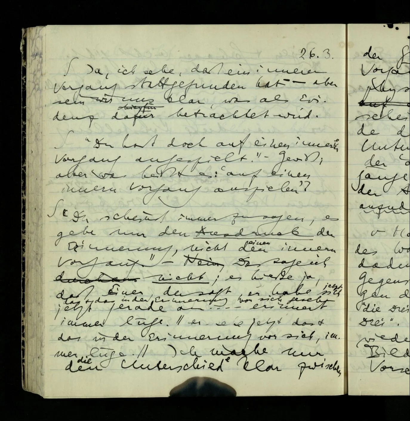 24.04.1938 Was ich sagen will ist: daß ein Erinnerungsbild sich in seiner Art nicht von einem andern Phantasiebild unterscheidet & die Lautreihe womit wir es begleiten nicht von andern Sätzen, & ähnliches gilt von den Gebärden.
