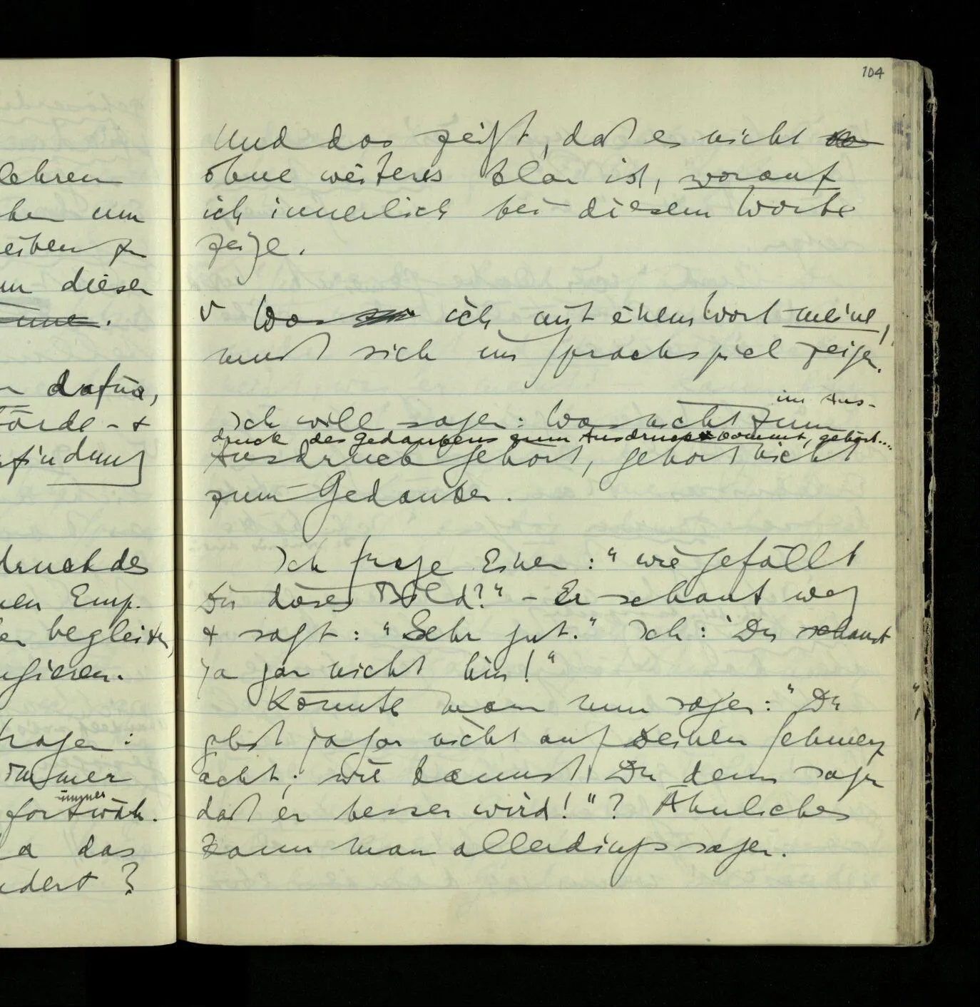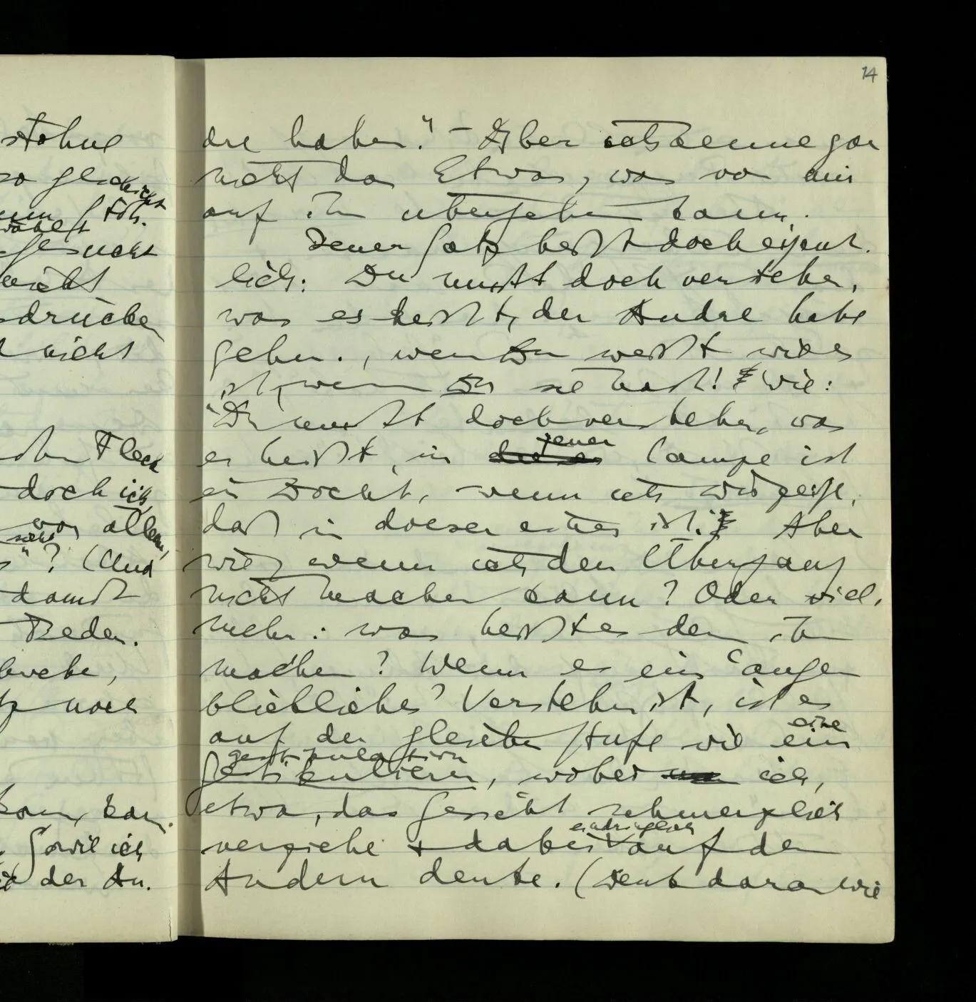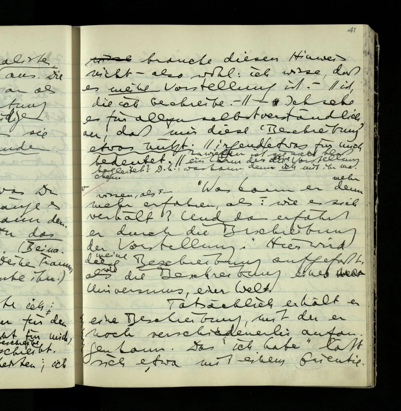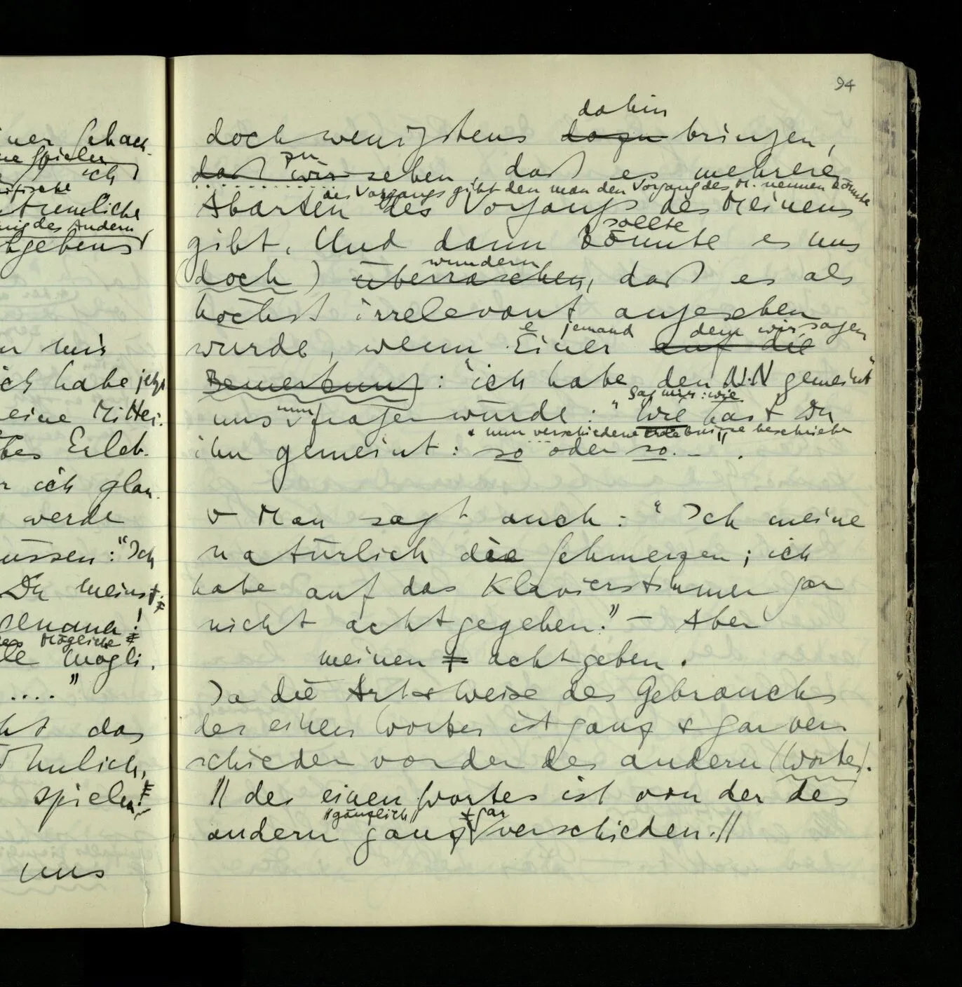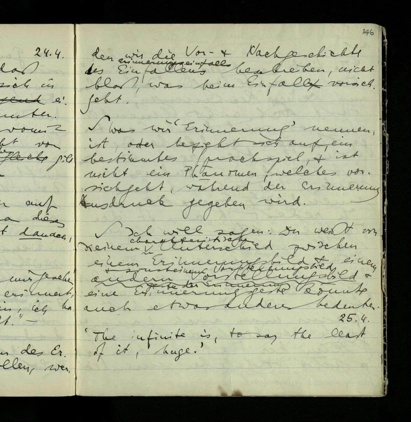 24.04.1938 Was ich sagen will ist: daß ein Erinnerungsbild sich in seiner Art nicht von einem andern Phantasiebild unterscheidet & die Lautreihe womit wir es begleiten nicht von andern Sätzen, & ähnliches gilt von den Gebärden.