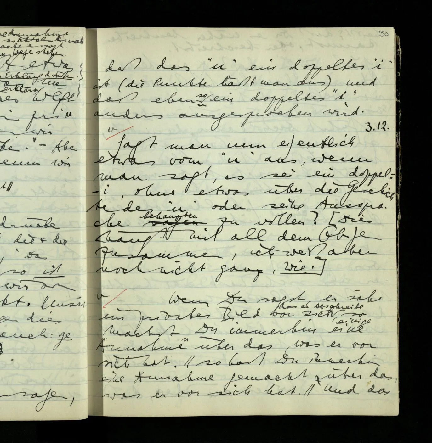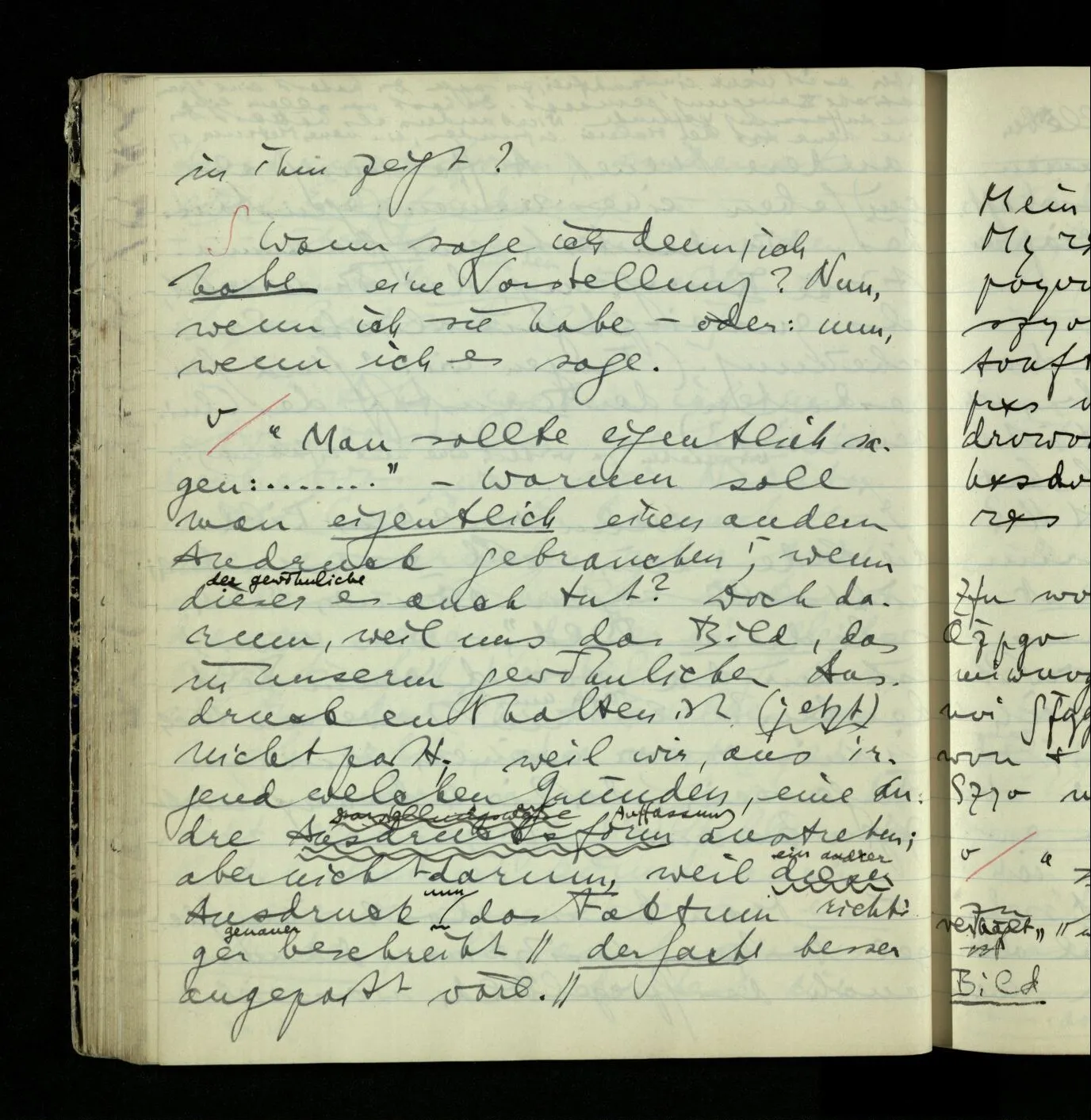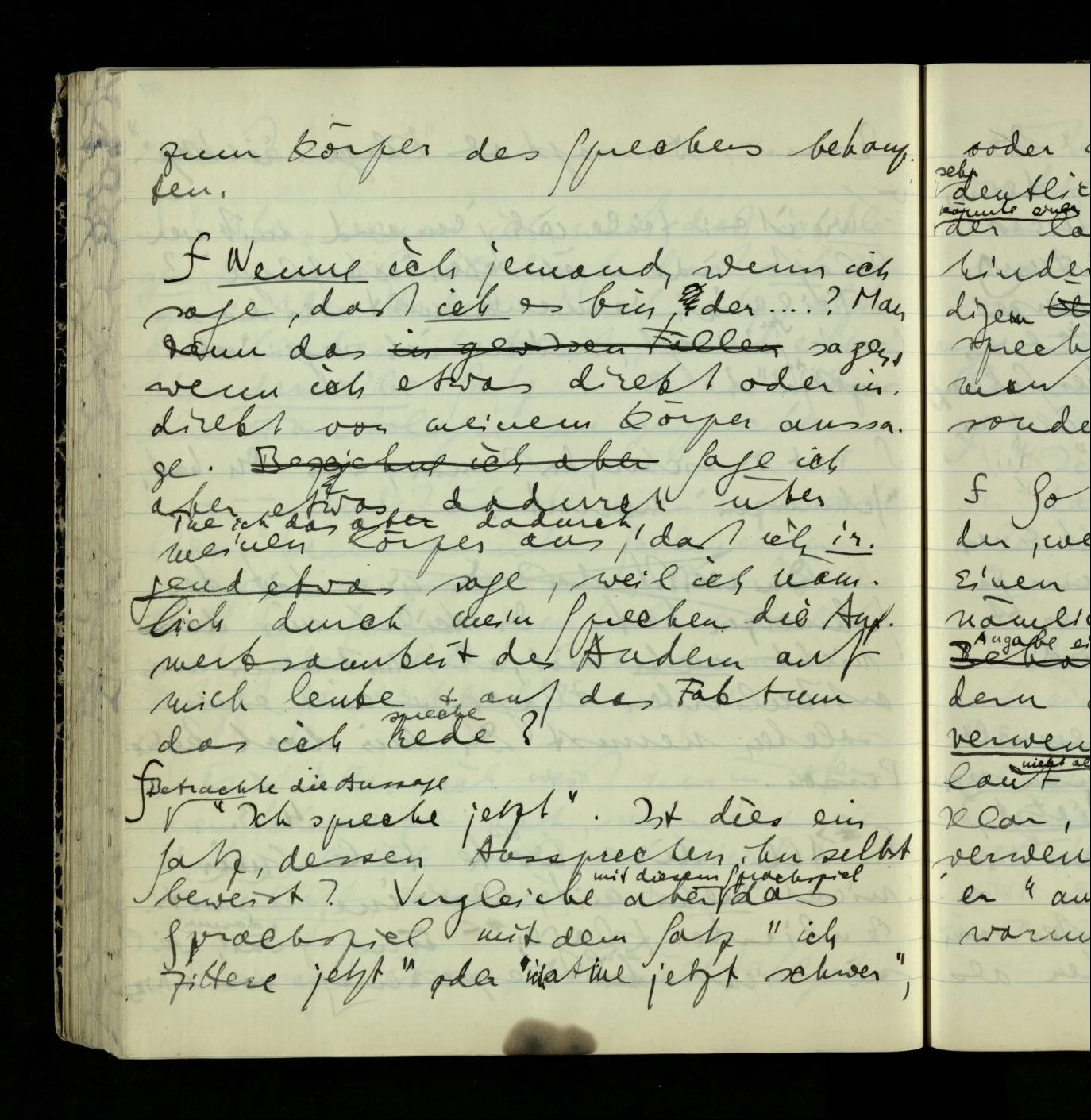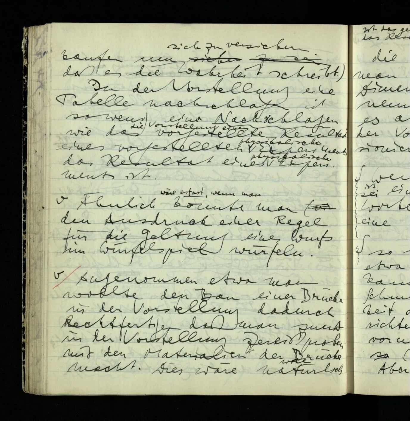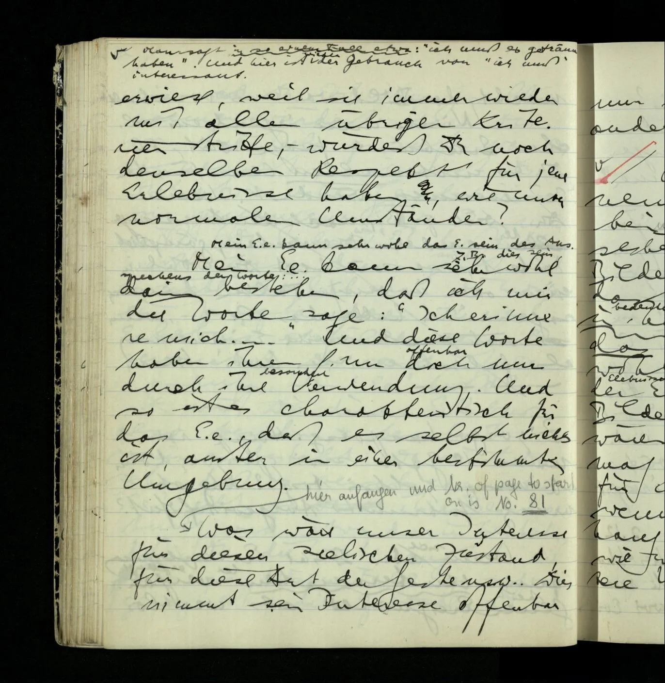 24.04.1938 Was ich sagen will ist: daß ein Erinnerungsbild sich in seiner Art nicht von einem andern Phantasiebild unterscheidet & die Lautreihe womit wir es begleiten nicht von andern Sätzen, & ähnliches gilt von den Gebärden.