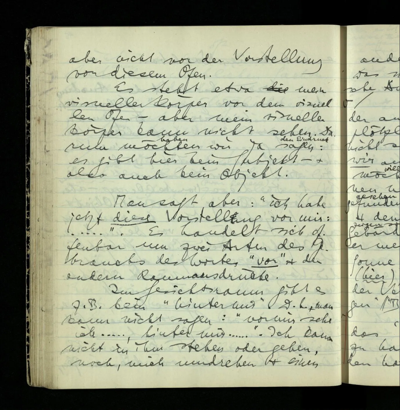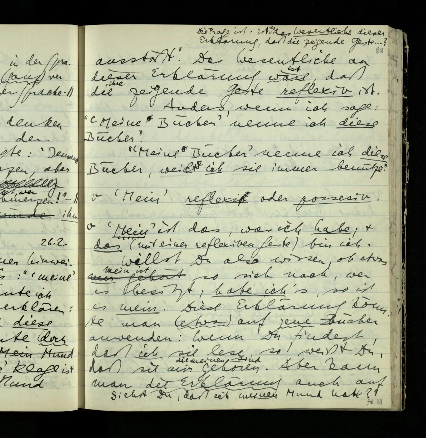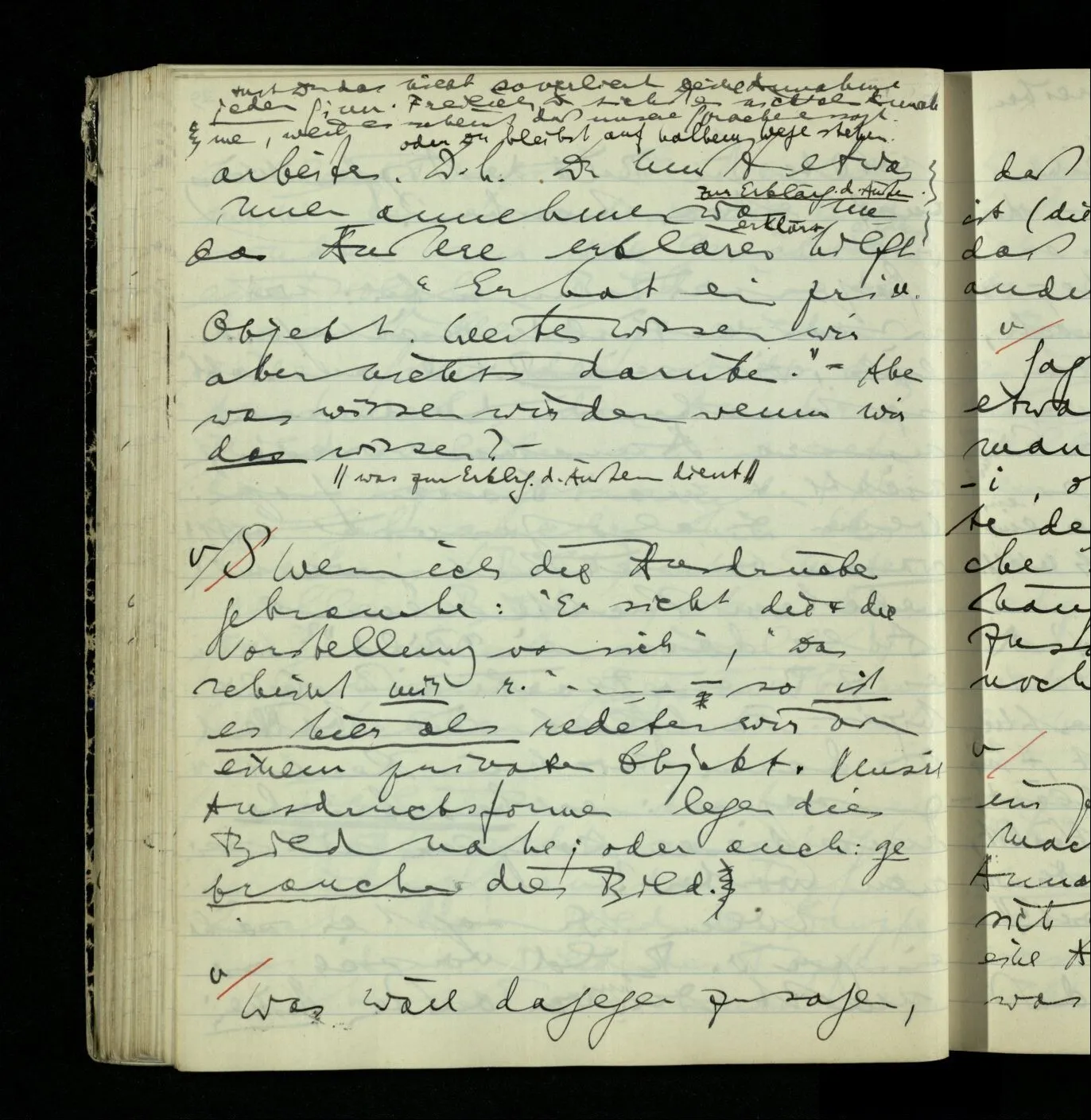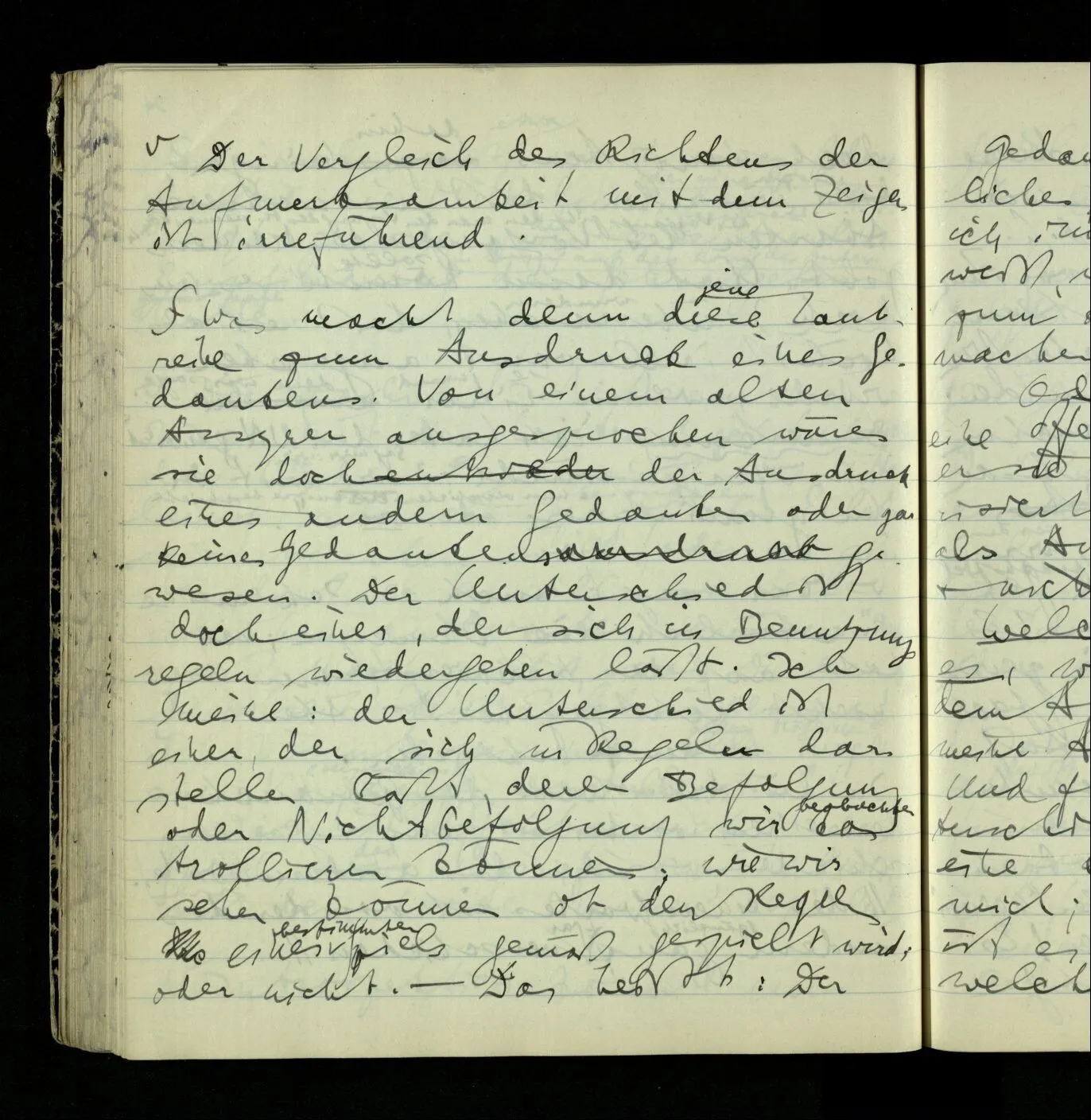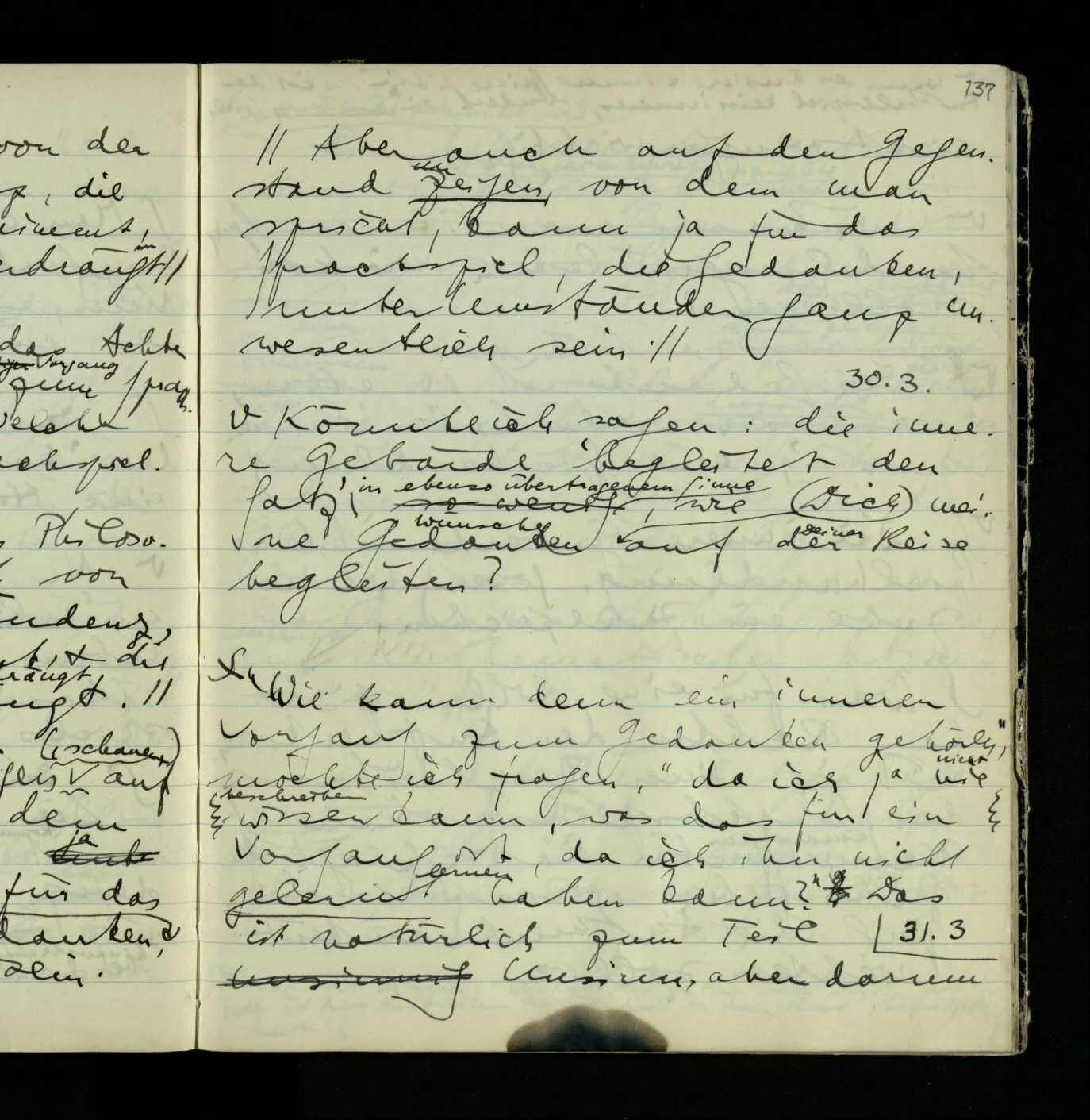 24.04.1938 Was ich sagen will ist: daß ein Erinnerungsbild sich in seiner Art nicht von einem andern Phantasiebild unterscheidet & die Lautreihe womit wir es begleiten nicht von andern Sätzen, & ähnliches gilt von den Gebärden.