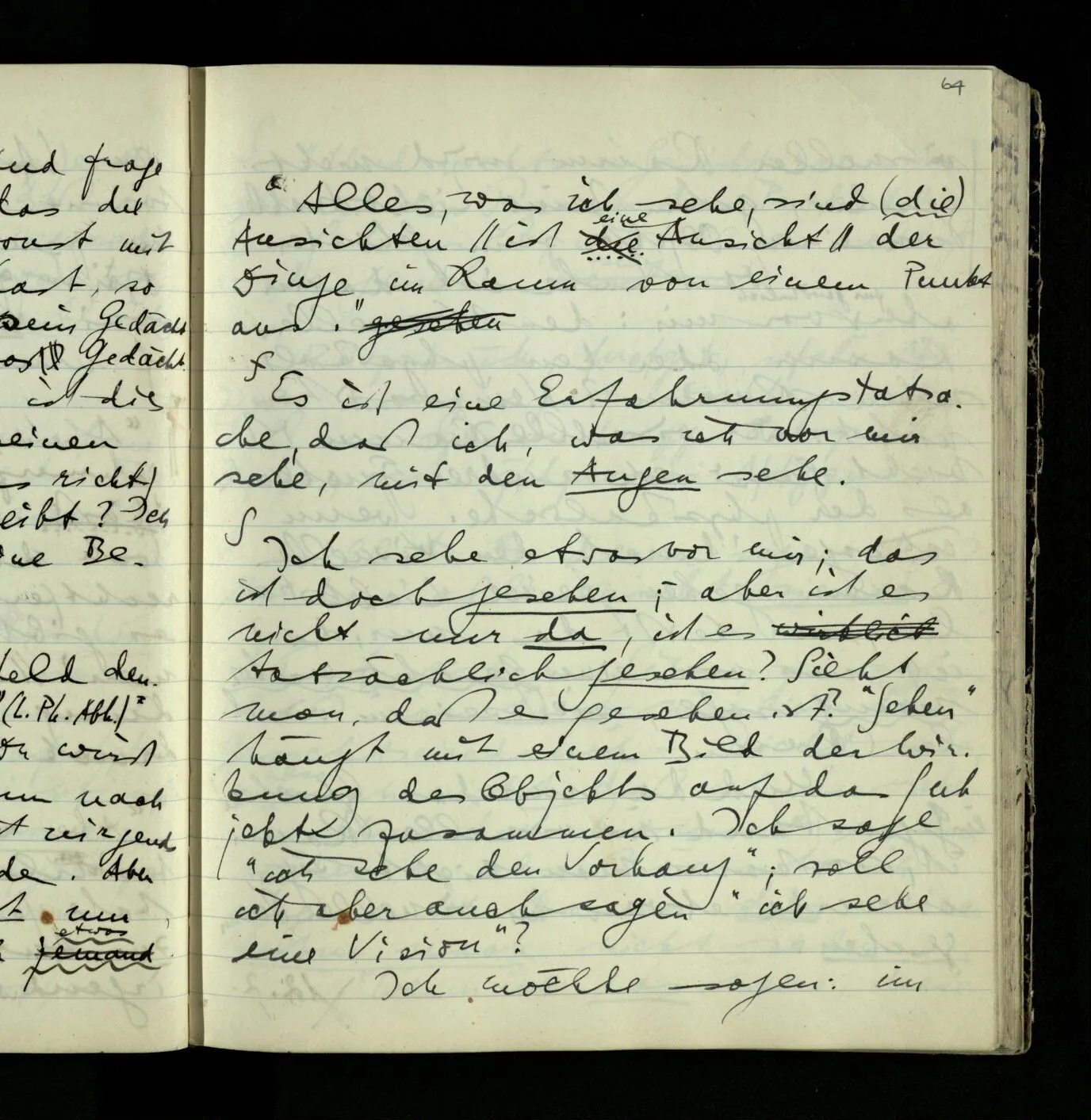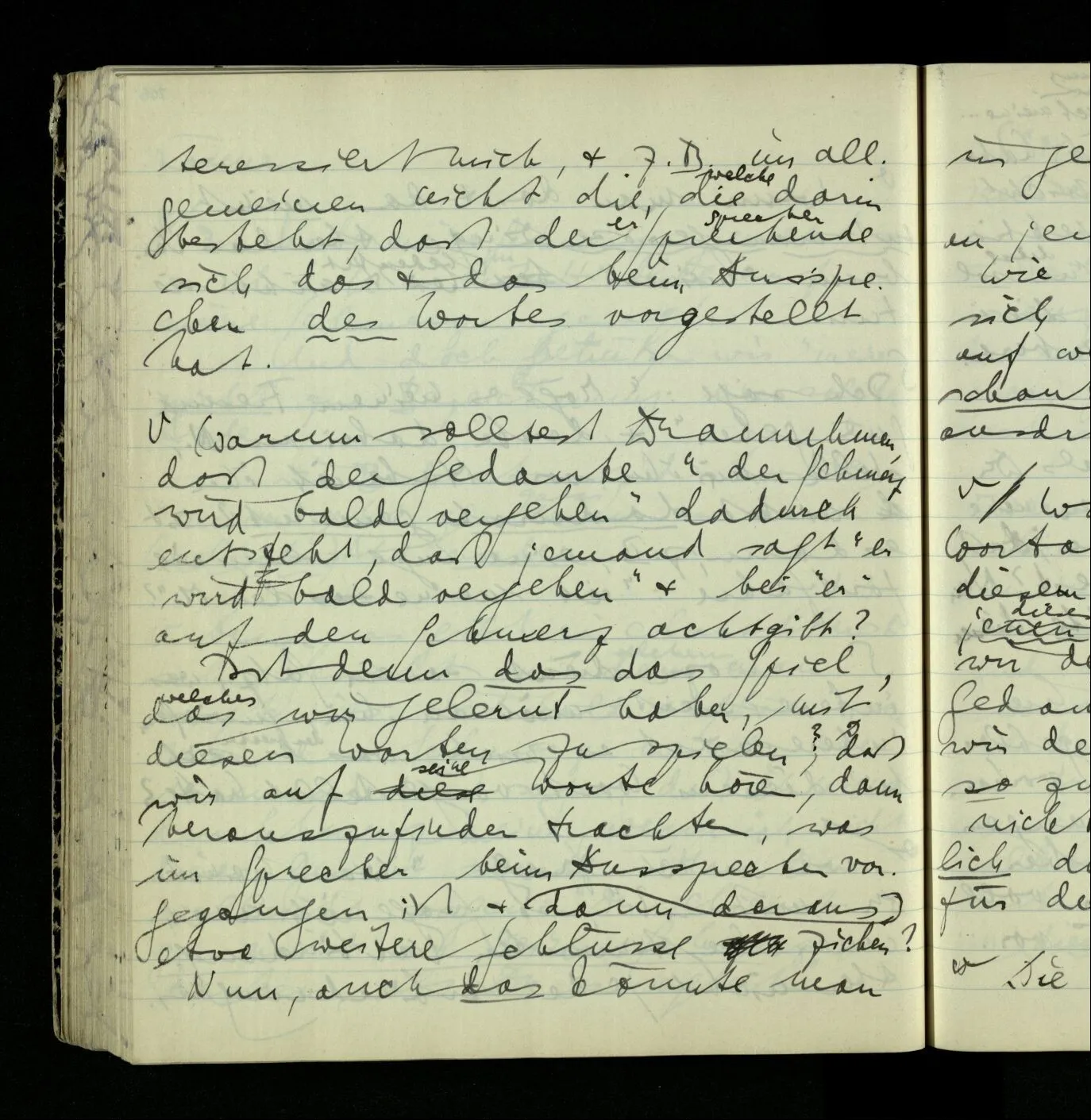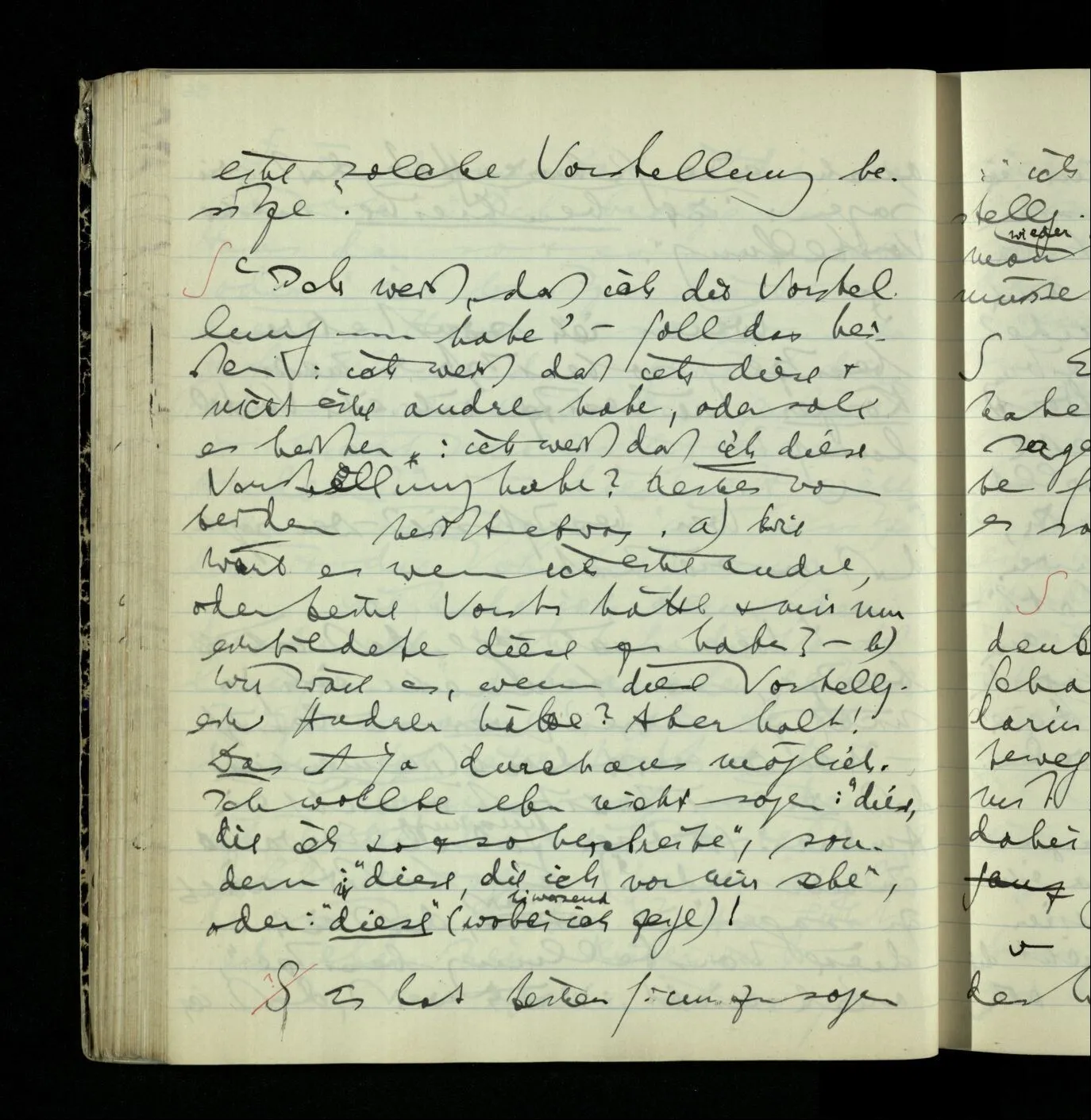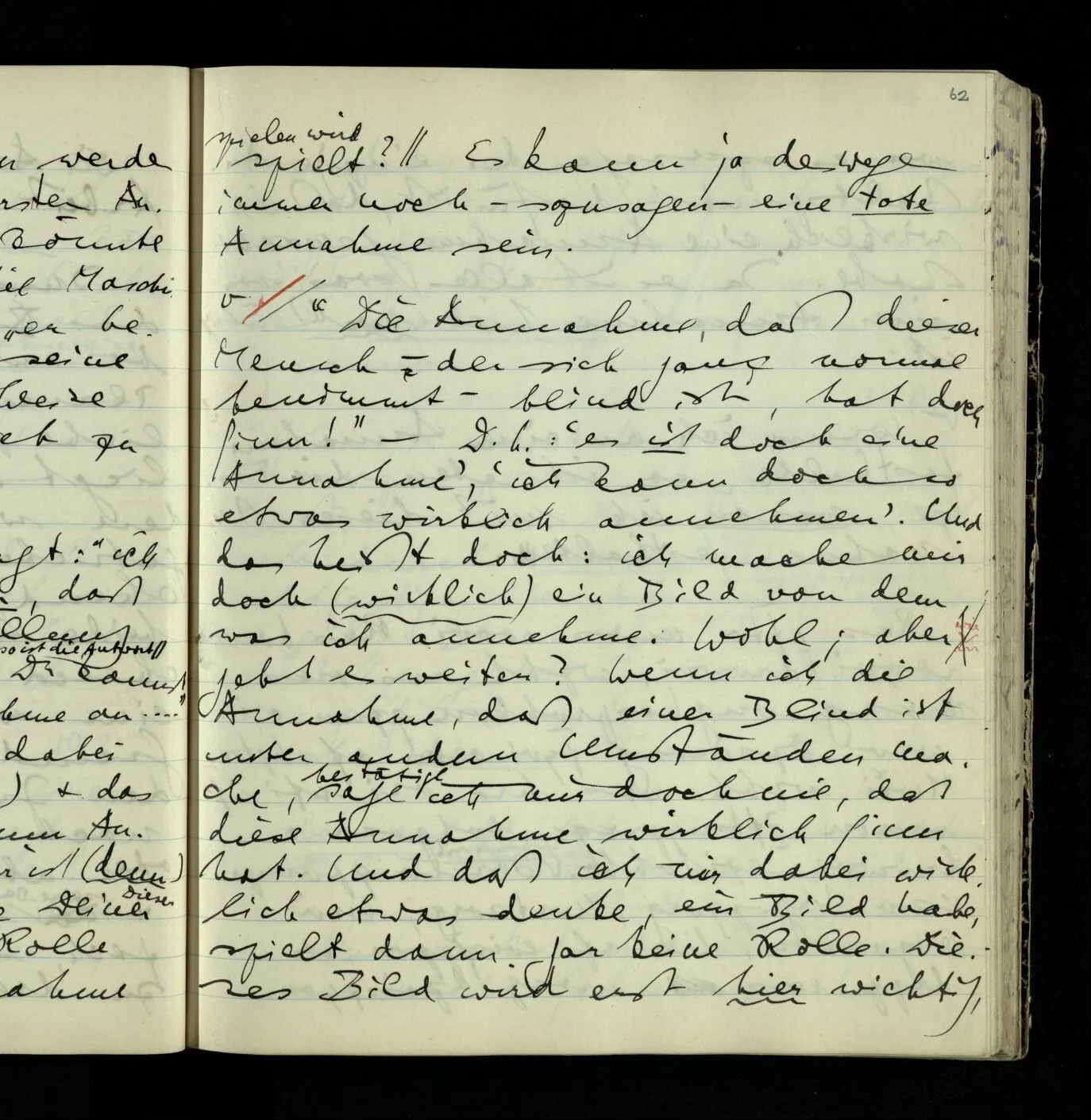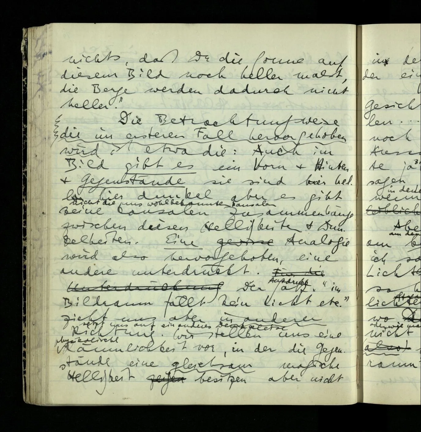 24.04.1938 Was ich sagen will ist: daß ein Erinnerungsbild sich in seiner Art nicht von einem andern Phantasiebild unterscheidet & die Lautreihe womit wir es begleiten nicht von andern Sätzen, & ähnliches gilt von den Gebärden.