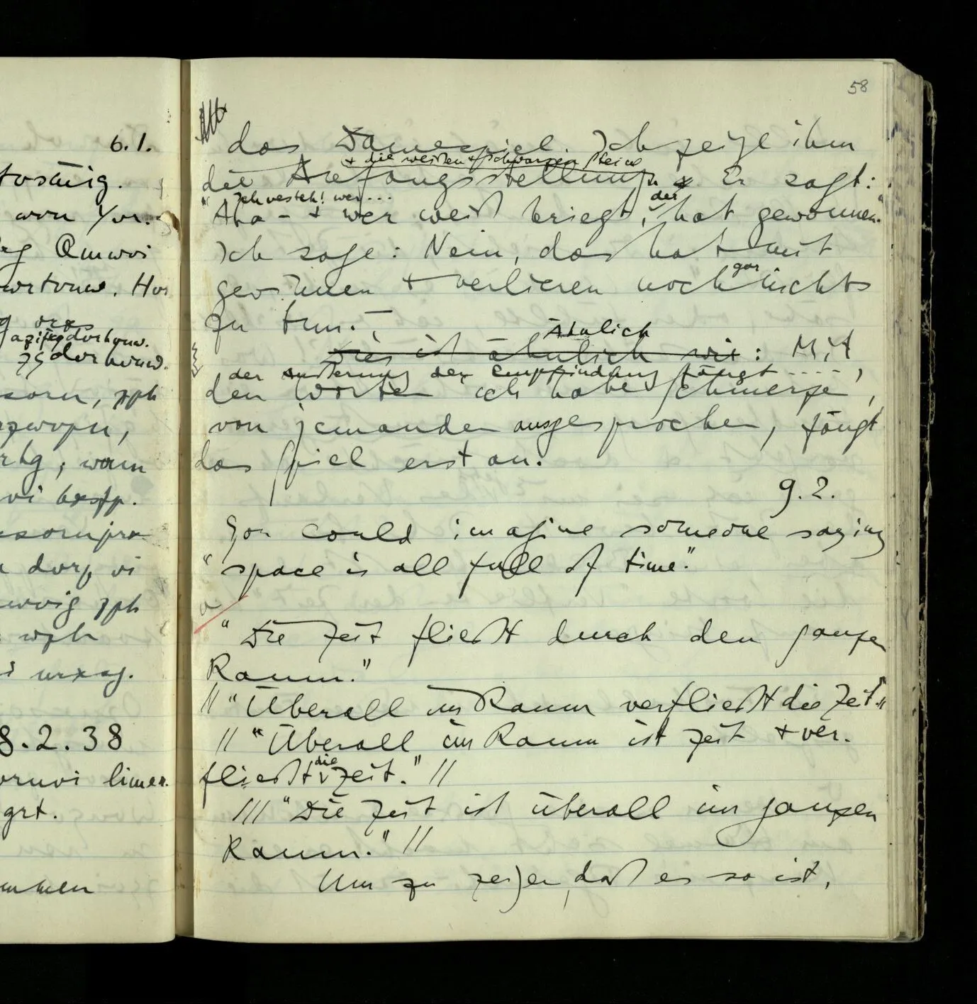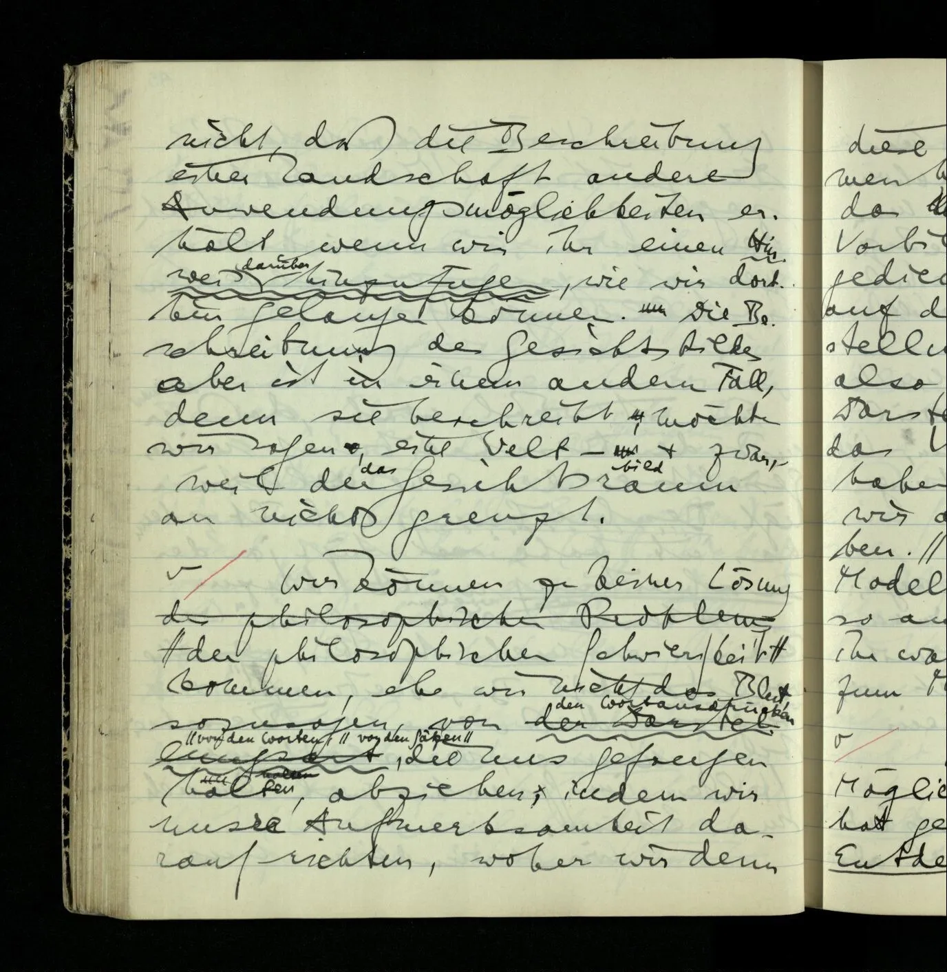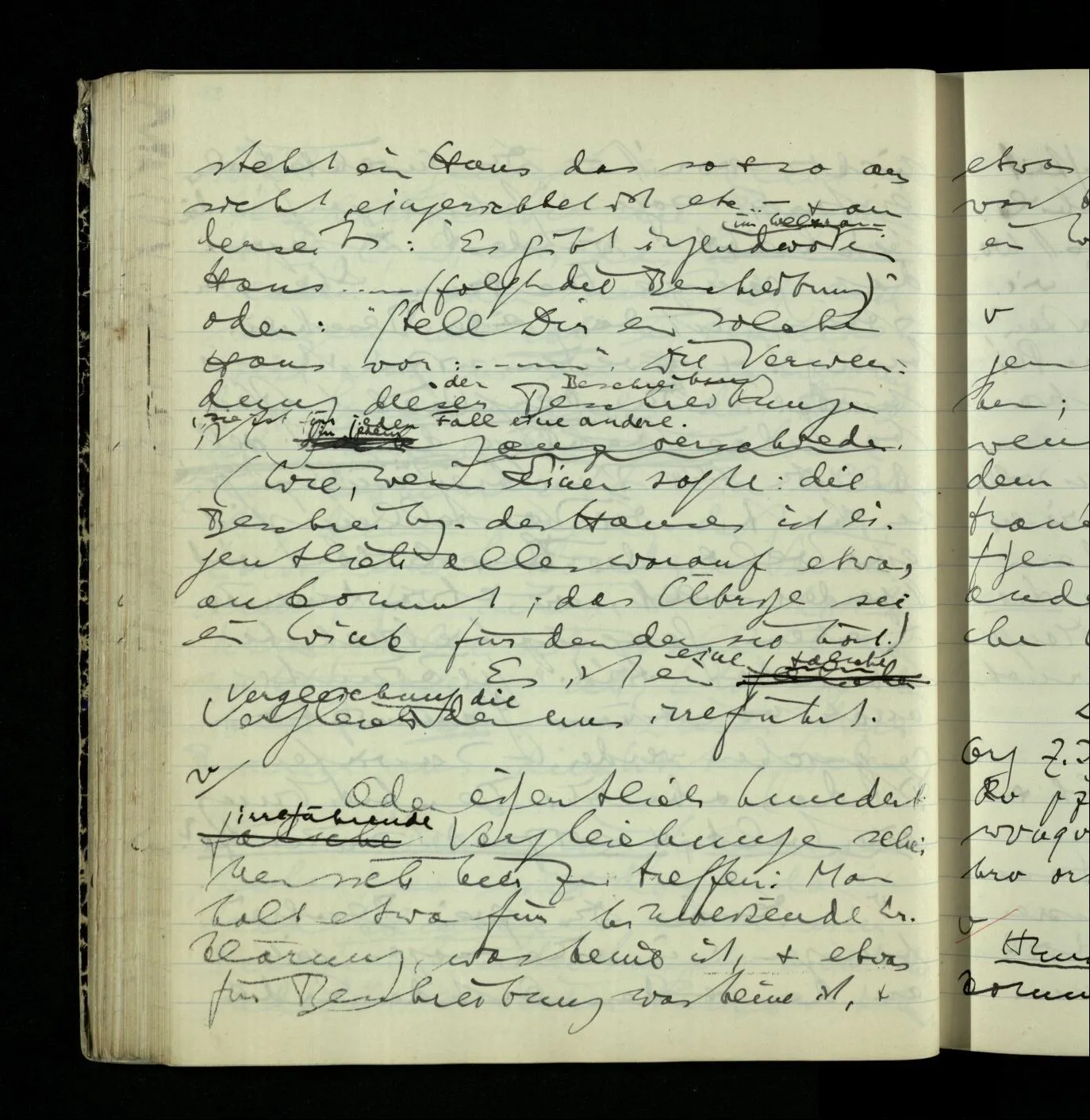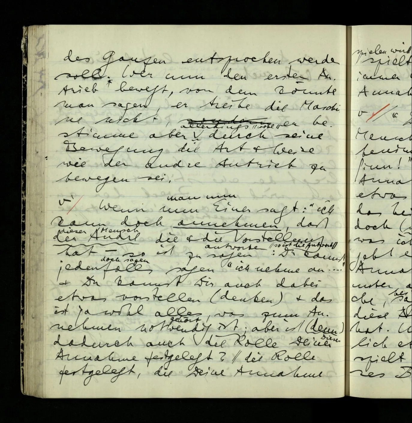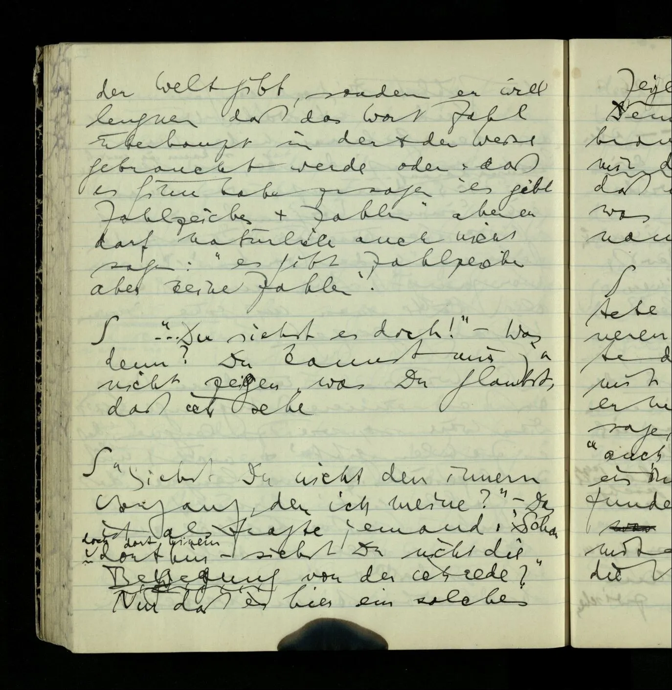 24.04.1938 Was ich sagen will ist: daß ein Erinnerungsbild sich in seiner Art nicht von einem andern Phantasiebild unterscheidet & die Lautreihe womit wir es begleiten nicht von andern Sätzen, & ähnliches gilt von den Gebärden.