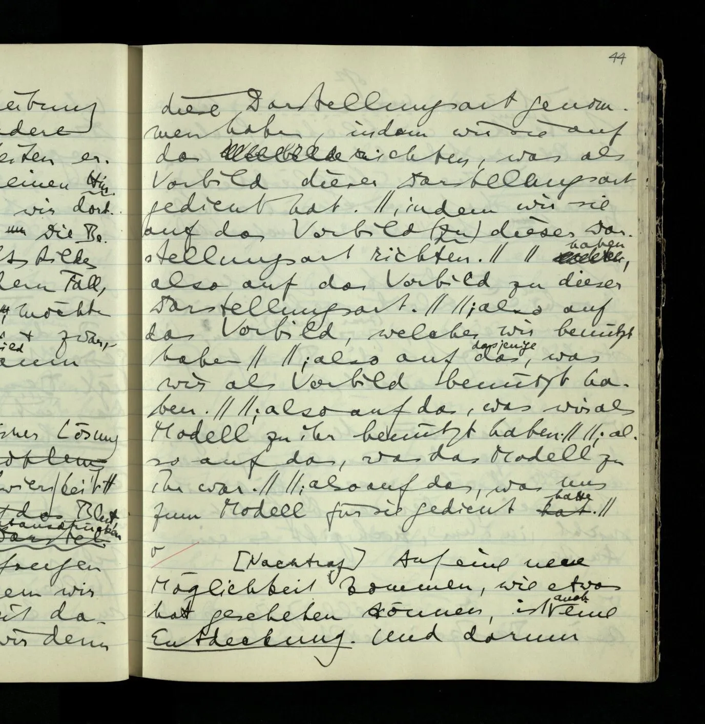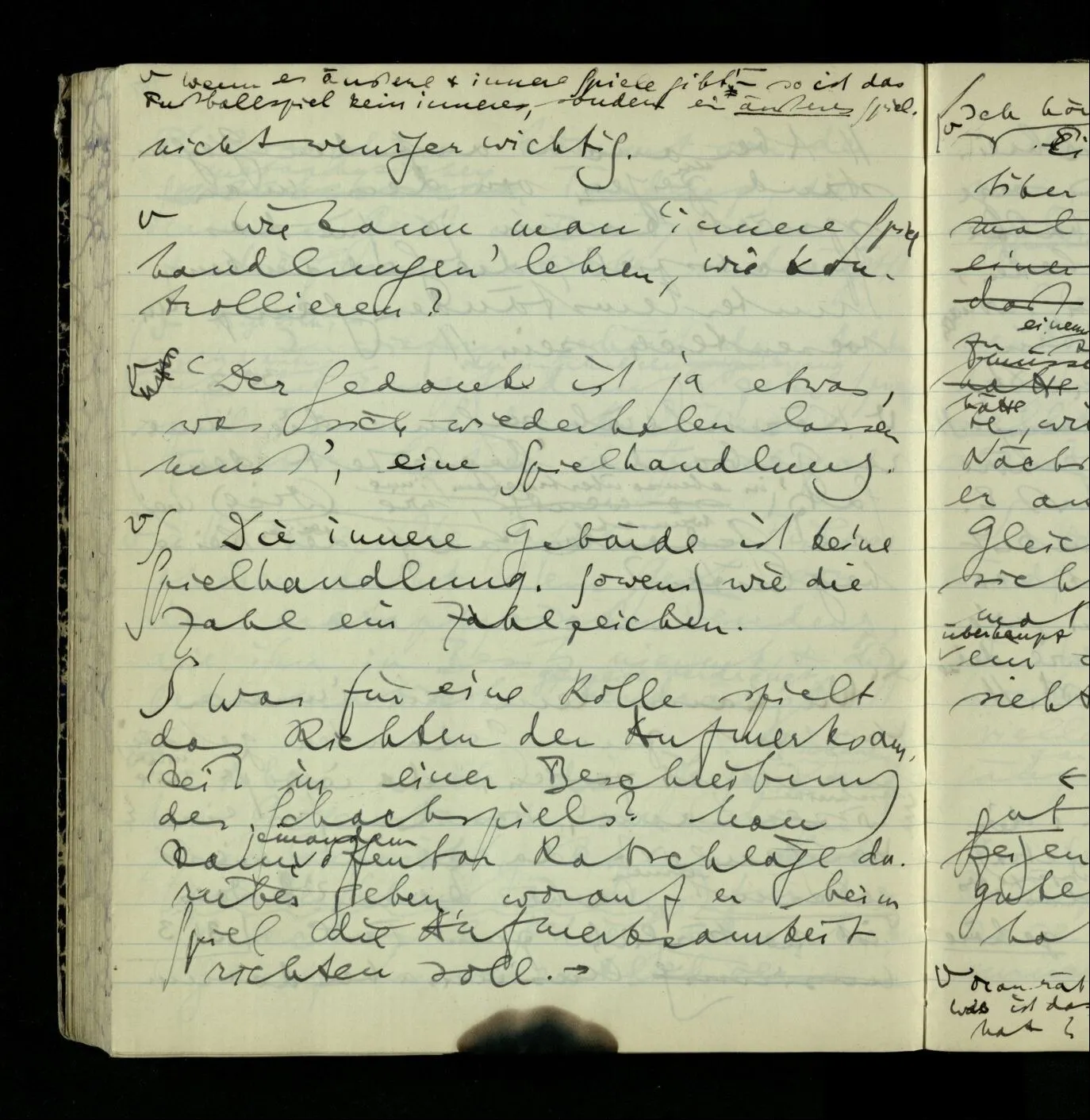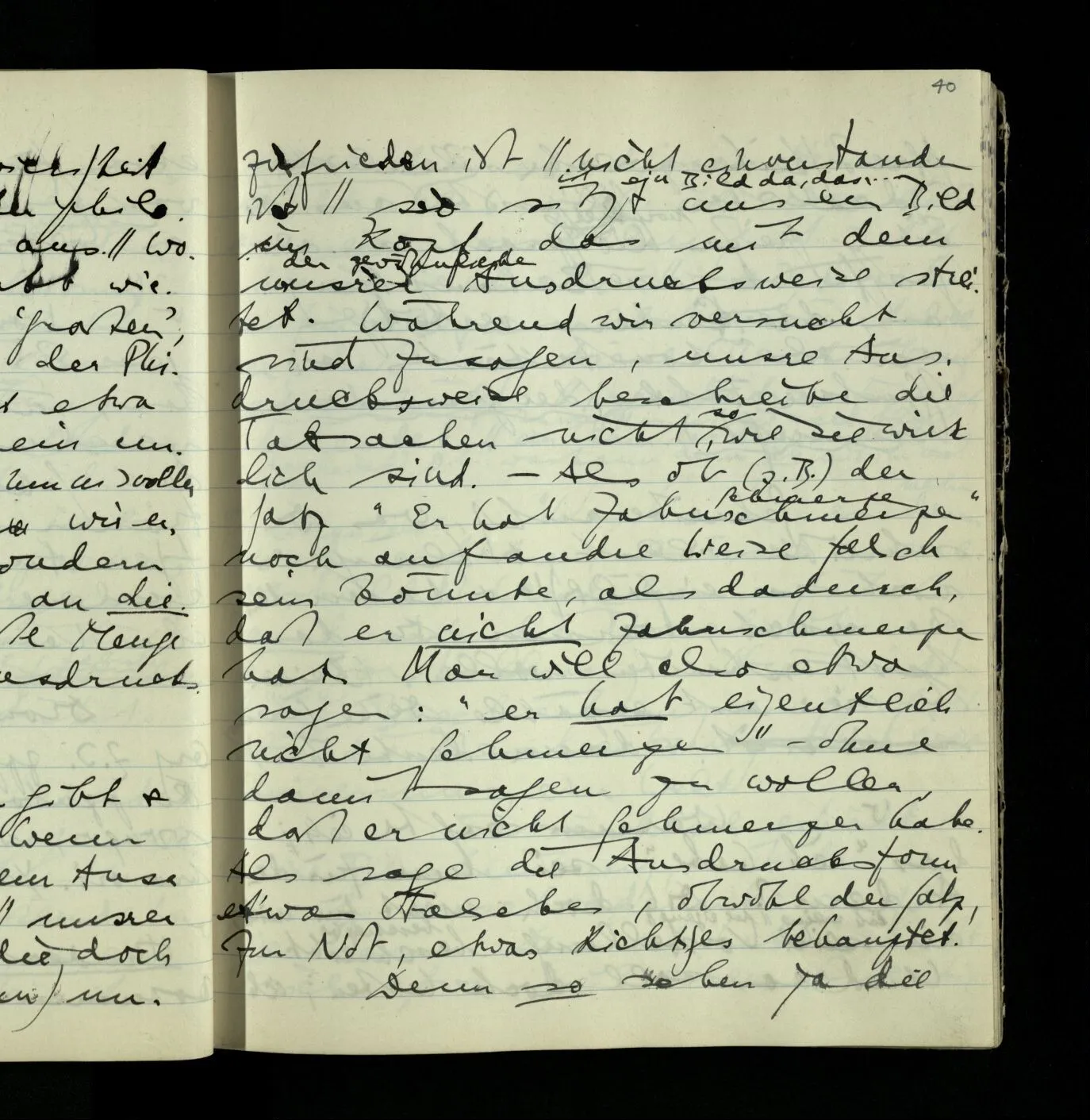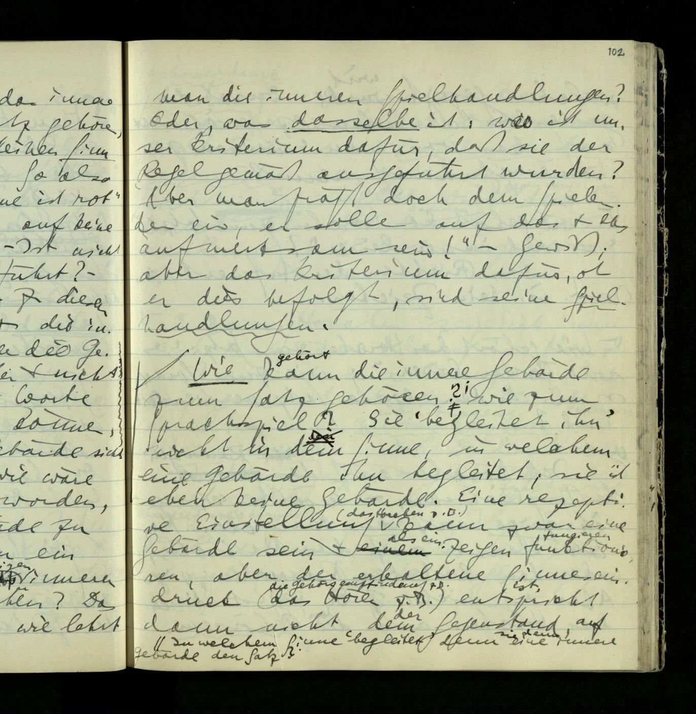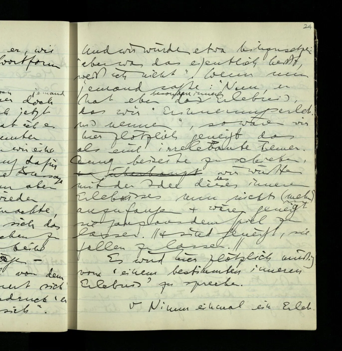 24.04.1938 Was ich sagen will ist: daß ein Erinnerungsbild sich in seiner Art nicht von einem andern Phantasiebild unterscheidet & die Lautreihe womit wir es begleiten nicht von andern Sätzen, & ähnliches gilt von den Gebärden.