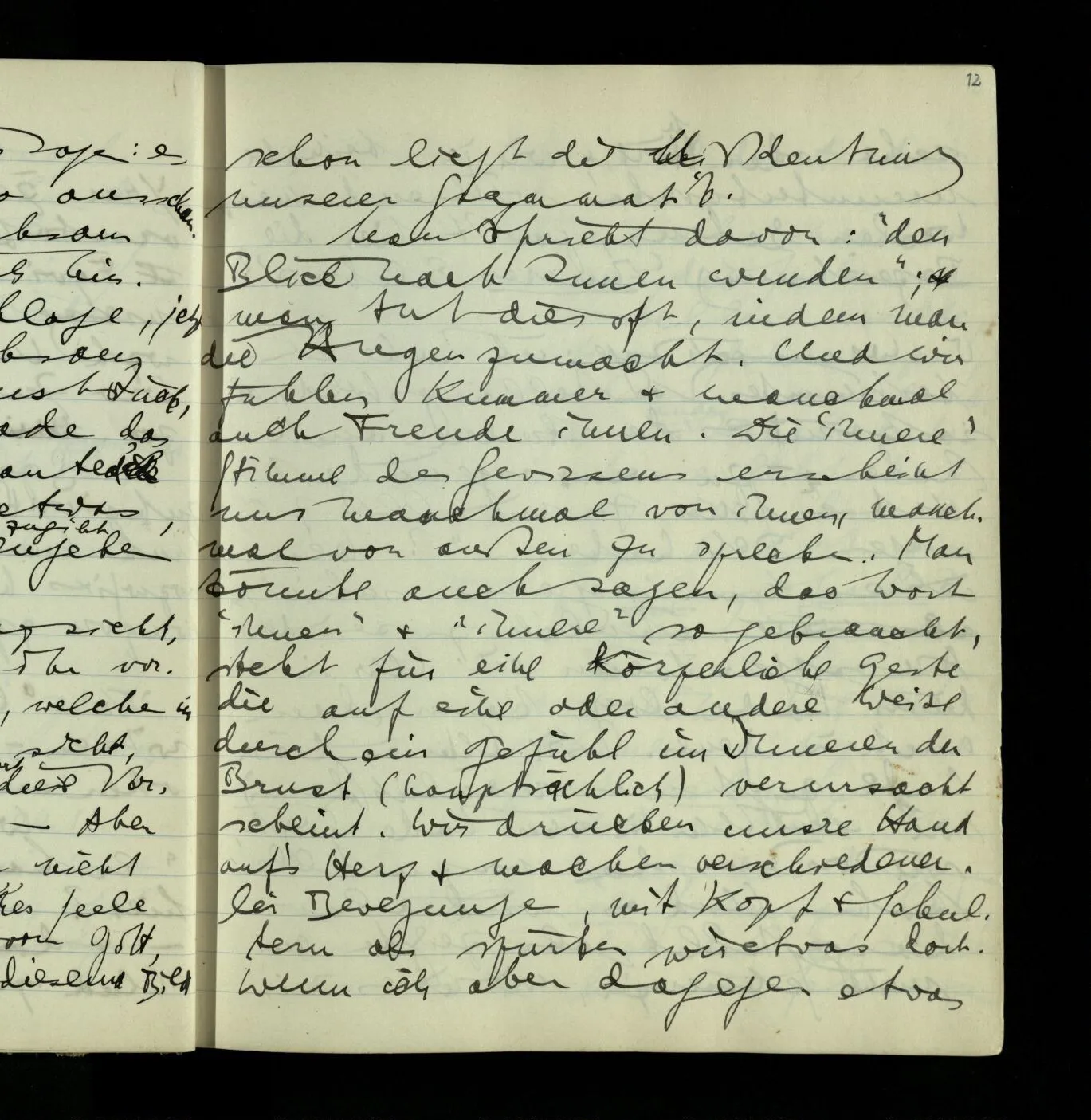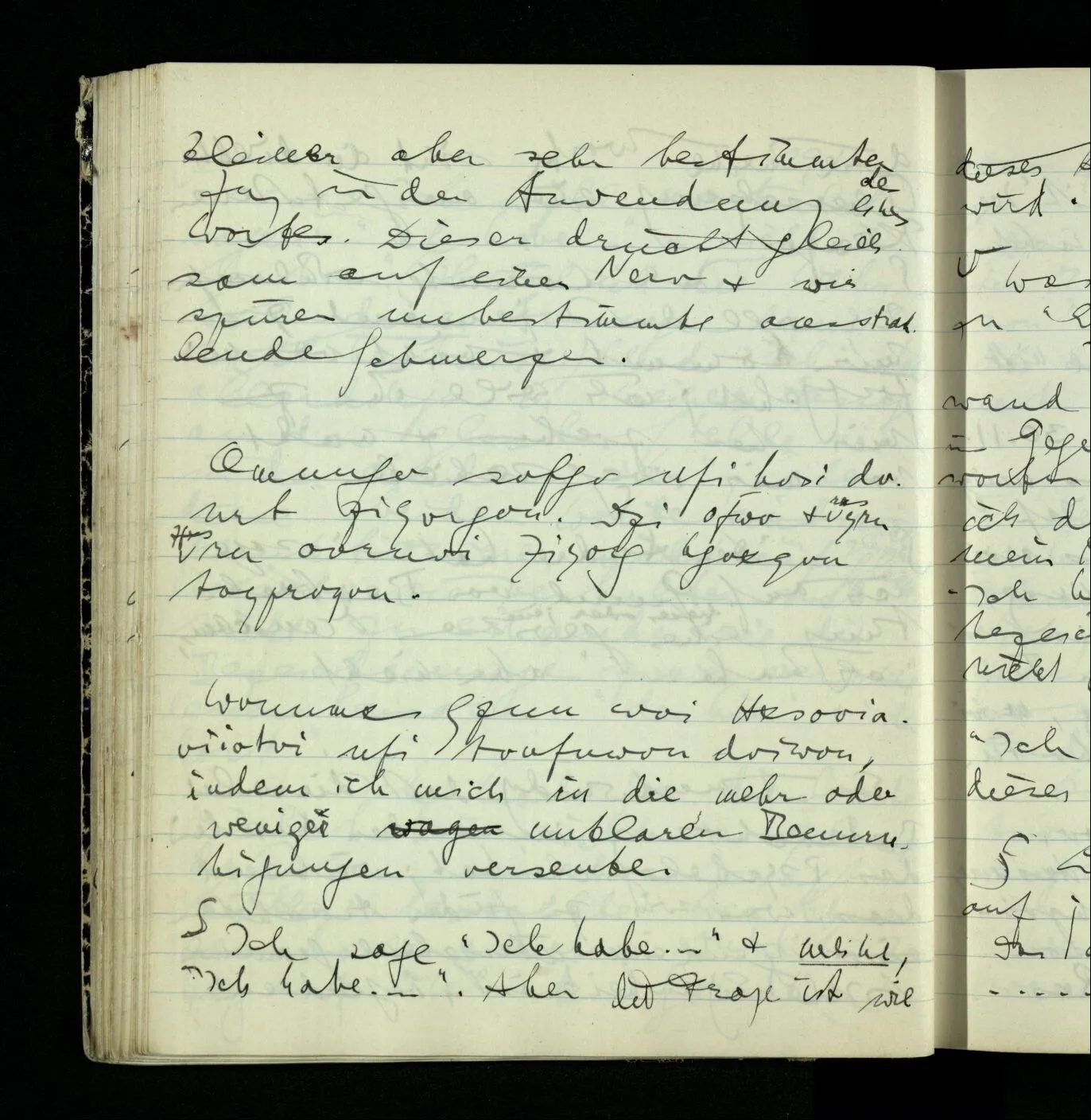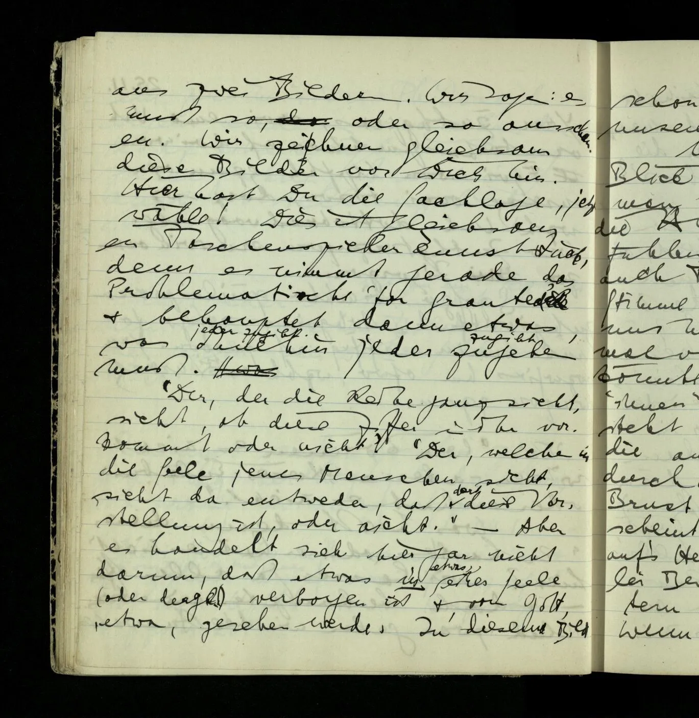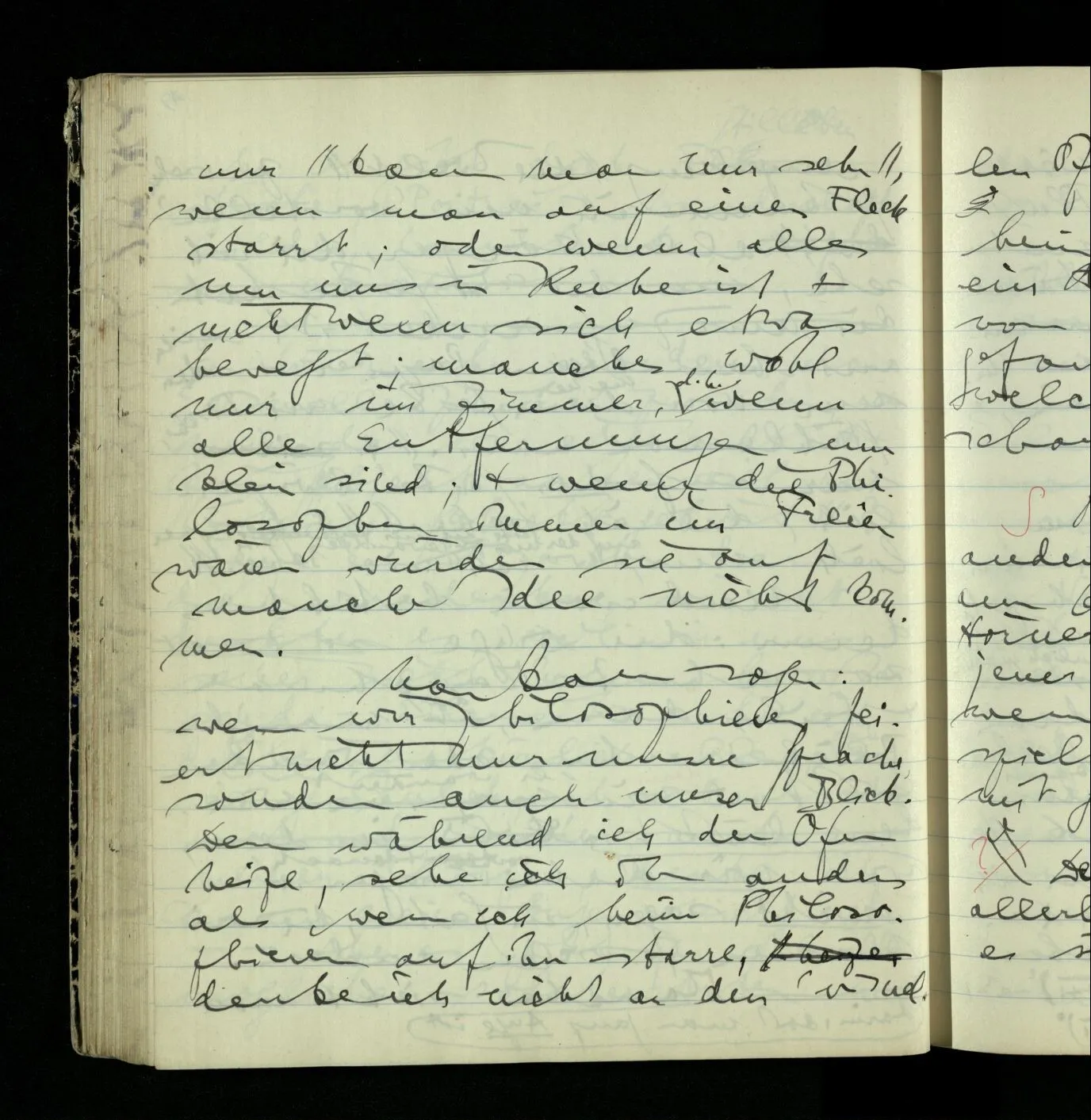 Ziehe den ganzen Tag herum – was nicht recht ist – weil ich mich innerlich bedrückt fühle. Es ist als ob ein Gewicht in der Magengegend auf mir läge; aber ich glaube nicht, daß das vom Essen kommt. Ich möchte fliehen, aber es wäre unrecht & ich kann es gar nicht. Vielleicht aber könnte ich es auch – ich könnte morgen packen und den nächsten Tag abfahren! Aber möchte ich es? Wäre es richtig? Ist es nicht richtig, hier noch auszuhalten? Gewiß. Ich würde mit einem schlechten Gefühl morgen abfahren. ‘Halt es aus’, sagt mir eine Stimme. Es ist aber auch Eitelkeit dabei, daß ich aushalten will; & auch etwas Besseres. – Der einzige triftige Grund hier früher oder gleich abzureisen wäre der, daß ich anderswo jetzt vielleicht besser arbeiten könnte. Denn es ist Tatsache, daß der Druck, der jetzt auf mir liegt mir das Arbeiten beinahe unmöglich macht & vielleicht in einigen Tagen wirklich unmöglich. Und dann verliere ich hier meine Zeit (d.h. meine Arbeitszeit). Und das ist für mich schlimm. Ist es aber nicht, gerade die Reiseunruhe, die mir das Arbeiten so ungemein schwer macht? Kann ich nicht versuchen mich zu beruhigen? Schlechter Schlaf, wenig Licht, das sind Hindernisse.