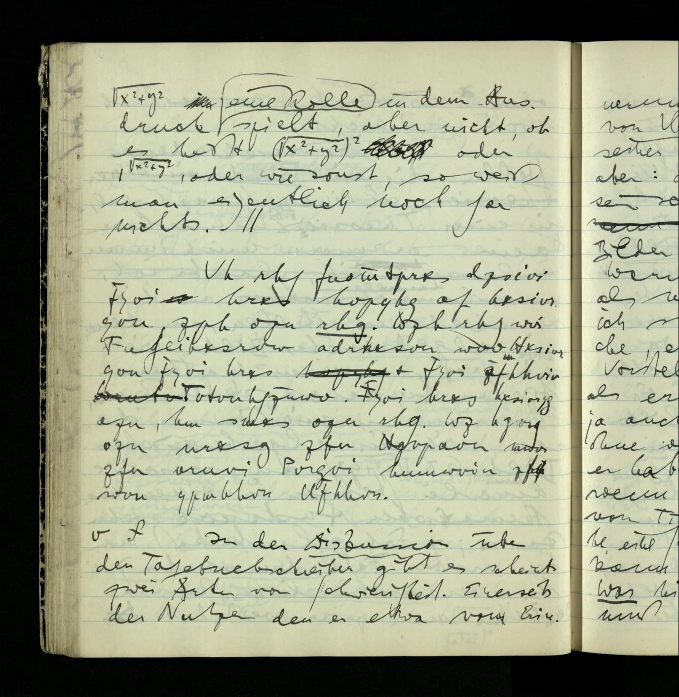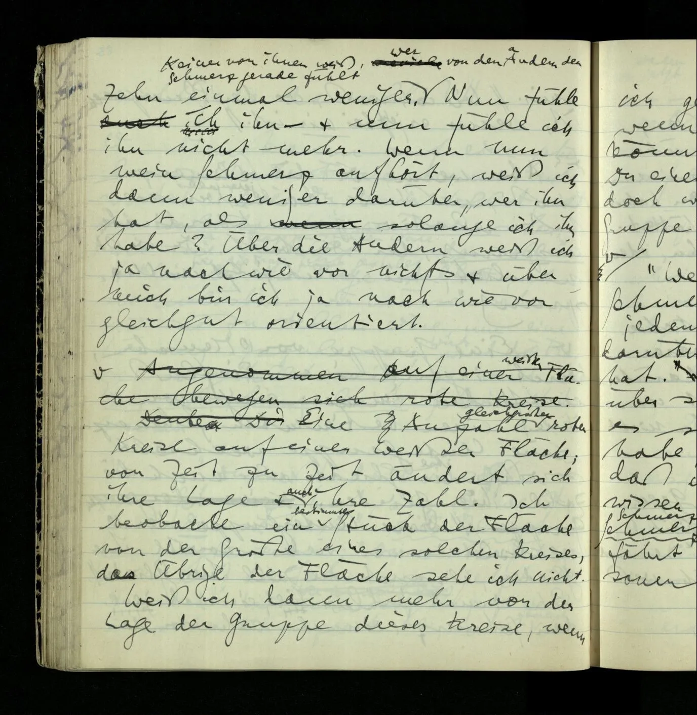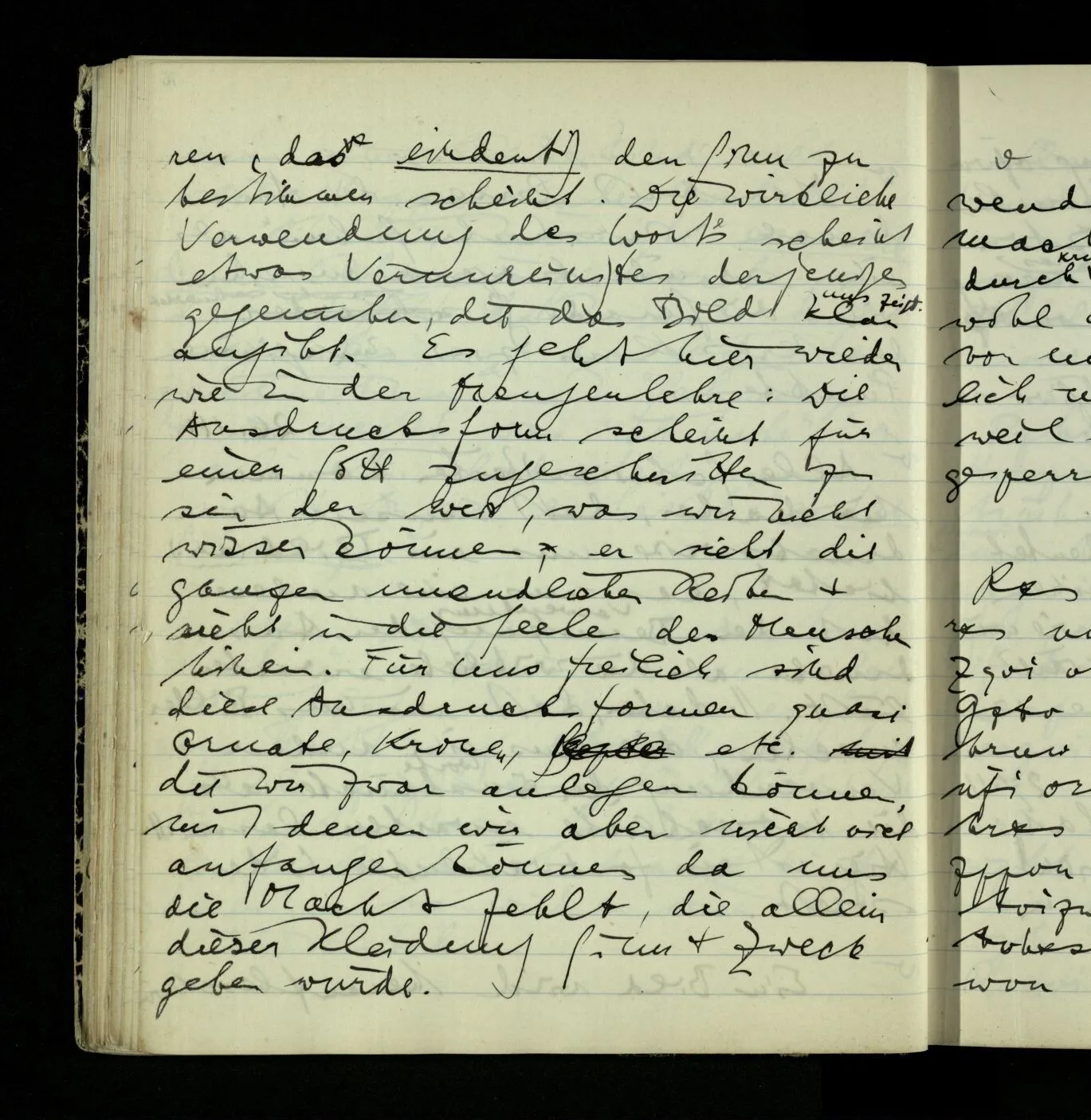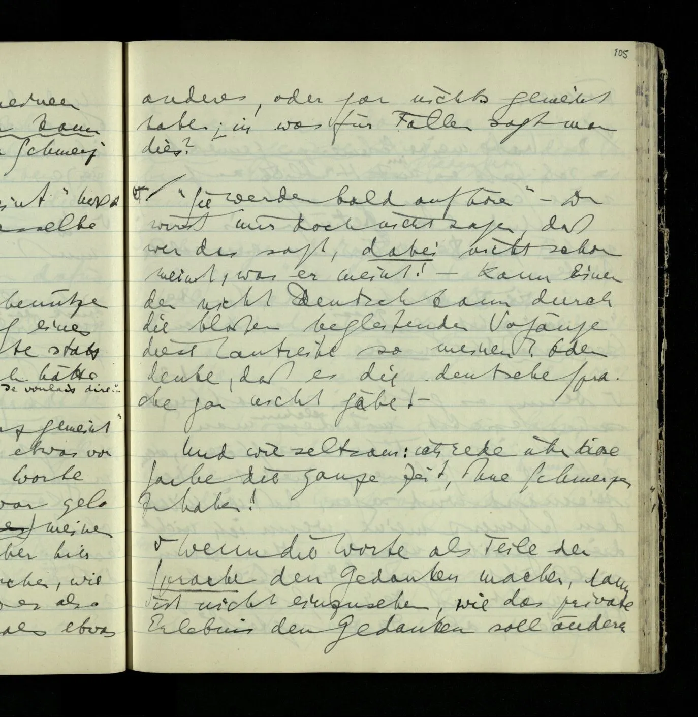 Ziehe den ganzen Tag herum – was nicht recht ist – weil ich mich innerlich bedrückt fühle. Es ist als ob ein Gewicht in der Magengegend auf mir läge; aber ich glaube nicht, daß das vom Essen kommt. Ich möchte fliehen, aber es wäre unrecht & ich kann es gar nicht. Vielleicht aber könnte ich es auch – ich könnte morgen packen und den nächsten Tag abfahren! Aber möchte ich es? Wäre es richtig? Ist es nicht richtig, hier noch auszuhalten? Gewiß. Ich würde mit einem schlechten Gefühl morgen abfahren. ‘Halt es aus’, sagt mir eine Stimme. Es ist aber auch Eitelkeit dabei, daß ich aushalten will; & auch etwas Besseres. – Der einzige triftige Grund hier früher oder gleich abzureisen wäre der, daß ich anderswo jetzt vielleicht besser arbeiten könnte. Denn es ist Tatsache, daß der Druck, der jetzt auf mir liegt mir das Arbeiten beinahe unmöglich macht & vielleicht in einigen Tagen wirklich unmöglich. Und dann verliere ich hier meine Zeit (d.h. meine Arbeitszeit). Und das ist für mich schlimm. Ist es aber nicht, gerade die Reiseunruhe, die mir das Arbeiten so ungemein schwer macht? Kann ich nicht versuchen mich zu beruhigen? Schlechter Schlaf, wenig Licht, das sind Hindernisse.