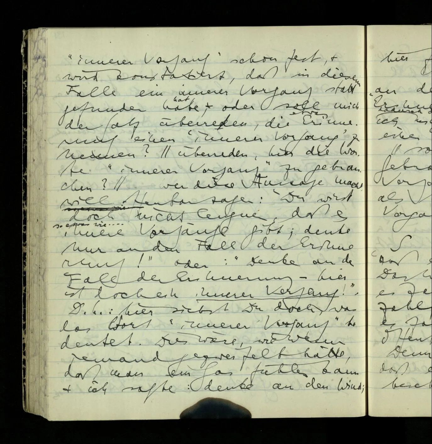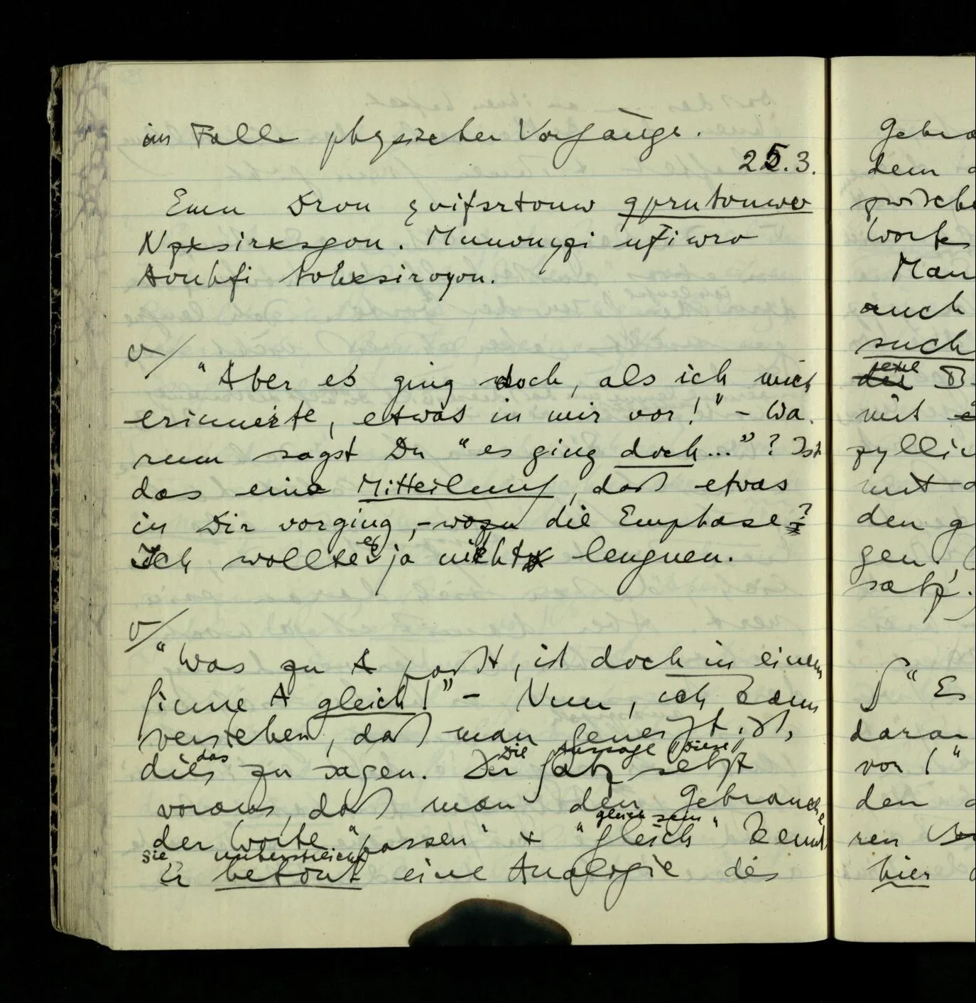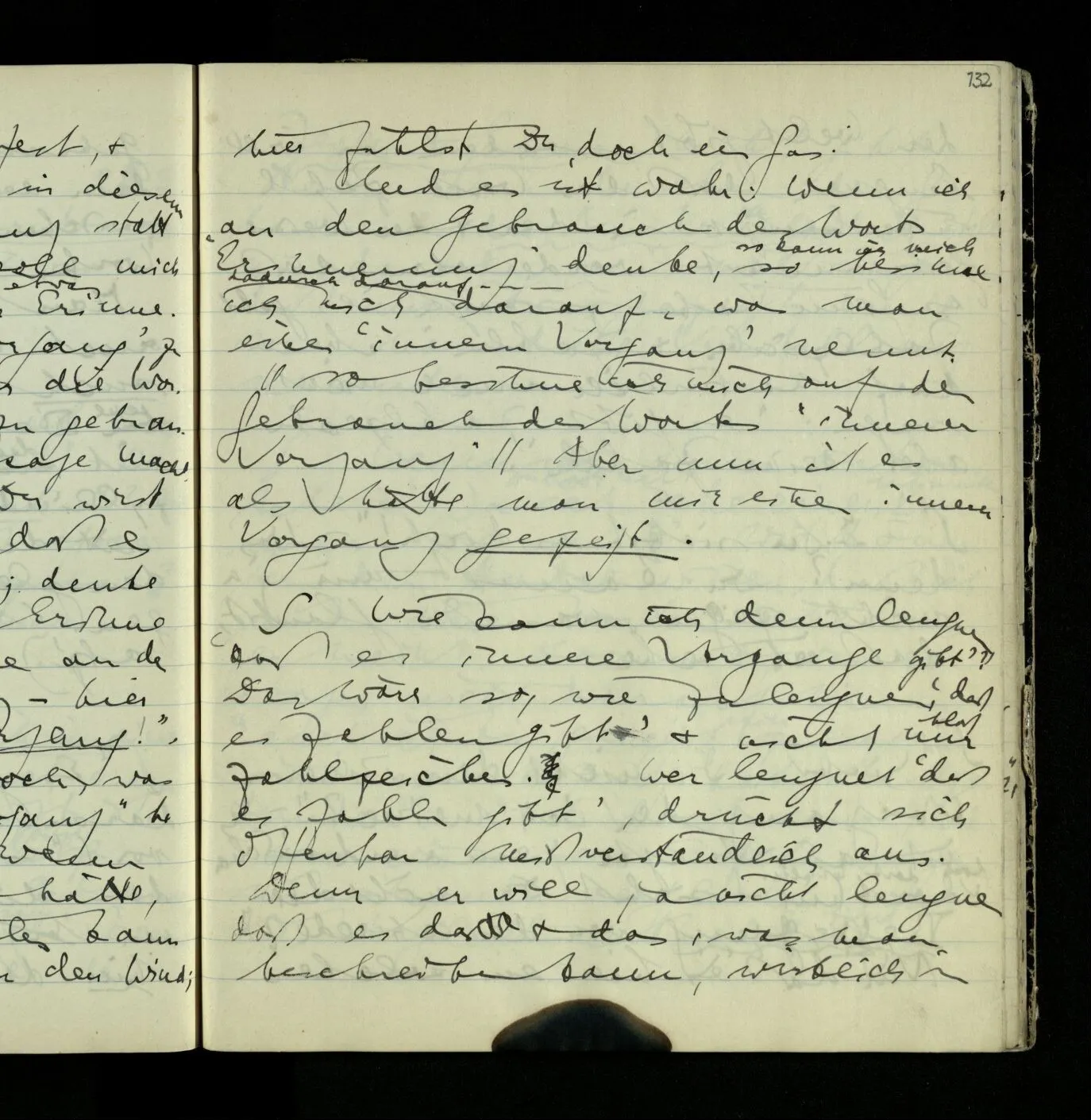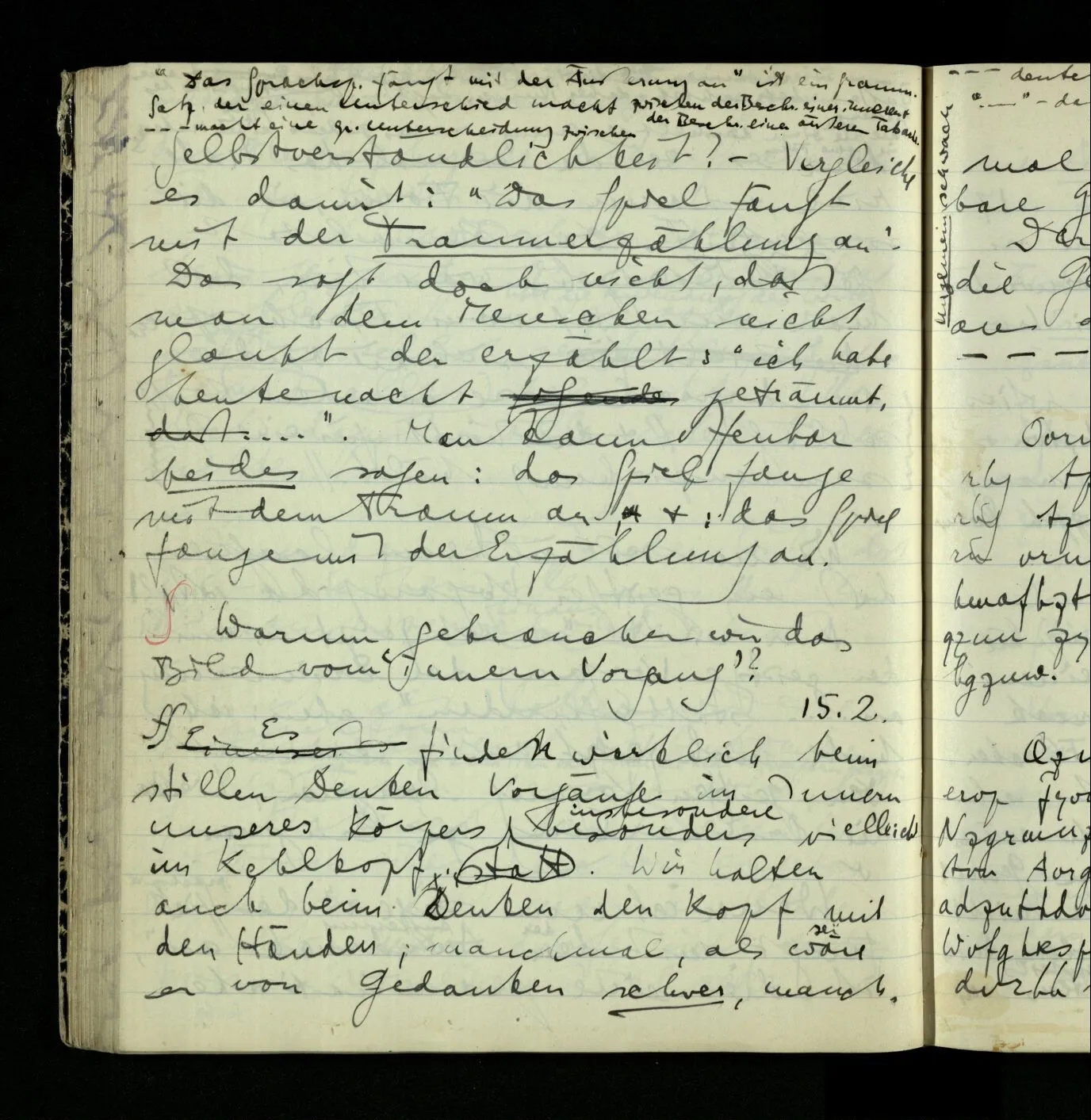 Denke Dir dieses Erlebnis: In irgend einer Tätigkeit unterbreche ich mich, schrecke auf, fahre mit der Hand an die Stirn & sage: “Gott, das hab’ ich vergessen!” worauf ich irgend etwas in großer Eile tue. Ich nehme an, daß, was ich tue, jeder andern Begründung entbehrt & das ich also Andern durch diese Handlungsweise geistesgestört erscheinen muß. – Hatte ich nun ein Erlebnis welches man mit den Worten beschreibt, es “falle einem plötzlich etwas ein, was er vergessen hatte”, (oder nicht)? (Ähnlich: Hatte Einer der sagt “Jetzt ist mir alles klar!”, dann aber keine genügende Auskunft über seine Erleuchtung zu geben weiß, das Erlebnis eines Klarwerdens, oder nicht?)