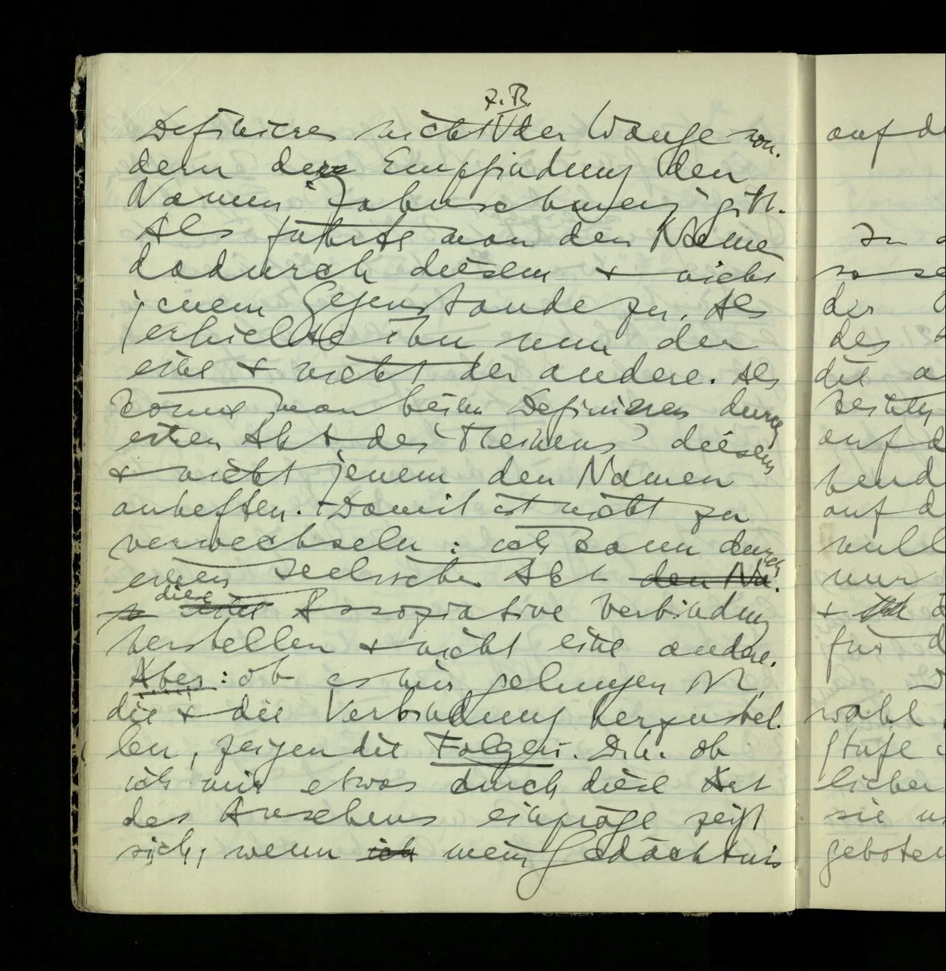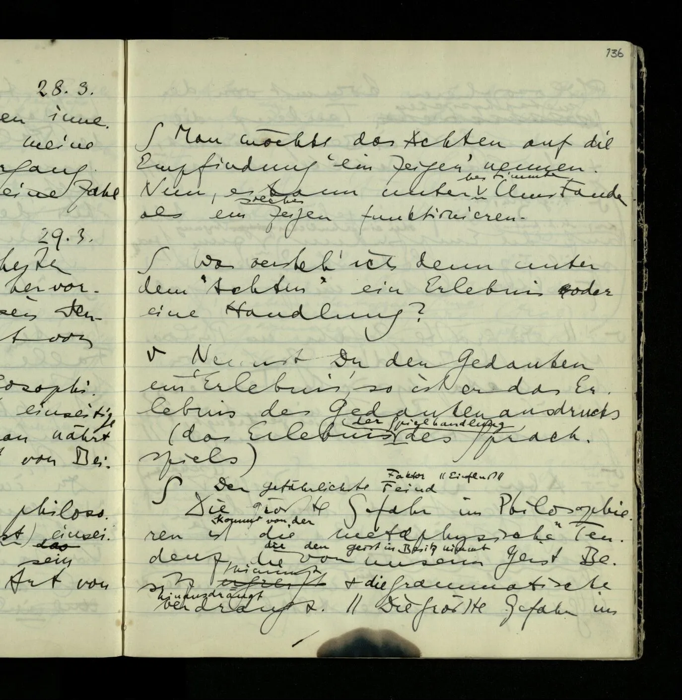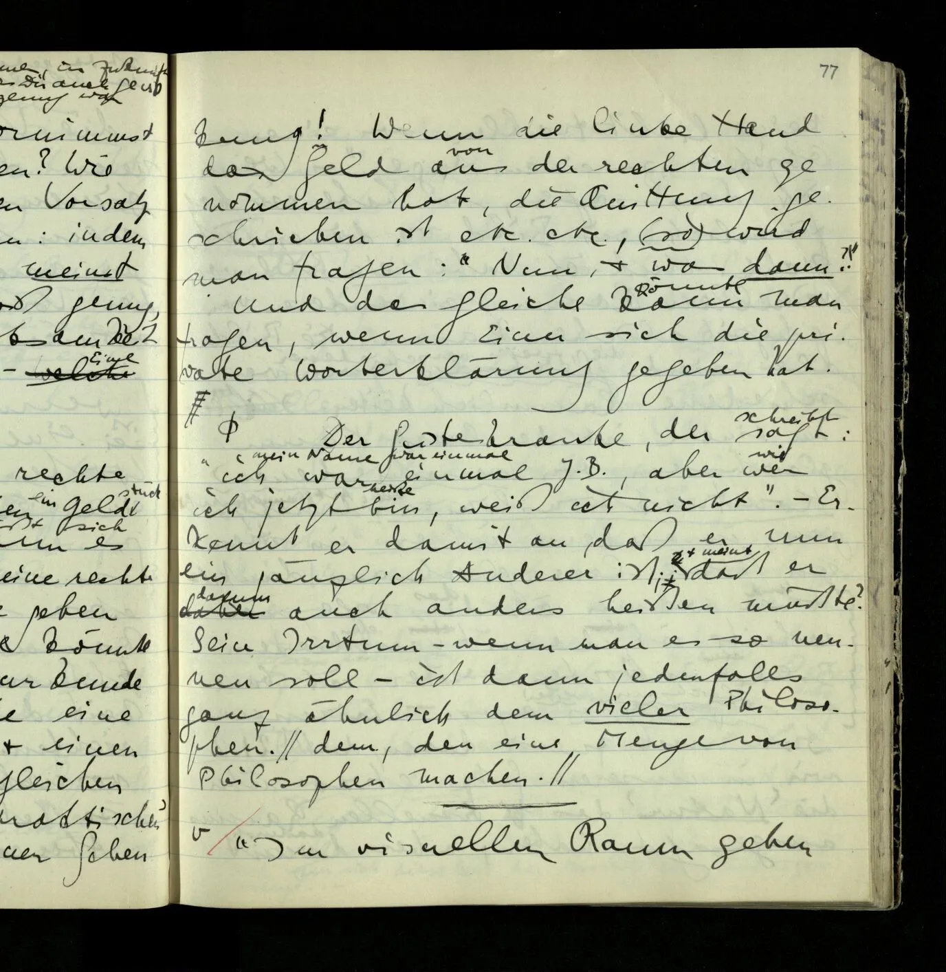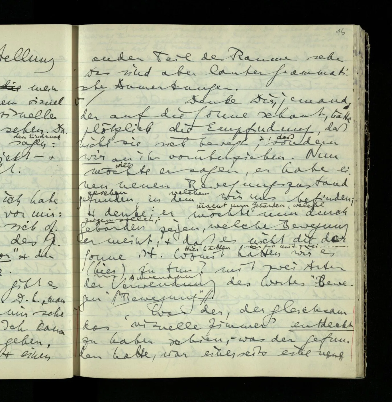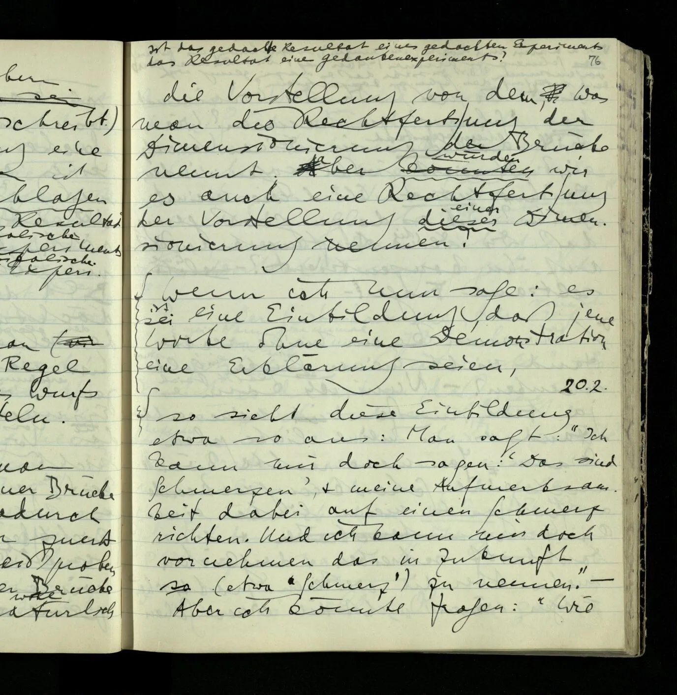 Denke Dir dieses Erlebnis: In irgend einer Tätigkeit unterbreche ich mich, schrecke auf, fahre mit der Hand an die Stirn & sage: “Gott, das hab’ ich vergessen!” worauf ich irgend etwas in großer Eile tue. Ich nehme an, daß, was ich tue, jeder andern Begründung entbehrt & das ich also Andern durch diese Handlungsweise geistesgestört erscheinen muß. – Hatte ich nun ein Erlebnis welches man mit den Worten beschreibt, es “falle einem plötzlich etwas ein, was er vergessen hatte”, (oder nicht)? (Ähnlich: Hatte Einer der sagt “Jetzt ist mir alles klar!”, dann aber keine genügende Auskunft über seine Erleuchtung zu geben weiß, das Erlebnis eines Klarwerdens, oder nicht?)