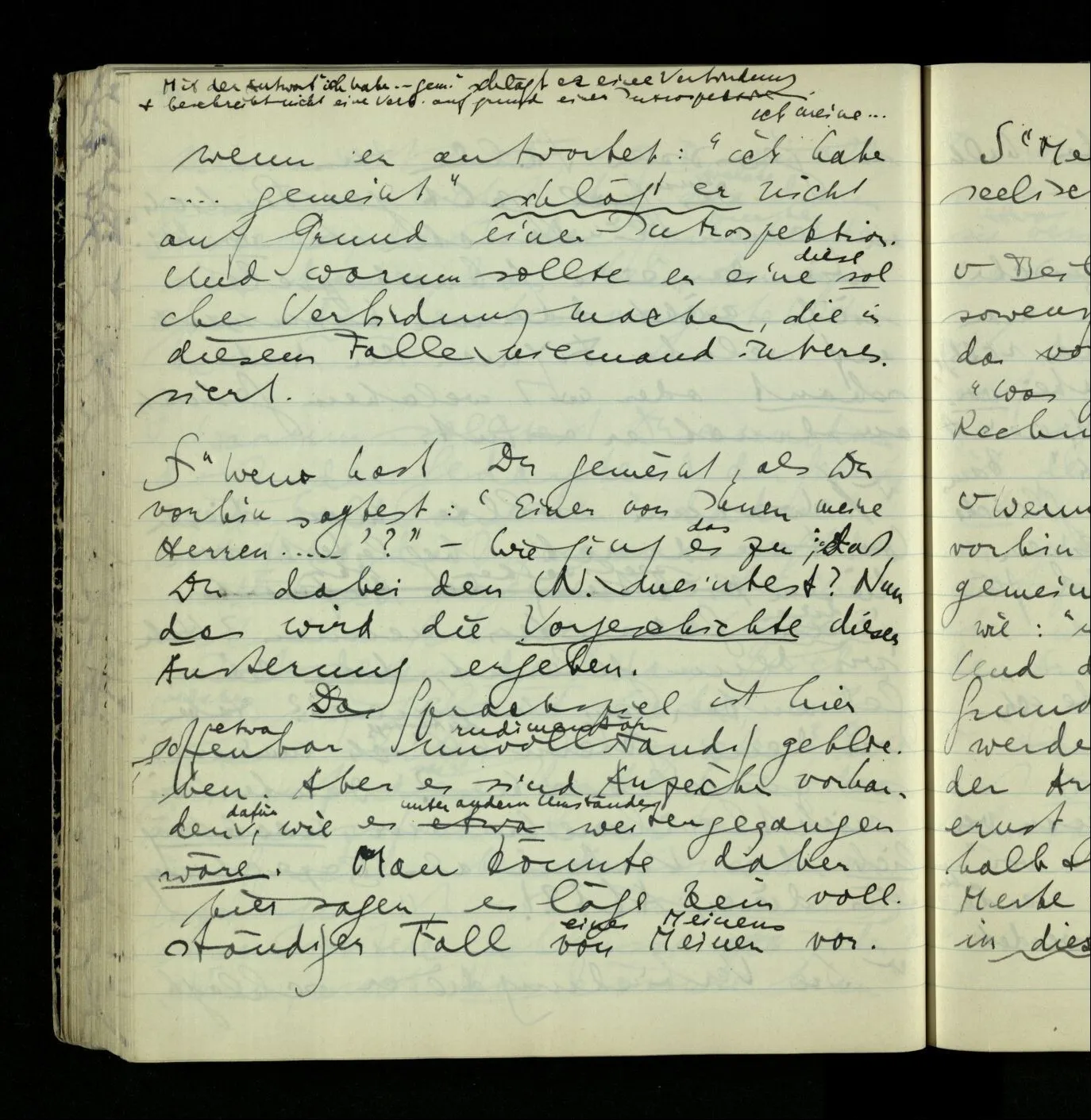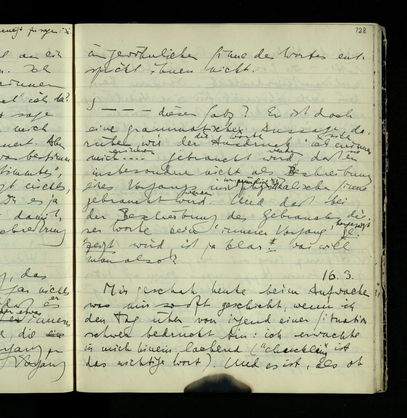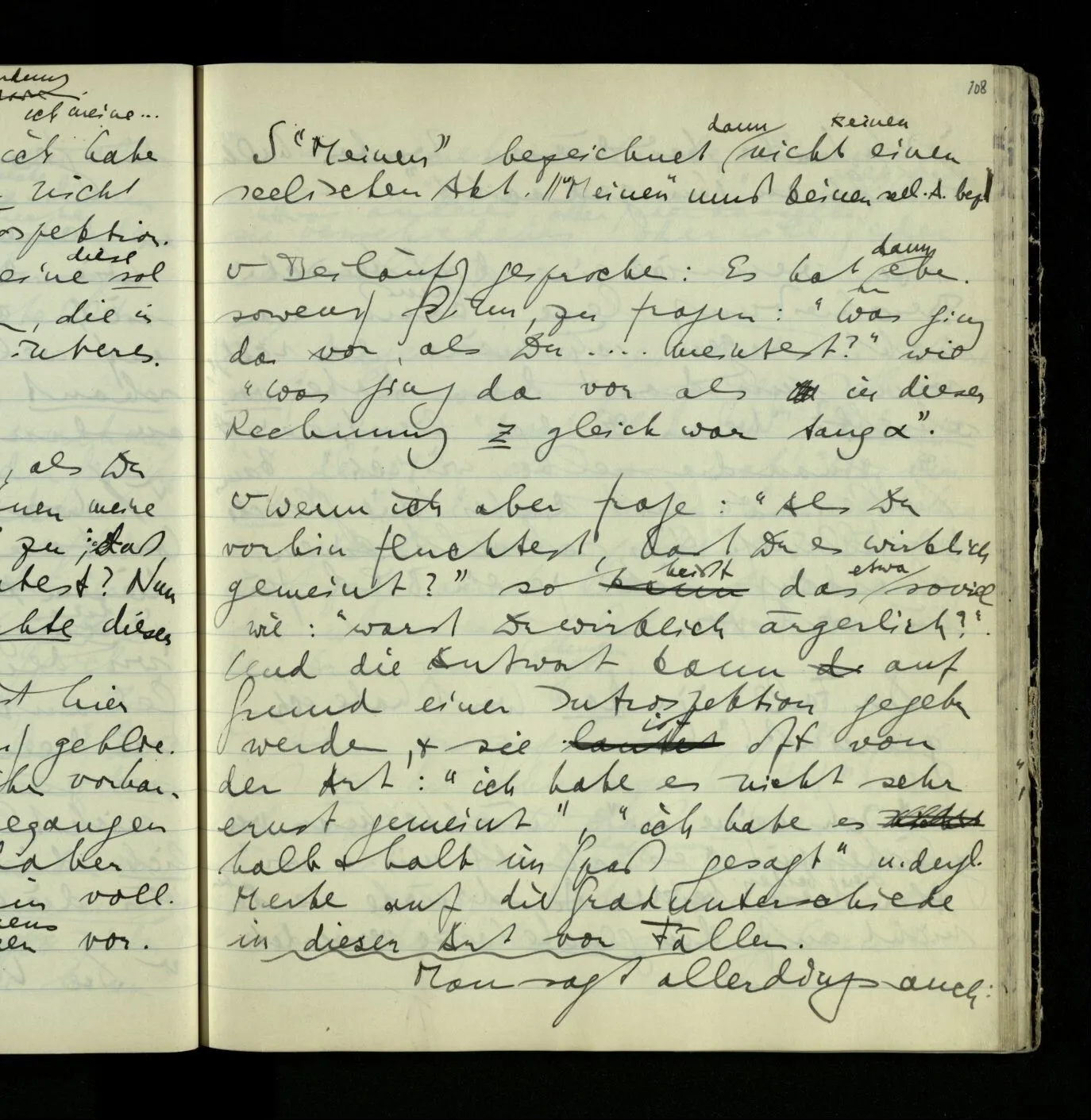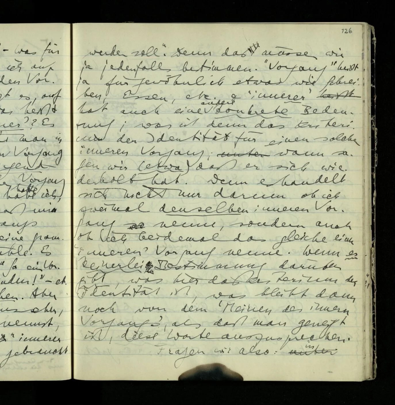 Denke Dir dieses Erlebnis: In irgend einer Tätigkeit unterbreche ich mich, schrecke auf, fahre mit der Hand an die Stirn & sage: “Gott, das hab’ ich vergessen!” worauf ich irgend etwas in großer Eile tue. Ich nehme an, daß, was ich tue, jeder andern Begründung entbehrt & das ich also Andern durch diese Handlungsweise geistesgestört erscheinen muß. – Hatte ich nun ein Erlebnis welches man mit den Worten beschreibt, es “falle einem plötzlich etwas ein, was er vergessen hatte”, (oder nicht)? (Ähnlich: Hatte Einer der sagt “Jetzt ist mir alles klar!”, dann aber keine genügende Auskunft über seine Erleuchtung zu geben weiß, das Erlebnis eines Klarwerdens, oder nicht?)