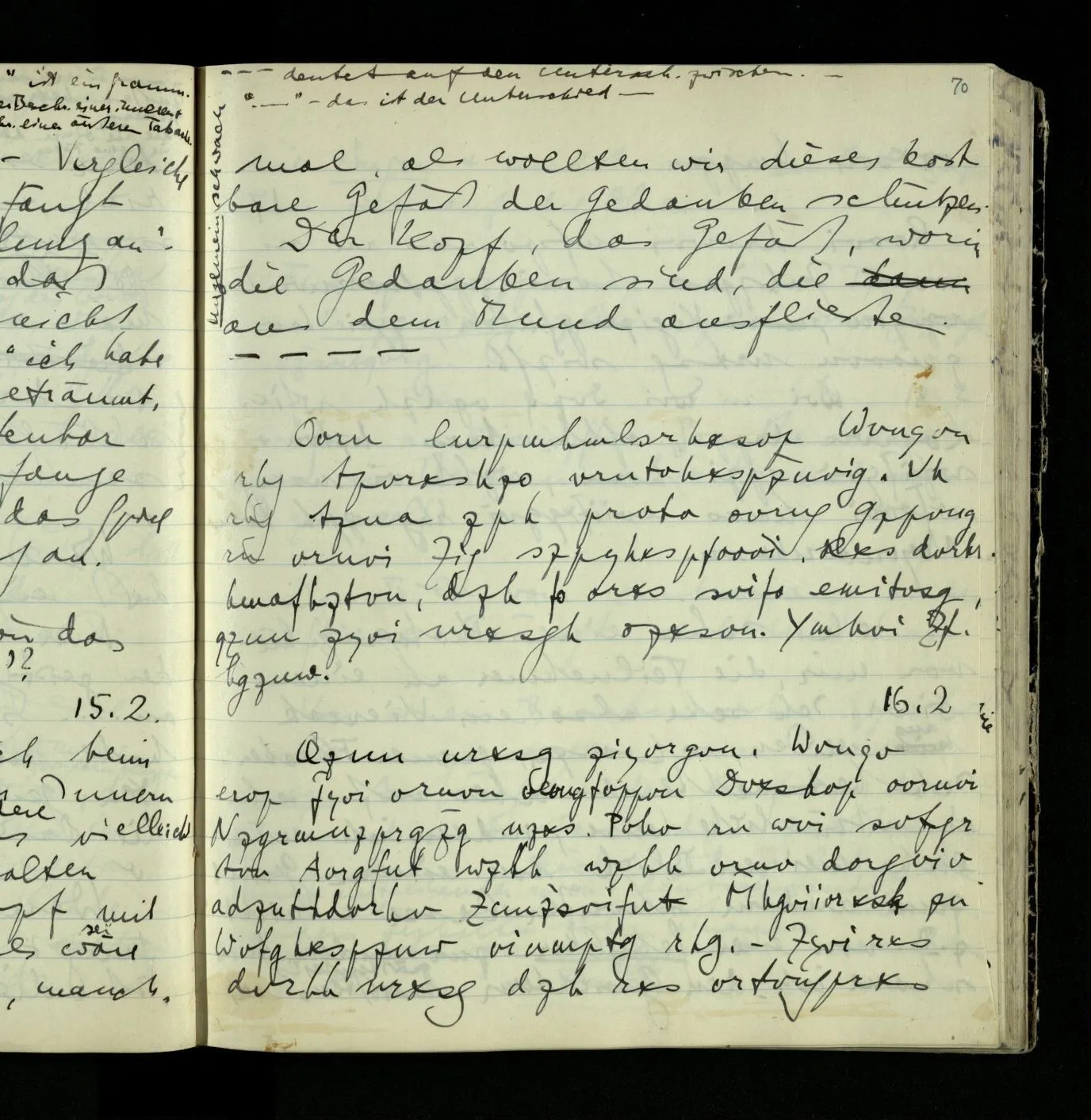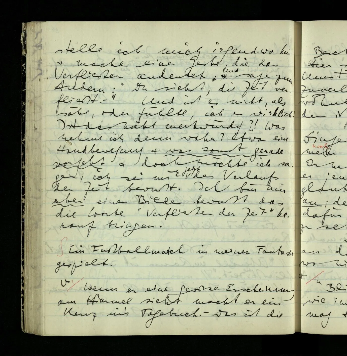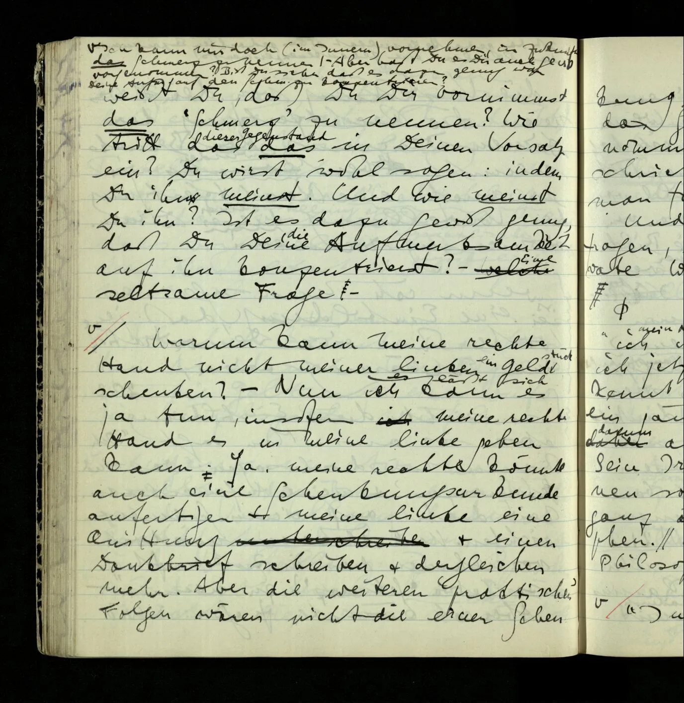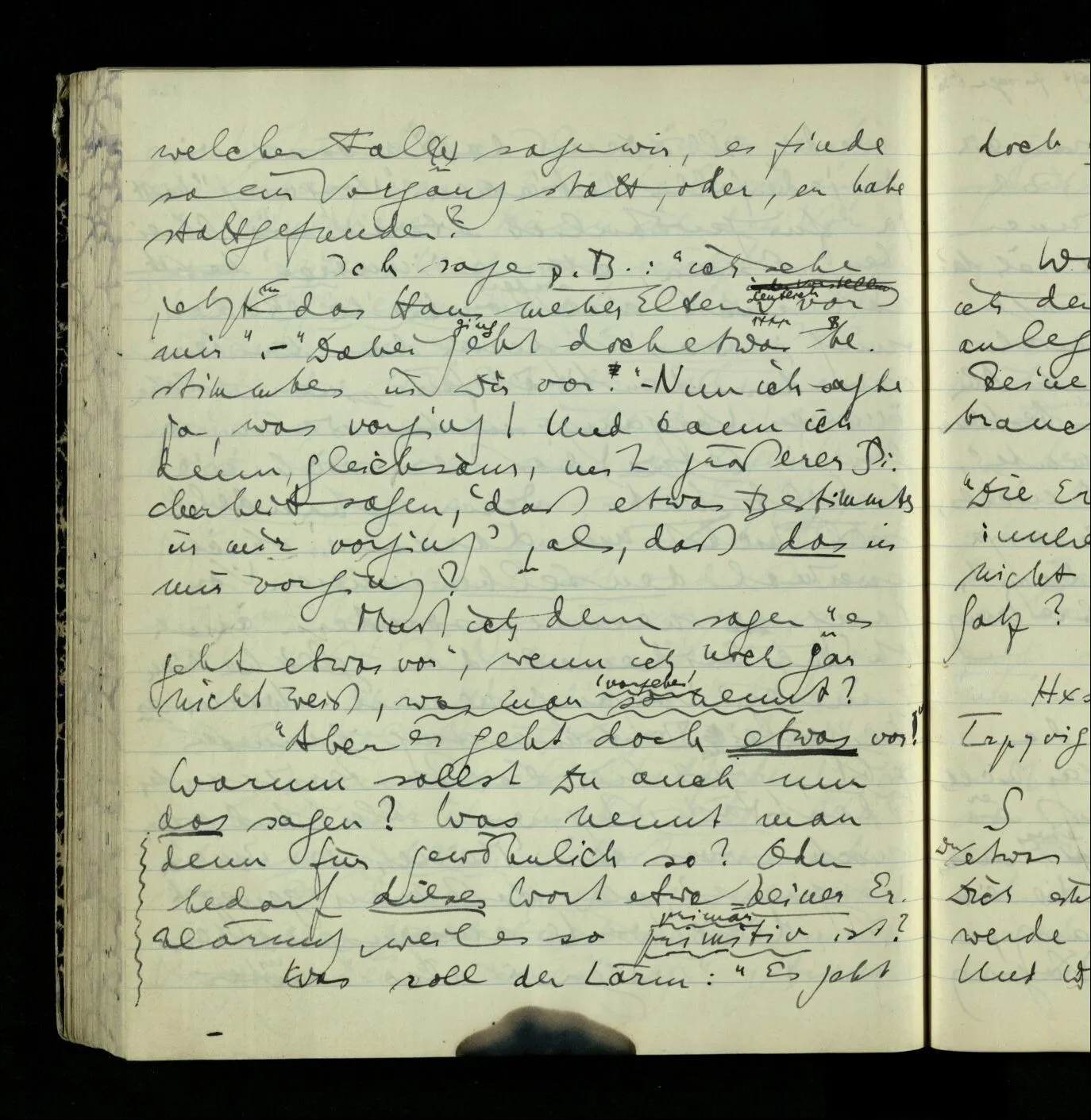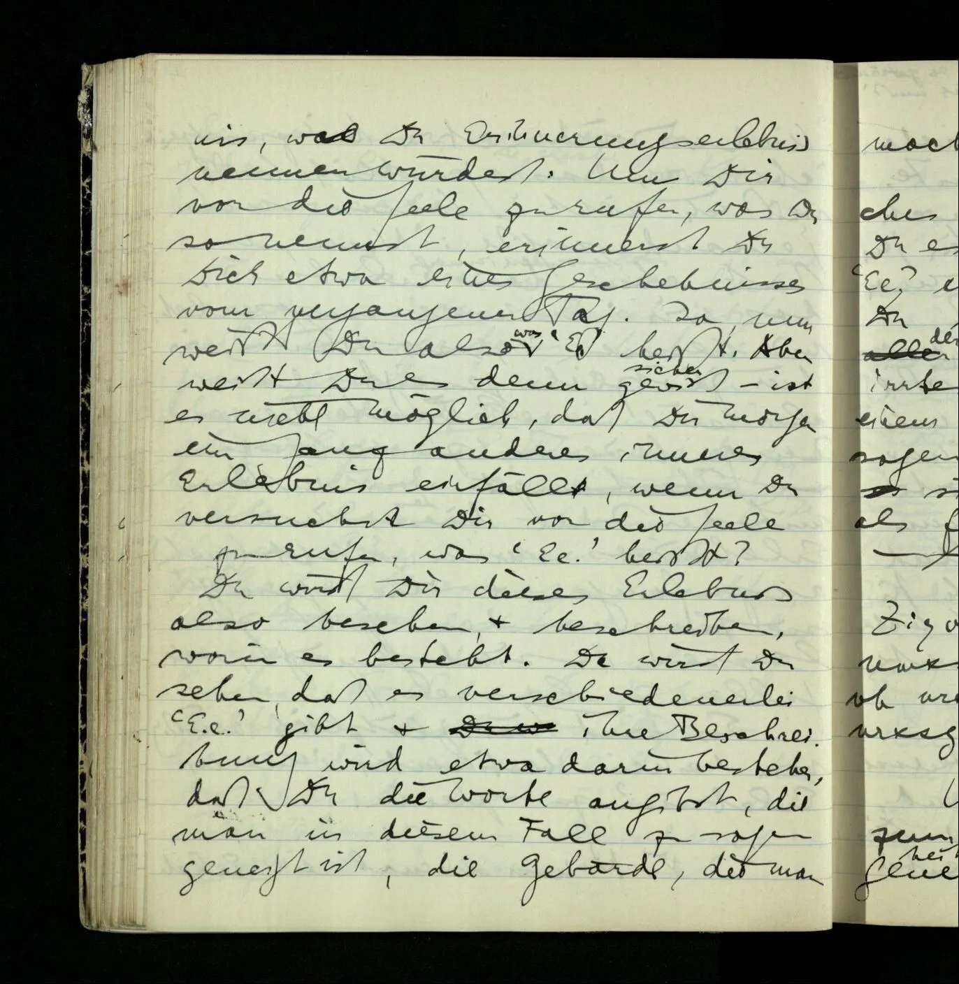 Denke Dir dieses Erlebnis: In irgend einer Tätigkeit unterbreche ich mich, schrecke auf, fahre mit der Hand an die Stirn & sage: “Gott, das hab’ ich vergessen!” worauf ich irgend etwas in großer Eile tue. Ich nehme an, daß, was ich tue, jeder andern Begründung entbehrt & das ich also Andern durch diese Handlungsweise geistesgestört erscheinen muß. – Hatte ich nun ein Erlebnis welches man mit den Worten beschreibt, es “falle einem plötzlich etwas ein, was er vergessen hatte”, (oder nicht)? (Ähnlich: Hatte Einer der sagt “Jetzt ist mir alles klar!”, dann aber keine genügende Auskunft über seine Erleuchtung zu geben weiß, das Erlebnis eines Klarwerdens, oder nicht?)