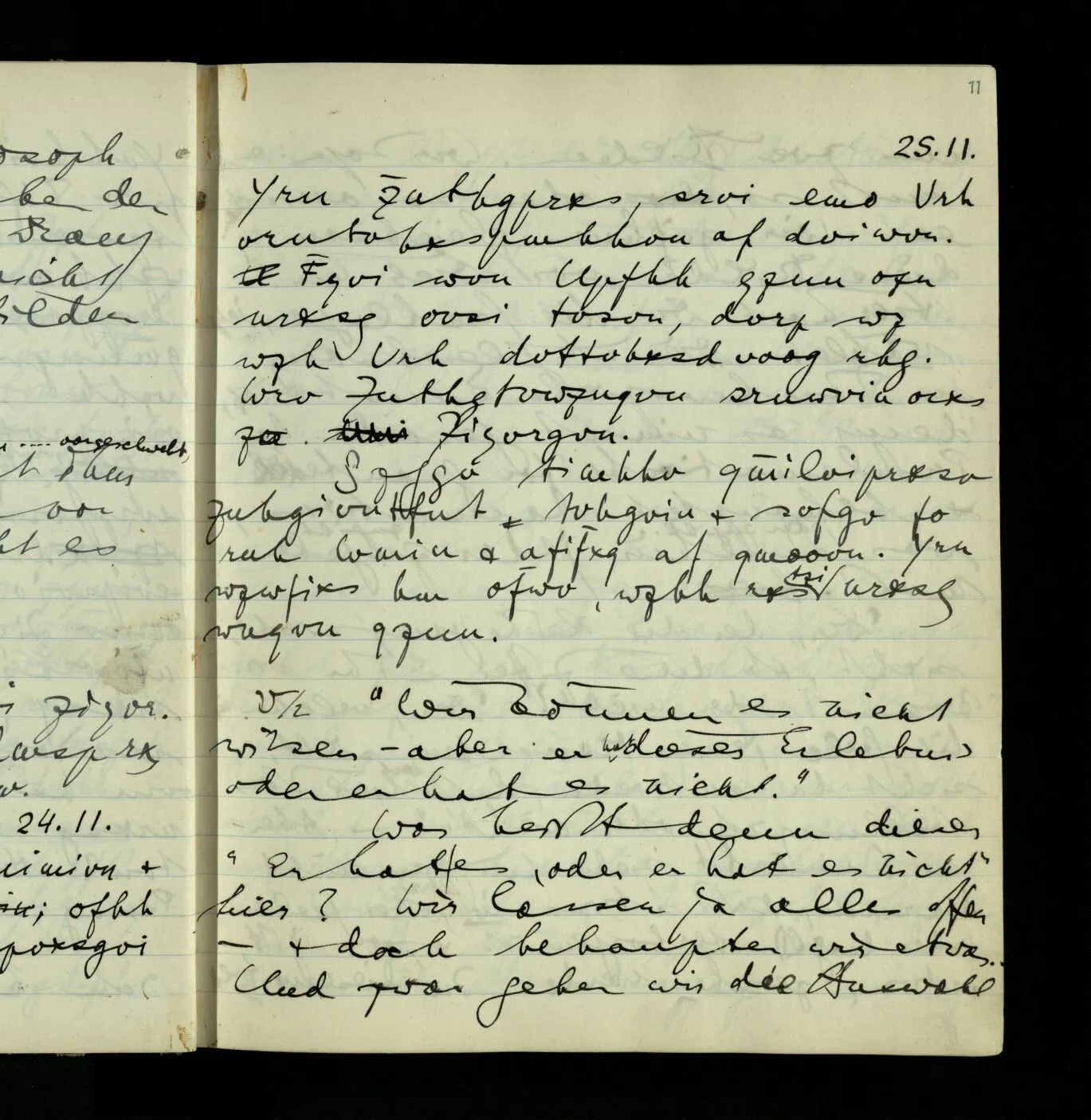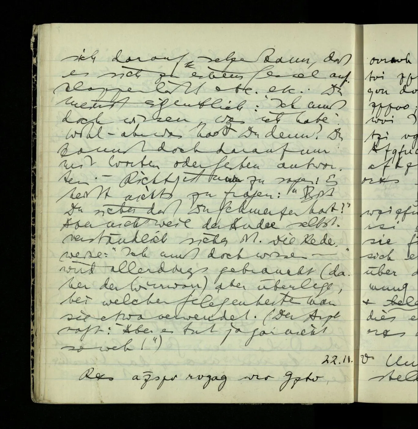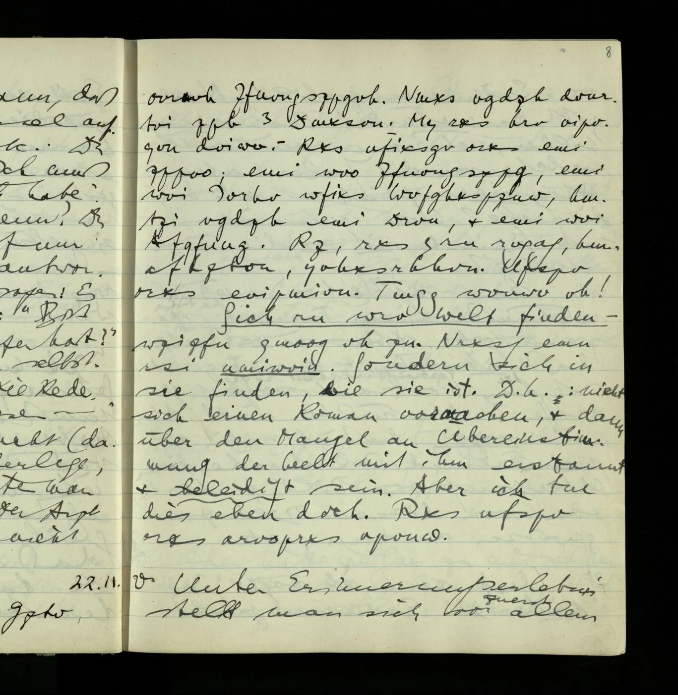 22.11.1937 Ich zähle jetzt die Tage, meines Aufenthaltes. Noch etwas weniger als 3 Wochen. Ob ich sie erleben werde. – Ich fürchte mich vor allem; vor dem Aufenthalt, vor der Reise durch Deutschland; sogar etwas vor Wien, & vor der Zukunft. Ja, ich bin jetzt, sozusagen, beschissen. Fühle mich verloren. Gott wende es! Sich in die Welt finden – darauf kommt es an. Nicht von ihr fordern. Sondern sich in sie finden, wie sie ist. D.h.: nicht sich einen Roman vormachen, & dann über den Mangel an Übereinstimmung der Welt mit ihm erstaunt & beleidigt sein. Aber ich tue dies eben doch. Ich fühle mich ziemlich elend.