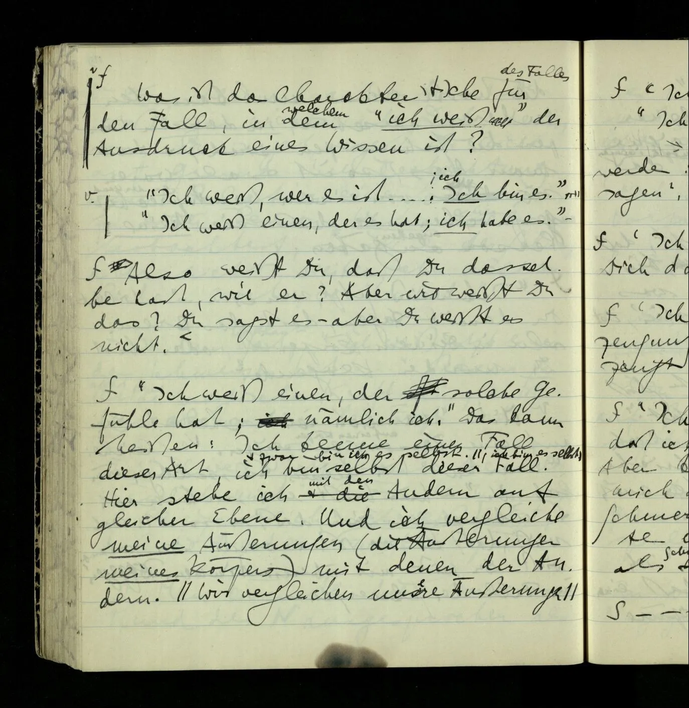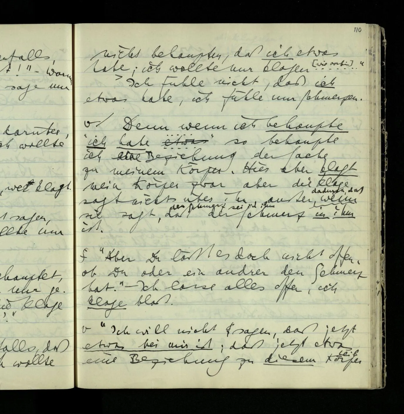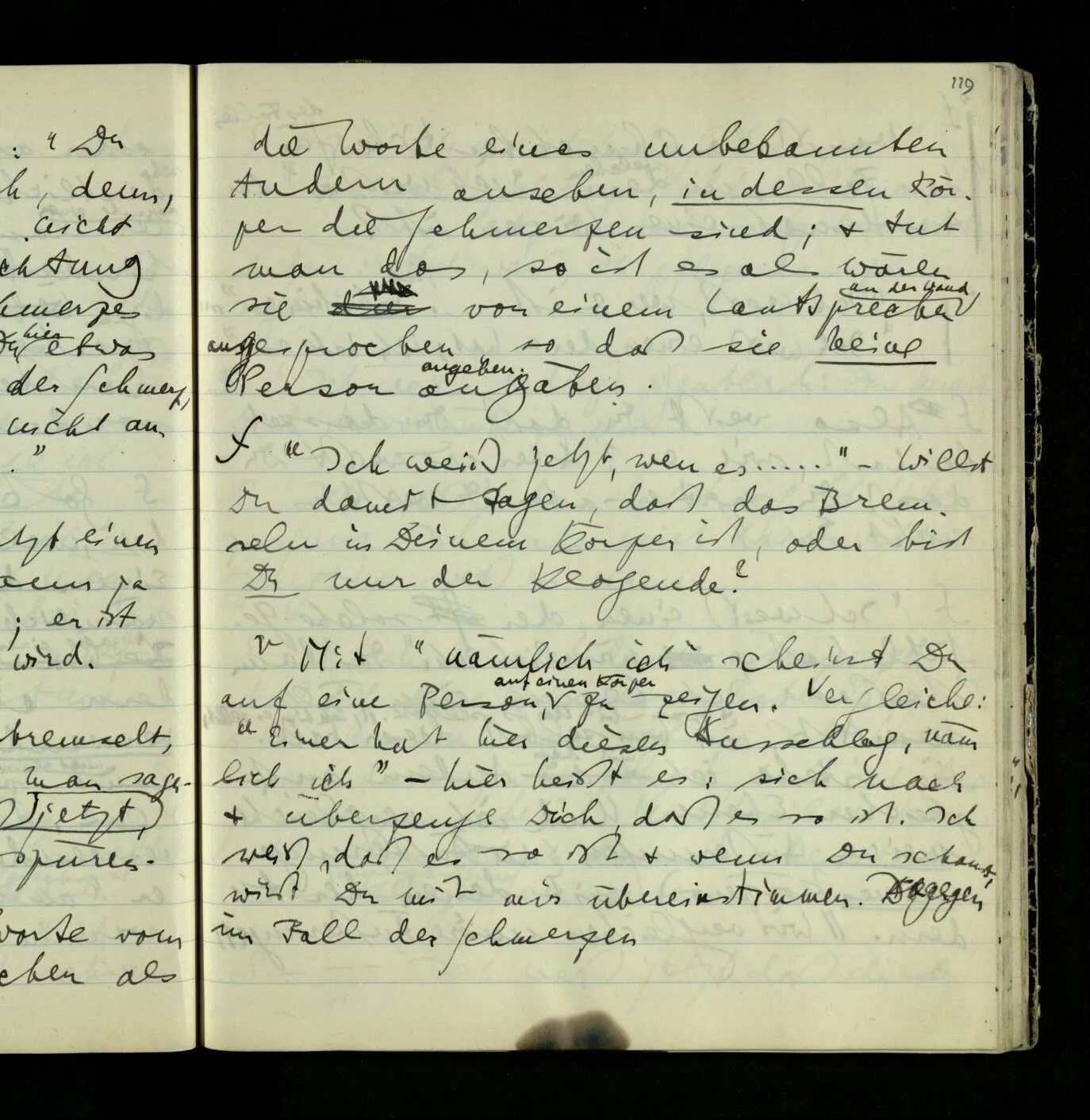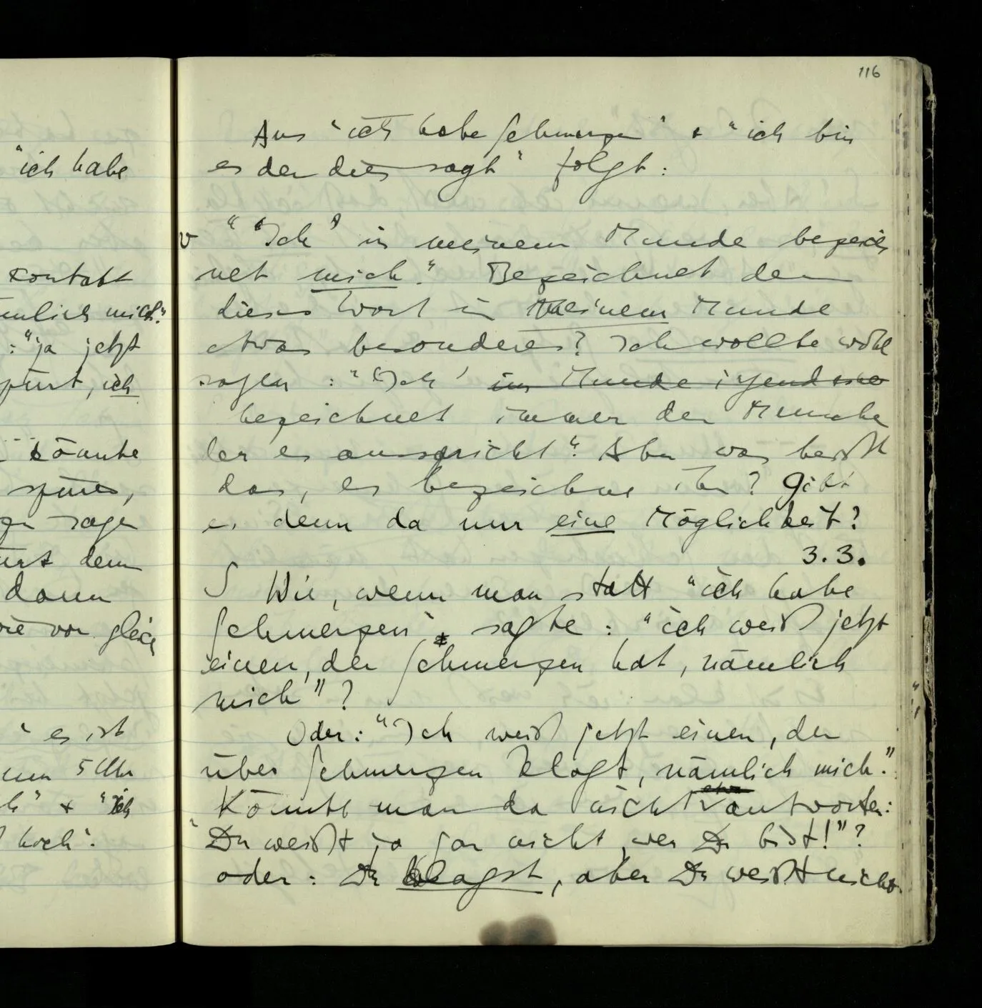 Wenn ich sage: ich habe ein bestimmtes Vorstellungsbild, also könnte es der Andere auch haben – zu wem sage ich das? Hat es Sinn zu mir selbst zu sagen: “Ich habe …”? Wenn ich es nun sage so scheint es ähnlich zu sein der Aussage: Wenn eine Uhr in dieser Lade liegen kann, dann auch in jener. Die Uhr in dieser Lade zeigt uns nämlich (dann) wie eine Uhr in einer Lade liegt, wie wir uns das vorzustellen haben. Und es wird also dargestellt, als zeigten mir meine Schmerzen, wie ich es mir vorzustellen habe, daß der Andre Schmerzen hat. Wenn ich mir aber nach meinen Schmerzen die Schmerzen des Anderen vorstellen sollte, so wäre es etwa Schmerzen, die, wie ich es dann ausdrücken müßte, ich im andern Körper habe. Denn ich habe erlebt daß ein Schmerz von einem Ort zum andern gewandert ist. Aber erlebe ich, daß ich sie habe? Aber was heißt das? Einem Anderen sage ich: “Ich habe Schmerzen”, für mich selbst stöhne ich bloß. Und das Stöhnen entspricht etwa dem Wort “Schmerzen” aber von ‘ich’ ist keine Rede. Mein Stöhnen kann auch den Andern anzeigen daß ich Schmerzen habe, dadurch nämlich, daß ich stöhne. Wenn aber bei meinen Schmerzen ich (d.h. mein Körper) stöhne & nicht der Andre so geschieht es nicht weil ich mir zum Stöhnen meinen Mund ausgesucht habe. D.h. ich will nicht dadurch etwas ausdrücken daß gerade ich und nicht ein Andrer stöhnt.