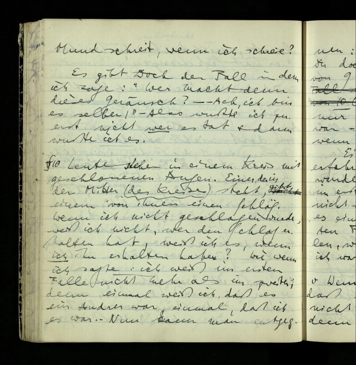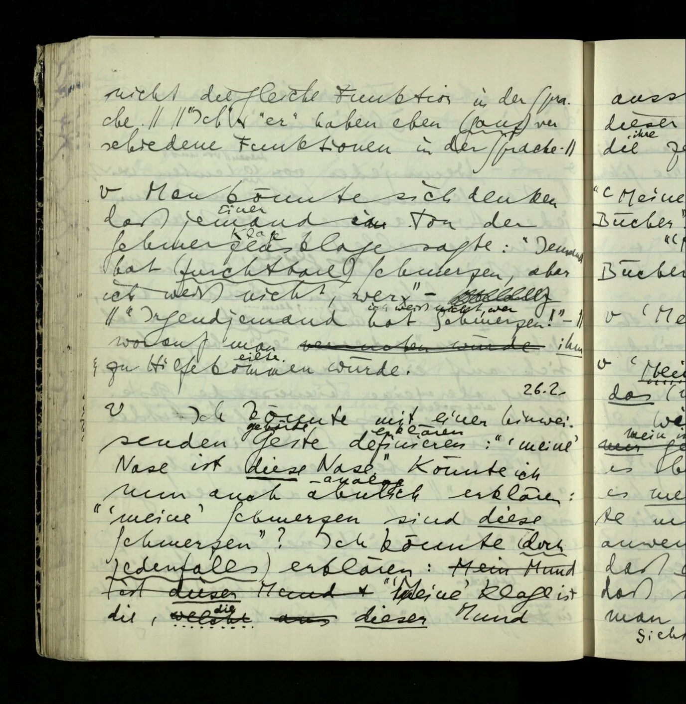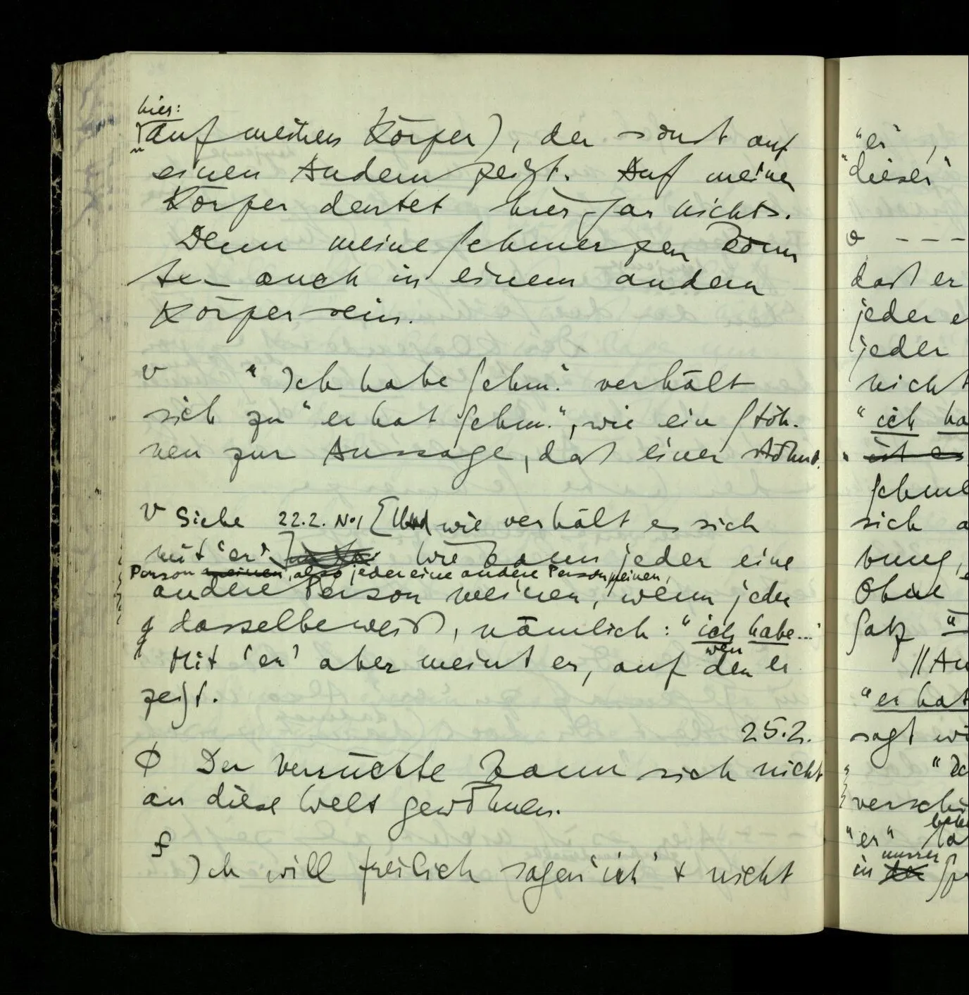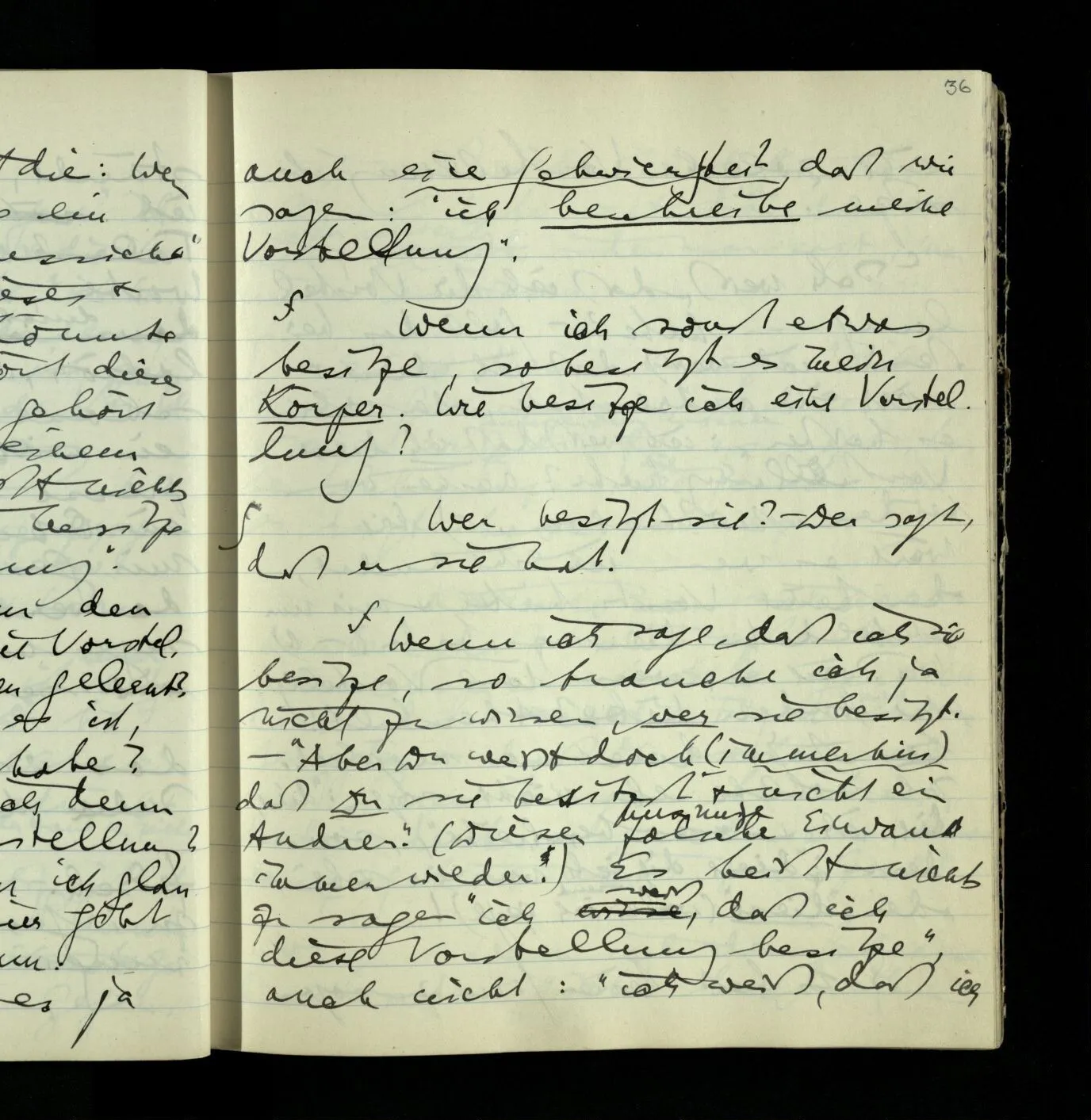 Wenn ich sage: ich habe ein bestimmtes Vorstellungsbild, also könnte es der Andere auch haben – zu wem sage ich das? Hat es Sinn zu mir selbst zu sagen: “Ich habe …”? Wenn ich es nun sage so scheint es ähnlich zu sein der Aussage: Wenn eine Uhr in dieser Lade liegen kann, dann auch in jener. Die Uhr in dieser Lade zeigt uns nämlich (dann) wie eine Uhr in einer Lade liegt, wie wir uns das vorzustellen haben. Und es wird also dargestellt, als zeigten mir meine Schmerzen, wie ich es mir vorzustellen habe, daß der Andre Schmerzen hat. Wenn ich mir aber nach meinen Schmerzen die Schmerzen des Anderen vorstellen sollte, so wäre es etwa Schmerzen, die, wie ich es dann ausdrücken müßte, ich im andern Körper habe. Denn ich habe erlebt daß ein Schmerz von einem Ort zum andern gewandert ist. Aber erlebe ich, daß ich sie habe? Aber was heißt das? Einem Anderen sage ich: “Ich habe Schmerzen”, für mich selbst stöhne ich bloß. Und das Stöhnen entspricht etwa dem Wort “Schmerzen” aber von ‘ich’ ist keine Rede. Mein Stöhnen kann auch den Andern anzeigen daß ich Schmerzen habe, dadurch nämlich, daß ich stöhne. Wenn aber bei meinen Schmerzen ich (d.h. mein Körper) stöhne & nicht der Andre so geschieht es nicht weil ich mir zum Stöhnen meinen Mund ausgesucht habe. D.h. ich will nicht dadurch etwas ausdrücken daß gerade ich und nicht ein Andrer stöhnt.