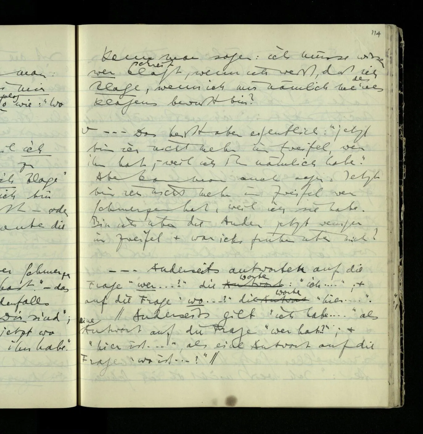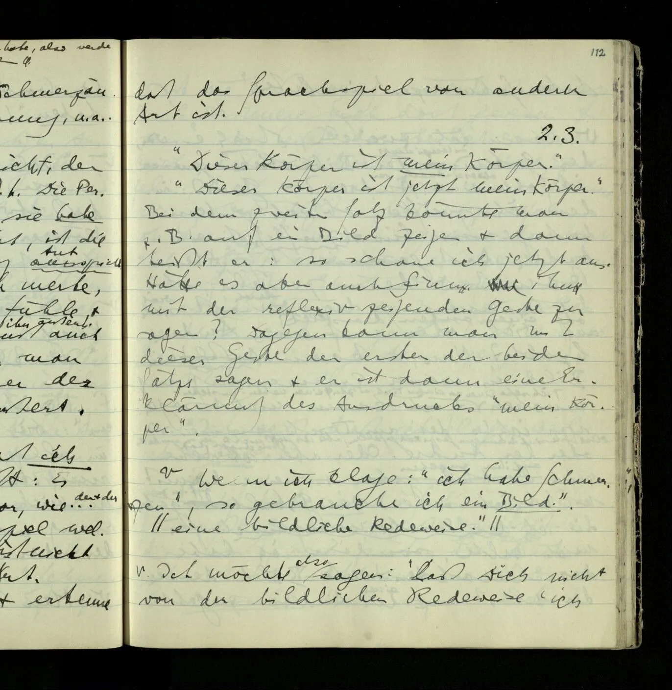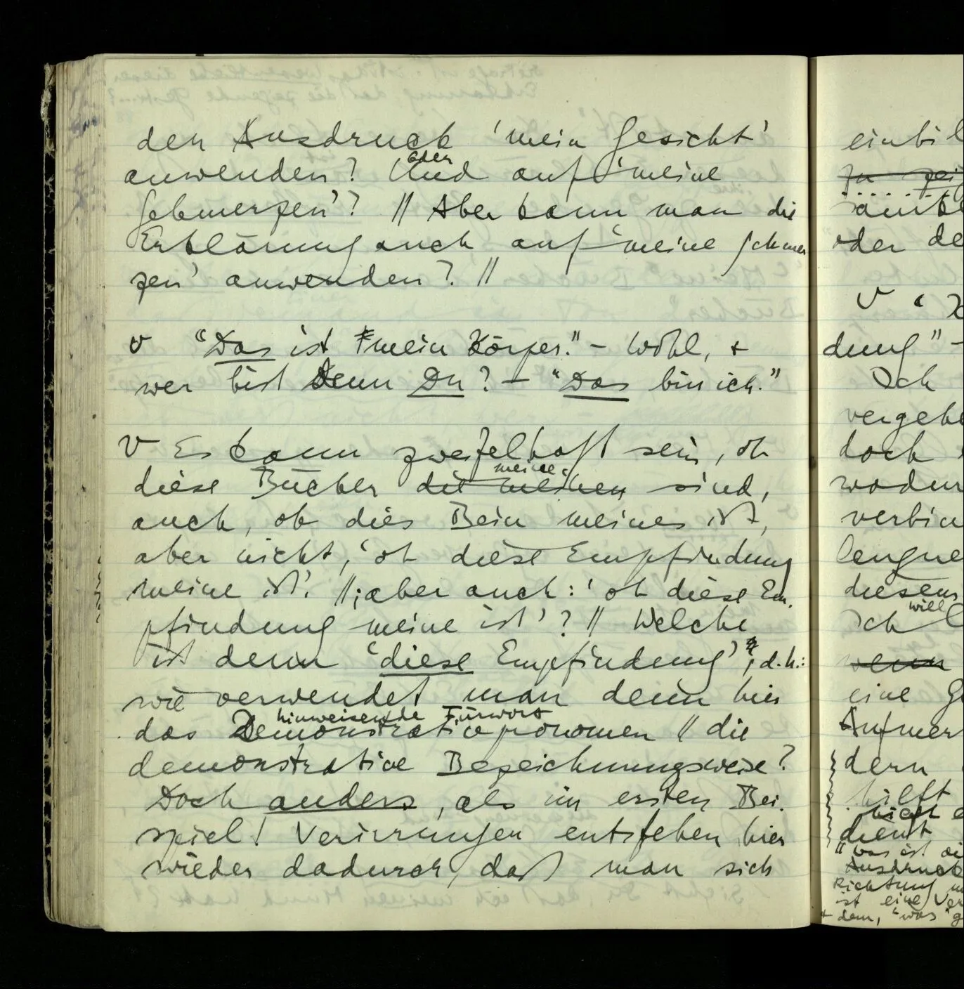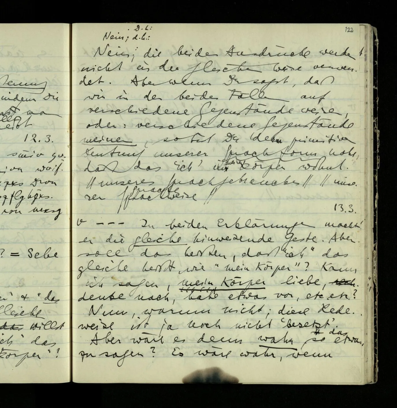 Wenn ich sage: ich habe ein bestimmtes Vorstellungsbild, also könnte es der Andere auch haben – zu wem sage ich das? Hat es Sinn zu mir selbst zu sagen: “Ich habe …”? Wenn ich es nun sage so scheint es ähnlich zu sein der Aussage: Wenn eine Uhr in dieser Lade liegen kann, dann auch in jener. Die Uhr in dieser Lade zeigt uns nämlich (dann) wie eine Uhr in einer Lade liegt, wie wir uns das vorzustellen haben. Und es wird also dargestellt, als zeigten mir meine Schmerzen, wie ich es mir vorzustellen habe, daß der Andre Schmerzen hat. Wenn ich mir aber nach meinen Schmerzen die Schmerzen des Anderen vorstellen sollte, so wäre es etwa Schmerzen, die, wie ich es dann ausdrücken müßte, ich im andern Körper habe. Denn ich habe erlebt daß ein Schmerz von einem Ort zum andern gewandert ist. Aber erlebe ich, daß ich sie habe? Aber was heißt das? Einem Anderen sage ich: “Ich habe Schmerzen”, für mich selbst stöhne ich bloß. Und das Stöhnen entspricht etwa dem Wort “Schmerzen” aber von ‘ich’ ist keine Rede. Mein Stöhnen kann auch den Andern anzeigen daß ich Schmerzen habe, dadurch nämlich, daß ich stöhne. Wenn aber bei meinen Schmerzen ich (d.h. mein Körper) stöhne & nicht der Andre so geschieht es nicht weil ich mir zum Stöhnen meinen Mund ausgesucht habe. D.h. ich will nicht dadurch etwas ausdrücken daß gerade ich und nicht ein Andrer stöhnt.