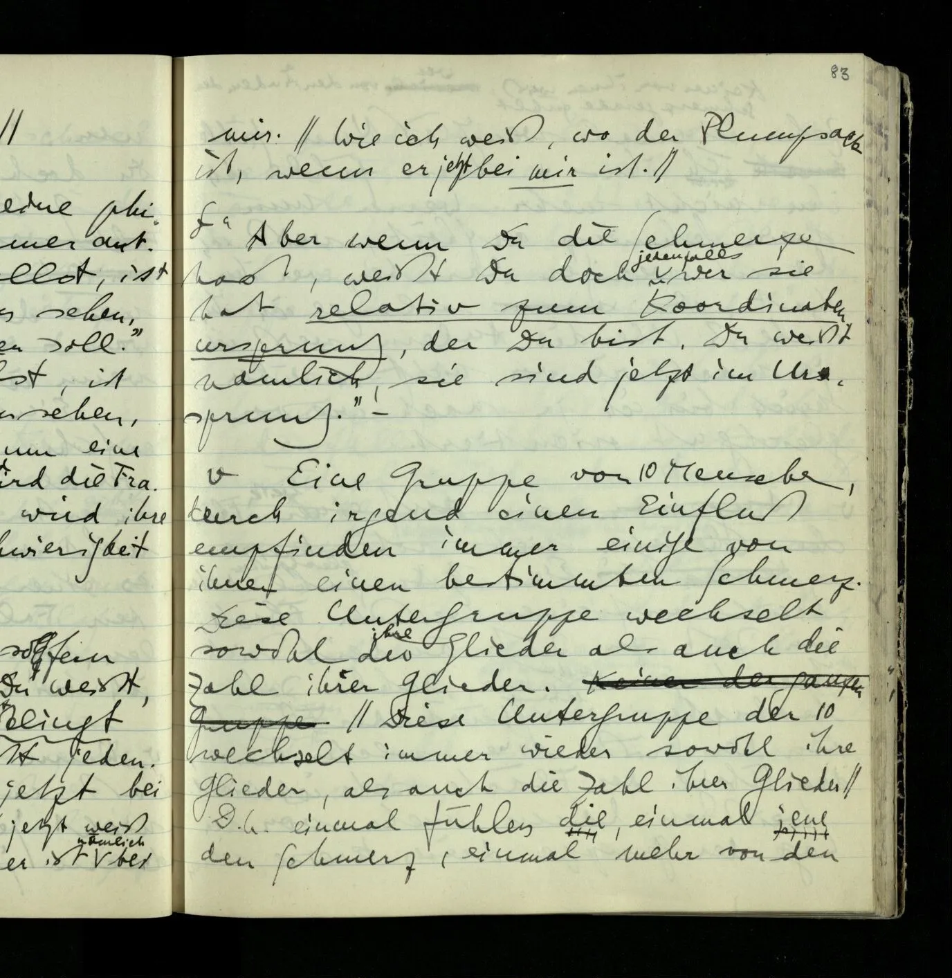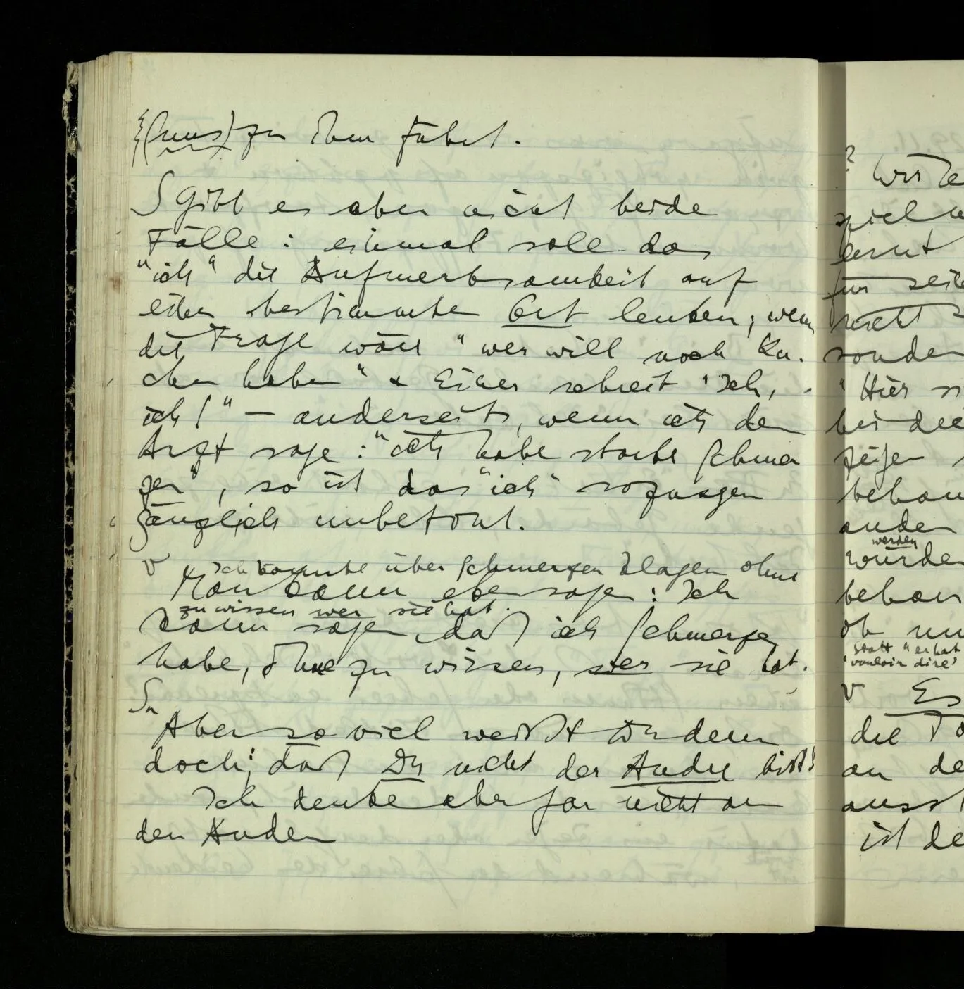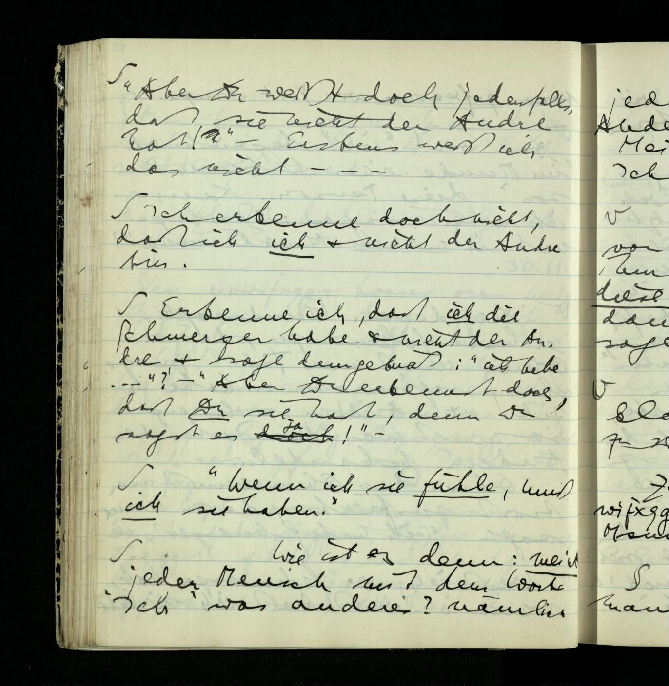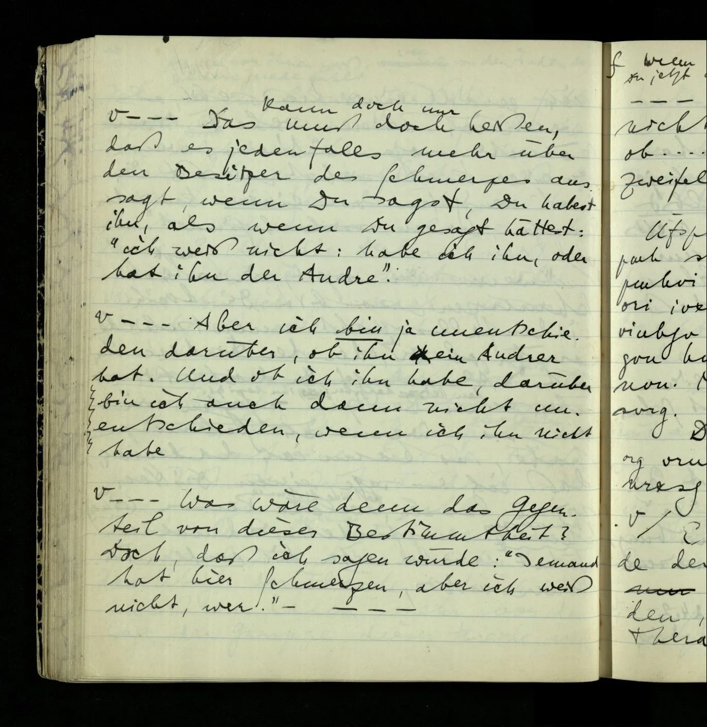 Wenn ich sage: ich habe ein bestimmtes Vorstellungsbild, also könnte es der Andere auch haben – zu wem sage ich das? Hat es Sinn zu mir selbst zu sagen: “Ich habe …”? Wenn ich es nun sage so scheint es ähnlich zu sein der Aussage: Wenn eine Uhr in dieser Lade liegen kann, dann auch in jener. Die Uhr in dieser Lade zeigt uns nämlich (dann) wie eine Uhr in einer Lade liegt, wie wir uns das vorzustellen haben. Und es wird also dargestellt, als zeigten mir meine Schmerzen, wie ich es mir vorzustellen habe, daß der Andre Schmerzen hat. Wenn ich mir aber nach meinen Schmerzen die Schmerzen des Anderen vorstellen sollte, so wäre es etwa Schmerzen, die, wie ich es dann ausdrücken müßte, ich im andern Körper habe. Denn ich habe erlebt daß ein Schmerz von einem Ort zum andern gewandert ist. Aber erlebe ich, daß ich sie habe? Aber was heißt das? Einem Anderen sage ich: “Ich habe Schmerzen”, für mich selbst stöhne ich bloß. Und das Stöhnen entspricht etwa dem Wort “Schmerzen” aber von ‘ich’ ist keine Rede. Mein Stöhnen kann auch den Andern anzeigen daß ich Schmerzen habe, dadurch nämlich, daß ich stöhne. Wenn aber bei meinen Schmerzen ich (d.h. mein Körper) stöhne & nicht der Andre so geschieht es nicht weil ich mir zum Stöhnen meinen Mund ausgesucht habe. D.h. ich will nicht dadurch etwas ausdrücken daß gerade ich und nicht ein Andrer stöhnt.