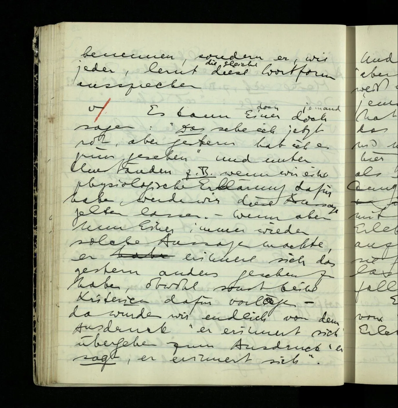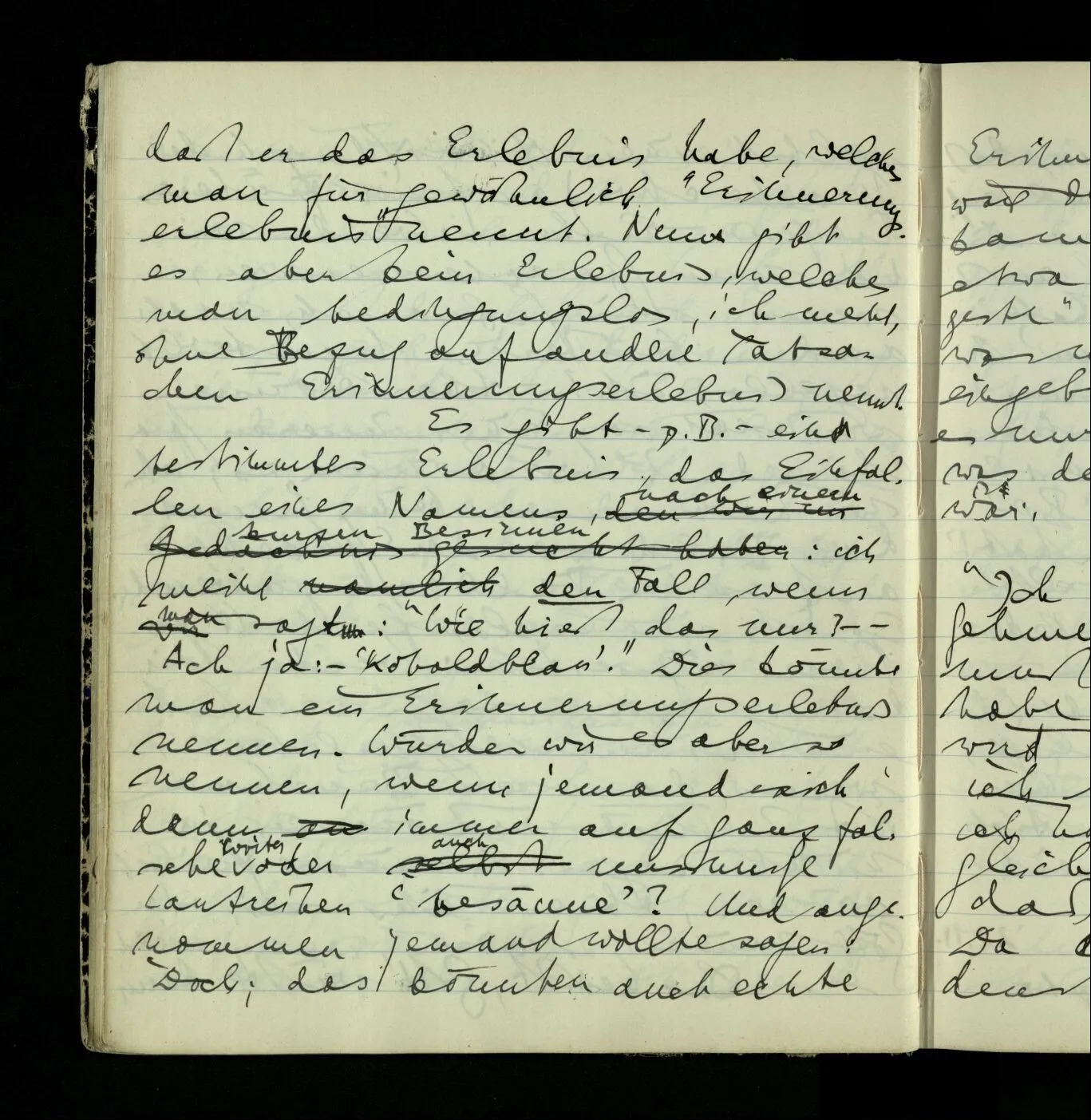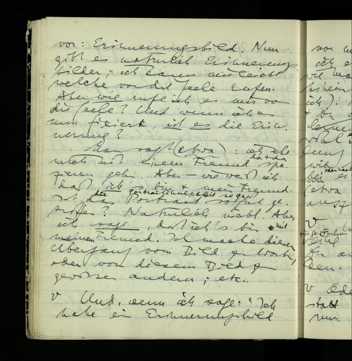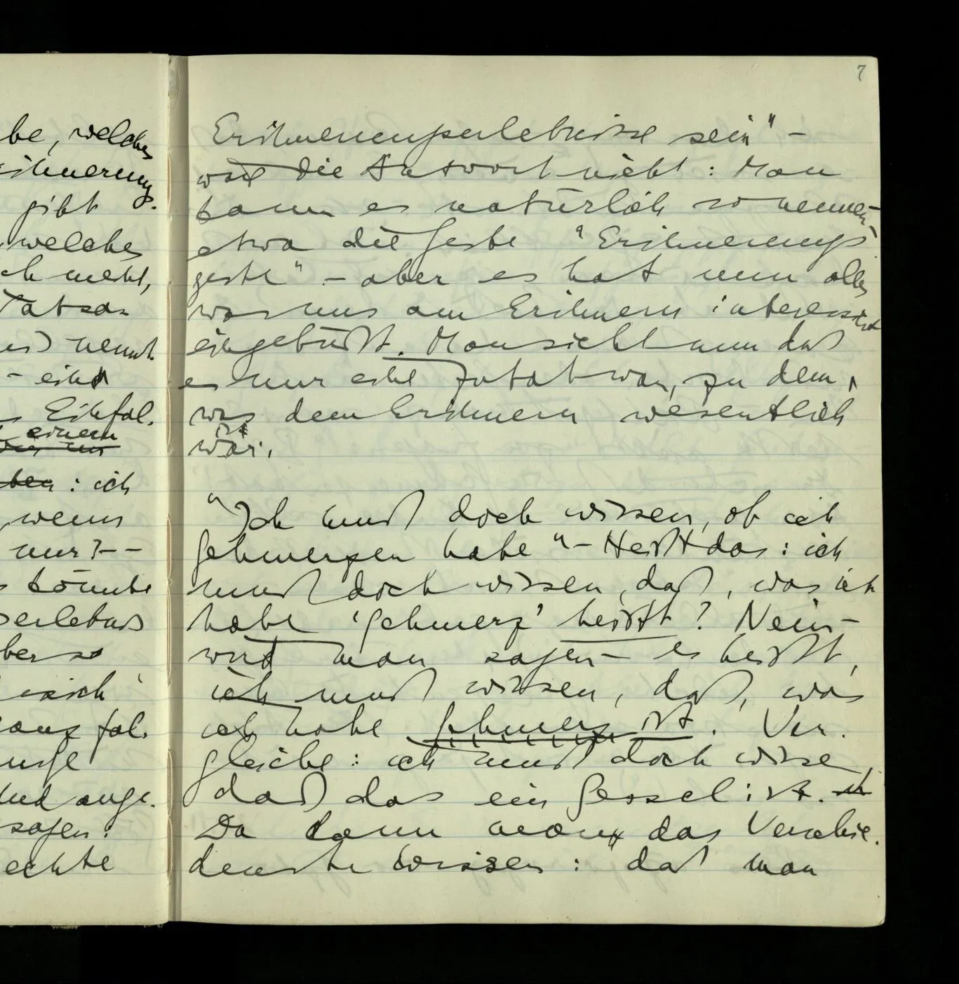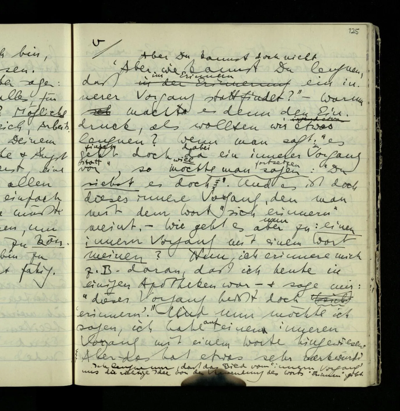 Unter Erinnerungserlebnis stellt man sich vor allem vor: Erinnerungsbild. Nun gibt es natürlich Erinnerungsbilder, – ich kann mir leicht welche vor die Seele rufen. Aber wie rufe ich es mir vor die Seele? Und wenn ich es nun fixiere, ist es die Erinnerung? Man sagt (etwa): ich sehe mich mit einem Freund da & da spazieren gehen. Aber – wie weiß ich daß ich’s bin & mein Freund. Ist das Portrait so gut getroffen? Natürlich nicht. Aber ich sage, daß ich’s bin mit meinem Freund. Ich mache diesen Übergang vom Bild zu Worten, oder von diesem Bild zu gewissen andern; etc..