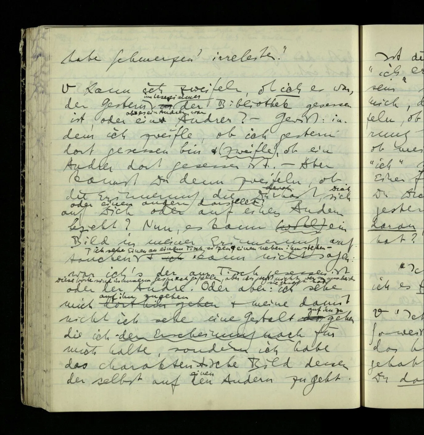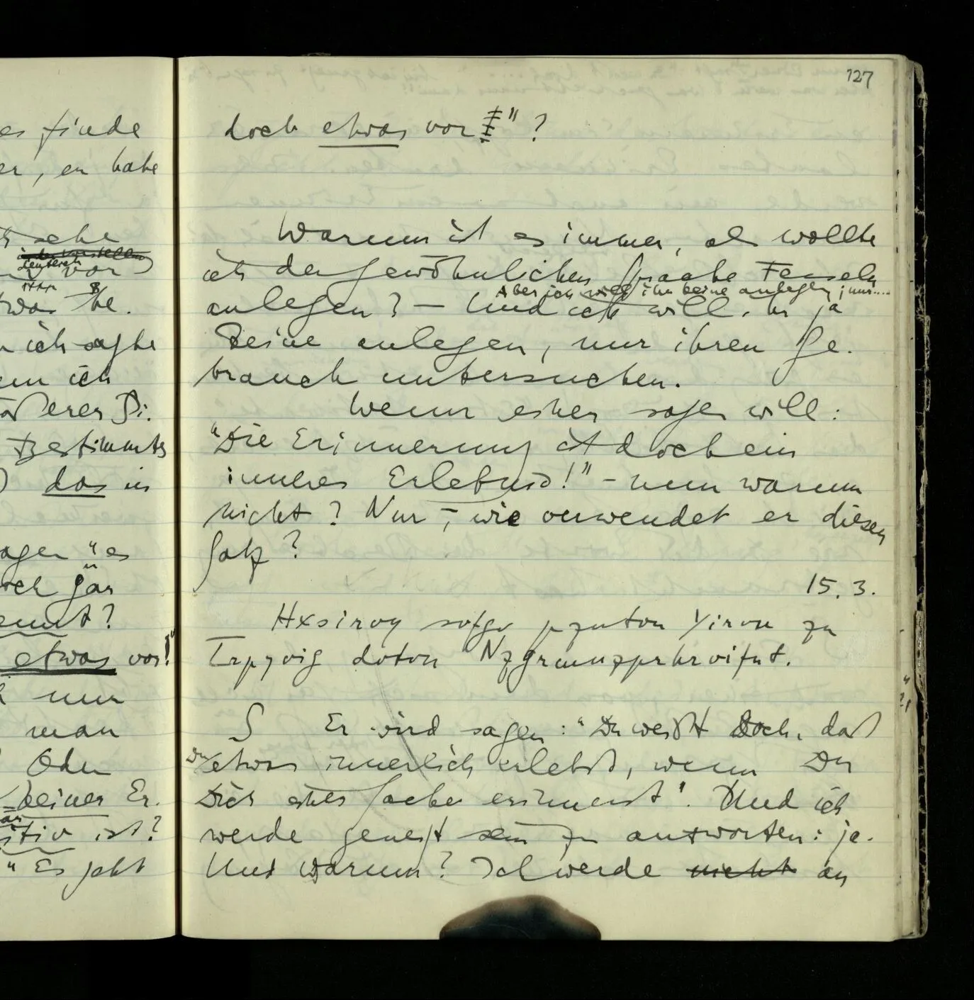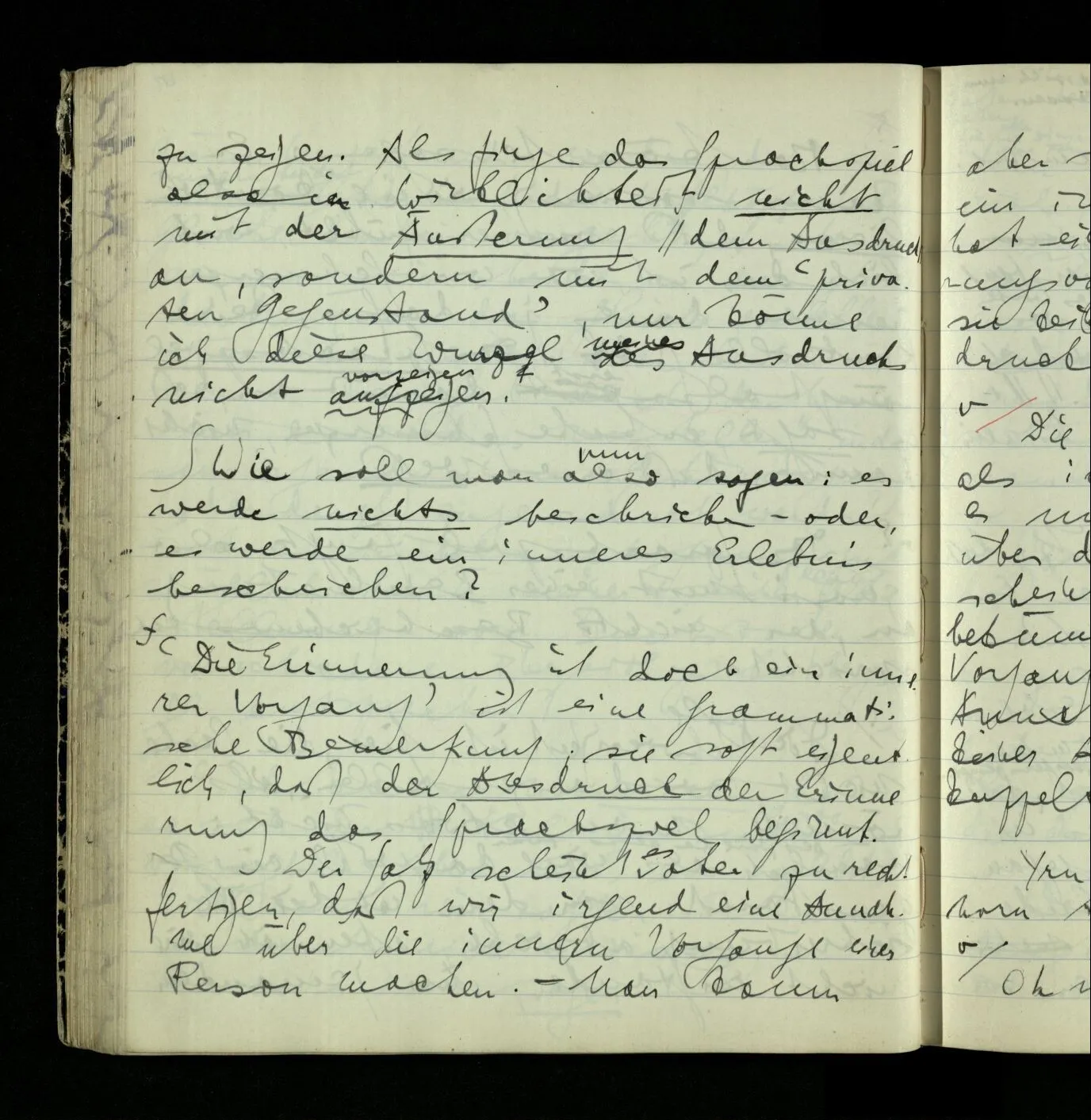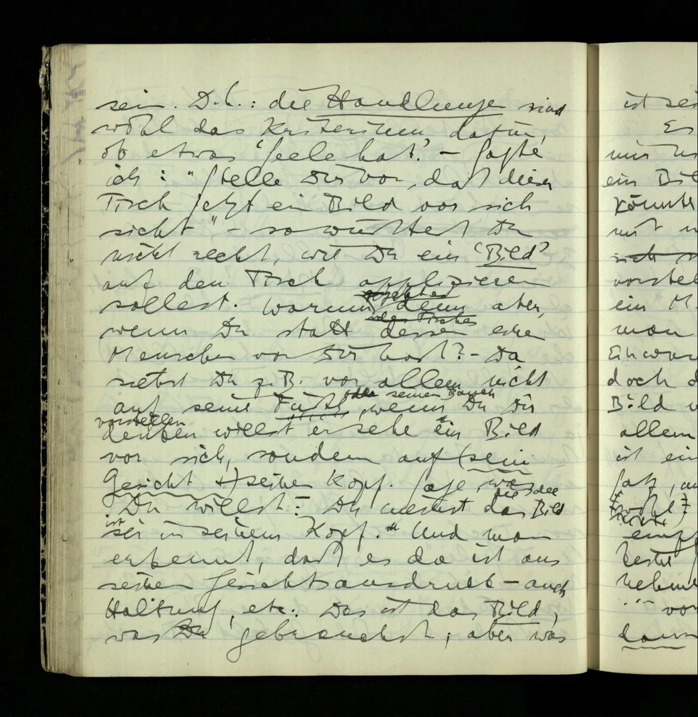 Unter Erinnerungserlebnis stellt man sich vor allem vor: Erinnerungsbild. Nun gibt es natürlich Erinnerungsbilder, – ich kann mir leicht welche vor die Seele rufen. Aber wie rufe ich es mir vor die Seele? Und wenn ich es nun fixiere, ist es die Erinnerung? Man sagt (etwa): ich sehe mich mit einem Freund da & da spazieren gehen. Aber – wie weiß ich daß ich’s bin & mein Freund. Ist das Portrait so gut getroffen? Natürlich nicht. Aber ich sage, daß ich’s bin mit meinem Freund. Ich mache diesen Übergang vom Bild zu Worten, oder von diesem Bild zu gewissen andern; etc..