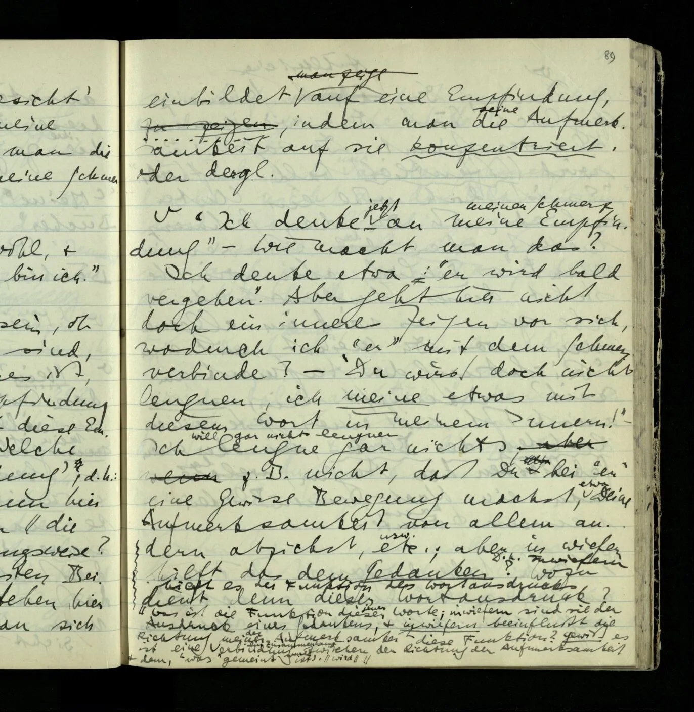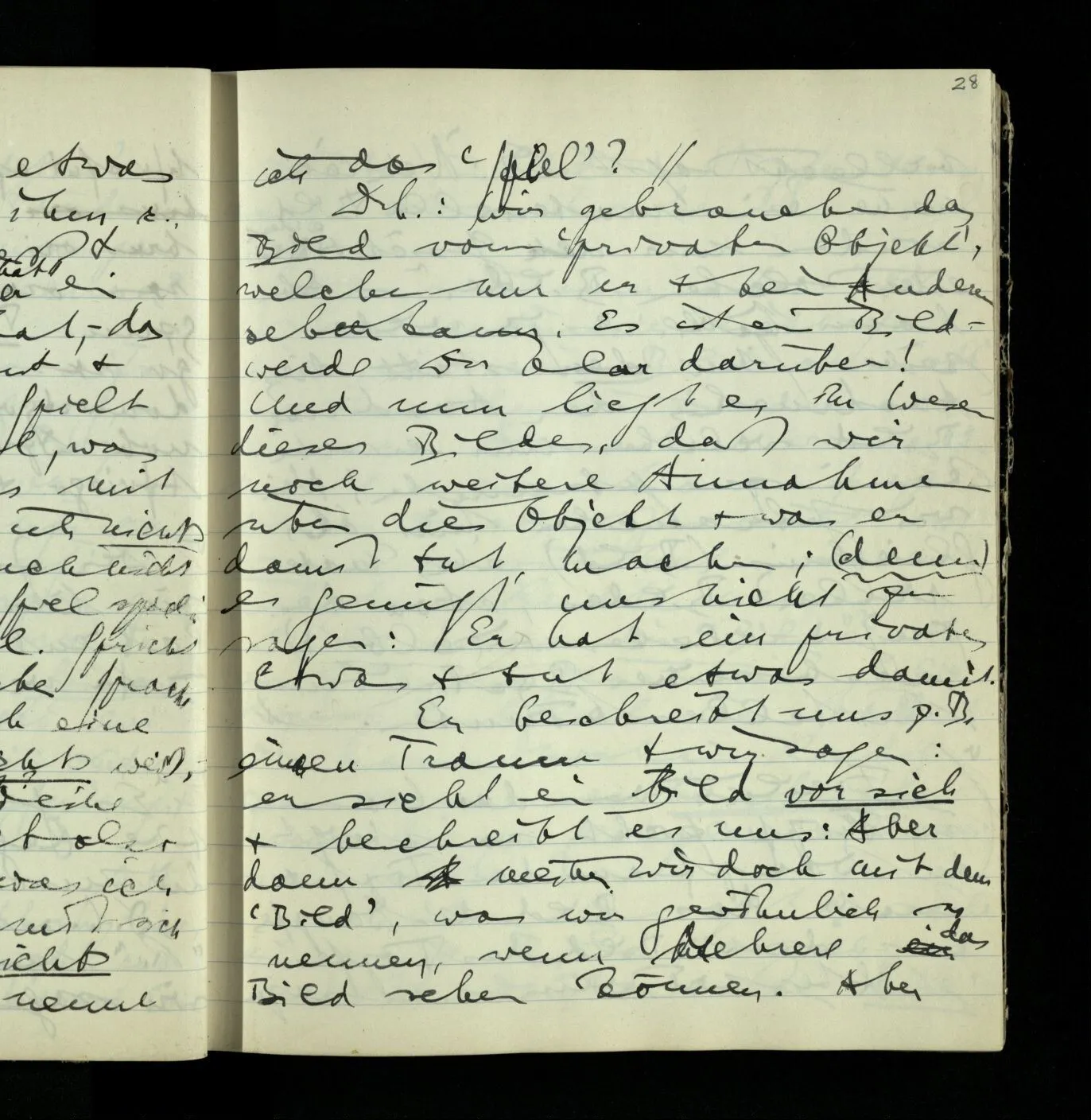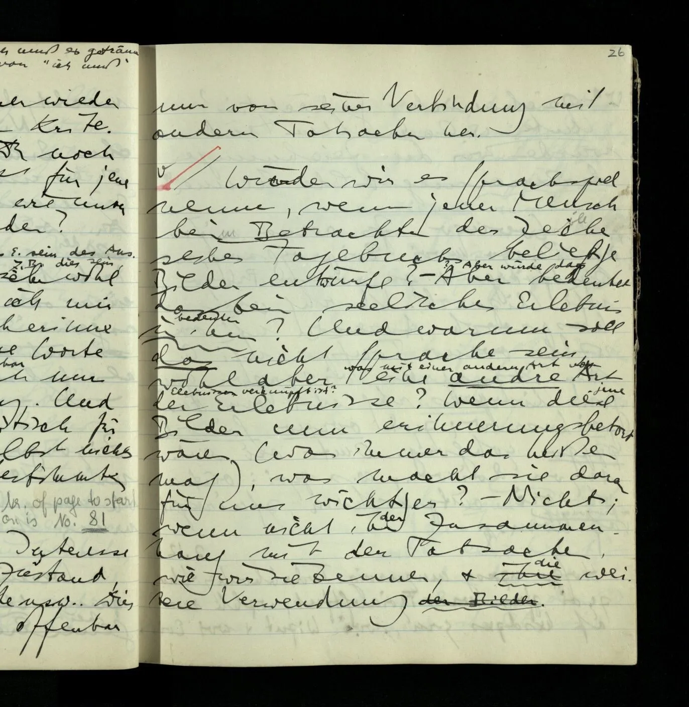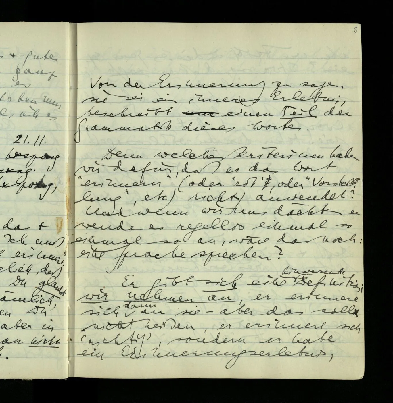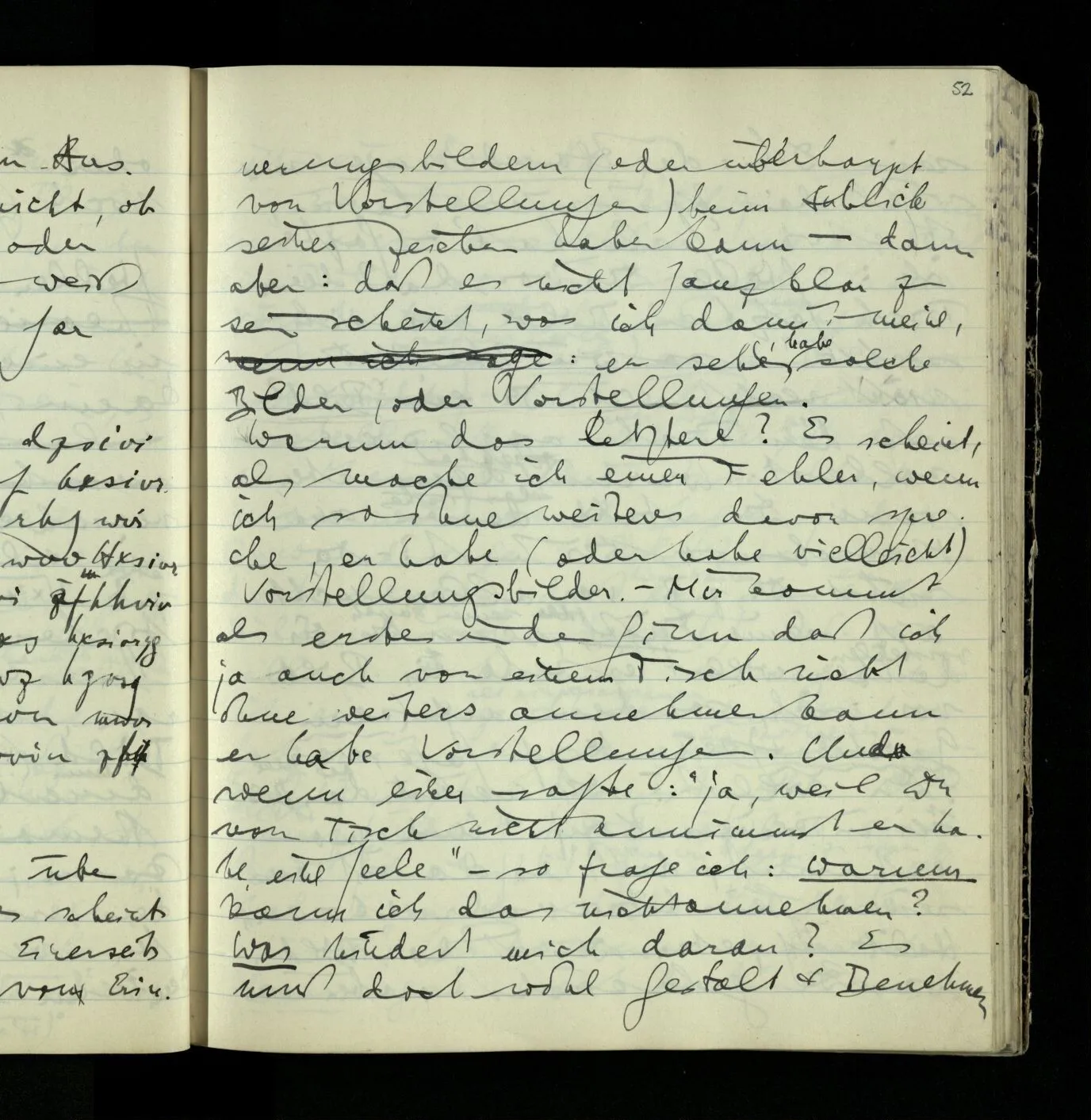 Unter Erinnerungserlebnis stellt man sich vor allem vor: Erinnerungsbild. Nun gibt es natürlich Erinnerungsbilder, – ich kann mir leicht welche vor die Seele rufen. Aber wie rufe ich es mir vor die Seele? Und wenn ich es nun fixiere, ist es die Erinnerung? Man sagt (etwa): ich sehe mich mit einem Freund da & da spazieren gehen. Aber – wie weiß ich daß ich’s bin & mein Freund. Ist das Portrait so gut getroffen? Natürlich nicht. Aber ich sage, daß ich’s bin mit meinem Freund. Ich mache diesen Übergang vom Bild zu Worten, oder von diesem Bild zu gewissen andern; etc..