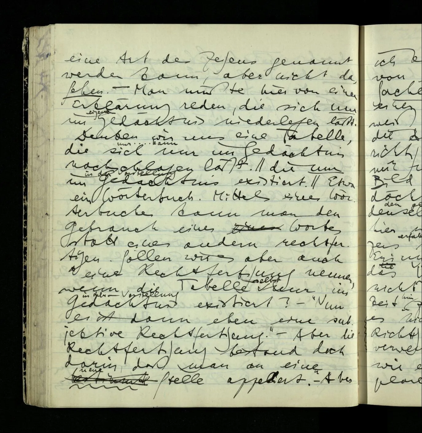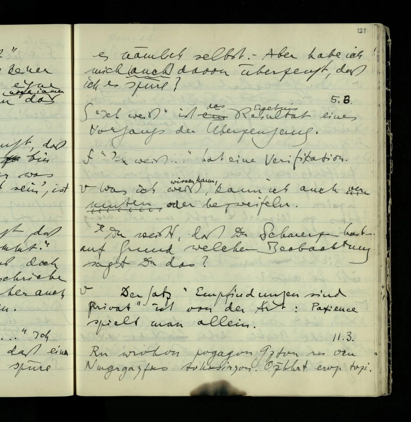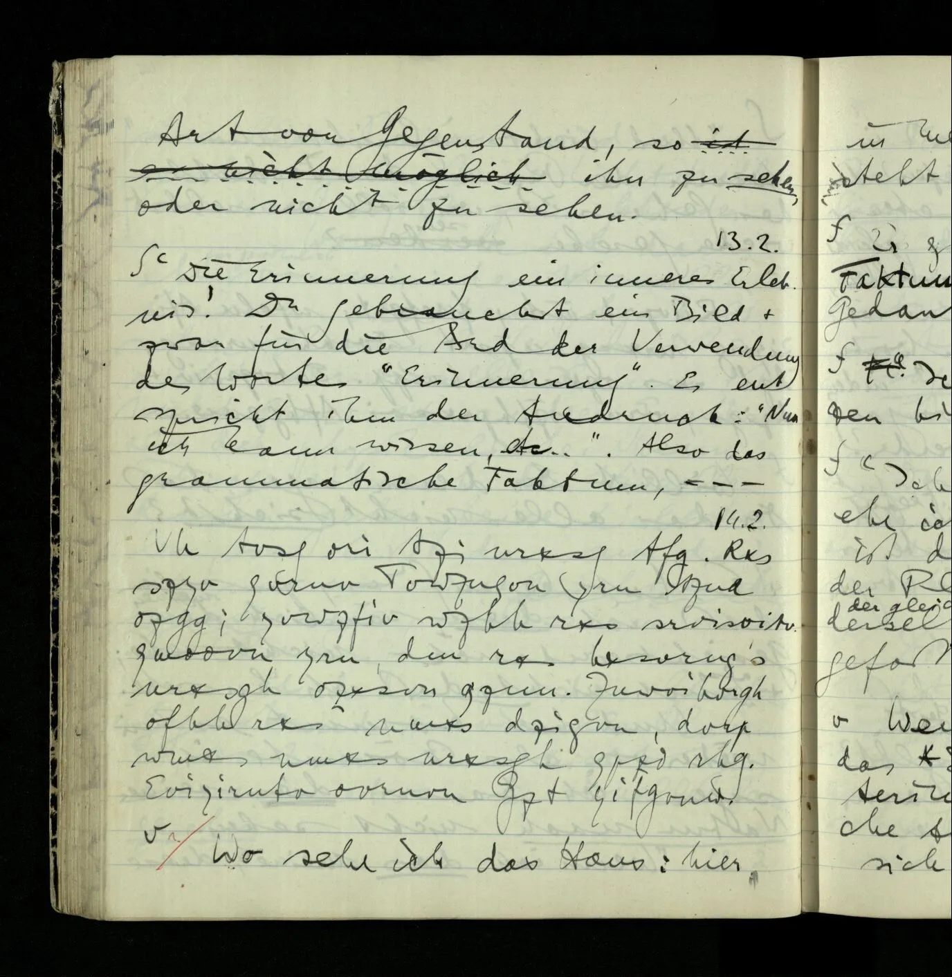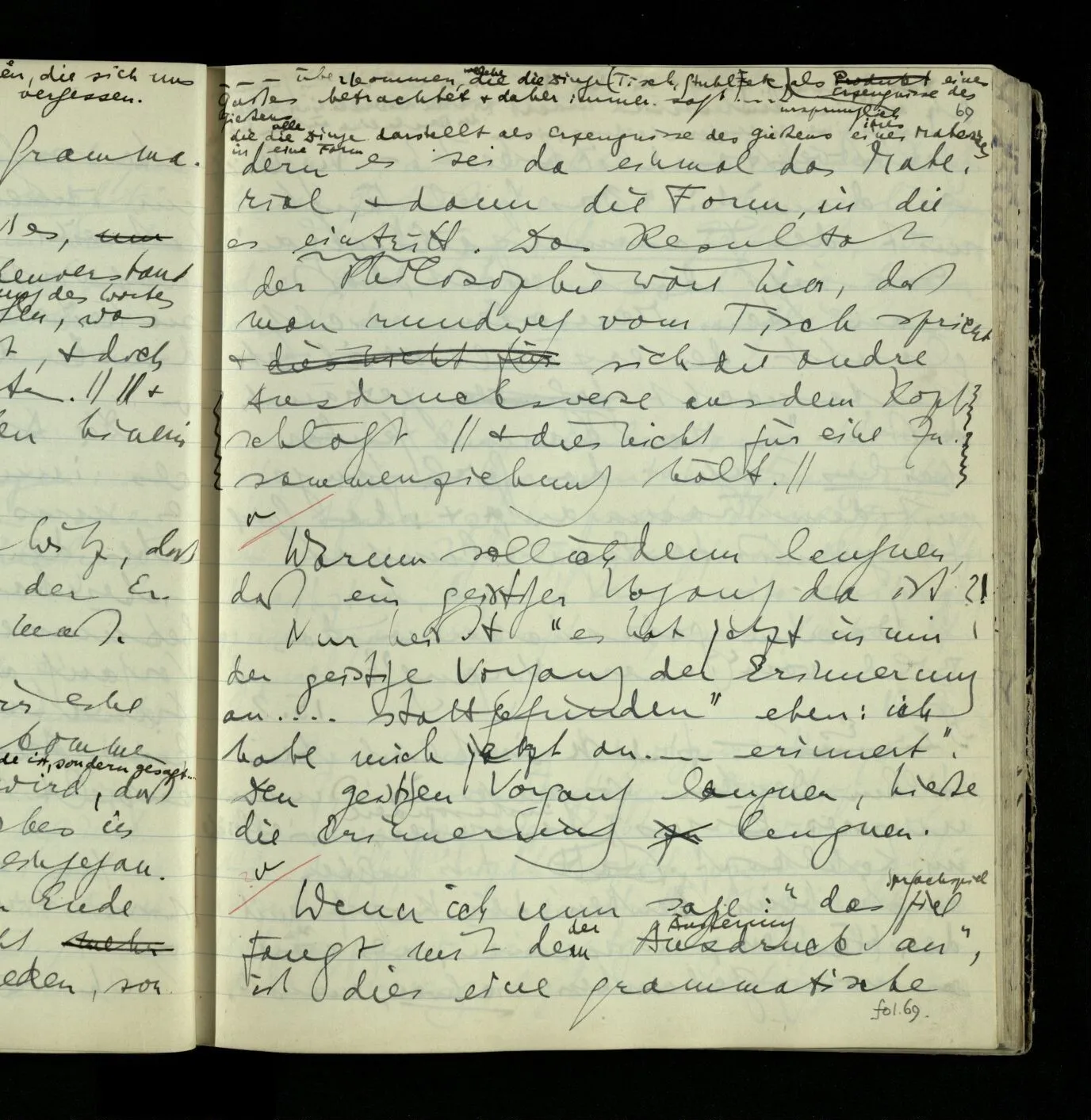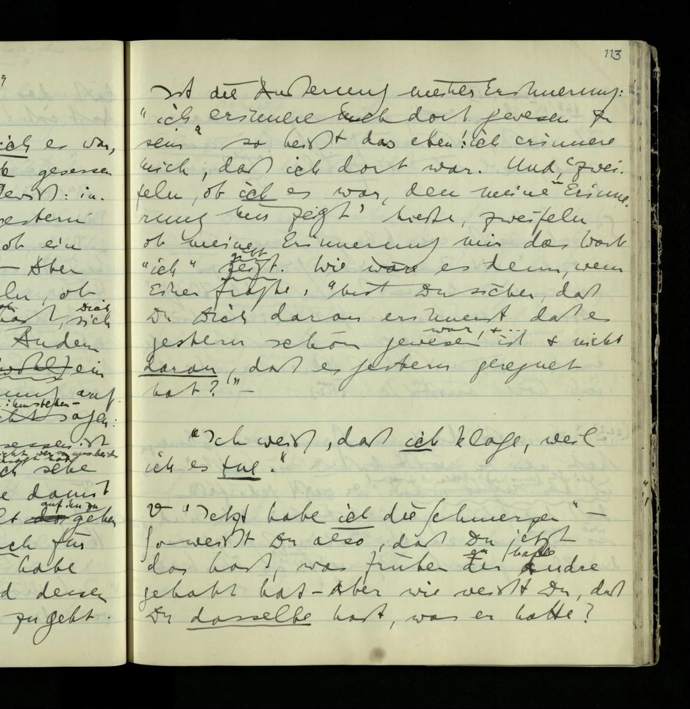 Unter Erinnerungserlebnis stellt man sich vor allem vor: Erinnerungsbild. Nun gibt es natürlich Erinnerungsbilder, – ich kann mir leicht welche vor die Seele rufen. Aber wie rufe ich es mir vor die Seele? Und wenn ich es nun fixiere, ist es die Erinnerung? Man sagt (etwa): ich sehe mich mit einem Freund da & da spazieren gehen. Aber – wie weiß ich daß ich’s bin & mein Freund. Ist das Portrait so gut getroffen? Natürlich nicht. Aber ich sage, daß ich’s bin mit meinem Freund. Ich mache diesen Übergang vom Bild zu Worten, oder von diesem Bild zu gewissen andern; etc..
