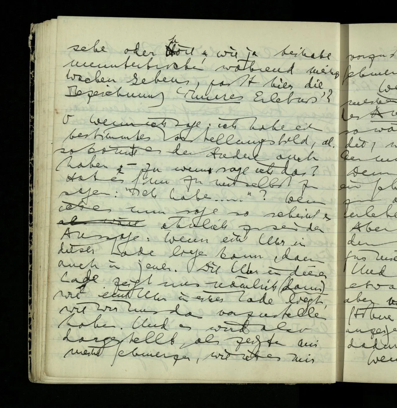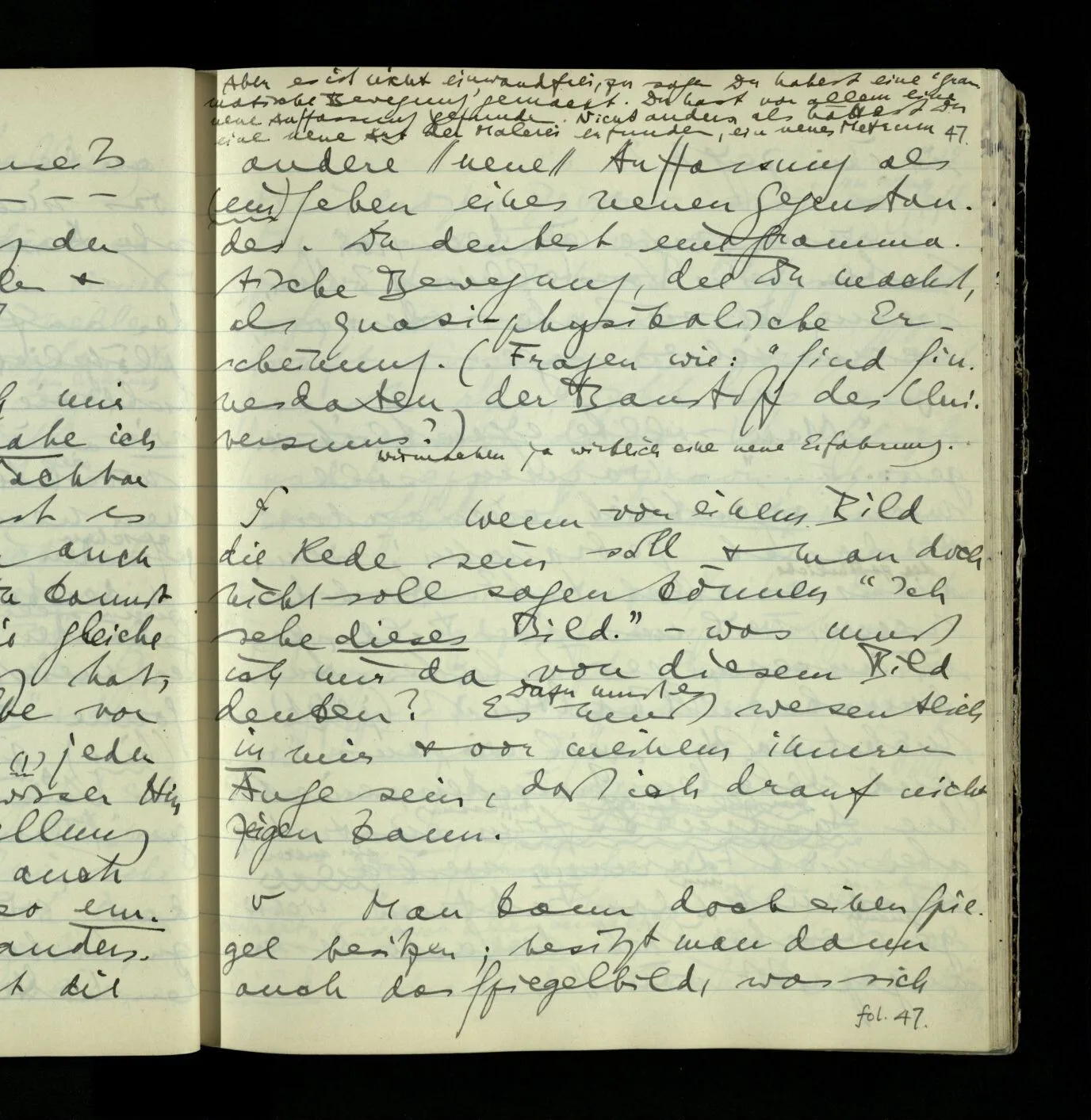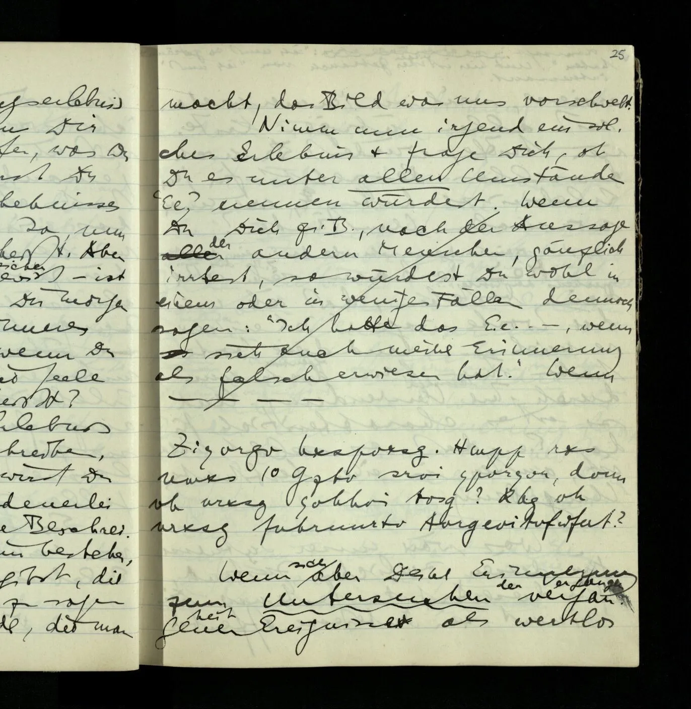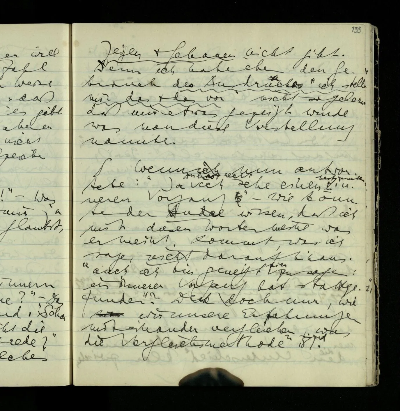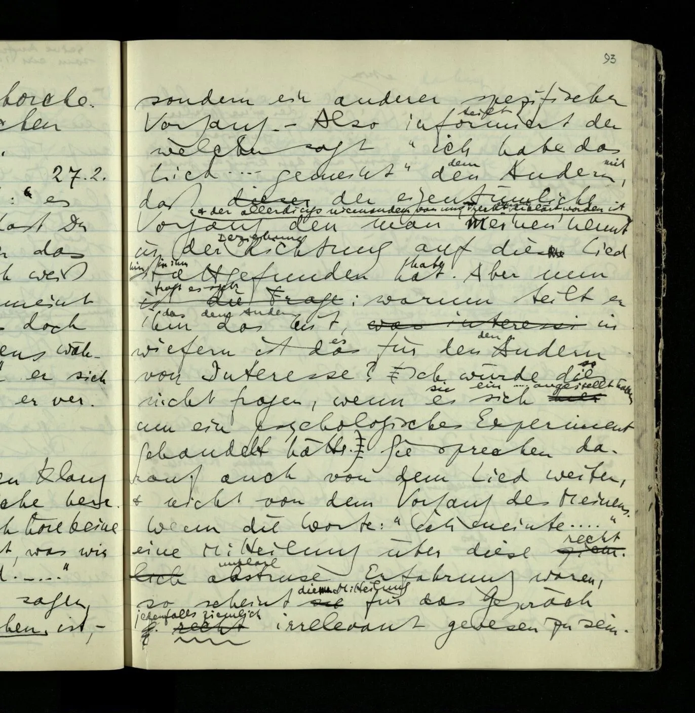 Unter Erinnerungserlebnis stellt man sich vor allem vor: Erinnerungsbild. Nun gibt es natürlich Erinnerungsbilder, – ich kann mir leicht welche vor die Seele rufen. Aber wie rufe ich es mir vor die Seele? Und wenn ich es nun fixiere, ist es die Erinnerung? Man sagt (etwa): ich sehe mich mit einem Freund da & da spazieren gehen. Aber – wie weiß ich daß ich’s bin & mein Freund. Ist das Portrait so gut getroffen? Natürlich nicht. Aber ich sage, daß ich’s bin mit meinem Freund. Ich mache diesen Übergang vom Bild zu Worten, oder von diesem Bild zu gewissen andern; etc..