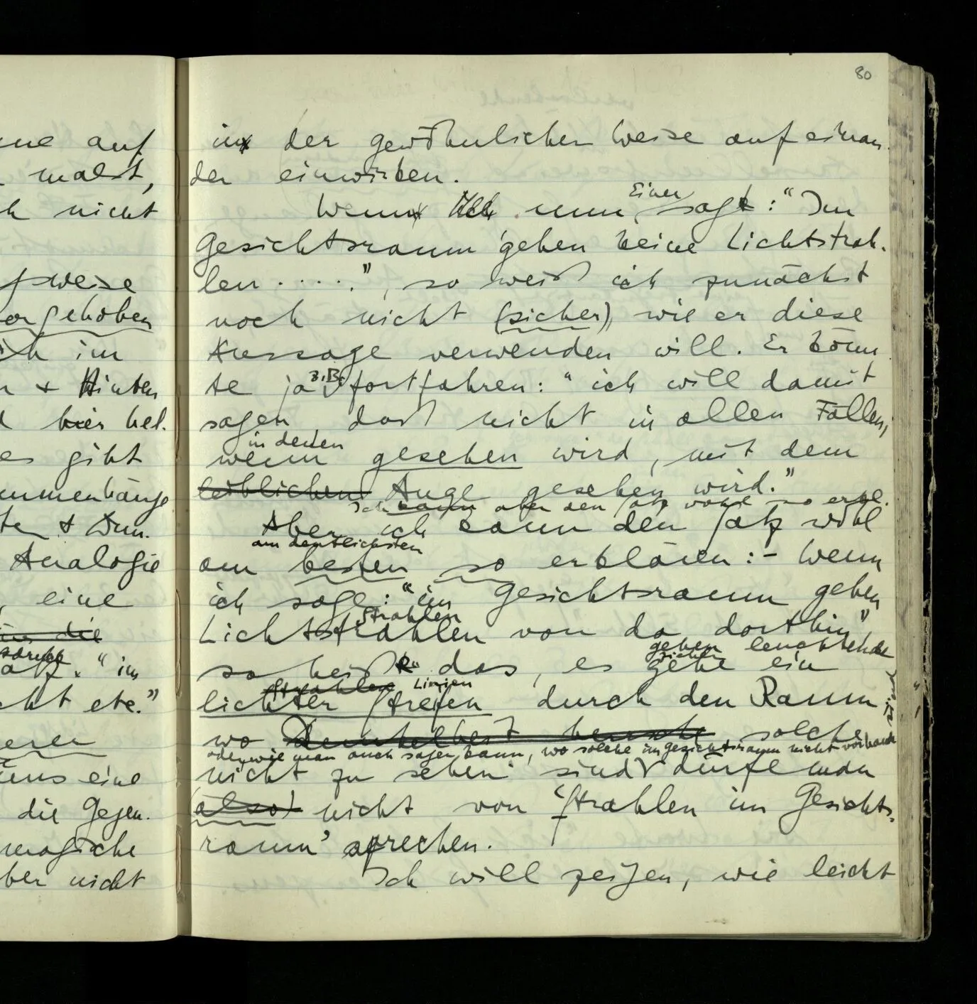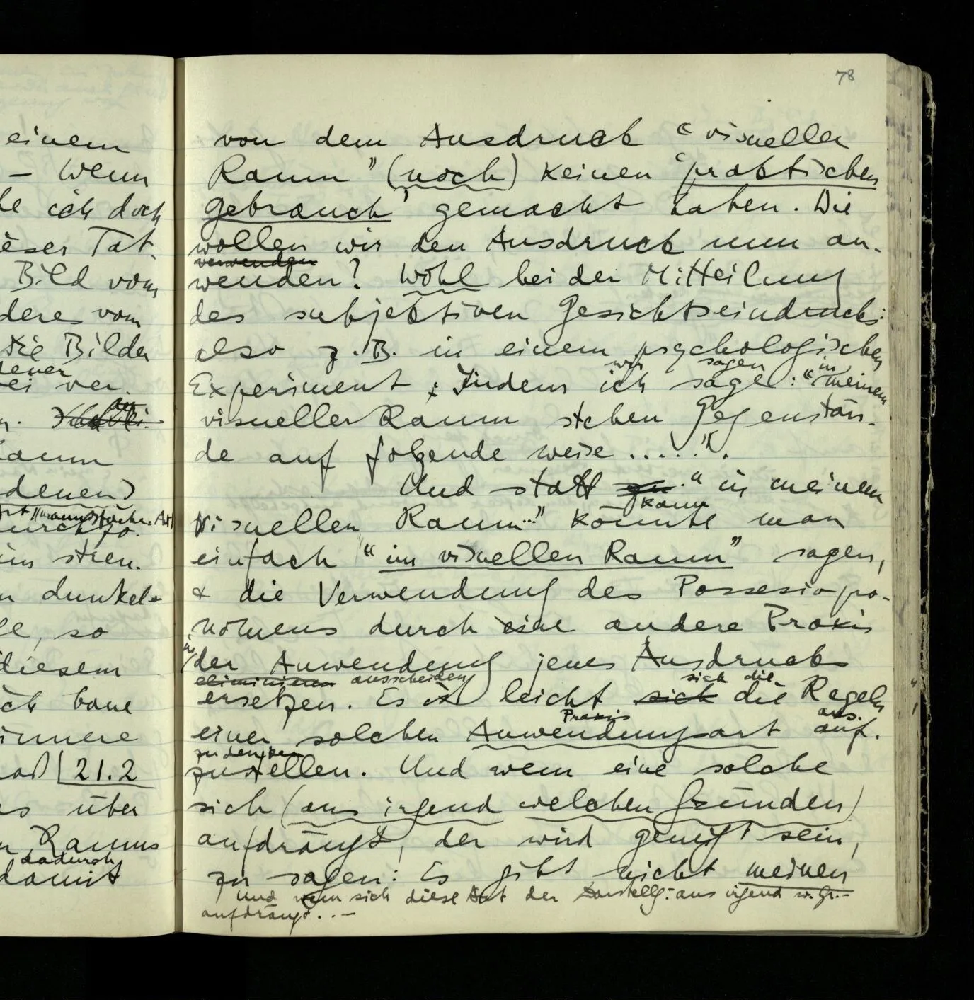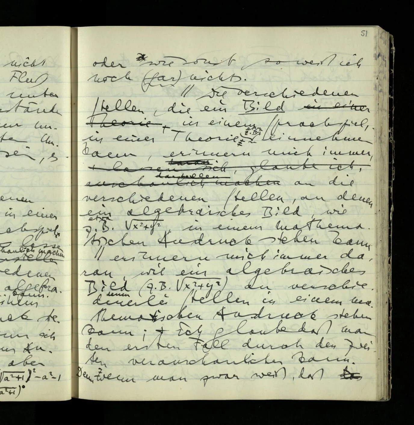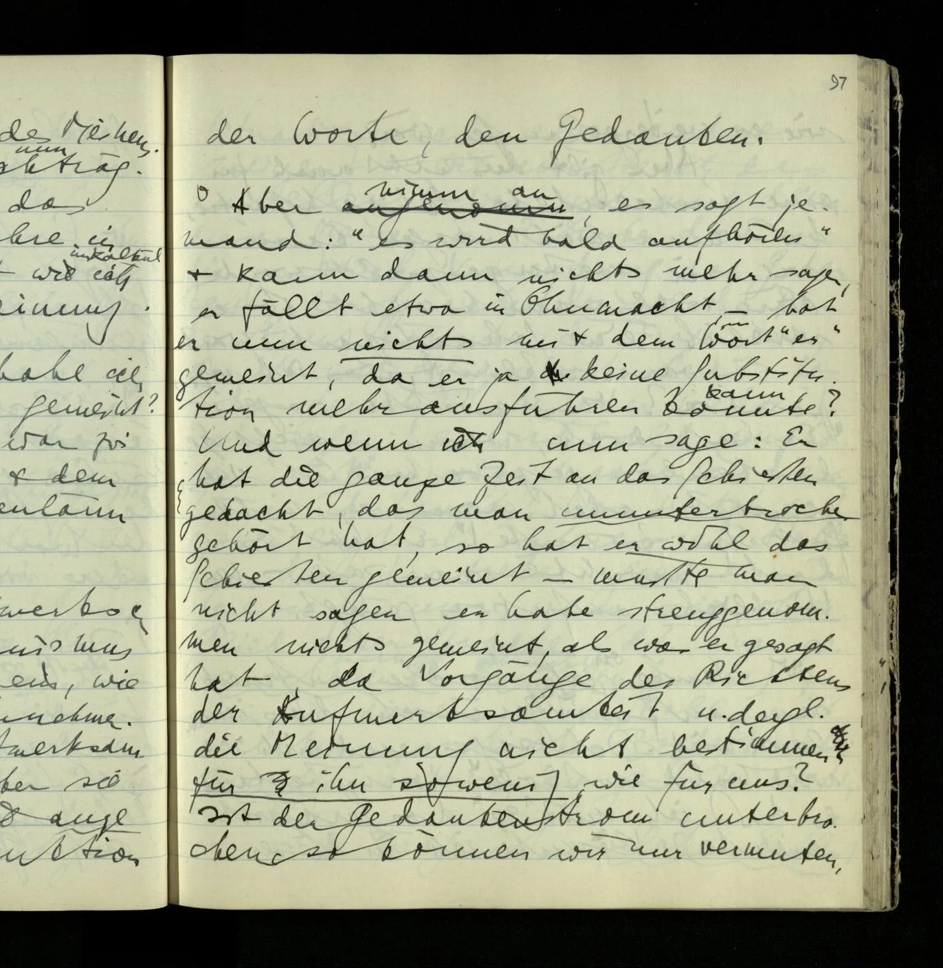 Unter Erinnerungserlebnis stellt man sich vor allem vor: Erinnerungsbild. Nun gibt es natürlich Erinnerungsbilder, – ich kann mir leicht welche vor die Seele rufen. Aber wie rufe ich es mir vor die Seele? Und wenn ich es nun fixiere, ist es die Erinnerung? Man sagt (etwa): ich sehe mich mit einem Freund da & da spazieren gehen. Aber – wie weiß ich daß ich’s bin & mein Freund. Ist das Portrait so gut getroffen? Natürlich nicht. Aber ich sage, daß ich’s bin mit meinem Freund. Ich mache diesen Übergang vom Bild zu Worten, oder von diesem Bild zu gewissen andern; etc..