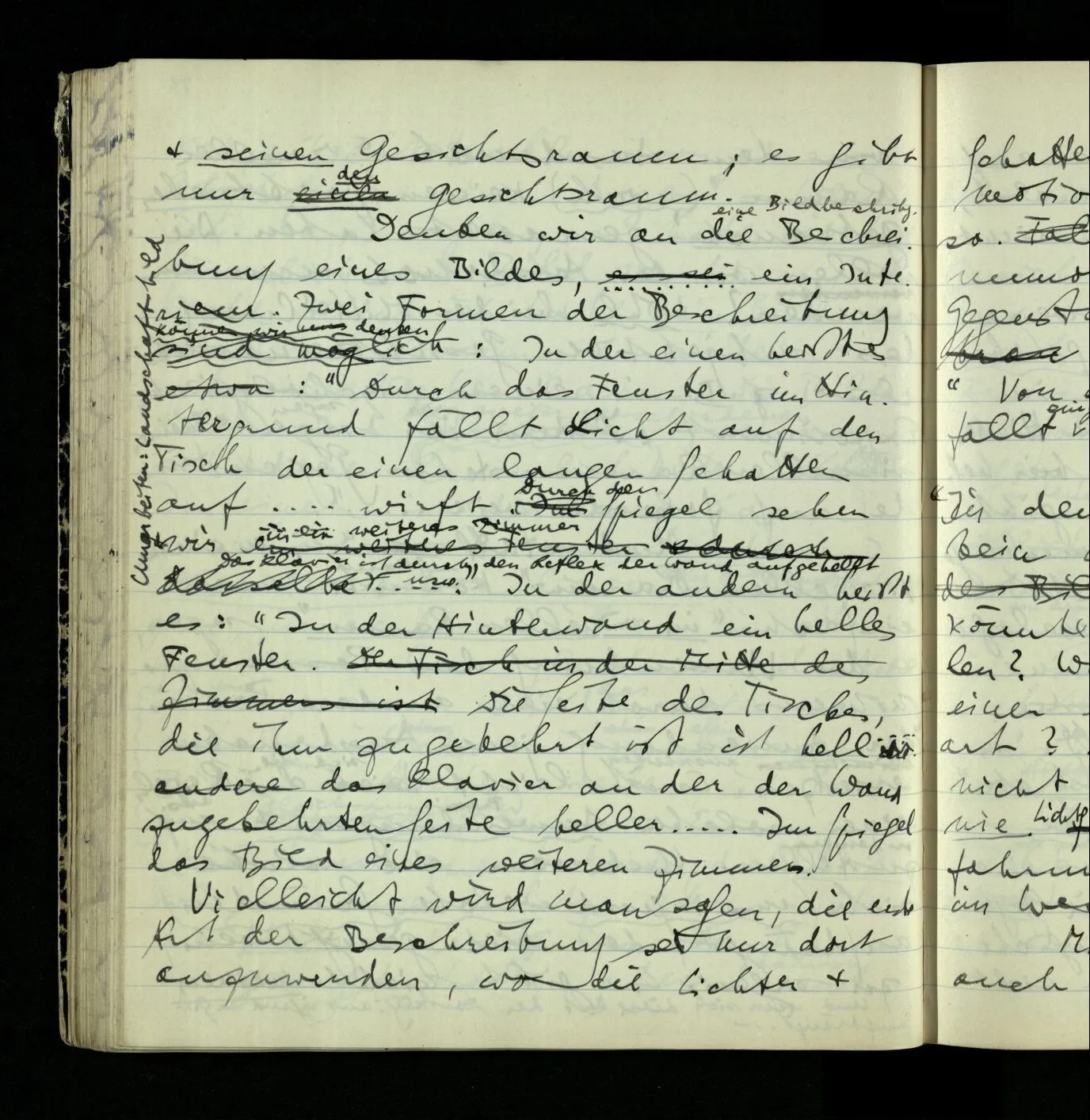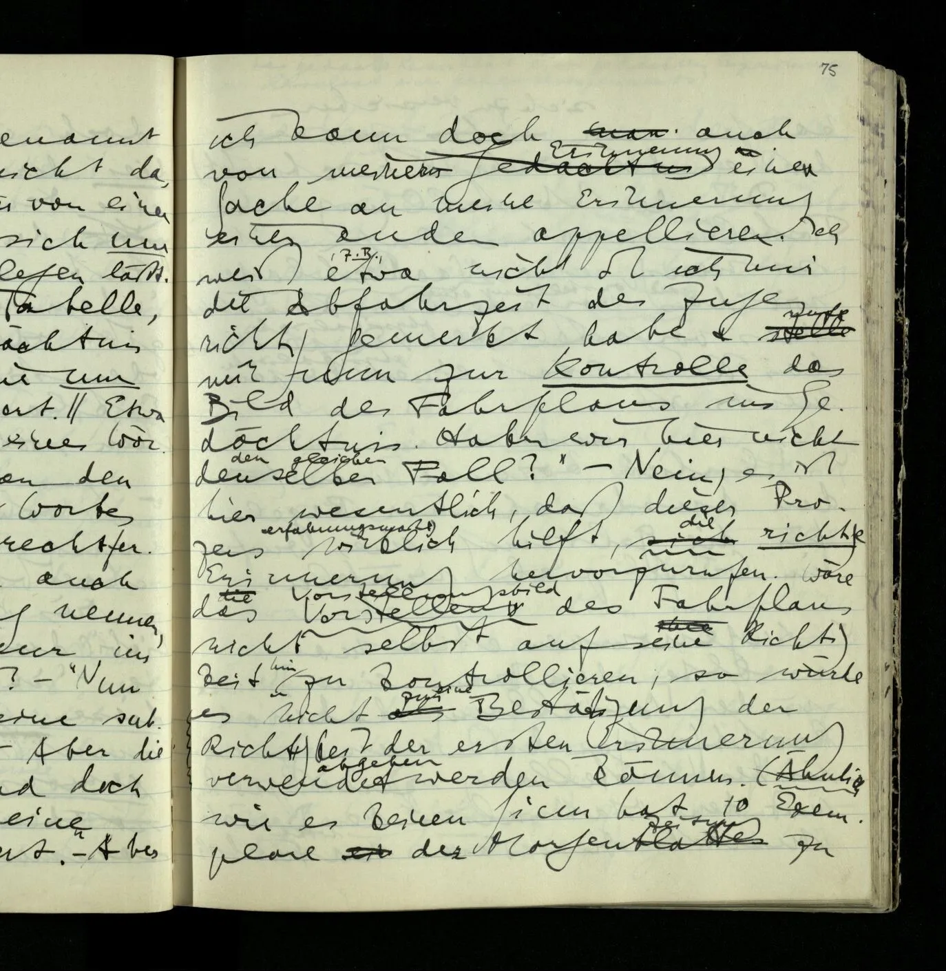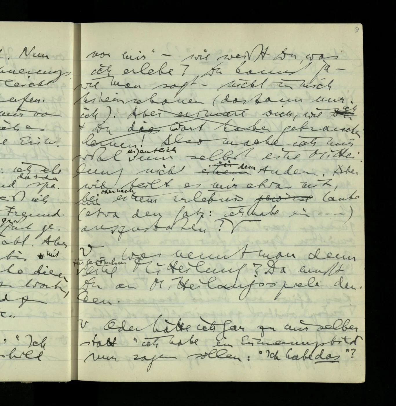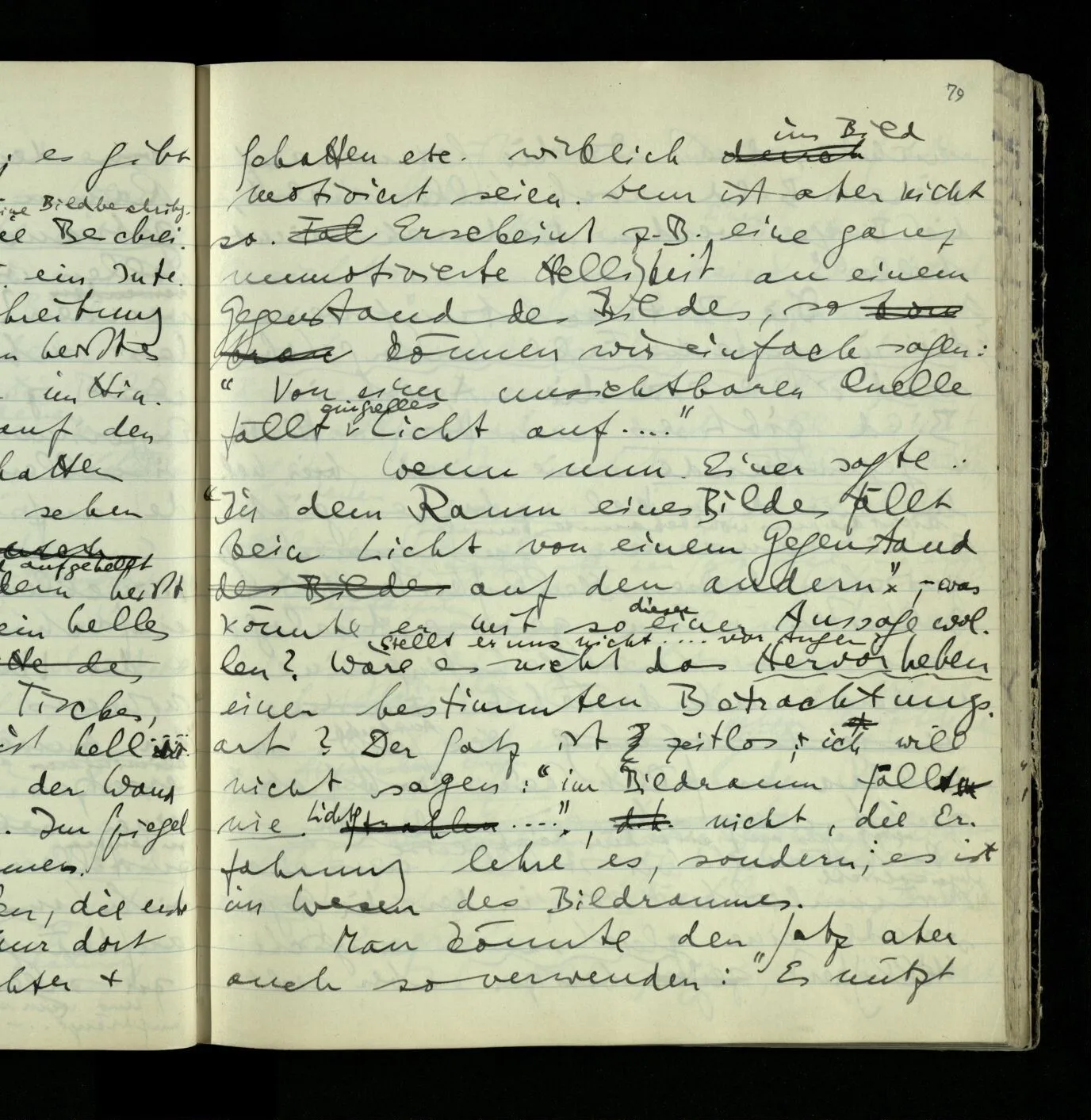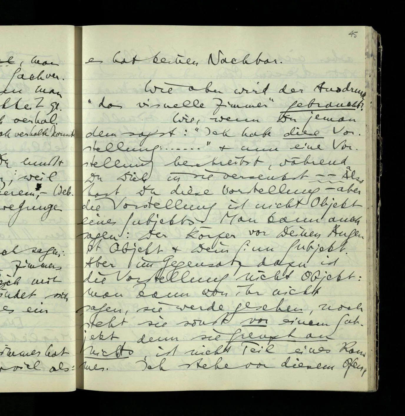 Unter Erinnerungserlebnis stellt man sich vor allem vor: Erinnerungsbild. Nun gibt es natürlich Erinnerungsbilder, – ich kann mir leicht welche vor die Seele rufen. Aber wie rufe ich es mir vor die Seele? Und wenn ich es nun fixiere, ist es die Erinnerung? Man sagt (etwa): ich sehe mich mit einem Freund da & da spazieren gehen. Aber – wie weiß ich daß ich’s bin & mein Freund. Ist das Portrait so gut getroffen? Natürlich nicht. Aber ich sage, daß ich’s bin mit meinem Freund. Ich mache diesen Übergang vom Bild zu Worten, oder von diesem Bild zu gewissen andern; etc..