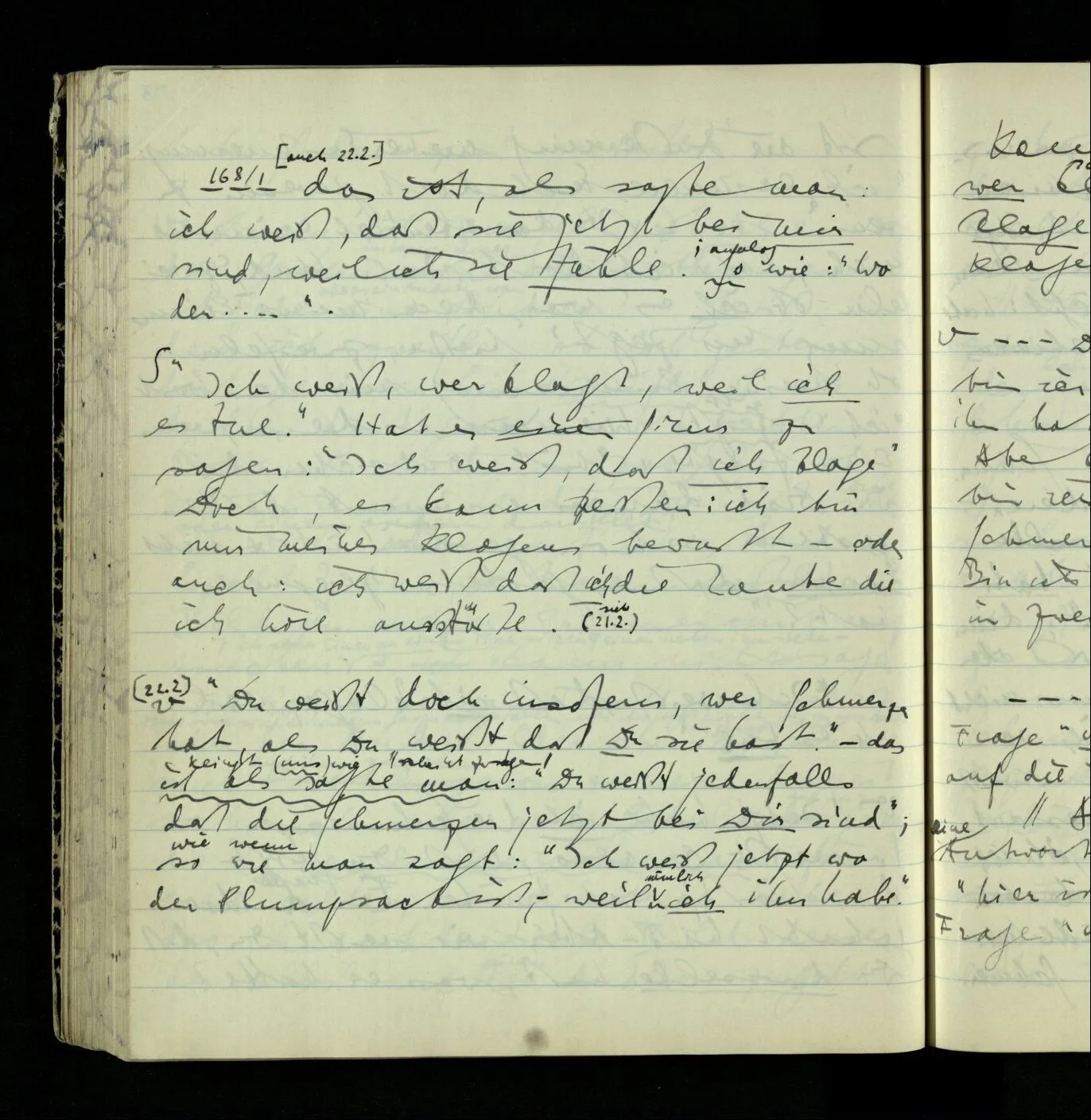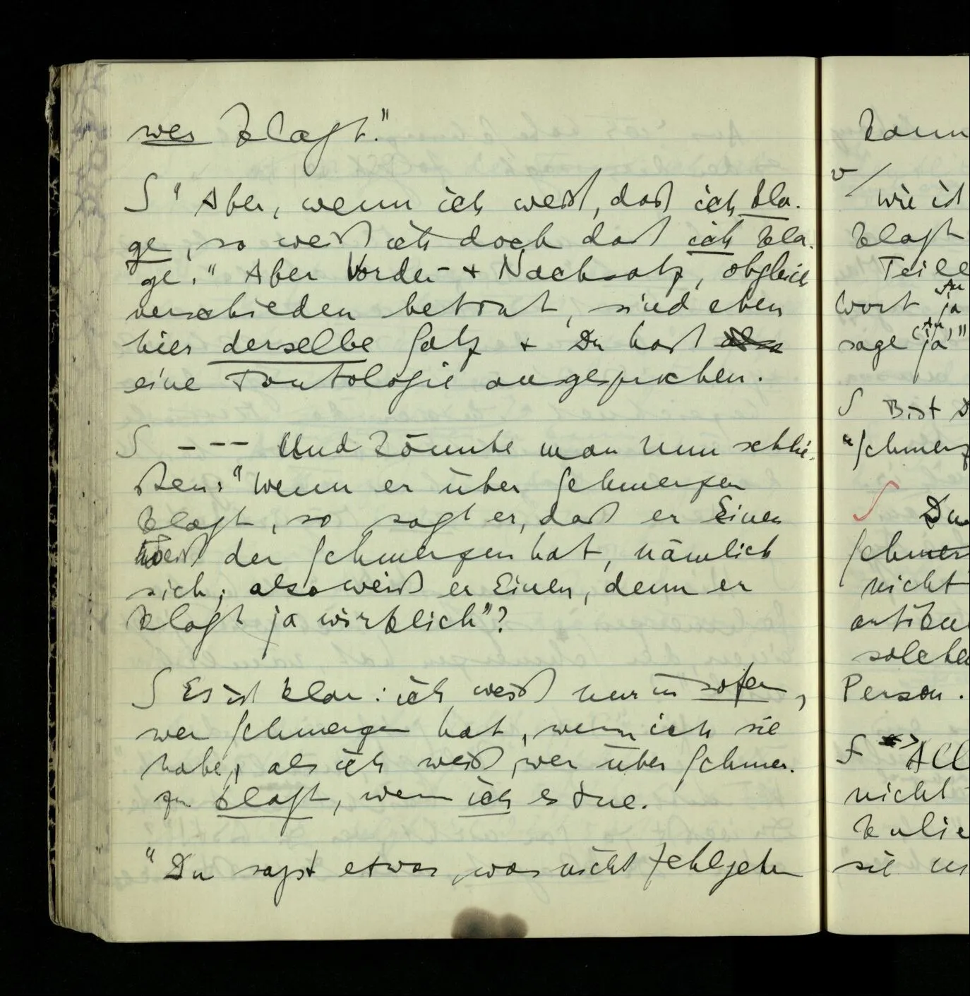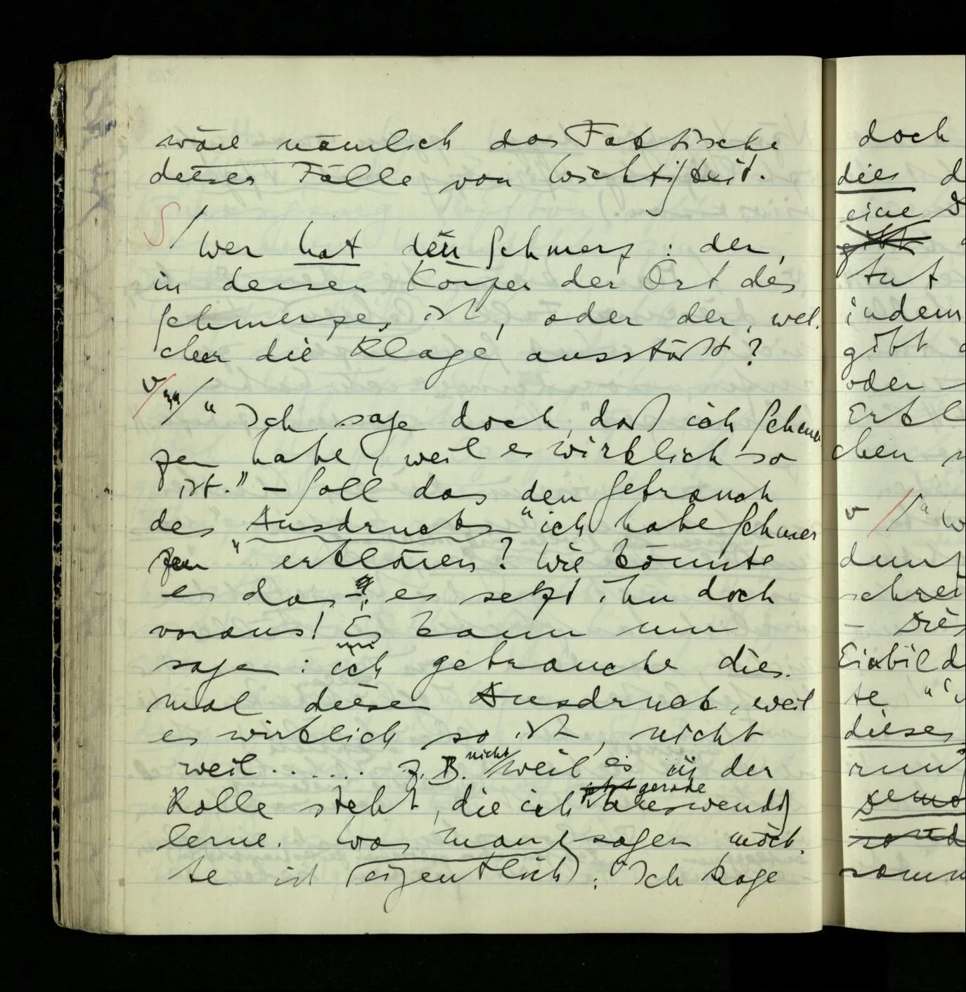 “Ich muß doch wissen, ob ich Schmerzen habe” – Heißt das: ich muß doch wissen, daß, was ich habe ‘Schmerz’ heißt? Nein – wird man sagen – es heißt, ich muß wissen, daß, was ich habe Schmerz ist. Vergleiche: ich muß doch wissen, daß das ein Sessel ist. Da kann man das Verschiedenste wissen: daß man sich darauf setzen kann, daß es sich zu einem Sessel aufklappen läßt etc. etc.. Du meinst eigentlich: “Ich muß doch wissen, was ich habe”. Wohl – aber was hast Du denn? Du kannst doch darauf nur mit Worten oder Gesten antworten. – Richtig ist nur zu sagen: Es heißt nichts zu fragen: “Bist Du sicher daß Du Schmerzen hast?” Aber nicht weil der Andre selbstverständlich sicher ist. Die Redeweise: “Ich muß doch wissen – – –” wird allerdings gebraucht (daher der Wirrwarr) aber überlege, bei welchen Gelegenheiten man sie etwa verwendet. (Der Arzt sagt: “Aber es tut ja gar nicht so weh!”)