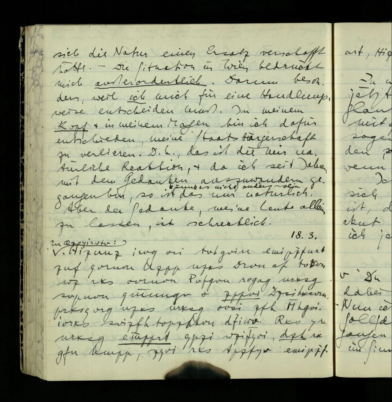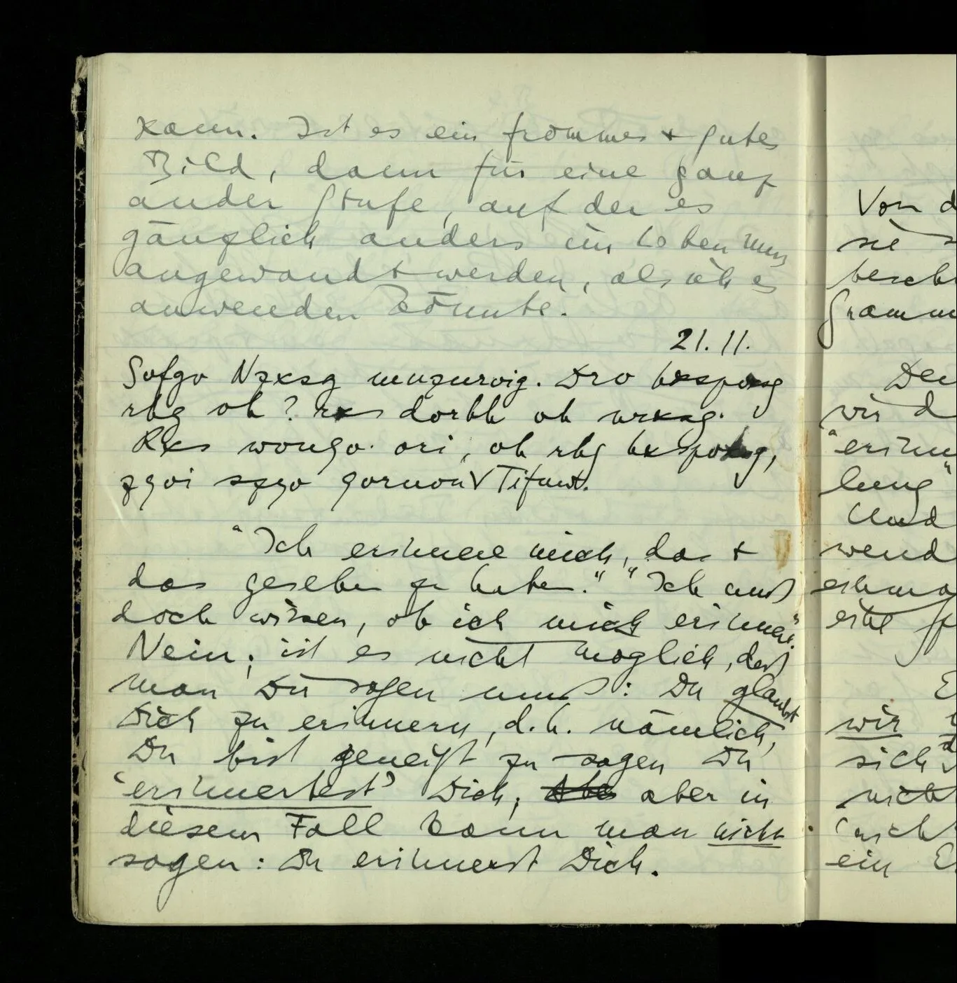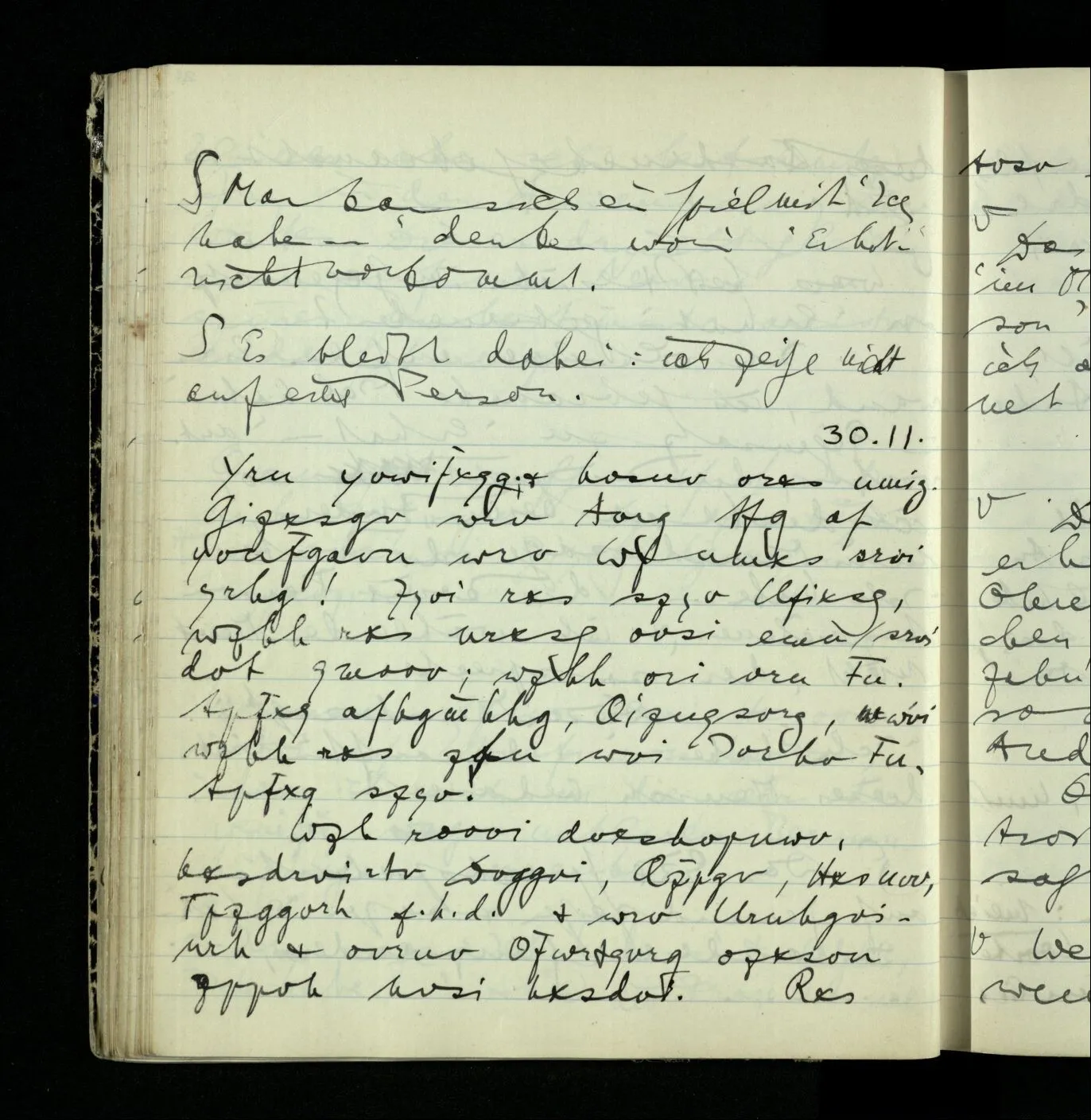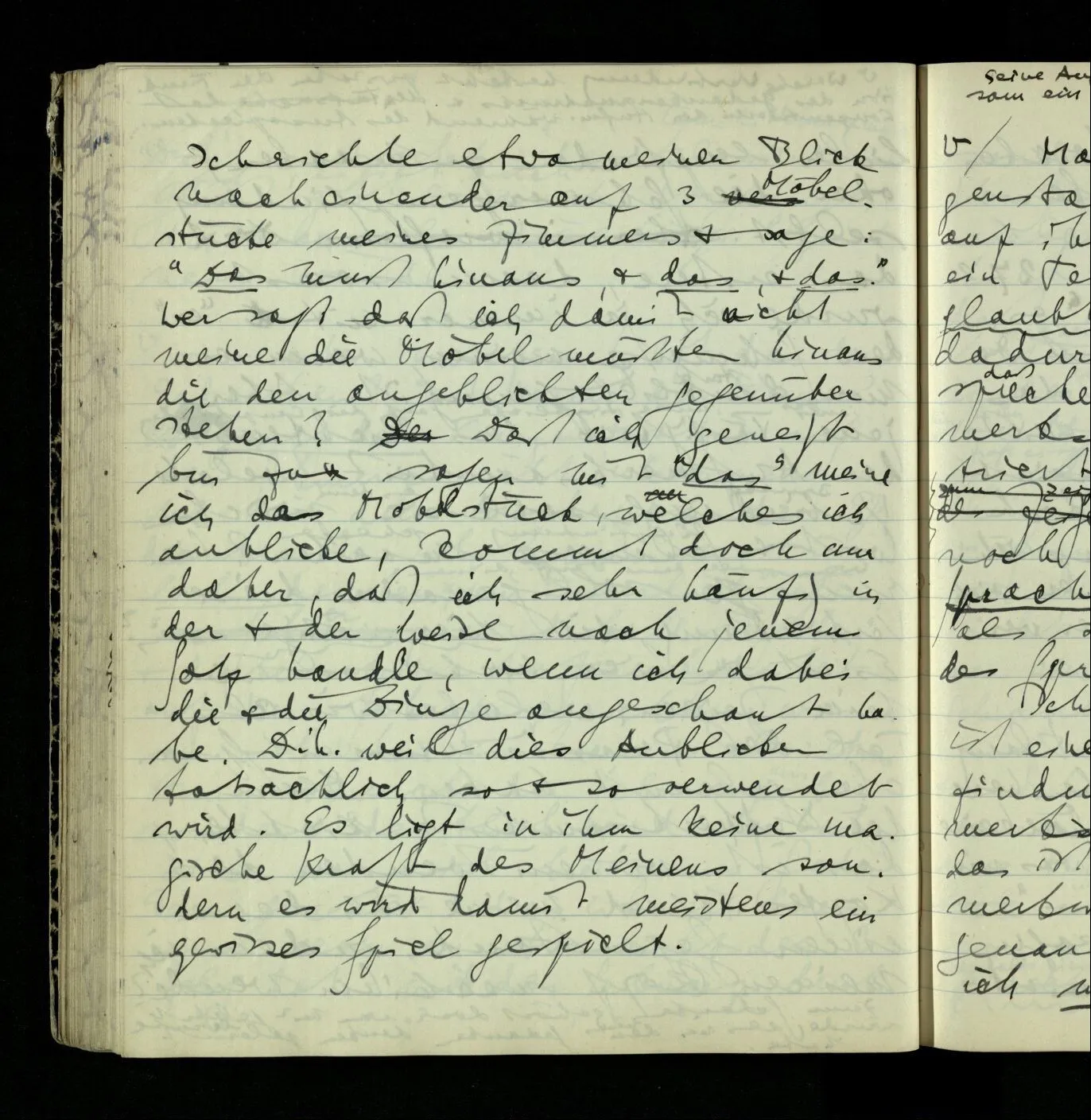 20.11.1937 Bin durch die Sache mit Anna Rebni beunruhigt. (Bei den Eintragungen in das Tagebuch denke ich oft, ob das auch ein gutes Licht auf mich werfen wird.) Bin, auf einen Einfall hin, zu Anna Rebni gegangen& habe ihr einige Kuchen mitgebracht. Ich sagte ihr, daß ich Friede mit ihr haben wolle; & noch einiges Andre. Wir gingen – gut auseinander. – Fühle mich nicht zur Arbeit fähig. Meine Gedanken sind in dieser Richtung wie ausgelöscht. Ob das vorübergehend ist oder auf lange Zeit – oder ganz – weiß ich nicht.