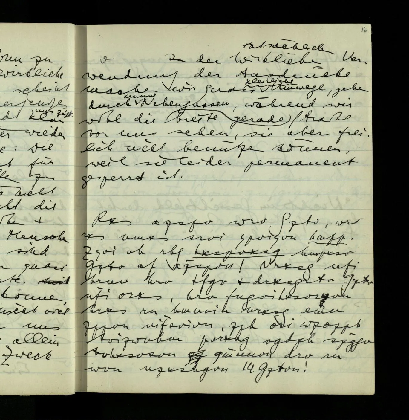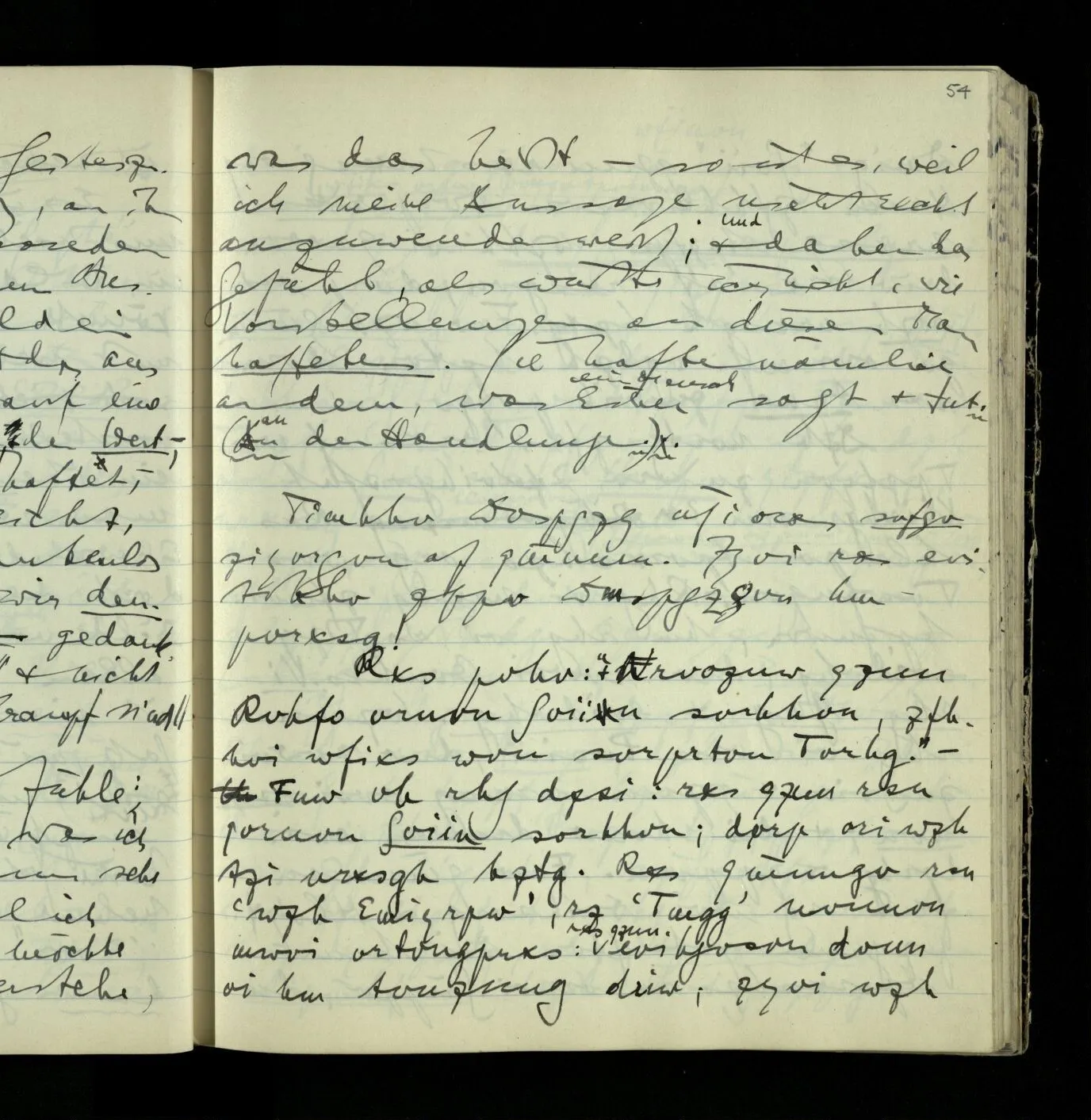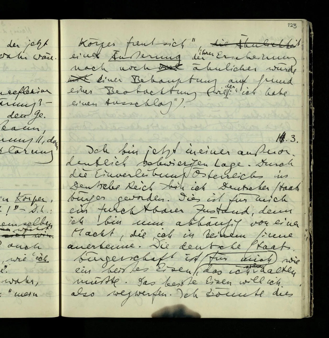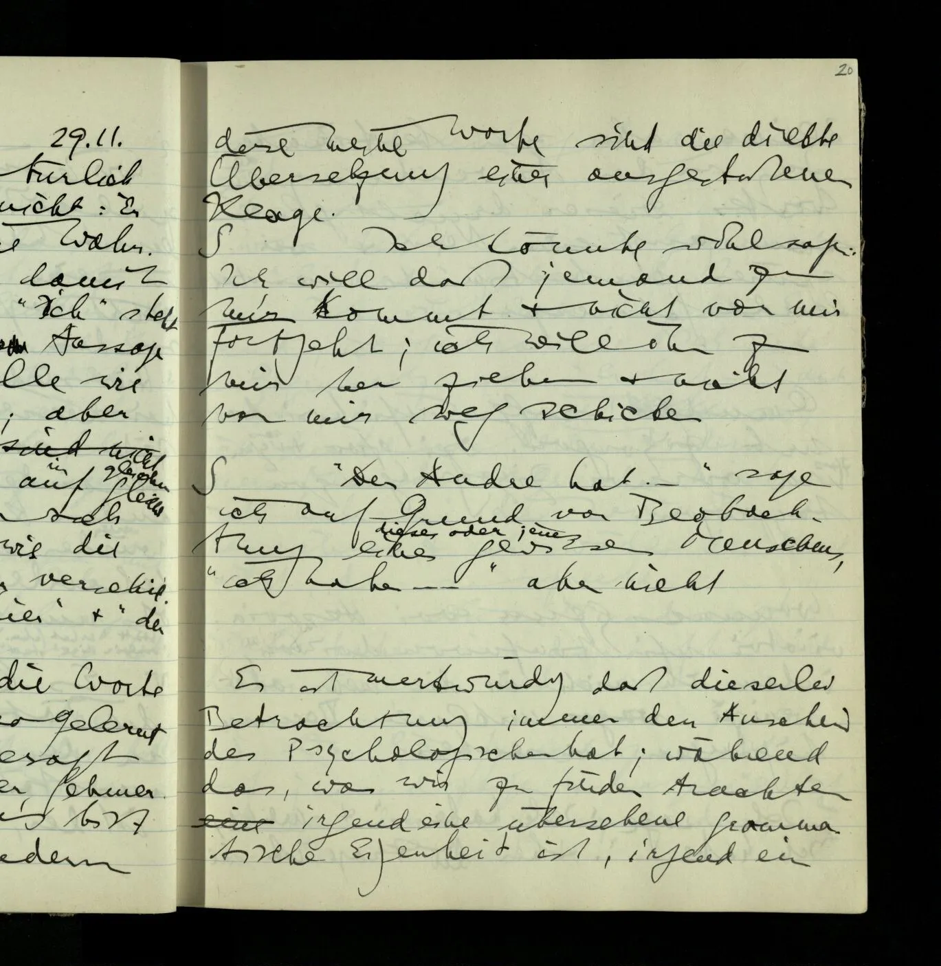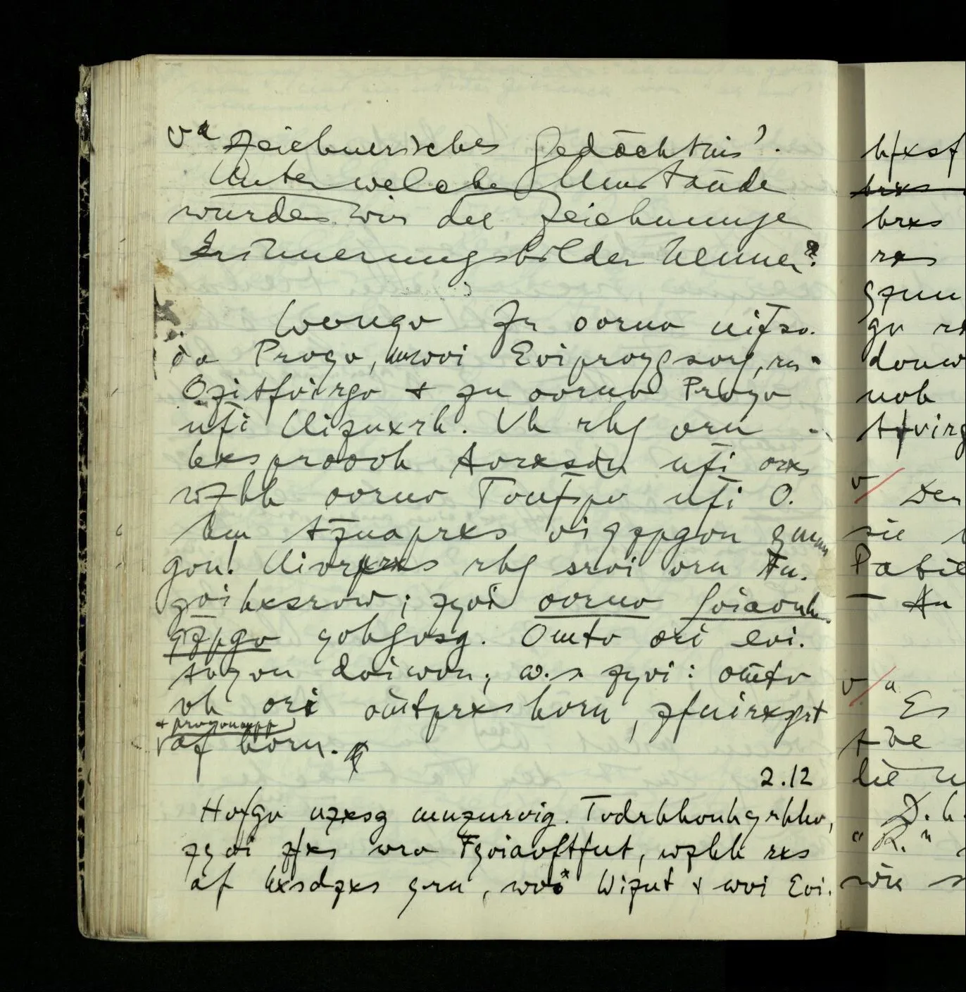 20.11.1937 Bin durch die Sache mit Anna Rebni beunruhigt. (Bei den Eintragungen in das Tagebuch denke ich oft, ob das auch ein gutes Licht auf mich werfen wird.) Bin, auf einen Einfall hin, zu Anna Rebni gegangen& habe ihr einige Kuchen mitgebracht. Ich sagte ihr, daß ich Friede mit ihr haben wolle; & noch einiges Andre. Wir gingen – gut auseinander. – Fühle mich nicht zur Arbeit fähig. Meine Gedanken sind in dieser Richtung wie ausgelöscht. Ob das vorübergehend ist oder auf lange Zeit – oder ganz – weiß ich nicht.