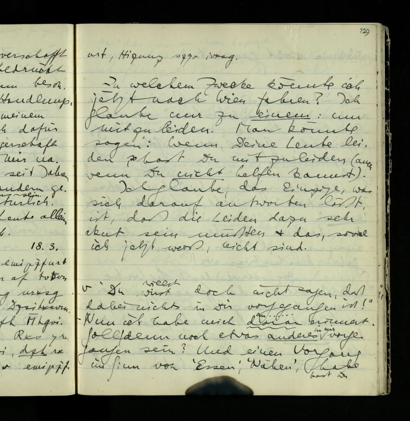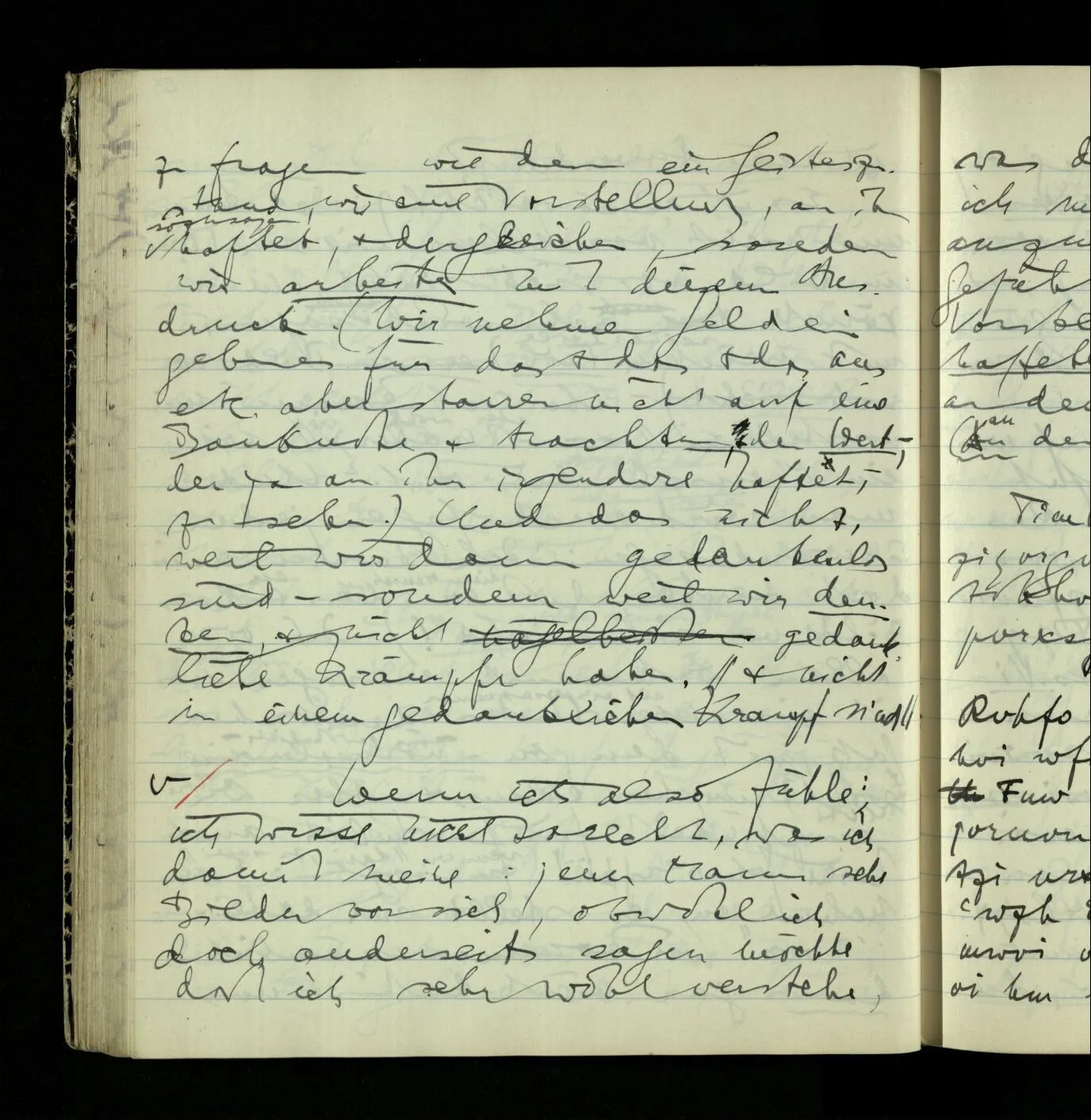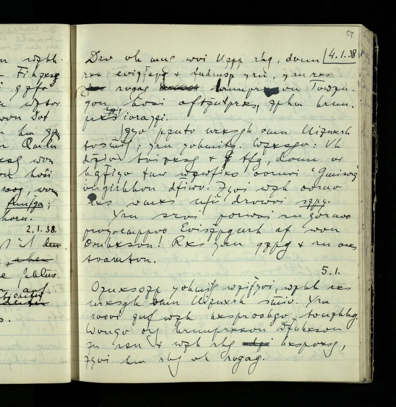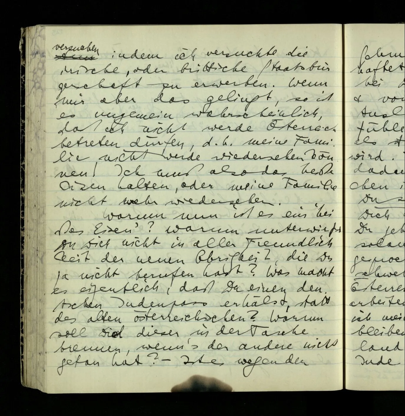 20.11.1937 Bin durch die Sache mit Anna Rebni beunruhigt. (Bei den Eintragungen in das Tagebuch denke ich oft, ob das auch ein gutes Licht auf mich werfen wird.) Bin, auf einen Einfall hin, zu Anna Rebni gegangen& habe ihr einige Kuchen mitgebracht. Ich sagte ihr, daß ich Friede mit ihr haben wolle; & noch einiges Andre. Wir gingen – gut auseinander. – Fühle mich nicht zur Arbeit fähig. Meine Gedanken sind in dieser Richtung wie ausgelöscht. Ob das vorübergehend ist oder auf lange Zeit – oder ganz – weiß ich nicht.